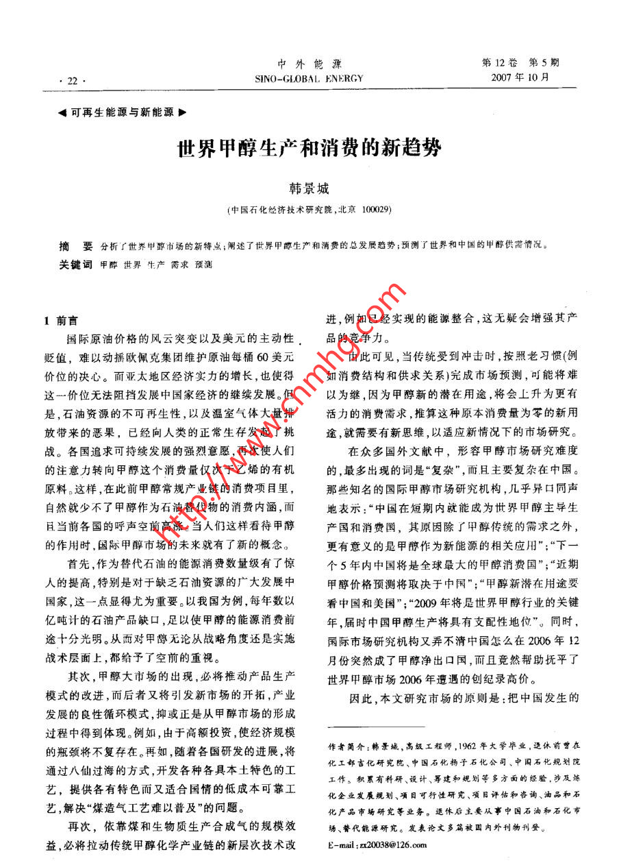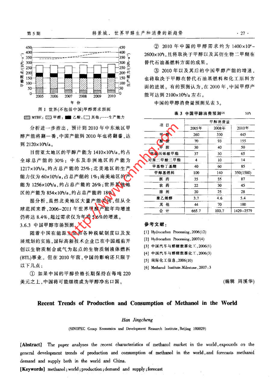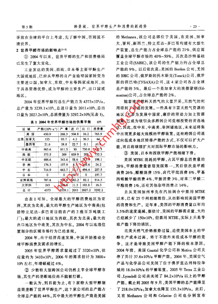 中外能源第12卷第5期SIN0-GL0BAL. FINERGY2007年10月《可再生 能源與新能源>世界甲醇生產(chǎn)和消費(fèi)的新趨勢韓景城(中國石化經(jīng)濟(jì)技術(shù)研兗院,北京10029)摘要分析了世界中醇市場的新特點(diǎn);閘述了世界甲尊生產(chǎn)和消費(fèi)的總發(fā)展趨勢;預(yù)測了世界和中國的申醇供雷情況。關(guān)鍵詞甲醉世界生產(chǎn)需求預(yù)測1前盲進(jìn),例如已經(jīng)實(shí)現(xiàn)的能源整合,這無疑會(huì)增強(qiáng)其產(chǎn)國際原油價(jià)格的風(fēng)云突變以及美元的主動(dòng)性。品的競爭力。貶值,難以動(dòng)搖歐佩克集團(tuán)維護(hù)原油每桶60美元由此可見,當(dāng)傳統(tǒng)受到?jīng)_擊時(shí),按照老習(xí)慣(例價(jià)位的決心。而亞太地區(qū)經(jīng)濟(jì)實(shí)力的增長,也使得如消費(fèi)結(jié)構(gòu)和供求關(guān)系)完成市場預(yù)測,可能將難這一價(jià)位無法阻擋發(fā)展中國家經(jīng)濟(jì)的繼續(xù)發(fā)展。但以為繼,因?yàn)榧状夹碌臐撛谟猛?將會(huì)上升為更有是,石油資源的不可再生性,以及溫室氣體大量排活力的消費(fèi)需求,推算這種原本消費(fèi)量為零的新用放帶來的惡果,已經(jīng)向人類的正常生存發(fā)起了挑途,就需要有新思維,以適應(yīng)新情況下的市場研究。戰(zhàn)。各國追求可持續(xù)發(fā)展的強(qiáng)烈意愿,再次使人們在眾多國外文獻(xiàn)中,形容甲醇市場研究難度的注意力轉(zhuǎn)向甲醇這個(gè)消費(fèi)量僅次于乙烯的有機(jī)的,最多出現(xiàn)的詞是“復(fù)雜”,而且主要復(fù)雜在中國。原料。這樣,在此前甲醇常規(guī)產(chǎn)業(yè)鏈的消費(fèi)項(xiàng)目里,那些知名的國際甲醇市場研究機(jī)構(gòu),幾乎異口同聲自然就少不了甲醇作為石油替代物的消費(fèi)內(nèi)涵,而地表示:“中國在短期內(nèi)就能成為世界甲醇主導(dǎo)生且當(dāng)前各國的呼聲空前高漲。當(dāng)人們這樣看待甲醇產(chǎn)國和消費(fèi)國,其原因除了甲醇傳統(tǒng)的需求之外,的作用時(shí),國際甲醇市場的未來就有了新的概念。更有意義的是甲醇作為新能源的相關(guān)應(yīng)用”;“下一首先,作為替代石油的能源消費(fèi)數(shù)量級有了驚個(gè)5年內(nèi)中國將是全球最大的甲醇消費(fèi)國”;“近期.人的提高,特別是對于缺乏石油資源的廣大發(fā)展中甲醉價(jià)格預(yù)測將取決子中國";“甲醇新潛在用途要國家,這一點(diǎn)顯得尤為重要。以我國為例,每年數(shù)以看中國和美國”;“2009年將是世界甲醇行業(yè)的關(guān)鍵億噸計(jì)的石油產(chǎn)品缺口,足以使甲醇的能源消費(fèi)前年,屆時(shí)中國甲醇生產(chǎn)將具有支配性地位”。同時(shí),途十分光明。從而對甲醇無論從戰(zhàn)略角度還是實(shí)施國際市場研究機(jī)構(gòu)又弄不清中國怎么在2006年12戰(zhàn)術(shù)層面上,都給予了空前的重視。月份突然成了甲醇凈出口國,而且競?cè)粠椭鷵崞搅似浯?甲醉大市場的出現(xiàn),必將推動(dòng)產(chǎn)品生產(chǎn)世界甲醇市場2006年遭遇的創(chuàng)紀(jì)錄高價(jià)。模式的改進(jìn),而后者又將引發(fā)新市場的開拓,產(chǎn)業(yè)因此,本文研究市場的原則是:把中國發(fā)生的發(fā)展的良性循環(huán)模式,,抑或正是從甲醇市場的形成過程中得到體現(xiàn)。例如,由于高額投資,使經(jīng)濟(jì)規(guī)模的瓶頸將不復(fù)存在。再如,隨著各國研發(fā)的進(jìn)展,將作者簡介:韓景城,高級工程師,1962年大學(xué)畢業(yè),退休前曾在通過八仙過海的方式,開發(fā)各種各具本土特色的工化工部吉化研究院、中國石化揚(yáng)子石化公司、中圍石化規(guī)劃院藝,提供各有特色而又適合國情的低成本可靠工工作。積累有科研、設(shè)計(jì)、籌建和規(guī)劃等多方面的經(jīng)驗(yàn),涉及煉化企業(yè)發(fā)展規(guī)劃、項(xiàng)目可行性研究、項(xiàng)目評估和咨詢、油品和石藝,解決“煤造氣工藝難以普及”的問題?;a(chǎn)品市場研究等業(yè)務(wù)。退休后主要從事中國石油和石化市再次,依靠煤和生物質(zhì)生產(chǎn)合成氣的規(guī)模效場、瞽代能源研究。發(fā)表論文多篇被國內(nèi)外刊物刊登。益,必將拉動(dòng)傳統(tǒng)甲醇化學(xué)產(chǎn)業(yè)鏈的新層次技術(shù)改E-mail:x20038@126.com第5期韓景城、世界甲醇生產(chǎn)和消費(fèi)的新趨勢.23事放在全球的平臺.上考慮,先了解中國,否則說不的Methanex, 該公司總部位于美國,在美國、加拿清世界。大、智利、新西蘭、特立尼達(dá)-多巴哥均建有大型生2世界甲醇市場的新特點(diǎn)1|-31產(chǎn)裝置,總生產(chǎn)能力占全球總產(chǎn)能的21%,供應(yīng)面.①2004年以來,世界甲醇的生產(chǎn)和消費(fèi)格局覆蓋全球甲醇市場的40%~50%。其次是沙特基礎(chǔ)已發(fā)生了重大變化。I業(yè)公司(SABIC),該公司的生產(chǎn)能力約占全球總工業(yè)發(fā)達(dá)的美國、西歐、日本等主要甲醇生產(chǎn)產(chǎn)能的9%。以后依次是:美國的Borden 公司、美國大國或地區(qū),已經(jīng)從甲醇的自產(chǎn)自給型國家轉(zhuǎn)變?yōu)榈腂MC公司、俄羅斯的托木斯克(Tomck)公司、俄羅主要進(jìn)口國,加拿大、東歐、中東等國家或地區(qū),由斯的固巴哈(TYBAXA)公司,這4家公司各占全球于具備資源優(yōu)勢,成為甲醇的主要生產(chǎn)、出口國或總產