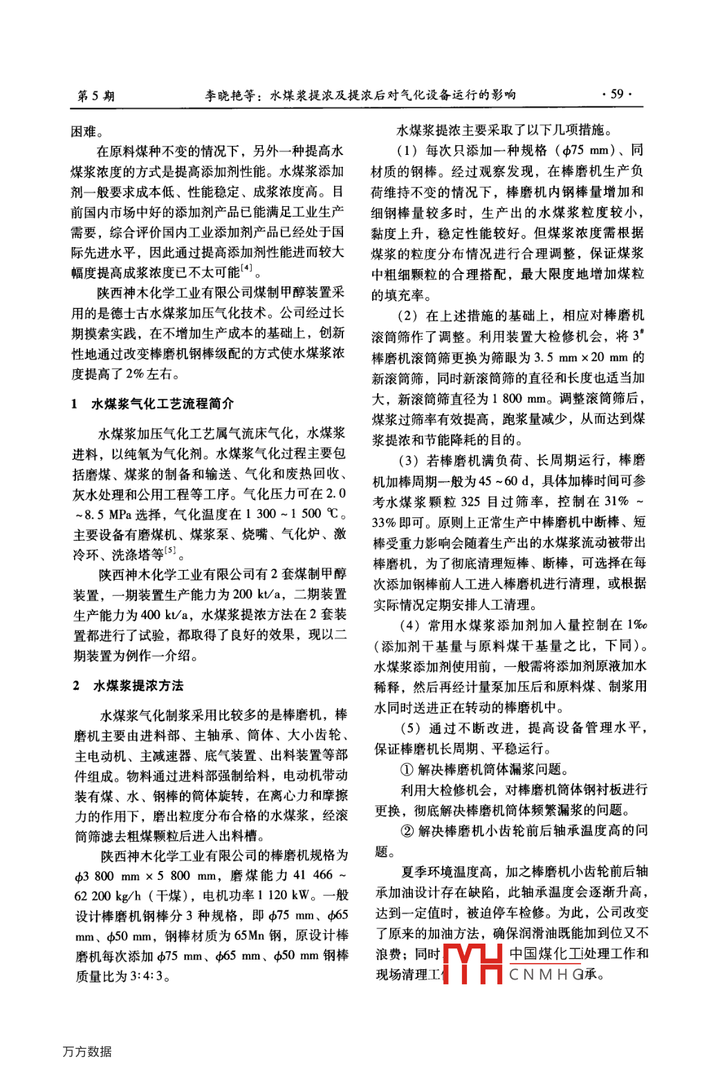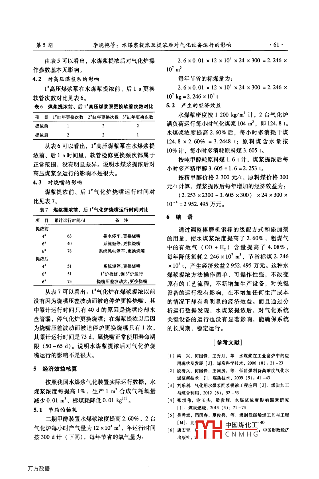 第5期中氮肥2015年9月M-Sized Nitrogenous fertilizer progreSep.2015水煤漿提濃及提濃后對氣化設(shè)備運行的影響李曉艷,李斌,雷朝紅,李培豐(陜西神木化學(xué)工業(yè)有限公司,陜西神木719300)[摘要]以配套400kt/a甲醇裝置的德士古煤氣化裝置為例,通過調(diào)整棒磨機鋼棒的級配方式和添加劑的用量,使水煤漿濃度提高2.60%,粗煤氣中的有效氣(CO+H2)含量提高4.08%,年降低氧耗2.246×107m3,降低煤耗2.246×104t,產(chǎn)生經(jīng)濟效益2952495萬元,且水煤漿濃度提高后對現(xiàn)有主要氣化設(shè)備的運行未產(chǎn)生明顯影響。[關(guān)鍵詞]德士古氣化;棒磨機;鋼棒級配;水煤漿;提濃;氣化設(shè)備中圖分類號]TQ546[文獻標(biāo)志碼]B[文章編號]1004-932(2015)05-008-04現(xiàn)有水煤漿濃度大都在60%左右,通常情0引言況下即使將水煤漿濃度提高0.5%也很困難。段煤氣化是潔凈、高效利用煤炭的主要途徑之清兵等2結(jié)合傳統(tǒng)制漿工藝和制漿原料性質(zhì),在眾多煤氣化技術(shù)中,水煤漿加壓氣化技術(shù)自主研發(fā)的低階煤制備高質(zhì)量水煤漿專利工藝技因煤種適應(yīng)范圍較廣、氣化溫度高、壓力高、易術(shù),可將煤漿濃度提高3%~5%。但是此法需于大型化,成為煤氣化技術(shù)發(fā)展的主流。制要另外添置設(shè)備,增加了生產(chǎn)成本。兗礦魯南化備性能優(yōu)良的水煤漿是水煤漿加壓氣化工藝的核肥廠為提高氣化用水煤漿濃度,在原水煤漿生產(chǎn)心,而制漿技術(shù)的核心是在保持合適的流動性、系統(tǒng)增加了一套煤漿超細磨副線,抽取原中間槽穩(wěn)定性和黏度的基礎(chǔ)上,盡量提高煤漿濃度。的煤漿細磨后再配漿,通過多峰值煤漿顆粒配比及黏度的優(yōu)化調(diào)整,有效提高了水煤漿濃度。[收稿日期]2015-04-15此法是通過增加一套煤漿超細磨副線來實現(xiàn)水煤[作者簡介]李曉艷(1982—),女,工程師20年畢業(yè)于天漿提濃的,同樣增加了成本,且對于一些已經(jīng)建津大學(xué)碩士,主要從事煤化工技術(shù)管理工作。成的裝置來說,進行此項技術(shù)改造也存在一定的機組超溫,應(yīng)緊急停車處理;②由于入口流量、低溫甲醇洗裝置的冷量需求,避免了凈煤氣中硫壓力、溫度以及機組的轉(zhuǎn)速發(fā)生變化,注意一段化氫含量超標(biāo),從而防止了甲醇合成催化劑中的運行工作點,防止進入喘振線內(nèi);③觀察氨毒,延長了其使用壽命。為了避免此類事故發(fā)冰機入口濾網(wǎng)前后壓差和一段分離器進出口壓差生,氨冷卻器應(yīng)改為不銹鋼材質(zhì),同時嚴(yán)防氨中的變化情況,如果壓差呈下降趨勢,低于3kPa進水。時,表明冰已經(jīng)化掉,此時可以聯(lián)系調(diào)度氨冰機加負荷;④如運行一段時間壓差下降慢或沒有[參考文獻]下降,應(yīng)停氨冰機,然后再次啟動,延長暖機階[1]黃鐘岳,王曉放,透平式氨冰機[M].北京:化學(xué)工業(yè)出段,使機組在常壓、高溫下多運行一段時間,觀版社,2004:80-220察入口壓差,還不行就停車拆檢。2]陸美娟.化工原理[M].北京:化學(xué)工業(yè)出版社,2001102-1226結(jié)語[3]王紹良化工設(shè)備基礎(chǔ)[M].北京:化學(xué)工業(yè)出版社經(jīng)過分析、排查和處理,氨冰機入口濾網(wǎng)前2002:32-1564]張富春,譚永前,李曉剛,等,大流量氨冷凍離心壓縮機后和一段分離器進出口的壓差降到了3kPa以組的設(shè)計[J].風(fēng)機技術(shù),2011(3):39-42下,這也佐證了人口壓差高源于結(jié)冰造成濾網(wǎng)等5]李端印.氨冰中國煤化工J·大氮肥堵塞的判斷。機組再次開車后運行正常,滿足了2010(3):CNMHG第5期李曉艷等:水煤漿提濃及提濃后對氣化設(shè)備運行的影響困難。水煤漿提濃主要采取了以下幾項措施在原料煤種不變的情況下,另外一種提高水(1)每次只添加一種規(guī)格(φ75mm)、同煤漿濃度的方式是提高添加劑性能。水煤漿添加材質(zhì)的鋼棒。經(jīng)過觀察發(fā)現(xiàn),在棒磨機生產(chǎn)負劑一般要求成本低、性能穩(wěn)定、成漿濃度高。目荷維持不變的情況下,棒磨機內(nèi)鋼棒量增加和前國內(nèi)市場中好的添加劑產(chǎn)品已能滿足工業(yè)生產(chǎn)細鋼棒量較多時,生產(chǎn)出的水煤漿粒度較小需要,綜合評價國內(nèi)工業(yè)添加劑產(chǎn)品已經(jīng)處于國黏度上升,穩(wěn)定性能較好。但煤漿濃度需根據(jù)際先進水平,因此通過提高添加劑性能進而較大煤漿的粒度分布情況進行合理調(diào)整,保證煤漿幅度提高成漿濃度已不太可能4。中粗細顆粒的合理搭配,最大限度地增加煤粒陜西神木化學(xué)工業(yè)有限公司煤制甲醇裝置采的填充率。用的是德士古水煤漿加壓氣化技術(shù)。公司經(jīng)過長(2)在上述措施的基礎(chǔ)上,相應(yīng)對棒磨機期摸索實踐,在不增加生產(chǎn)成本的基礎(chǔ)上,創(chuàng)新滾筒篩作了調(diào)整。利用裝置大檢修機會,將3性地通過改變棒磨機鋼棒級配的方式使水煤漿濃棒磨機滾筒篩更換為篩眼為3.5mm×20mm的度提高了2%左右。新滾筒篩,同時新滾筒篩的直徑和長度也適當(dāng)加1水煤漿氣化工藝流程簡介大,新滾筒篩直徑為1800mm。調(diào)整滾筒篩后,煤漿過篩率有效提高,跑漿量減少,從而達到煤水煤漿加壓氣化工藝屬氣流床氣化,水煤漿漿提濃和節(jié)能降耗的目的。進料,以純氧為氣化劑。水煤漿氣化過程主要包(3)若棒磨機滿負荷、長周期運行,棒磨括磨煤、煤漿