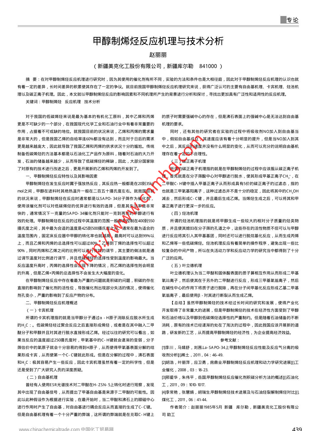 專論甲醇制烯烴反應(yīng)機理與技術(shù)分析趙麗麗(新疆美克化工股份有限公司,新疆庫爾勒841000 )摘要:在對甲醇制烯烴反應(yīng)機理進行研究時,因為其使用的催化劑有所不同,實驗的方法和條件也是大相徑庭,因此對于甲醇制烯烴反應(yīng)機理的認識也就有著一定的差異,長時間差異的積累使其存在了-定的爭議。就目前我國甲醇制烯烴反應(yīng)機理研究來說,獲得廣泛認可的主要有自由基機理、卡賓機理、烴池機理以及碳正離子機理。因此,本文就以甲醇制烯烴反應(yīng)的影響因素和不同機理所產(chǎn)生的背景進行分析和探討,尋找出更加具有廠泛性和適用性的反應(yīng)機理。關(guān)鍵詞:甲醇制烯烴反應(yīng)機理技術(shù)分析對于我國的低碳烯烴來說是最為基本的有機化工原料,其中乙烯和丙烯的質(zhì) 子時需要強堿中心的存在,但是沸石表面上的強堿中心是無法達到自由基更是不可缺少的一個部分,在我國現(xiàn)代化學(xué)工業(yè)和石油行業(yè)中有著非常重要的機理的要 求。作用,占據(jù)著不可或缺的地位。就我國目前的狀況來說,乙烯和丙烯的需求量同時,還有其他的研究者在實驗的過程中將吸收劑NO加入到自由基當是非常大的,但是我國乙烯的自給率連60%都沒有達到,而且對于日后的需求中 , 假如自由基成立,其速度應(yīng)該有著十分明顯的提升,但是當NO加入到其更是越來越龐大,因此就導(dǎo)致了我國乙烯和丙烯的供求狀況十分的尷尬。傳統(tǒng)中之后 ,反應(yīng)的速度并沒有什么明顯的變化,從而可以充分的說明自由基機制備低碳烯烴的方法基本都是以石油化工產(chǎn)品作為原料,隨著對石油的大力開理存在著一 定的不合理性。發(fā),石油的儲備越來越少,從而導(dǎo)致了低碳烯烴的稀缺, 因此,大部分國家除(三)碳正離子機理了對原有的技術(shù)進行改進之后,更是開展新的乙烯和丙烯的開發(fā)到了。所謂的碳正離子機理指的就是在甲醇制烯烴的過程中應(yīng)該服從碳正離子機一、 甲醇制烯烴反應(yīng)特性以及其影響因素里,首先就是在分子篩酸中心對甲醇進行脫水,使其形成甲基正離子CH2* ,在甲醇制烯烴在發(fā)生反應(yīng)時屬于強放熱反應(yīng),反應(yīng)熱一般都是在20到35kj/二甲醚C-H鍵中插入甲基正離子從而形成具有5價的碳正離子的過濾態(tài),指的mol之間,甲醇在進料時其絕熱溫升一般在二百五+攝氏度左右。就我國目前也就是 三甲氧基陽離子, 這種過濾態(tài)并不是十分的穩(wěn)定,因此將其中的CH.OH的狀況來說,甲醇制烯烴在反應(yīng)時通常都是以SAPO-34分子篩作為催化劑,減去,然后形成C- C鍵,并且最后生成乙烯。當烯烴生成之后,可以將其和甲使用該催化劑可以對低碳烯烴的優(yōu)異進行有效的選擇,但是其失活率是非?;x 子進行更深一步的反應(yīng)??斓?通常情況下-克量的SAPO- 34催化劑只能對-克到兩克的甲醇進行有(四)烴池機理效的處理。甲醇制烯烴在反應(yīng)的過程中其溫度的范圍一般都是控制在400到550所謂的烴池機理指的就是將甲醇生成一些較大的相對分 子質(zhì)量的烴類物攝氏度之間,其中最為合適的溫度是425到500攝氏度之間。通常在最為適合的質(zhì) ,并且使其媳婦在分子篩的孔道之中,這些存在的活性物質(zhì)不但可以與甲醇溫度范圍內(nèi),固定床反應(yīng)器中甲醇的轉(zhuǎn)化率也就越高,最高時可以達到99%以進行反應(yīng)將其引入其甲 基基團,同時還可以進行脫烷基化反應(yīng),從而生成丙烯上,而且乙烯和丙烯的總選擇性可以超過80% ,乙烯到丁烯的選擇性可以超過和乙烯等一 些低碳烯烴。 烴池機理反應(yīng)有著簡單的操作程序,避免出現(xiàn)- 些比90% ,同時丙烯和乙烯之間的比例可以進行有效的調(diào)節(jié),其主要的做法就是通較復(fù) 雜的中間產(chǎn)物,所以在失活動力學(xué)和反應(yīng)動力學(xué)的研究當中都得到了十分過調(diào)節(jié)溫度對比例進行調(diào)節(jié),并且低碳烯烴的選擇性受到溫度的影響最大。當廠 泛的應(yīng)用。反應(yīng)溫度升高時,丙烯的選擇性會出現(xiàn)下降的情況,而乙烯的選擇性則會明顯(五)葉立德機理的升高,但是乙烯+丙烯的總選擇性不會發(fā)生太大幅度的變化。葉立德機理認為當二甲醚和固體酸表面的質(zhì)子算相互作用從而形成二甲基在甲i醇制烯烴反應(yīng)中存在著最為嚴重的問題就是積碳的問題, 積碳的存在氧鑰離子 ,然后使其在于另外的二甲醚進行反應(yīng),形成三甲基氧翁離子,然后直接的影響到了催化劑的活性位,導(dǎo)致催化劑出現(xiàn)部分失活的情況,使得催化在堿性中心的作用 下將質(zhì)子進行脫除,再在分子間甲基化反應(yīng)形成乙基二甲基劑孔變小,嚴重的影響到了反應(yīng)產(chǎn)物的分布。氧翁離子,最后使用-對其進行斷裂從而生成乙烯。二、甲醇制烯烴反應(yīng)機理概述[總結(jié)]雖然甲醇制烯烴的技術(shù)經(jīng)過長時間的研究和發(fā)展,使得產(chǎn)業(yè)化(-)卡賓機理開發(fā)取得了非常重大的進展,但是甲醇制烯烴的技術(shù)在經(jīng)濟性方面受到了甲醇所謂的卡賓機理指的就是當甲醇分子通過a - H原子消除反應(yīng)脫水所生成和石油價格以及甲醇到低碳烯烴選擇性的嚴重制約。 但是隨著石油儲備的不斷的H,C :。低碳烯烴經(jīng)過聚合反應(yīng)之后直接形成烯烴,或者是