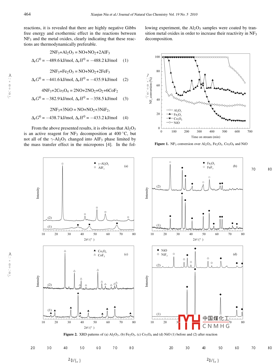 Available online at www.sciencedirect.com| Joumal ofScienceDirect7I Natural GasChemistryEL SEVIERJournal of Natural Gas Chemistry 19(2010)463- ,467www.elsevier.com/locate/jngcCommunicationNF3 decomposition over some metal oxides in the absence of waterXianjun Niu, Liang Sun,Yanan Wang,Haipeng Wu,Xiufeng Xu*School of Chemistry and Biology, Yantai Universit, Yantai 264005, Shandong, China[ Manuscript received May 31, 2010; revised August 20, 2010 ]AbstractNF3 decomposition in the absence of water over Al2O3, Fe2O3, Co;O4 and NiO, and transition metal oxides (Fe2O3, Co3O4 and NiO) coatedAl2O3 reagents was investigated. The results show that Al2O3 is an active reagent for NF3 decomposition with 100% conversion lasting for8.5 h at 400 °C. Fe2O3, Co3O4 and NiO coated Al2O3 reagents are superior to bare Al2O3, and 5%Co3O4/Al2O3 has a high reactivity withNF3 full conversion maintaining for 10.5 h. It is suggested that the presence of transition metal oxide is beneficial to the reactivity of Al2O3,and results in a significant enhancement in the fluoriz ion of AlKey wordsNF3 decomposition; metal oxides; Al2O3; reactivityNF3 is used as a novel etching and cleaning. .A.Aal element was 5% relative to Al2O3.conductor industry, which has a global warm Ing potenta1ll decom posit o rpactions over the single metal oxides and tran-(GWP) of 17200 times relative to CO2 and a atposphetgthoynelaliles coated Al2O3 reagents in the absence oflifetime of 740 years [1]. Due to more and f brelemssolI I wo were Carried out in a fixed-bed reactor at 400 °C underof NF3 into atmosphere, it is strongly requiredtodestruct theatmospheric pressure. Approximately 2g (20-40 mesh) re-NF3 molecules exhausted from industrial processes.gent was placed inside an Inconel tube reactor, and 2 vol%NF3As reported, metal phosphate catalysts are effective ondiluted in He was passed over the reagent with a flow rate ofNF3 destruction in the presence of water [2,3], but the HF50 m/min. The effluent gas was separated and monitored byproduct is very corrosive to the reactors. In contrast, NF3 de-a gas chromatograph (GC-950, Shanghai Haixin) equipped bycomposition without water over some metal oxides is a simplea HayeSep D column and a thermal conductivity detector. Theand economical method for the abatement of NF3. Vileno et reactivity of metal oxides is expressed by NF3 complete coal. [4] reported the thermal decomposition of NF3 over alu-version time.mina, HX zeolite and calcium oxide, and found that the de-The BET surface areas of Al2O3, Fe2O3, Co3O4 andcomposition of NF3 on alumina can occur at the temperatureNiO measured using an automated nitrogen adsorption apas low as 100 °C with steady complete conversion of NF3 forparatus (NOVA3000, Quantachrome) are 127.8, 14.0, 28.5,about 4 h at 400 °C. Except for Vileno's work, no other liter-11.9 m2/g, respectively. Figure 1 gives the NF3 conversionature about NF3 thermal decomposition over metal oxides hascurves over these metal oxides, it is clear that NF3 can decom-been found. Fortunately, the results of CCl4 and chloroflu-pose completely over Al2O3 with NF3 conversion of 100%orocarbons (CFCs) decomposition without water reported inlasting for 8.5h at 400 °C. The reactivity of Fe2O3, Co3O4References [5- 19] give many suggestions to study the de-and NiO is lower than that of Al2O3. It can be seen thatstruction of NF3.the metal oxide converted to metal fluoride after reactionIn the present work, several single metal oxides, such asfrom XRD (Shimadzu XRD-6100, Cu Ka radiation) patternsAl2O3, Fe2O3, Co3O4 and NiO, were prepared by precipita-shown in Figure 2. Al, Fe and Ni elements have no changetion method, and several transition metal oxides coated Al2O3,in valence, while part of Co element was reduced from va-such as Fe2O3/Al2O3, Co3O4/Al2O3 and NiO/Al2O3, wereence (I) to valence (II), indicating that the chemical reac-prepared by incipient wetness impregnation of Al2O3 withtions listed in Equations (1)-(4) took place during NF3transition metal nitrate solutions, where the weight percentagedecomposition. From the A,G0 and A.H0 values of these* Corresponding author. Tel and Fax: +86-535-6902233; E-mail: xxf@ ytu.edu.cn中國煤化工This work was financially supported by the National Natural Science Foundation of China (No. 205MHCNM HGCopyrightO2010, Dalian Institute of Chemical F, ChineAcademy of Sciences. All rights reserved."doi:10. 1016/S 1003-9953(09)60107-9w.st,464Xianjun Niu et al./ Journal of Natural Gas Chemistry Vol. 19 No.52010lowing experiment, the Al2O3 samples were coated by tran-free energy and exothermic effect in the reactions betweensition metal oxides in order to increase their reactivity in NF3NF3 and the metal oxides, clearly indicating that these reac-decomposition.tions are thermodynamically preferable.2NF3+Al2O3 = NO+NO2+2AIF300 tA,G0= -489.6 kJ/mol, ArH0= -488.2 kJ/mol (1)2NF3+Fe2O3 = NO+NO2+2FeF380入A,G0=-441.6 kJ/mol, A,H0=-435.9 kJ/mol (2)604NF3+2Co3O4 = 2NO+2NO2+O2+6CoF2A,G0=-382.9 kJ/mol, A,H0 = -358.5 kJ/mol (3)當(dāng)402NF3+3NiO = NO+NO2+3NiFz,A,G0= -438.7 kJ/mol, A,H0=-433.2 kJ/mol (4)-t-Co,O,wwwwwwFrom the above presented results, it is obvious that Al2O3010020000 600 700is an active reagent for NF3 decomposition at 400 °C, butTime on stream (min)not all of the 7-Al2O3 changed into AlF3 phase limited bythe mass transfer effect in the micropores [4]. In the fol-Figure 1. NF3 conversion over Al2O3, Fe2O3, Co3O4 and NiOr-Al.O3a)CEEO 3Fe,O,(b)730(2).2)(1)10 2(40 :701040 5(20/(° )▲Co,O,◆NiOs CoF,e)(d)(2)i10 20中國煤化工20/0° )YHCNMHGFigure 2. XRD patterns of (a) Al2O3, (b) Fe2O3, (C) Co3O4 and (d) NiO (1) before and (2) after reaction2(5(508(204(20/(6)20/(。)Journal of Natural Gas Chemistry VoL. 19 No.52010465givesand transition metal oxides coated Al2O3, it is clearspent reagents. As listed in Table 1, BET surface areas of thethat the reactivity of Al2O3 and the coated Al2O3spent de-fluorinated reagents were lower than those of the cor-increa