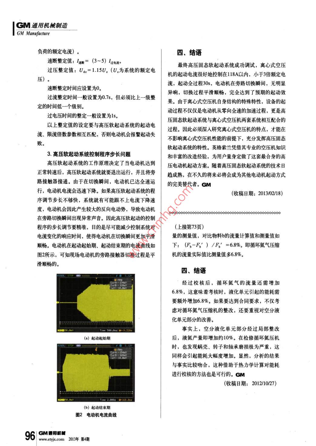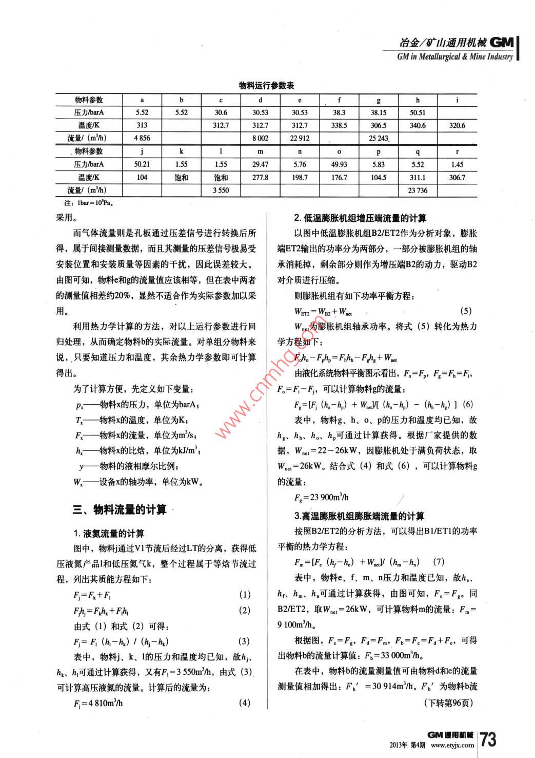 cM冶金/礦山通用機(jī)械GM in Metallurgical& Mine Industry空分液化系統(tǒng)能耗的熱力學(xué)分析中空能源設(shè)備有限公司(浙江杭州310051)崔新亭趙小瑩【摘要】以壓力、溫度和液體流量這些可校核」統(tǒng)內(nèi)部的高低溫膨脹機(jī)、換熱器等設(shè)備的作用,部分高的一次性測(cè)量參數(shù)為依據(jù),通過對(duì)膨脹機(jī)加及液體節(jié)流「壓氮?dú)廪D(zhuǎn)化為液氮產(chǎn)品和低壓氮?dú)馑突赜脩?其余部進(jìn)行熱力學(xué)計(jì)算,確定了空分液化單元消耗的實(shí)際循分經(jīng)液化單元內(nèi)的膨脹機(jī)組、換熱器的作用轉(zhuǎn)化為返流環(huán)氪氣流量,從而對(duì)液化系統(tǒng)的能耗進(jìn)行了量化分析。氮?dú)馕锪蟩,繼續(xù)與物料a匯合,回到NC進(jìn)口物料b,再分析的結(jié)果為設(shè)備的成功改造提供了可靠的依據(jù),并達(dá)次進(jìn)行壓縮。整個(gè)液化系統(tǒng),只有物料b經(jīng)過NC壓縮時(shí)到了預(yù)期效果。有能耗發(fā)生,因此確認(rèn)物料b的實(shí)際流量非常重要?!娟P(guān)鍵詞】液化單元循環(huán)氦氣壓縮機(jī)膨脹機(jī)組節(jié)流熱力學(xué)計(jì)算焓能耗原料氣去用一、前言在對(duì)空分液化系統(tǒng)進(jìn)行能耗考核時(shí),液體產(chǎn)量可通過液體貯槽進(jìn)行精確測(cè)量,能耗可由電能表直接計(jì)<量。當(dāng)對(duì)整個(gè)系統(tǒng)的能耗進(jìn)行分析時(shí),經(jīng)過循環(huán)氮?dú)鈮簠s水縮機(jī)的氮?dú)饬髁烤椭陵P(guān)重要,當(dāng)流量偏大時(shí),能耗的增加是由液化單元引起的,反之,能耗的增加是由壓縮機(jī)去用戶的效率引起的.但是,現(xiàn)場(chǎng)的氣體流量很難進(jìn)行精確測(cè)③卻量,這就需要對(duì)氣體的流量進(jìn)行分析和確認(rèn)。冷卻水以國產(chǎn)的一套出口空分的液化系統(tǒng)為例,該系統(tǒng)液化系統(tǒng)物料平衡圖經(jīng)過試車,液氮產(chǎn)量為3550m3/h,達(dá)到了合同的要1、3.水冷卻器2.低溫膨脹機(jī)增壓端B24.高溫膨脹機(jī)增壓端B15NC循環(huán)氮?dú)鈮嚎s機(jī)6.Ⅵ節(jié)流閥7LT液氮計(jì)量槽求,但是產(chǎn)品的單位能耗超出合同要求20%以上,無法8.低溫膨脹機(jī)膨脹端Er29.低溫膨脹機(jī)膨脹端Er驗(yàn)收。通過筆者的方法進(jìn)行分析計(jì)算,順利得到了解2.參數(shù)評(píng)定決,使得出口產(chǎn)品得以順利驗(yàn)收。上圖中各物料的運(yùn)行參數(shù)見下表,這些參數(shù)均為現(xiàn)場(chǎng)各測(cè)點(diǎn)的測(cè)量值,并不是實(shí)際值,需要對(duì)它們進(jìn)行、空分液化系統(tǒng)能耗評(píng)定和篩選。表中的壓力和溫度均由變送器直接測(cè)得,1.流程介紹屬于直接測(cè)量數(shù)據(jù),而且可以通過就地儀表進(jìn)行驗(yàn)證,空分液化系統(tǒng)流程簡圖即物料平衡圖如下圖所液體流量則由用戶的液體貯槽直接精確測(cè)量,表中數(shù)據(jù)示,即原料氮?dú)馕锪蟖與返流氮?dú)馕锪蟩匯合至物料,屬于直接測(cè)量數(shù)據(jù),可靠性很高。顯然,表中壓力經(jīng)過NC的壓縮后,送往后面的液化系統(tǒng)。經(jīng)過液化系溫度以及物料的液氮產(chǎn)品流量均可作為實(shí)際參數(shù)加以72cM用肌藏www.etyx.com2013年第4期冶金/礦山通用機(jī)械GMGM in Metallurgical Mine Industry物料運(yùn)行參數(shù)表物料參數(shù)g5520.630.5338.338.15溫度/k3127312.7338.534063206流量/(mh)48562291225243物料參數(shù)壓力arA50.211.5529475.764993835.52145溫度/K104飽和飽和27781987176.7104.53l1.1流量/(mh)355023736注:1bar=107Pa采用。2.低溫膨脹機(jī)組增壓端流量的計(jì)算而氣體流量則是孔板通過壓差信號(hào)進(jìn)行轉(zhuǎn)換后所以圖中低溫膨脹機(jī)組B2/ET2作為分析對(duì)象,膨脹得,屬于間接測(cè)量數(shù)據(jù),而且其測(cè)量的壓差信號(hào)極易受端ET2輸出的功率分為兩部分,一部分被膨脹機(jī)組的軸安裝位置和安裝質(zhì)量等因素的千擾,因此誤差較大。承消耗掉,剩余部分則作為增壓端B2的動(dòng)力,驅(qū)動(dòng)B2由圖可知,物料和g的流量值應(yīng)該相等,但在表中兩者對(duì)介質(zhì)進(jìn)行壓縮。的測(cè)量值相差約20%,顯然不適合作為實(shí)際參數(shù)加以采則膨脹機(jī)組有如下功率平衡方程:用利用熱力學(xué)計(jì)算的方法,對(duì)以上運(yùn)行參數(shù)進(jìn)行回Wn為膨脹機(jī)組軸承功率。將式(5)轉(zhuǎn)化為熱力歸處理,從而確定物料b的實(shí)際流量。對(duì)單組分物料來學(xué)方程如下:說,只要知道壓力和溫度,其余熱力學(xué)參數(shù)即可計(jì)算FJ。-F=Fh-F+Wm得出。由液化系統(tǒng)物料平衡圖示看出,F=F,F2=F=F為了計(jì)算方便,先定義如下變量:F=F-F,可以計(jì)算物料g的流量:物料x的壓力,單位為barA;F=I(h。-h)+Wa(-b)-(h一-h2)](6)T物料x的溫度,單位為K表中,物料g、h、o、P的壓力和溫度均已知,故F—物料x的流量,單位為m/sha、ha、h。、h可通過計(jì)算獲得。根據(jù)廠家提供的數(shù)物料x的比焓,單位為kJ/m3據(jù),Wna:=22-26kW,因膨脹機(jī)處于滿負(fù)荷狀態(tài),取y物料的液相摩爾比例;Wna=26kW。結(jié)合式(4)和式(6),可以計(jì)算物料gW—設(shè)備x的軸功率,單位為kW。的流量:F2=23900m/h三、物料流量的計(jì)算3高溫膨脹機(jī)組膨脹端流量的計(jì)算1.液氮流量的計(jì)算按照B2T2的分析方法,可以得出Bl/ETI的功率圖中,物料通過v1節(jié)流后經(j