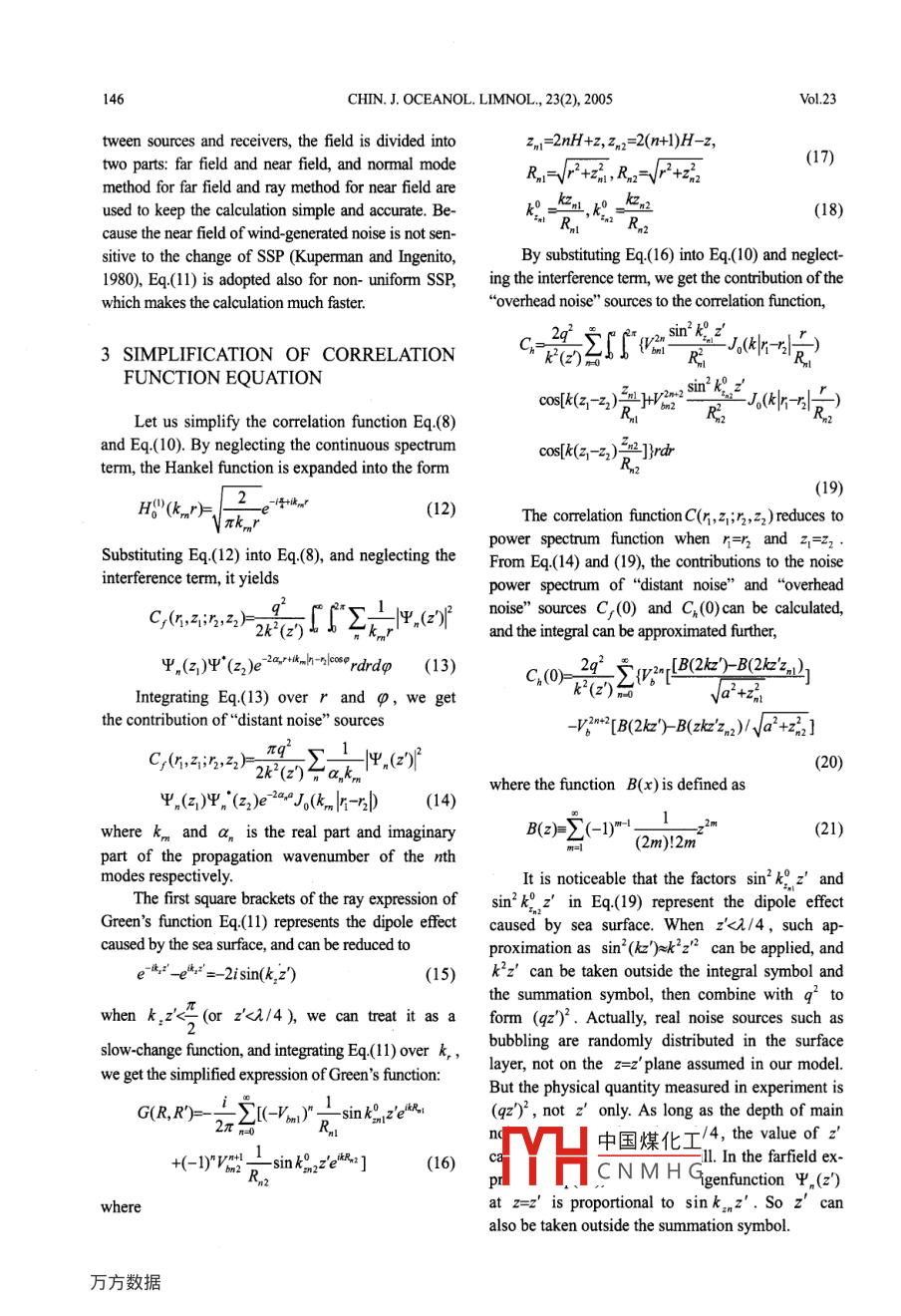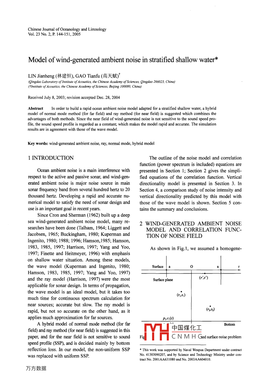 Chinese Journal of Oceanology and LimnologyVol. 23 No.2, P. 144-151, 2005Model of wind-generated ambient noise in stratified shallow water*LIN Jianheng (林建恒), GAO Tianfu (高天賦)*(Qingdao Laboratory of Istite of Acoustis, the Chinese Academy ofSciences, Qingdao 266023, China)(tInstitute ofAcoustics, the Chinese Academy of Sciences, Bejing 100080, China)Received July 8, 2003; revision accepted Dec. 28, 2004AbstractIn order to build a rapid ocean ambient noise model adapted for a stratified shallow water, a hybridmodel of normal mode method (for far field) and ray method (for near field) is suggested which combines theadvantages of both methods. Since the near field of wind-generated noise is not sensitive to the sound speed pro-file, the sound speed profile is regarded as a constant; which makes the model rapid and accurate. The simulationresults are in agreement with those of the wave model.Key words: wind-generated ambient noise, ray, normal mode, hybrid model1 INTRODUCTIONThe outline of the noise model and correlationfunction (power spectrum is included) equations areOcean ambient noise is a main interference withpresented in Section 1; Section 2 gives the simpli-respect to the active and passive sonar, and wind-gen-fied equations of the correlation function. Verticalerated ambient noise is major noise source in maindirectionality model is presented in Section 3. Insonar firequency band from several hundred hertz to 20Section 4, a comparison study of noise intensity andthousand hertz. Developing a rapid and accurate nu-vertical directionality predicted by this model withmerical model to satisfy the need of sonar design andthose of the wave model is shown. Section 5 con-use is an important goal in recent years.tains the summary and conclusions.Since Cron and Sherman (1962) built up a deepsea wind-generated ambient noise model, many re-2 WIND-GENERATED AMBIENT NOISEsearches have been done (Talham, 1964; Liggett andMODEL AND CORRELATION FUNC-Jacobsen, 1965; Buckingham, 1980; Kuperman andTION OF NOISE FIELDIngenito, 1980; 1988; 1996; Hamson,1985; Hamson,1983, 1985, 1997; Harrison, 1997; Yang and Yoo,As shown in Fig.l, we assumed a homogene-1997; Finette and Heitmeyer, 1996) with emphasison shallow water situation. Among these models,the wave model (Kuperman and Ingenito, 1980;Surface aaHamson, 1983, 1985, 1997; Yang and Yoo, 1997)and the ray model (Harrison, 1997) were the mostSurface plane(r;z)applicable for sonar design. In terms of propagation,the wave model is an ideal model, but it takes too(nz)much time for continuous spectrum calculation fornear sources; accurate but slow. The ray model is(z)rapid, but not so accurate on the other hand, as itapplies much approximation for far sources.PInc(z)A hybrid model of normal mode method (for farBottom中國煤化工field) and ray method (for near field) is suggested in thispaper, and for the near field is not sensitive to soundMYHC N M H Ged urfaice noise poblemspeed profile (SSP), and is decided mainly by bottomreflection loss. In our model, the non-uniform SSP* This work was supprted by Naval Weapon Department under contractwas replaced with uniform SSP.No.41303090207. and by Science and Technology Ministry under con-tract No. 2001AA631080 and No. 2003AA604010.No.2LIN et al: Model of wind-generated ambient noise in sratified shallow water145ous statistical distribution of wind-generated noiseG-=2"(")",(2)H"(k,n)+CSC(9)sources S(r',z) on infinite plane z=z' (Kupermanand Ingenito, 1980), the correlation function of sur-where ψ(2) is the normal mode eigenfunc-face noise sources is in the form of:tion; H"(k,r) is the Hankel function; CSC repre-=q'N(r"-r*",z")(1)sents the contribution of continuous spectrum. Thesecond term ofEq. (7) iswhere q^ is surface source strength, andN(r'-r")=4m-8(r'-r")(2)k2(z7)'"k(z)!(10)The noise field for a receiver at (r,z) can bewritten as the total contributions of all individualwhere G is the ray representation of Green's func-sourcestion; its integral expression for a constant soundspeed profile is4(r,z)= jS(',")G(,z;r',z)d'r'(3)where ψ is the displacement potential function of8元π。noise field; G is Green's function, which satisfiesthe Helmholtz equationz'40°)the near field and normal mode method for the farthat are dominated by overhead noise unlike that infield. The noise level scale in Fig.8b and Fig.9 is ahard bottom case. Negative-high-angle beams arerelative level. It is shown that our model and Yang'sassociated with bottom bounced rays, and no directagree well with each other. In computation time,and surface-reflected rays. When grazing angle >34,Yang中國煤化工. group of parame-the noise intensity for soft bottom is weaker thanters 0e our model takesthat for hard bottom.only:YHCNMHGparametersonaFig.8 compares the noise vertical directionalitypersonal computer. The latter is more appropriatefor the constant SSP and that for the summer SSP atfor practical use with high speed and accuracy.500 Hz for soft bottom. (a) is the result of our model,For summer SSP, the interaction between ray.150CHIN. J. OCEANOL. LIMNOL., 23(2), 2005Vol.23and bottom is stronger, resulting in bigger differenceof bottom decreases, less noise intensity differencebetween the soft bottom case and hard bottom case.is observed between the far field intensities for softAs shown in Fig.7b and c, for winter SSP, the effectbottom and hard bottom case.Constant SSPDownward refracting SSP0*0°hard30"30°soft。soft60250%0"50f40[30/2050(40/30 ,po°L-90° 9o"20~J -90Level (dB)Upward refracting SSP-30°soft!s0°J -90"Fig7 The vertical beam distribution of wind generated noise with soft or hard bottom at 500 Hza. for constant SSP; b. for summer SSP; c. for winter SSP30*constantfP不ummer-60°s090°40302010.90° 935 2020 3390°Fig.8 The noise vertical beam distribution under the constant SSP versus summer SSP at 500 Hz and soft bottoma. our model; b. Yang's model (constant SSP- solid line, summer SS--dotted SSP)b中國煤化工90*