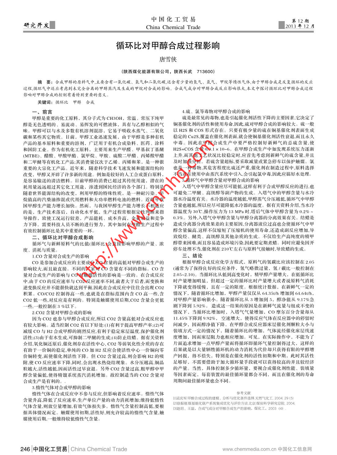 中國化工貿易第12期研究開發(fā)China Chemical Trade2013年12月循環(huán)比對甲醇合成過程影響唐雪俠(陜西煤化能源有限公司,陜西長武713600)摘要:合成甲醇的原料氣中,主要含有一氧化碳、氫氣和二氧化碳,還含有少量的氮氣、氬氣、甲烷等惰性氣體,由于甲醇合成是反復循環(huán)的反應過程,循環(huán)氣中還應考慮到未完全分離的甲醇蒸汽及生成的甲烷對合成的影響。合成氣成分對甲醇合成反應影響很大,本文中探討循環(huán)比對甲醇合成過程影響對甲醇合成的控制有著特別重要的意義。關鍵詞:循環(huán)比甲醇合成一、前言4.硫、氯等毒物對甲醇合成的影響甲醇是重要的化工原料,其分子式為CH3OH,常溫、常壓下純甲硫:是最常見的毒物,也是引起催化劑活性下降的主要因素,它決定了醇是無色透明的、易流動、易揮發(fā)的可燃液體,具有與乙醇相似的氣銅基 催化劑的活性和使用壽命,因此,硫對甲醇合成的影響較大。硫- -般味。甲醇可以與水及多數(shù)有機溶劑混溶,它易于吸收水蒸氣、二氧化以H2S和COS形式存在。只要有極少量的硫在銅基催化劑表面生成碳和某些其它物質。目前,甲醇工業(yè)迅速發(fā)展,由于甲醇是多種有機穩(wěn)定的 Cu2S,覆蓋在催化劑表面,就會使銅基催化劑活性衰退,而且永久產品的基本原料和重要的溶劑,廣泛用于有機合成染料、醫(yī)藥、涂料中毒。因此在甲醇合成生產中要嚴格控制好新鮮氣的總硫含量,使和國防工業(yè)。作為有機化工原料,主要用來生產甲醛、甲基叔丁基醚H2S+Cos 含量≤0.1x10-6。在甲醇合成生產中如發(fā)現(xiàn)系統(tǒng)壓力逐漸(MTBE)、醋酸、甲酸甲酷、氯甲烷、甲胺、硫酸二甲醋、丙烯酸甲醋上升,而 其他工藝狀況比較穩(wěn)定時,應首先考慮到新鮮氣的硫含量,并且和二甲醚等有機化工產品:其消費量僅次于乙烯、丙烯和苯,是一 一種很及時 加強分析。若硫含量超標,要采取減量或緊急停車以保護觸媒。氯重要的大宗化工產品。近年來,隨著科學技術飛速發(fā)展和能源結構的也是--種毒物,其危害程度比硫還嚴重催化劑在制造過程中,原料選擇改變,甲醇又開辟了許多新的用途。例如是較好的人工合成蛋白原料,不當或在使用中由蒸汽系統(tǒng)中引入,會引起氯中毒因此應搞好水處理,是容易輸送的清潔燃料。目前甲醇的消費已超過其傳統(tǒng)用途,潛在的5.循環(huán)氣中甲醇含量對甲醇合成的影響耗用量遠遠超過其它化工用途,滲透到國民經濟的各個部門。特別是入塔氣中甲醇含量應盡可能低,這樣有利于合成甲醇反應的進行,也隨著世界能源結構的改變,利用甲醇的特殊性質,是--種耐污染、辛可避免二甲醚、高級醇等副產物的生成。入塔氣中的甲醇含量與水冷烷值高的汽柴油摻混或代用燃料和大功率燃料電池的燃料。近兩年我器水冷溫度有關。水冷器的溫度越低,甲醇蒸氣分壓越低,循環(huán)氣中甲醇國甲醇生產能力增長加快。然而,與我國甲醇生產能力增長不相適應含量也越低,所以應盡可能降低水冷器的溫度。據(jù)有關資料介紹,當水冷的是,生產技術落后,自動化水平低,生產過程常根據(jù)定性判斷來指器溫 度為30C ,操作壓力為13 MPa時,塔后氣體中甲醇含量為0.2% ~導操作,致使工況運行較差,產品能耗、成本升高,企業(yè)效益和競爭0.3%。 另外,入塔氣中甲醇含量與甲醇分離器的分離效果有關。結蠟是力下降。需要科技人員不斷的進行努力,其中如何在甲醛生產過程中造成分離器分離效果差的主要原因,分離器液位過高也會使循環(huán)氣中甲有效控制循環(huán)比是其中重要的一-環(huán)。醇含量偏高,這樣不僅縮短了壓縮機的使用壽命,還造成副反應增加,導二、循環(huán)比對甲醇合成影響致烷烴、醚類、高級醇及其他雜質的生成。不僅給生產高純度的精甲循環(huán)氣與新鮮原料氣的比值(循環(huán)比)會直接影響甲醇的產量、濃醇帶 來困難,而且容易造成環(huán)境污染,因此要定期煮蠟。同時應避免因開變、消耗與質量。停車處理不當,催化劑在210C左右與原料氣接觸時,導致蠟的生成。1.co含量對合成生產的影響三、結論CO是參加合成反應的主要成分,Co含量的高低對甲醇合成生產的根據(jù)甲醇合成反應化學方程式,原料氣的氫碳比應該控制在2.05影響較大,而且最直接。不同的廠家對co含量有不同的指標。Co含(邇常 為了保持良好的反應條件,氫氣略微過量,氫1碳比一般控制在量對合成生產的影響與co對觸媒活性的影響是一致的。在合成反應2.05-2.10)。 當循環(huán)比從低到高變化時,精甲醇產量增大,在低循環(huán)比中由于co的反應速率與CO2反應速率不同,前者大于后者而變換和時產量增加明顯,但超過一-定的循環(huán)比時產量增大或者說原料氣消耗逆變換反應并不能很快就達到平衡,因此在合成反應中往往會出現(xiàn)Co2下降就變得緩慢, 且有- -定的限度。根據(jù)統(tǒng)計數(shù)據(jù),在新鮮氣- -定的積累。CO/CO2控制得高一些也就是在指標范圍內含CO高-些,含情況下, 隨著循環(huán)比增加,甲醇產量僅僅從64.350/h增加到64.64/h,CO2低-一些,對反應是有利的。特別是觸媒使用后期,CO2含量會更低對甲醇產量影響很小。隨著循環(huán)比從3增加到5,醇凈值從9.17%急些,- -般控制在3 %以下。劇下降到5.92%。造成這--結果的原因是在新鮮氣流量與組成不變的2.CO2含量對甲醇合成的影響情況下,當循