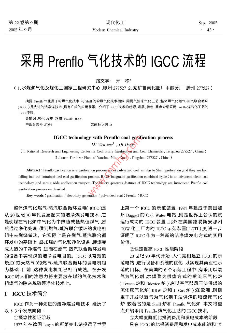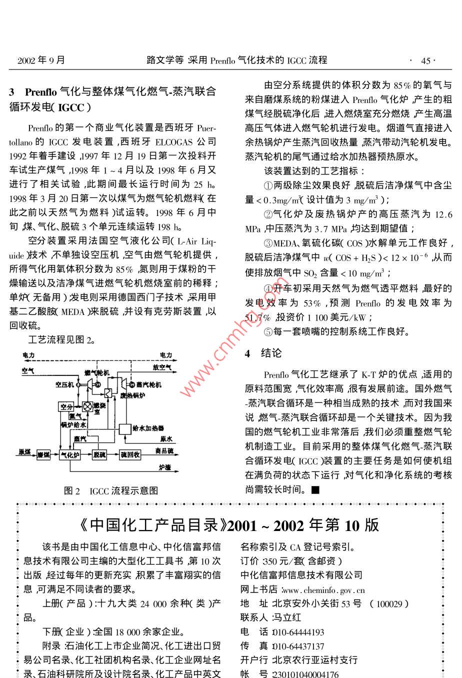 第22卷第9期現(xiàn)代化工ep. 20022002年9月Modern Chemical Industry43.采用Prenflo氣化技術(shù)的IGCC流程路文學(xué)亓棟?( 1.水煤漿氣化及煤化工國家工程研究中心滕州277527 2.兗礦魯南化肥廠甲醇分廠滕州277527)摘要Prenflo氣化屬于粉煤氣化技術(shù)與Shell的粉煤氣化技術(shù)相似同屬氣流床氣化工藝整體煤氣化燃?xì)庹羝?lián)合循環(huán)( IGCC)是先進(jìn)的潔凈煤技術(shù)具有廣闊的應(yīng)用前景。介紹了IGCC技術(shù)的起源進(jìn)展、特色重點介紹采用Prenlo煤氣化工藝的IGCC流程。關(guān)鍵詞:氣化發(fā)電粉煤,Prenlo ;CCC中圖分類號:T1Q54文獻(xiàn)標(biāo)識碼:AIGCC technology with Prenflo coal gasification processLU Wen-xue! , QI Dong2( 1.National Research and Engineering Center for Coal Slury Gasification and Coal Chenmicals , Tngzhou 277527 , China ;2. Lunan Fertilizer Plant of Yanzhou Mine Group , Tengzhou 277527 , China )Abstract : Prenlo gasification is a gasification process under pulverized coal similar to Shell gasification pand they are bothfalling into the entrained-bed coal gasification process. IGCC integrated gasifcation combined cycle ) is an advanced clean coaltechnology and ses a wide application prospect. The history progress features of IGCC technology are introduced Prenflo coalgasification process emphasized.Key words : gaifcation ; electricity generation ; pulverized coal ; Prenlo ; IGCC整體煤氣化燃?xì)鈅蒸汽聯(lián)合循環(huán)發(fā)電( IGCC )是上第一個I6CC的示范裝置;1984年建成于美國加從20世紀(jì)70年代發(fā)展起來的潔凈煤發(fā)電技術(shù),它州Daggett的CoolWater電站,則是世界上公認(rèn)的試是使煤在氣化爐中氣化為中熱值或低熱值煤氣然運行成功的ICCC裝置;此外在美國路易斯安那州后通過凈化處理供到燃?xì)鈤蒸汽聯(lián)合循環(huán)的發(fā)電機Dow化工廠內(nèi)的IGCC示范裝置( LGTI)則進(jìn)一步組中去燃燒做功。它實際上是在燃?xì)鈅蒸汽聯(lián)合循證明了ICCC作為-種新的潔凈煤發(fā)電方式的實用環(huán)發(fā)電的基礎(chǔ)上疊加煤的氣化和凈化設(shè)備使煤變價值。成人造的干凈煤氣進(jìn)而在燃?xì)?蒸汽聯(lián)合循環(huán)發(fā)電②快速提高IGCC性能階段的設(shè)備中實現(xiàn)煤的潔凈發(fā)電目的。ICCC以常規(guī)的20世紀(jì)90年代開始,人們競相建立IGCC的示燒油(或天然氣)的燃?xì)?蒸汽聯(lián)合循環(huán)的發(fā)電機組范電站進(jìn)行設(shè)備和系統(tǒng)的優(yōu)化,以實現(xiàn)其商業(yè)性示為基礎(chǔ),目前,這種發(fā)電機組已相當(dāng)成熟。在開發(fā)范的目標(biāo)。在美國的6個示范工程中,有采用以氧ICCC時人們的注意力將主要放在煤的氣化技術(shù)和氣為氣化劑,水煤漿為供煤方式的噴流床氣化爐粗煤氣的除灰脫硫等凈化技術(shù)上。( Texaco爐和Ddextec爐) ,有以空氣鼓風(fēng)干法供煤的流化床氣化爐( KRW爐和U-Gas爐);在歐洲則側(cè)1 IGCC 技術(shù)簡介重于開發(fā)以氧氣為氣化劑干法供煤的噴流床氣化,IGCC作為一種先進(jìn)的潔凈煤發(fā)電技術(shù)經(jīng)歷了爐較著名的是Shell 爐和Prenflo 氣化爐,本文將重以下3個發(fā)展階段:點介紹采用Prenflo煤氣化工藝的IGCC技術(shù)。①概念性驗證階段③大幅度降低比投資費用和發(fā)電成本的階段1972年在德國Lugen的斯第克電站投運了世界只有ICCC的比投資費用和發(fā)電成本能夠和PC現(xiàn)代化工第22卷第9期+FCD抗衡時,IGCC才有可能在發(fā)電市場上獲得一化爐噴嘴。爐膛內(nèi)火焰溫度達(dá)2 000°C,氣化爐內(nèi)襯定數(shù)量的應(yīng)用,樂觀地估計,這個目標(biāo)將在21世紀(jì)循環(huán)鍋爐水管煤中灰渣形成遮蔽層保護(hù)氣化爐外初實現(xiàn)。殼冷卻管內(nèi)產(chǎn)生飽和蒸汽。自爐中排出的液態(tài)渣發(fā)展ICCC技術(shù)的關(guān)鍵應(yīng)該是煤的氣化技術(shù)、在集渣器中冷卻成固體。集渣器中有破渣機,可將粗煤氣的凈化技術(shù)以及高溫高效率的燃?xì)鈅蒸汽聯(lián)較大的渣塊破碎。灰渣臨時收集在灰鎖斗內(nèi),并定合循環(huán)發(fā)電技術(shù)。期將渣排出系統(tǒng)。反應(yīng)生成的粗煤氣進(jìn)入廢熱鍋爐在此處經(jīng)激冷氣循環(huán)壓縮機輸送到廢熱鍋爐的2 Prenflo 粉煤氣化激冷煤氣激冷后混合煤氣溫度約為900C粗煤氣Prenflo 粉煤燃料的氣流床(攜帶床X pressrized夾帶的熔渣變成固體廢熱鍋爐產(chǎn)生高壓蒸汽混合entrained- flow gasification )技術(shù)由Krupp Uhde公司開煤氣出廢熱鍋爐經(jīng)過濾器除塵分離后大部分進(jìn)入洗發(fā)該技術(shù)繼承了K-T爐的優(yōu)點適用的原料范圍滌塔經(jīng)洗滌塔除塵后含塵量為1 mg/m2的煤氣送寬硬煤、褐煤、煙煤、石油焦等都可作為氣化原料。往后面工序。飛灰經(jīng)閘式料 斗循環(huán)返回氣化室的噴①可以氣化高灰分、高含硫煤預(yù)處理時要求硬嘴。煤粉75%的粒徑<0.1 mm,含水量為2% ,褐煤粉氣化爐大體分為兩部分,下部為氣化室上部為75%的粒徑<0.1 mm含水量約為6%。經(jīng)預(yù)處理廢熱鍋爐副產(chǎn)高壓蒸汽。兩者的交界處為激冷煤的煤粉用壓縮空氣送入常壓旋風(fēng)過濾器。氣入口。氣化室中有4個噴嘴在同一水平面上對②工藝流程見圖1。稱布置。氣化爐的內(nèi)襯也為鍋爐水(此點與Shell氣鍋爐蛤水蒸汽化爐相似)并副產(chǎn)中壓蒸汽,氣化爐的下部為排渣粉燃01P8口。02建于西班牙Puetollano 的IGCC發(fā)電裝置凈發(fā)電能力為300 MW混合