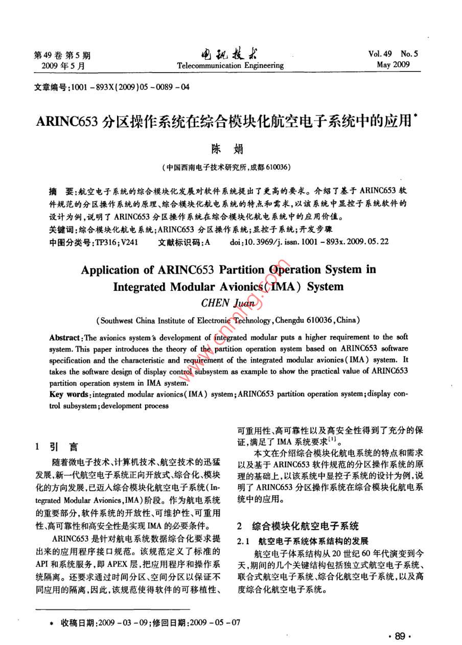 第49卷第5期電玩技款Vol 49 No 52009年5月Telecommunication EngineeringMay 2009文章編號:1001-893X(20)05-0089-04ARINC653分區(qū)操作系統(tǒng)在綜合模塊化航空電子系統(tǒng)中的應(yīng)用陳娟(中國西南電子技術(shù)研究所,成都610036)摘要:航空電子系統(tǒng)的綜合模塊化發(fā)展對軟件系統(tǒng)提出了更高的要求。介紹了基于 ARINC653軟件規(guī)范的分區(qū)操作系統(tǒng)的原理、綜合模塊化航電系統(tǒng)的特點和需求,以該系統(tǒng)中顯控子系統(tǒng)軟件的設(shè)計為例,說明了 ARINC653分區(qū)操作系統(tǒng)在綜合模塊化航電系統(tǒng)中的應(yīng)用價值關(guān)鍵詞:綜合模塊化航電系統(tǒng); ARINC653分區(qū)操作系統(tǒng);顯控子系統(tǒng);開發(fā)步驟中圖分類號:TP316;V241文獻標識碼:Adoi:10.3969/jisa.100-893x.2009.05.22Application of ARINC653 Partition Operation System inIntegrated Modular Avionics( IMA)SystemCHEN JuanSouthwest China Institute of Electronic Technology, Chengdu 610036, China)Abstract: The avionics systems development of integrated modular puts a higher requirement to the softsystem. This paper introduces the theory of the partition operation system based on ARINC653 softwarespecification and the characteristic and requirement of the integrated modular avionics( IMA) system. Ittakes the software design of display control subsystem as example to show the practical value of ARINc653partition operation system in IMA systemKey words: integrated modular avionics( IMA)system; ARINC653 partition operation system; display con-trol subsystem; development process可重用性、高可靠性以及高安全性得到了充分的保1引言證,滿足了IMA系統(tǒng)要求本文在介紹綜合模塊化航電系統(tǒng)的特點和需求隨著微電子技術(shù)計算機技術(shù)、航空技術(shù)的迅猛以及基于 ArINc653軟件規(guī)范的分區(qū)操作系統(tǒng)的原發(fā)展新一代航空電子系統(tǒng)正向開放式、綜合化、模塊理的基礎(chǔ)上,以該系統(tǒng)中顯控子系統(tǒng)的設(shè)計為例,說化的方向發(fā)展,已邁入綜合模塊化航空電子系統(tǒng)(In明了ARNC653分區(qū)操作系統(tǒng)在綜合模塊化航電系tegrated Modular Avionics,IMA)階段。作為航電系統(tǒng)統(tǒng)中的應(yīng)用的重要部分,軟件系統(tǒng)的開放性、可維護性、可重用性、高可靠性和高安全性是實現(xiàn)IMA的必要條件。2綜合模塊化航空電子系統(tǒng)Arinc53是針對航電系統(tǒng)數(shù)據(jù)綜合化要求提2.1航空電子系統(tǒng)體系結(jié)構(gòu)的發(fā)展出來的應(yīng)用程序接口規(guī)范。該規(guī)范定義了標準的航空電子體系結(jié)構(gòu)從20世紀60年代演變到今API和系統(tǒng)服務(wù),即APEX層,把應(yīng)用程序和操作系天,期間的幾個關(guān)鍵結(jié)構(gòu)包括獨立式航空電子系統(tǒng)、統(tǒng)隔離。還要求通過時間分區(qū)、空間分區(qū)以保證不聯(lián)合式航空電子系統(tǒng)綜合化航空電子系統(tǒng),以及高同應(yīng)用的隔離,因此,該規(guī)范使得軟件的可移植性、度綜合化航空電子系統(tǒng)。收稿日期:2009-03-09;修回日期:2009-05-0789第49卷第5期玩技求200年5月Telecommunication EngineeringMay 2009獨立式航空電子系統(tǒng)為“分立設(shè)備”的航空電子系服務(wù),也可以對各種服務(wù)的屬性加以控制,如任務(wù)調(diào)每種設(shè)備由它所包含的傳感器、處理器和顯示器完度、通信和內(nèi)部狀態(tài)信息等。文獻[1]中給出了操成該設(shè)備的獨立功能,連接介質(zhì)是點對點的導(dǎo)線。作系統(tǒng)、APEX接口和應(yīng)用軟件的關(guān)系。聯(lián)合式航空電子系統(tǒng)采用了一些標準的數(shù)據(jù)處3.2AR|NC653分區(qū)操作系統(tǒng)理器來完成諸如通信導(dǎo)航武器投放、外掛管理和飛3.2.1ARNC653分區(qū)操作系統(tǒng)軟件結(jié)構(gòu)行控制這樣的管理功能,處理器之間用時分多路總線基于 ARINC653的分區(qū)操作系統(tǒng)的軟件結(jié)構(gòu)如(ML-SD-1538)相接實現(xiàn)了全系統(tǒng)集中控制和圖1所示。用戶可以通過配置文件配置空間和時間統(tǒng)一顯示,在信息流的最后環(huán)節(jié)實現(xiàn)了資源共享。分區(qū)的調(diào)度信息,然后通過編譯配置文件進入綜合化航空電子系統(tǒng)的主要特點是使用了許多 ARINC53分區(qū)操作系統(tǒng),實現(xiàn)空間和時間分區(qū)的現(xiàn)場可更換模塊來完成各種信號處理和信息處理功調(diào)度的動態(tài)配置。ARNC653分區(qū)操作系統(tǒng)通過內(nèi)能這種模塊化的設(shè)計便于系統(tǒng)容錯和系統(tǒng)重構(gòu),并存管理單元(MMU)保證空間分區(qū)的空間隔離通過且由于同類模塊的大量生產(chǎn)降低了成本。該系統(tǒng)由嚴格的時間周期輪轉(zhuǎn)調(diào)度方法完成時間分區(qū)調(diào)度于集成度高、電降密度增加和實時數(shù)字處理增加,對在分區(qū)內(nèi)可實現(xiàn)優(yōu)先級調(diào)度或者輪轉(zhuǎn)調(diào)度策略。數(shù)據(jù)傳輸網(wǎng)絡(luò)的要求增高,因此開始使用高速光纖總線來連接處理器機架。應(yīng)用2應(yīng)用高度綜合化航空電子系統(tǒng)將上一階段(綜合化用戶模式航空電子系統(tǒng))結(jié)構(gòu)中通用數(shù)字綜合的思路應(yīng)用到射頻綜合,也將其模塊化和使其現(xiàn)場可重構(gòu),它們是[【暫【通用模塊,加駐不同軟件實現(xiàn)不同的功能。該系統(tǒng)從射頻部分到信號、信息處理部分都完全模