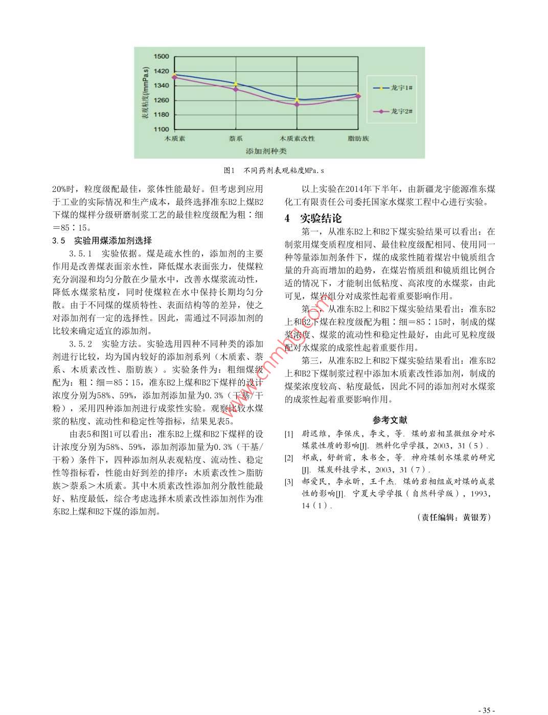 2016年第22期NO222016(總第373期中國高新核術企業(yè)Cumulativity NO 373)提高新疆準東煤水煤漿成漿濃度的實驗研究趙天運王秋生張向沛(新疆龍宇能源準東煤化工有限責任公司,新疆烏魯木齊8300000摘要:新疆龍宇能源準東煤化工年產40億立方煤制夭然氣氣化工芑采用碎煤加壓氣化與水煤漿氣化工藝組合,充分利用煤礦生產的塊煤和粉煤,提高煤炭資源的利用率,但新疆準東煤田的煤做水煤漿氣化存在成漿性差的問題,怎樣提高新疆準東煤的水煤漿濃度是目前急需解決的問題。文章以新疆準東煤田某露天礦煤為研究對象,研究了提高水煤漿濃度的辦法。關鍵詞:準東煤;水煤漿;成漿濃度;碎煤加壓;露夭煤礦文獻標識碼:中圖分類號:TQ536文章編號:1009-2374(2016)22-0303Dol:1.35351cnki11-440/m2016.20171概述槳試樣,在105℃~110℃下干燥至恒定,干燥后的試樣煤炭是我國的基礎能源,占能源消費總量的70%左質量占原樣質量的百分數作為水煤漿濃度。右,將來以煤炭為主的能源結構難以改變,隨著水煤漿3.1.2水煤槳粘度測定方法。水煤槳粘度測定方氣化技術不斷發(fā)展,人們對生產經營效益最大化要求越法參照GB/T18856.4200進行,用NXS4C型水煤漿粘度來越高,煤的成漿性是水煤漿氣化技術的核心,完善的計進行測定制漿工藝對提高水煤漿的濃度和降低水煤漿的成本起著3.1.3水煤漿穩(wěn)定性測定方法。水煤漿穩(wěn)定性測至關重要的作用。研究中發(fā)現影響水煤漿成漿濃度的因定方法參照GB/T1856.5-2002.用插棒法進行測定素較多,包括制漿用煤的煤巖組分、粒度級配、添加劑32常規(guī)制漿工藝成漿性實驗等均對水煤漿成漿濃度產生影響,下面就如何提高準東在試驗室內,模擬單磨機制漿工藝生產條件,選擇煤水煤漿濃度進行實驗。木質素改性添加劑,添加量分別在0.3%、0.5%(干基干粉)比例時,對準東B2上煤和B2下煤煤樣進行成漿性2實驗原料及添加劑實驗,實驗結果見表2:釆用準東煤田某露天礦B2層煤,煤質牌號為不粘結表2常規(guī)制漿工藝條件下的成漿性實驗結果煤,B2煤層厚度為20米左右,煤層按照成因環(huán)境及煤巖組分可分為2上和B2下,從煤巖顯微組分上看,B上惰煤樣名稱添加劑量濃度%流動性表觀枯度/、穩(wěn)定性質組組分高,鏡質組組分低,B2下鏡質組組分明顯高于782B2上,B2上及B2下煤的工業(yè)分析與元素分析及煤巖組分龍宇1#865分別見表C表龍字2#B2上及B2下煤的工業(yè)分析與元索分析a3.2.1由常規(guī)制漿工藝條件下實驗結果可以看出:常規(guī)制漿工藝條件下,在添加劑量為0.3%、0名ad- Ade Dafo ECdlHa9Nh(干基/干粉)時,準東B2上煤樣的成漿濃度為55.2%224469251842813|6838341.7740486.1%,準東B2下煤樣的成漿濃度為56.3%、57.5%;同B22091204133287464268213921160052時隨著添加劑量由0.3%增加到0.5%(干基/干粉)準東B2上煤和B2下煤樣的濃度分別提高0.9和1.2個百B2上及B2下煤的煤巖組分分析b分點。煤樣名稱。惰質組(%)。鏡質組(%)。礦物質(%)3.2.2煤樣的成漿濃度偏低會降低后續(xù)氣化系統(tǒng)0.9的氣化效率,增加生產成本,同時考慮煤漿流動性和穩(wěn)定性對工業(yè)生產的影響等因素3.3分級研磨工藝成漿性實驗3實驗根據國家水煤漿工程技術研究中心的分級研磨制漿31實驗方法工藝,通過優(yōu)化煤漿的粒度級配,提高煤漿的堆積效3.1.1水煤漿濃度測定方法。水煤漿濃度測定方率,進而提高煤漿濃度、流變性和穩(wěn)定性等。在實驗室法參照GB/T18856.2-2002進行,即稱取一定量的水煤對準東B2上煤和B2下煤樣進行了系列的粒度級配和可磨表3分級研磨制漿工藝條件下的成漿性實驗結果煤樣名稱喬加劑量/%濃度%流動性表觀粘度MPas穩(wěn)定性58.6龍宇11289B1237B龍宇2#60.8B-B表4準東B2上煤和B2下煤的最佳粒度級配實驗結果煤樣和:細粉比實際濃度表觀黏度粒度分布(累積含量)%MPas流動性穩(wěn)定性(8h)14mm<0.45mm<0.075mm<0.045mm58,25l157B39.5630.21龍宇1#85:1558.63B98.8988.7842.9834.5549.6538.1498.0287.3632.17龍宇2#85:1559.90B-98.4688.4380:2059.741285BB98.7688.8045813884表5四種添加劑成漿性能比較煤樣濃度(%)添加劑類型表觀黏度(MPas)流動性穩(wěn)定性(8h)58.63木質素萘系龍宇1#58.34木質素改性1266BB58脂肪族1295B--木質素1387萘系1319B龍宇2木質素改性1237脂肪族1282性試驗研究,獲得它們最佳粒度級配和比例(粗粉:細準東B2上煤和B2下煤樣在同一添加劑比例情況下,粉=80%∶20%時,粒度級配最佳,漿體性能最好。但考采用分級硏磨工藝比常規(guī)單磨機工藝的濃度分別提髙慮到應用于工業(yè)的實際情況和生產成本,我們最終選擇3個百分點以上,同時煤漿的流動性和穩(wěn)定性大幅度的粒度級配為粗粉:細粉=85%:15%)。提高添加劑選擇常規(guī)工藝中所用的木質素改性添加劑3.4準東制漿用煤最佳粒度級配確定分別在添加量為0.3%、0.5%(干基/干粉)時,對分級將制備好的準東煤粗、細粉分別按照90:1研磨制漿工藝的最髙成漿濃度進行系列實驗,實驗結果85:15、80:20的比例混合制漿,并對制得的煤漿進行見表3濃度、粘度、穩(wěn)定性、流變特性等性能測試:準東B2上由分級研磨制漿工藝實驗結果可以看出:采用分級煤和B2下煤的設計濃度分別為58%、59%,添加劑的添加研磨制漿工藝條件下,在添加劑量為0.3%、0.5%(干量為0.3%(干基/干粉),最佳粒度級配實驗結果及性基/干粉)時,淮東B2上煤樣的成漿濃度為58.6%能檢測見表4。59.4%,B2下煤樣的成漿濃度為59.9%、60.8%;同時隨從表4可以看出:準東B2上和B2下煤樣制漿