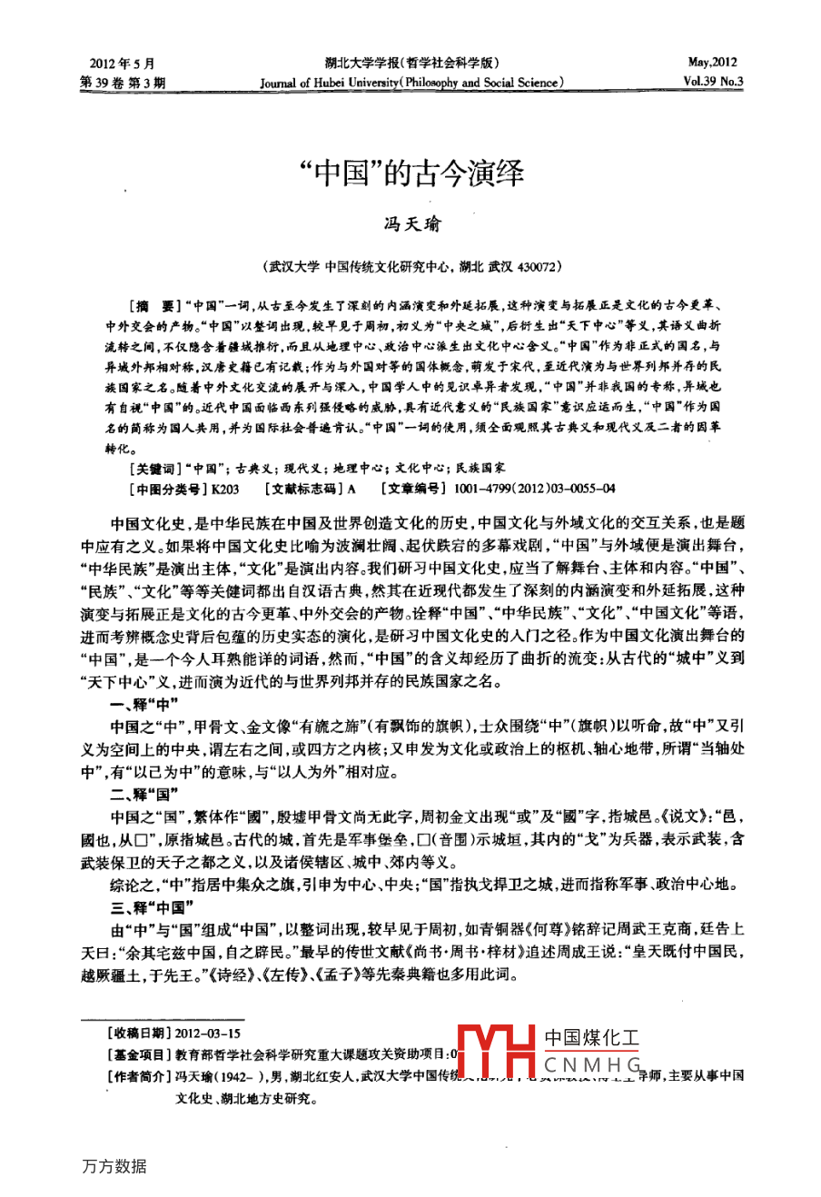 2012年5月湖北大學(xué)學(xué)報(哲學(xué)社會科學(xué)版May 2012第39卷第3期Journal of Hubei University( Philosophy and Social Science)Vol 39“中國”的古今演繹馮天瑜(武漢大學(xué)中國傳統(tǒng)文化研究中心,潮北武漢430072)[摘要]“中國”一詞,從古至今發(fā)生了深刻的內(nèi)涵演變和外延拓展,這種演變與拓展正是文化的古今更革中外交會的產(chǎn)物?!爸袊币哉~出現(xiàn),較早見于周初,初義為“中央之城”,后衍生出“天下中心”等義,其語義曲折流轉(zhuǎn)之間,不僅隱含著疆城推衍,而且從地理中心、政治中心派生出文化中心含義?!爸袊弊鳛榉钦降膰?與異城外邦相對稱,漢唐史籍已有記載;作為與外國對等的國體概念,萌發(fā)于宋代,至近代演為與世界列邦并存的民族國家之名。隨著中外文化交流的展開與深入,中國學(xué)人中的見識卓異者發(fā)現(xiàn),“中囚”并非我國的專稱,異城也有自視“中國”的。近代中國面臨西東列強侵略的威脅,具有近代意義的“民族國家”意識應(yīng)適而生,“中國”作為國名的簡稱為國人共用,并為國際社會普遍肯認。“中國”一詞的使用,須全面觀照其古典義和現(xiàn)代義及二者的因革[關(guān)鍵詞]“中國”;古典義;現(xiàn)代義;地理中心;文化中心;民族國家[中圈分類號]K203[文獻標志碼]A[文章編號]1001-4799(2012)09-0055-04中國文化史,是中華民族在中國及世界創(chuàng)造文化的歷史,中國文化與外域文化的交互關(guān)系,也是題中應(yīng)有之義。如果將中國文化史比喻為波瀾壯闊起伏跌宕的多幕戲劇,“中國”與外域便是演出舞臺,中華民族”是演出主體,“文化”是演出內(nèi)容我們研習(xí)中國文化史,應(yīng)當(dāng)了解舞臺、主體和內(nèi)容。中國”、民族”、“文化”等等關(guān)健詞都出自漢語古典,然其在近現(xiàn)代都發(fā)生了深刻的內(nèi)涵演變和外延拓展這種演變與拓展正是文化的古今更革、中外交會的產(chǎn)物詮釋“中國”、中華民族”、“文化”、“中國文化”等語,進而考辨概念史背后包蘊的歷史實態(tài)的演化是研習(xí)中國文化史的入門之徑。作為中國文化演出舞臺的“中國”,是一個今人耳熟能詳?shù)脑~語,然而,“中國”的含義卻經(jīng)歷了曲折的流變:從古代的“城中”義到“天下中心”義,進而演為近代的與世界列邦并存的民族國家之名。釋“中中國之“中”,甲骨文、金文像“有旒之旆”(有飄飾的旗幟),士眾圍繞“中”(旗幟)以聽命,故“中”又引義為空間上的中央,謂左右之間,或四方之內(nèi)核;又申發(fā)為文化或政治上的樞機、軸心地帶所謂“當(dāng)軸處中”,有“以己為中”的意味,與“以人為外”相對應(yīng)。中國之“國”繁體作“國”,殷墟甲骨文尚無此字周初金文出現(xiàn)“或”及“國”字指城邑。《說文》:“邑國也,從口”,原指城邑。古代的城首先是軍事堡壘,口(音圍)示城垣,其內(nèi)的“戈”為兵器,表示武裝含武裝保衛(wèi)的天子之都之義,以及諸侯轄區(qū)、城中、郊內(nèi)等義。綜論之,“中”指居中集眾之旗引申為中心中央;“國”指執(zhí)戈捍衛(wèi)之城進而指稱軍事、政治中心地三、釋“中國”由“中”與“國”組成“中國”,以整詞出現(xiàn)較早見于周初如青銅器《何尊》銘辭記周武王克商廷告上天日:“余其宅茲中國自之辟民?!弊钤绲膫魇牢墨I《尚書周書梓材》追述周成王說:“皇天既付中國民,越厥疆土,于先王。”《詩經(jīng)》、《左傳》、《孟子》等先秦典籍也多用此詞。[收稿日期]201203-15adH中國煤化工[基金項目]教育部哲學(xué)社會科學(xué)研究重大課題攻關(guān)資助項目[作者簡介]馮天瑜(1942),男湖北紅安人武漢大學(xué)中國傳CNMH師主要從事中國文化史、潮北地方史研究比大學(xué)學(xué)報(哲學(xué)社會科學(xué)版)第39卷中國”初義是“中央之城”,即周天子所居京師(首都),與“四方”對稱,如《詩經(jīng)大雅民勞》云民亦勞止,迄可小康,惠此中國,以綏四方。毛傳釋日:“中國,京師也?!睹献印とf章》講到舜深得民心、天意,“夫然后之中國,踐天子位。這些用例的“中國”,均指居天下之中的都城,即京師,誠如劉熙為《盂子》作注所說:帝王所都為中,故曰中國。初義京師的“中國”又有多種引申:(一)指諸夏列邦,即黃河中下游這一文明早慧、國家早成的中原地帶,居“四夷”之中,《詩·小雅·六月》序:“四夷交侵中國微矣?!蔽髦軙r,“中國”主要包括宋、衛(wèi)晉齊等中原諸侯國,此義的“中國”后來在地域上不斷有所拓展。(二)指國境之內(nèi)。《詩·大雅》:“文王日咨,咨女殷商女無烋于中國,斂怨以為德?!薄豆攘簜髡压辍纷?“中國,猶國中也(三)指中等之國?!豆茏印钒创笮∨帕袑曳譃橥鯂?、敵國、中國、小國。(四)指中央之國?!读凶印钒捶轿慌帕袑曳譃槟蠂?、北國、中國。以上多種含義之“中國”,使用頻率最高的,是與“四夷”對稱的諸夏義的“中國”,如《詩經(jīng)小雅·六月》序云:《小雅》盡廢,則四夷交侵,中國微矣。南朝宋劉慶義《世說新語·言語》說:“江左地促,不如中國?!碧迫隧n愈《上佛骨表》云:夫佛者,夷狄之一法耳,自后漢時傳入中國,上古未嘗有也。這些“中國”,皆指四夷萬邦環(huán)繞的中原核心地帶。其近義詞則有“中土”、“中原”、“中州”、“中夏”、“中華”等等四、中國疆域推衍中華先