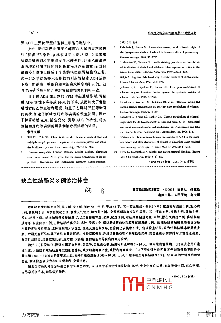 臨床消化病雜本2001年第13卷第4期乙醇對胃乙醇脫氫酶活性變化的影響R5 A中國醫(yī)科大學第一臨床附屬醫(yī)院消化內科(沈陽10001)王國祥程云友李軍劉事榮犢萋目的:探討乙醇對胃乙醇脫氫膨( Alcohol dehydrogenase,ADH活性變化的彩響。方法: Wistar大鼠52隨機分成兩組:模型組32只,對照組20只。用乙醇直接灌胃的方法建立大鼠模型;用酶組織細胞化學染色技術,觀察胃DH活性變化,并用 LUZEX-F灰度圖像分析儀進行半定量。結果:隨砦乙醇灌注量的增加和灌注時間的延長,胃ADH活性進行性下降,與對照組有顯著性差異(P<0.05);停止癟注后1個月,胃ADH活性明顯恢復,且與正常對照組無顯著性差異(P>0.05)。結論:乙醇導致胃ADH活性進行性下降從而降低了乙醇首過代謝,增加了乙醇對肝臟等器官的毒害作用關鍵調乙醇脫氫酶乙醇組織細胞化學胃Effect of Alcohol on Active Alteration of Gastric Alcohol DehydrogenaseWang Guo-xiang, Cheng Yun-you, LI Jun, et alDigestion Department of Internal Medicine, The First Armlliated Clinical Haspital, China Medical Uaiversity, Shenyangl1000lAbstract Purpose: Effect of alcohol on activity variety of gastric alcohol dehydrogenase( ADH)wasinvestigated. Methods: Fifty-two rats were divided into two groups in model one( 32/52)and control one(20/52), at random. Model one was made of directly perfusing alcohol into stomach. The activity varietiesof gastrobserved by the optical microscopy after gastric tissues were stained by enzyme histo-cytochemistry assay. The activity varieties were determined by LuzEx-F analysis instrument as a semimethod. Results: It was shown that the activities of gastric adh gradually decreased alongthlume of alcohol increased and the duration of perfusion prolonged. There were significant differences between model group and control one( P <0. 05). The activity of gastric ADH significantly recoveredone month after abstinence from alcohol. There were not significant differences between two groups(P>0. 05). Conclusion: Alcohol resulted in activity descending of gastric ADH, as a result of decreasing firatpass metabolism of gastric alcohol and increasing alcoholic poisonous roles in liver and other organsKey words Alcohol dehydrogenase Alcohol Enzyme histo-cytochemistry assay Stomach乙醇脫氫酶( Alcohol dehydrogenase,ADH)是參下,用平衡飼料喂養(yǎng)。與乙醇代謝的重要酶類之一(。它主要氧化乙醇成1.2實驗方法乙醛,乙醛又在乙醛脫氫酶作用下生成乙酸最后分解1.2.1動物模型建立:實驗動物隨機分為兩組,其中成二氧化碳和水。近年來,胃ADH在乙醇首過代謝對照組20只模型組32只。正常喂養(yǎng)1周后開始建( First pass metabolism,FPM)中的作用倍受人們矚立模型。(1)模型組給予40%的乙醇(國產分析醇),8目認為胃ADH在乙醇FPM中起主要作用23。然g/(kgd),分3次灌胃;至第4周末將乙醇濃度升至而目前關于長期飲酒后的胃ADH活性變化的研究較50%,9g/(kgd,分3次灌胃;至第8周末,乙醇量升少,另外,胃ADH活性的變化與胃粘膜病理改變的關至10g/(kgd),分3次灌胃;至第12周末模型建立成系亦未確定,為此我們進行了相關的實驗性研究功。(2)對照組給予相同體積的蒸餾水灌胃,日3次。兩組均于開始灌胃后4周末、8周末、12周末分批處1對象和方法死模型組各8只,對照組各5只。兩組余下的動物用平衡飼料判1個目后處研聯(lián)酪后迅速切取新鮮胃1,1實驗對象6周齡雄性wsar大鼠52只,體重體組織00±10g,由中國醫(yī)科大學實驗動物部提供,每籠8查。CNMHG只,分籠飼養(yǎng)。按晝夜時程,在室溫及穩(wěn)定濕度條件1.2.2胃組織病理學檢查:胃組織行常規(guī)HE染色臨床消化病雜志201年第13第4期159光鏡下觀察胃組織(主要是粘膜層)的病理改變。表2停止灌注乙醇后1個月模型組與對照組胃ADH灰度值1.23ADH酶組織化學檢測方法1:(1)迅速把組織x±s)切成適當大小(約5×5×3mm),放入OCT包埋劑,用組別ADH(x±)干冰丙酮或液氮迅速凍結。(2)用 Cryostat(-1516周對照組129.09±11.7020℃)制成12m之冰凍切片。(3)用0.1MPBS(p型組130.01±9.104)稀釋2%~4%的戊二醛固定1分鐘。(4)用0.1與對照組相比P>005MPBs洗45分鐘或過夜。(5)切片在下述孵育液中孵育,用NBT法為37℃,60分鐘。乙醇四唑鹽還原3討論酶的孵育液:0.1MPBS(pH7.4)10m,NAD’60mg,45%乙醇3ml,NBT6ml,蒸餾水1ml,PMS3ADH是乙醇代謝通路上的重要酶類之一,它主mg。(6)用蒸餾水沖洗。(7)用甘油膠封固。(8)對照要氧化乙醇成乙醛,乙醛又在乙醛脫氫酶作用下生成實驗:在孵育液中,不加乙醇或n丁醇而用蒸餾水代乙酸最后代謝成二氧化碳和水。目前已發(fā)現(xiàn)的ADH替。光鏡下通過觀察反應產物沉淀密度的變化來反映有7個基因型表現(xiàn)型分為5類。ADH主要為aBy、各組之間ADH的活性變化;并用 LUZXC-F灰度圖像xx、0亞單位組成二聚體,分布廣泛,主要分布于胃腸分析儀(日本產)測定ADH的灰度值進行指標量化。和肝臟內。胃ADH主要包括3類即I類、Ⅲ類Ⅳ類1.3統(tǒng)計學處理:結果經計算機SAS6.11統(tǒng)計軟件ADH。在1985年, Julknmen等6發(fā)現(xiàn)靜脈給予和進行方差分析和q檢驗??诜葦?shù)量的乙醇后其血乙醇和乙酸水平是不同的。他們發(fā)現(xiàn)靜脈給乙醇組的血乙醇水平明顯高于口2結果服組的血乙醇水平;而且血乙酸即乙醇代謝產物的水平在口服給予乙醇者比靜脈給予乙醇者明顯升高。由21胃組織病理學改變光鏡下模型組與對照組此推論:乙醇部分容量沒有進入全身循環(huán),而在胃腸道HE染色結果對比可見胃粘膜層細胞(包括主細胞和代謝這種部分乙醇在胃腸內的代謝叫乙醇首過代謝壁細胞)水腫變