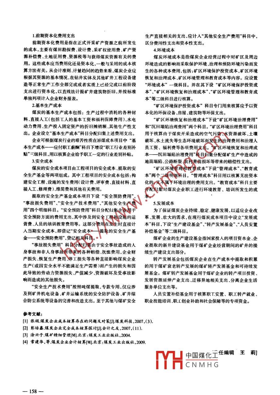 2009年第32期經(jīng)濟(jì)研究導(dǎo)刊No.32,2009總第70期ECONOMIC RESEARCH GUIDESerial No.70煤炭企業(yè)煤炭成本核算研究張福成(七煤(集團(tuán))公司東風(fēng)煤礦.黑龍江七臺(tái)河154600)摘要:煤炭企業(yè)成本核算中存在的主要問(wèn)題有煤炭 成本沒有被如實(shí)反映,職工待遇不合理,安全生產(chǎn)投入不足、發(fā)展成本缺失環(huán)境成本缺項(xiàng),退出成本和費(fèi)用沒有被反映等。煤炭成本核算應(yīng)將企業(yè)環(huán)境、安全、發(fā)展等方面開支單獨(dú)列項(xiàng)進(jìn)行核算,與一般成本項(xiàng)目可以劃分清楚。將煤炭成本劃分為前期資本化費(fèi)用、基本生產(chǎn)成本、安全成本、環(huán)境成本、發(fā)展成本,如實(shí)準(zhǔn)確合理地反映煤炭?jī)r(jià)格信息。關(guān)鍵詞:煤炭企業(yè);煤炭成本;核算; .中圍分類號(hào):F270文獻(xiàn)標(biāo)志碼:A 文章編號(hào): 1673 -291X(2009)32- -0157. -02隨著我國(guó)社會(huì)主義市場(chǎng)經(jīng)濟(jì)體制的不斷完善.煤炭企業(yè)提折舊和留存收益作為其生產(chǎn)發(fā)展基金.由于沒有足夠的資內(nèi).外部的經(jīng)濟(jì)環(huán)境發(fā)生了巨大的變化.原有的成本核算體金來(lái)源.影響了礦井后續(xù)生產(chǎn)和盈利水平。隨著企業(yè)的改革系已不能適應(yīng)企業(yè)發(fā)展的需求?,F(xiàn)行的煤炭成本核算也增添與發(fā)展,已經(jīng)不適應(yīng)煤炭企業(yè)改革發(fā)展新形勢(shì)的要求。了許多新內(nèi)容。因此,必須深人認(rèn)真地進(jìn)行研究。4.環(huán)境成本缺項(xiàng)在煤炭的開采和加工過(guò)程中,除了因塌陷造成一定的土一、煤炭企業(yè)成本核算 中存在的主要問(wèn)題地資源破壞外.煤炭生產(chǎn)、洗選、運(yùn)輸會(huì)造成地面,水資源、大1.煤炭成本沒有被如實(shí)反映氣等環(huán)境污染。現(xiàn)行的成本核算體系中.只有塌陷補(bǔ)償費(fèi)一煤炭企業(yè)通過(guò)地下作業(yè)開采資源,開采之前必須有可靠項(xiàng), 沒有規(guī)范其他礦區(qū)環(huán)境污染的治理費(fèi)用的支出標(biāo)準(zhǔn)和范的資源。因此,在建礦之前.必須對(duì)資源進(jìn)行-系列的勘測(cè)工作。在計(jì)劃經(jīng)濟(jì)時(shí)期,國(guó)家包攬了所有的煤炭地質(zhì)勘查T.作,5.退出成本和費(fèi)用沒有被反映煤礦只要在指定的地點(diǎn)建井就行了。市場(chǎng)經(jīng)濟(jì)條件下,企業(yè)煤炭是不可再生資源.當(dāng)企業(yè)的開采處于資源枯竭階段新建礦井不僅要依靠自己出資取得探礦權(quán).購(gòu)買采礦權(quán).而時(shí),所有的煤礦都會(huì)因資源枯竭而關(guān)閉退出。煤礦關(guān)閉前,企且還要出資對(duì)煤田進(jìn)行進(jìn)一步的精查 ,才能進(jìn)行礦井的設(shè)計(jì)業(yè)需要大量資金用于轉(zhuǎn)產(chǎn)和人員安置,而這些費(fèi)用目前企業(yè)和施T。這些為了取得探礦權(quán)和開采權(quán)的費(fèi)用支出以及此后不能預(yù)提計(jì)人成本,所需的資金沒有來(lái)源。目前.國(guó)家對(duì)資源年度的攤銷都要通過(guò)成本核算進(jìn)行補(bǔ)償??萁叩V井通過(guò)專項(xiàng)財(cái)政補(bǔ)貼實(shí)施關(guān)閉破產(chǎn).國(guó)家僅對(duì)職工安2.煤礦職工待遇不合理置進(jìn)行補(bǔ)助,并未對(duì)煤炭企業(yè)的轉(zhuǎn)產(chǎn)進(jìn)行扶持,僅靠企業(yè)自煤炭行業(yè)屬于高風(fēng)險(xiǎn).艱苦行業(yè).煤礦職工T資和福利行積累,增加了企業(yè)負(fù)擔(dān)。待遇同銀行、電力、鐵路等其他行業(yè)職T相比較低.企業(yè)職工二、煤炭成本的核算收入受煤炭?jī)r(jià)格和成本波動(dòng)影響較大。職工工資水平總體不高,直接造成煤礦急衢的采礦、地質(zhì)機(jī)電等專業(yè)人才流失,目前,我國(guó)煤炭企業(yè)成本核算基本上反映的是制造成嚴(yán)重制約了煤礦的技術(shù)進(jìn)步與管理創(chuàng)新。本。盡管國(guó)家允許企業(yè)根據(jù)原煤產(chǎn)量提取-定有關(guān)煤礦安全3.安全生產(chǎn)投入不足,發(fā)展成本缺失及礦區(qū)環(huán)境方面的費(fèi)用。但由于不全面.使當(dāng)前的煤炭成本財(cái)政部.國(guó)家發(fā)改委、國(guó)家煤礦安全監(jiān)察局關(guān)于印發(fā)《煤偏低,不能真實(shí)地反映其實(shí)際支出水平.造成了煤炭?jī)r(jià)格與炭生產(chǎn)安全費(fèi)用提取和使用管理辦法》和《關(guān)于規(guī)范煤礦維價(jià)值相背離。因此,應(yīng)當(dāng)將企業(yè)環(huán)境、安全、發(fā)展等方面開支簡(jiǎn)費(fèi)管理問(wèn)題的若干規(guī)定》雖然對(duì)不同規(guī)模,不同類型的煤?jiǎn)为?dú)列項(xiàng)進(jìn)行核算,與一般成本項(xiàng)目可以劃分清楚。將煤炭炭企業(yè)規(guī)定了安全生產(chǎn)費(fèi)用的提取標(biāo)準(zhǔn).但對(duì)煤賣生產(chǎn)安全成本劃分為前期資本化費(fèi)用、基本生產(chǎn)成本.安全成本、環(huán)境費(fèi)和煤礦維簡(jiǎn)費(fèi)用等提取標(biāo)準(zhǔn)規(guī)定過(guò)死.提取額過(guò)低。礦井成本中國(guó)煤化準(zhǔn)確、合理地反映煤開拓廷深技術(shù)改造和新技術(shù)的推廣主要由煤炭企業(yè)自己計(jì)炭?jī)r(jià)格YHCNMHG收稿日期:2009-10-02作者簡(jiǎn)介:張福成(1973-),男,黑龍江七臺(tái)河人,會(huì)計(jì)師,從事企業(yè)財(cái)會(huì)研究。一157-1.前期