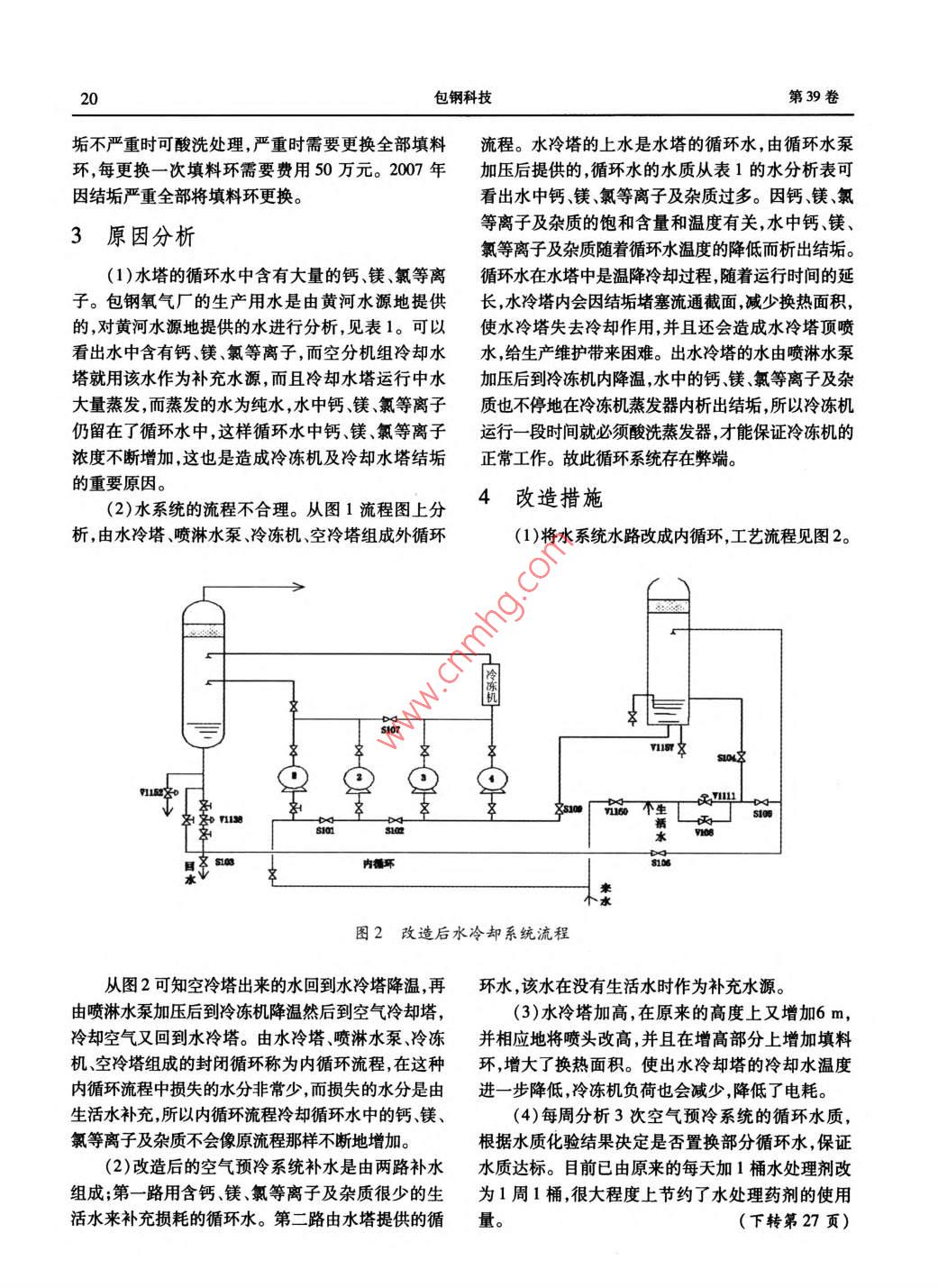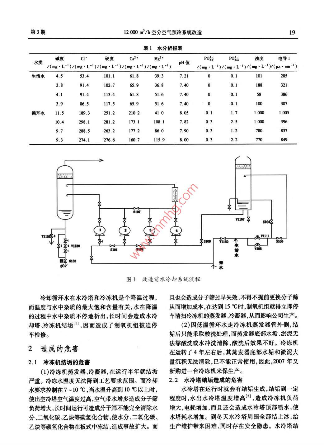 第39卷第3期包鋼科技Vol 39. No. 32013年6月Science and Technology of Baotou SteelJune, 201312000m3/h空分空氣預(yù)冷系統(tǒng)改造習(xí)建剛(內(nèi)蒙古包鋼鋼聯(lián)股份有限公司氧氣廠,內(nèi)蒙古包頭014010)摘要:空冷塔、水冷塔、冷凍機噴淋水泵等是大型空分空氣預(yù)冷系統(tǒng)的重要組成設(shè)備,冷卻水水質(zhì)的好壞決定這些設(shè)備運行的穩(wěn)定性連續(xù)性。文章以120m3/h制氧機為例進行詳細分析,并對該機組空氣預(yù)冷的水系統(tǒng)進行了改造,改造后設(shè)備運行穩(wěn)定解決了水冷塔及冷凍機結(jié)垢的問題,延長了設(shè)備運行周期降低生產(chǎn)成本。關(guān)鍵詞;空冷塔;水冷塔;冷凍機;水系統(tǒng);改造中圖分類號:TQ116.11文獻標識碼:文章編號:1009-5438(2013)03-0018-0Transformation of 12 000 m/h Air Separation and Air Precooling Systemtan-gangOxygen Plant of Steel Union Co. Ltd. of Baotou Steel( Group )Corp . Baotou 014010, Nei Monggol, China)Abstract: The equipment such as air cooling towers, water cooling towers, chillers and sprinkler pumps are importantcomponents of large air separation and air precooling system. The stability and continuity for operations of the equipment ardependent on the quality of cooling water. In the paper, the 12 000 m/h oxygen making machine is taken as an example foranalysis in detail and the air precooling water system of this unit is transformed. As a result, the operations of equipment arestable, with which the problem of scaling in water cooling towers and chillers is solved as well as the running period ofquipment is prolonged and production costs are reducedKey woooling tower; water cooling tower; chiller; water system; transformation包鋼氧氣廠12000m3/h空分設(shè)備于2003年水分析報表見表112月建設(shè)投產(chǎn),采用DCS控制系統(tǒng),全低壓常溫分從表1可以看出對敞開式水循環(huán)系統(tǒng),換熱設(shè)子篩吸附凈化、增壓透平膨脹機、全精餾無氫制氬和備材質(zhì)為碳鋼,采用磷系復(fù)合配方處理的循環(huán)水氧氮外壓縮流程,空氣預(yù)冷系統(tǒng)在投入運行后,經(jīng)Ca2、Mg2含量較生活水高,個別循環(huán)水水樣濃縮常出現(xiàn)冷凍機的冷凝器、蒸發(fā)器結(jié)垢而被迫停車處倍率為3,諸多因素導(dǎo)致雜質(zhì)進入冷卻系統(tǒng)容易引理,水冷塔因結(jié)垢造成冷卻水溫降不好,增加了冷凍起結(jié)垢、腐蝕、粘泥附著,影響設(shè)備安全穩(wěn)定運行。機負荷及空分電耗,同時水冷塔頂部向外噴水,嚴重1.2原工藝流程不合理影響了空分正常生產(chǎn)。原工藝流程如圖1所示。1水冷卻系統(tǒng)中存在的問題從流程圖上可知本機組空氣預(yù)冷系統(tǒng)的水冷卻塔是由外循環(huán)供水,冷卻循環(huán)水中雜質(zhì)的含量過高1.1循環(huán)冷卻水中雜質(zhì)過高收稿日期:2013作者簡介:習(xí)建剛(1971-),男,河北省石家莊市人,制氧工程師現(xiàn)從事氧氣生產(chǎn)和設(shè)備管理工作。第3期12000m3/h空分空氣預(yù)冷系統(tǒng)改造19表1水分析報表堿度硬度水類pH值濁度電導(dǎo)/(mg·L-1)/(mg·L-)/(m·L1)/(mg·L-1)/(mg·L-1)/(mg·L-)/(mg·L-1)/(mg·L-)(ws·cm-1)生活水4.553.43.891436.87.40l88113.4703860.1l1.5251.2210.28.10.428l.2173.1108.17.820.32.51000288.5263.20.3274.1276.6160.7115.90.32.2770v冒sIo911160s101圖1改造前水冷卻系統(tǒng)流程冷卻循環(huán)水在水冷塔和冷凍機是個降溫過程,且也會造成分子篩過早失效不得不提前更換分子篩而溫度與水中雜質(zhì)的最大飽和含量有關(guān),水在降溫從而增加成本在達到15℃時制氧機組就得立即停的過程中水中雜質(zhì)不停地析出,長時間會造成水冷車清掃冷凍機的蒸發(fā)器、冷凝器,從而影響公司生產(chǎn)卻塔冷凍機結(jié)垢,因而造成了制氧機組被迫停2)因低溫循環(huán)水走冷凍機蒸發(fā)器管外側(cè),結(jié)車檢修。垢后只能采取酸洗處理,而蒸發(fā)器底部水垢淤泥無2造成的危害法靠酸洗或水沖洗清除,酸洗后效果不好。冷凍機在運轉(zhuǎn)了4年左右后,其蒸發(fā)器底部水垢和淤泥大2.1冷凍機結(jié)垢的危害量沉積無法清除,已不能正常使用,因此,2007年又(1)冷凍機蒸發(fā)器冷凝器,在運行半年就結(jié)垢新購進一臺冷凍機來保生產(chǎn)嚴重。冷凍水溫度無法降到工藝要求范圍。而冷卻2.2水冷塔結(jié)垢造成的危害水要求控制在7~10℃,當水溫升高到10℃以上時,水冷塔在運行時就會有結(jié)垢生成,結(jié)垢到一定使出空冷塔空氣溫度過高空氣帶水增多造成分子篩程度時水出水冷塔溫度增高2,造成冷凍機負荷負荷增大,長時間運行可造成分子篩不能完全清除水增大,電耗增加,而且還會造成水冷塔頂部噴水,使分、二氧化碳、乙炔等碳氫化合物使水分、二氧化碳、水塔耗水增加。到冬天水冷塔周圍全部結(jié)上冰給乙炔等碳氫化合物在板式中凍結(jié)造成事故擴大。而生產(chǎn)維護帶來困難、同時存在安全隱患。水冷塔結(jié)包鋼科技第39卷垢不嚴重時可酸洗處理,嚴重時需要更換全部填料流程。水冷塔的上水是水塔的循環(huán)水,由循環(huán)水泵環(huán),每更換一次填料環(huán)需要費用50萬元。2007年加壓后提供的,循環(huán)水的水質(zhì)從表1的水分析表可因結(jié)垢嚴重全部將填料環(huán)更換。看出水中鈣、鎂氯等離子及雜質(zhì)過多。因鈣鎂氯3原因分析等離子及雜質(zhì)的飽和含量和溫度有關(guān),水中鈣、鎂、氯等離子及雜質(zhì)隨著循環(huán)水溫度的降低而析