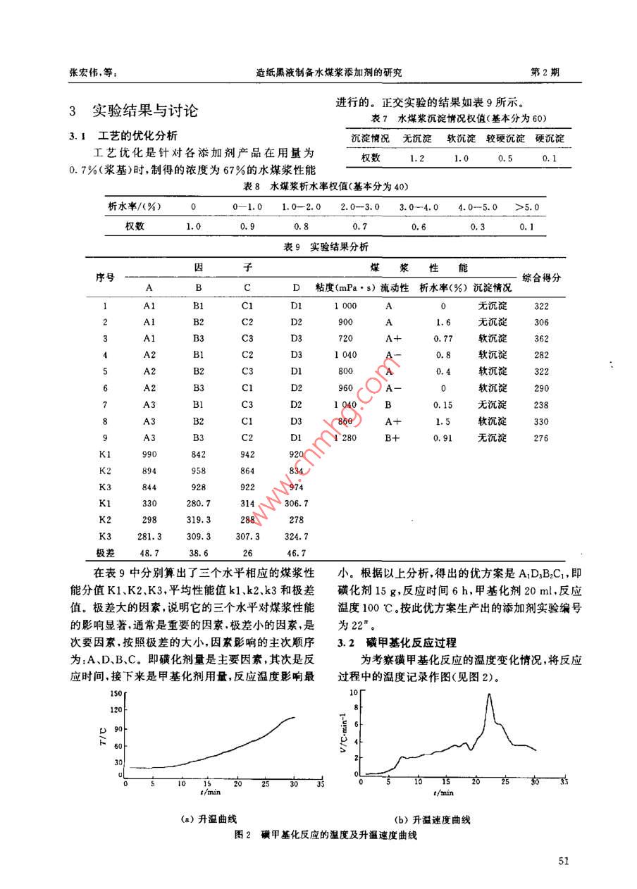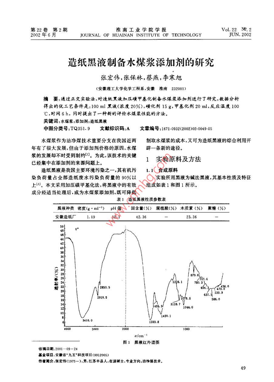 第22卷第2期淮南工業(yè)學(xué)院學(xué)報Vol 22 NO2002年6月JOURNAL. OF HUAINAN INSTITUTE OF TECHNOLOGYJUN.2002造紙黑液制備水煤漿添加劑的研究張宏偉,張保林蔡燕,李寒旭(安徽理工大學(xué)化學(xué)工程系,安徽淮南232001)摘要:通過正交實驗法,對造紙黑液加壓磺甲基化制備水煤漿添加劑進(jìn)行了研究,數(shù)挹分析得出的優(yōu)工藝條件是:100ml黑液(濃度20%),磺化劑15g,甲基化劑20ml,反應(yīng)溫度100C,時間6h,同時提出了一種新的評價水煤漿性能的方法。關(guān)鍵詞:水煤漿;添加劑;造紙黑液中圖分類號:TQ351.9文獻(xiàn)標(biāo)識碼:A文章編號:1671-0932(2002)020049-05水煤漿作為潔凈煤技術(shù)重要分支在我國近兩制取水煤漿的成本,又可為造紙黑液的綜合利用開年有了很大發(fā)展,但由于添加劑價格的原因,水煤辟一條新的途徑。漿的發(fā)展卻不時受到制約1。為此,該技術(shù)的關(guān)鍵已經(jīng)集中在添加劑的來源問題上1實驗原料及方法造紙黑液是我國主要環(huán)境污染之一,其有機污1.1合成原料染負(fù)荷量占全部造紙廢水污染負(fù)荷量的90%以實驗所用黑液為堿法黑液,其基本性質(zhì)及特征上。本文采用加壓磺甲基化法,將黑液中的有效組成如表1和圖1所示。成分經(jīng)適當(dāng)處理后,成為水煤漿添加劑,既可降低表1造紙黑液性質(zhì)參數(shù)表液種類密度(g·m-)pH值固含量(%)腐植酸(%)木質(zhì)素(%)聚糖(%)安徽造紙廠l.942.3623.3680. 3285052919.53416.01593.81黑液紅外譜圖收稿日期:2001-09-24基金項目:安徽省“九五”科技項目(9912005)作者簡介張宏偉(1975-),男,江蘇豐縣人,在讀碩士,專業(yè)方向:潔凈煤技術(shù)淮南工業(yè)學(xué)院學(xué)報02年第22卷在圖1中3416cm-處,有羥基(-OH)伸縮1.3實驗煤樣振動寬吸收帶;2919.5cm和2850.5cm處,煤的工業(yè)分析和粒度分布列于表3、表4。有甲基、亞甲基、次甲基伸編振動吸收帶;1593.8表3煤的工業(yè)分析cm-,1495.9cm-1,694.3cm-1處,有苯環(huán)骨架伸煤種M,〔%)A4(%Va(%)HGI縮振動特征吸收帶,加之470—586cm處芳香核準(zhǔn)南洗精煤1.0214.1129.2268CH振動吸收帶;以及1118.7cm-1處是不飽和醚及芳香醚吸收峰、1226.1cm-'、1079.6cm-1處表4煤的粒度分布數(shù)據(jù)峰是磺酸鹽特征吸收峰等,表明了造紙黑液中含有芳香族化合物,其分子包含有-OH、一CH2粒度(目)100<20CH2、磺酸鹽類等離子基團(tuán),根據(jù)文獻(xiàn)[3],對其作百分比(%)10094.647.8適當(dāng)改性,則可以做為水煤漿添加劑1.2添加劑制備1.4水煤漿性能測試影響添加劑制備的因素眾多,在以前實驗的基制漿時采用定時電動攪拌器攪拌,在800礎(chǔ)上,加壓磺甲基化固定了部分因素,著重考察磺1000r/min的轉(zhuǎn)速下攪拌10min。粘度采用旋轉(zhuǎn)化劑加入量,甲基化劑加入量,反應(yīng)溫度和反應(yīng)時式粘度計測定,測試條件:3“轉(zhuǎn)子,60r/min。水煤間,通過正交實驗法確定加壓磺甲基化工藝的制漿的穩(wěn)定性用靜止析水法來表征,即3d后測量試備方案見表2。管中析出的水高占煤漿總高的百分率;水煤漿的表2正交實驗因素水平表流動特性用目測流動性來表示。同時,用落棒實驗B來考察煤漿的沉淀情況。最后根據(jù)原始記錄,采用水平磺化劑量(g)甲基化劑量(m)綜合評分法來評價水煤漿的性能。11.22評價水煤漿性能的綜合評分法評價水煤漿性能常用的有四個指標(biāo):粘度、流23B31.3動性析水率和穩(wěn)定性。但在實際應(yīng)用中難免會顧D此失彼,使對于水煤漿性能的評價難以客觀全面的反應(yīng)溫度(℃)反應(yīng)時間(h)進(jìn)行。參照正交實驗分析中的數(shù)據(jù)處理方法并結(jié)ccc115DDD合制備水煤漿的實踐經(jīng)驗,提出了以下的綜合評價方法這種方法的基本思路是在同一濃度的前提下,根據(jù)水煤漿四個指標(biāo)的相對重要性,分別給他們不制備方法系將黑液稀釋到20%左右,取100同的基本分,然后對每個指標(biāo)不同的檔次水平給出m造紙黑液加入高壓反應(yīng)釜(250m)中,用50-不同的權(quán)值,對于任一個指標(biāo)用權(quán)值乘于基本分60ml蒸餾水稀釋定量的磺化劑加人反應(yīng)釜中并得到該指標(biāo)在該檔次水平的得分值然后對四個指加入定量的甲醛,密封反應(yīng)釜,打開電源,開始攪標(biāo)的得分值求和得到水煤漿性能的綜合得分值拌,攪拌速率為28r/mn,同時開始加熱,加熱電從而確定水煤漿整體性能的優(yōu)劣(見表5—表8)壓為140V。待指示溫度與設(shè)定溫度相差10-15表5水煤漿流動性權(quán)值(基本分為100C時,調(diào)節(jié)電壓至7080V。當(dāng)達(dá)到設(shè)定溫度時流動性A+AA-B+BB-C恒溫數(shù)小時,到設(shè)定時間時,停止加熱與攪拌,關(guān)閉電源讓反應(yīng)釜自然冷卻到室溫,打開反應(yīng)釜,取出權(quán)數(shù)1.51.31.11.00.50.30.1反應(yīng)液,并裝人容量瓶中保存,以備制水煤漿之用表6水煤漿粘度權(quán)值(基本分為80)粘度(mPa·s)<300300-500500-700750-900900-1001100-13001300-1500>1500權(quán)數(shù)張宏偉,等造紙黑液制備水煤漿添加劑的研究第2期3實驗結(jié)果與討論進(jìn)行的。正交實驗的結(jié)果如表9所示。表7水煤漿沉淀情況權(quán)值(基本分為60)3.I工藝的優(yōu)化分析淀情況無沉淀軟沉淀較硬沉淀硬沉淀工藝優(yōu)化是針對各添加劑產(chǎn)品在用量為權(quán)數(shù)L.2l.00.50.10.7%(漿基)時,制得的濃度為67%的水煤漿性能表8水煤漿析水率權(quán)值(基本分為40)析水率/(%)0-1.01.0-2