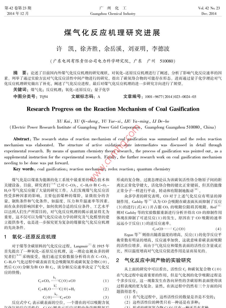 煤氣化反應(yīng)機(jī)理研究進(jìn)展
