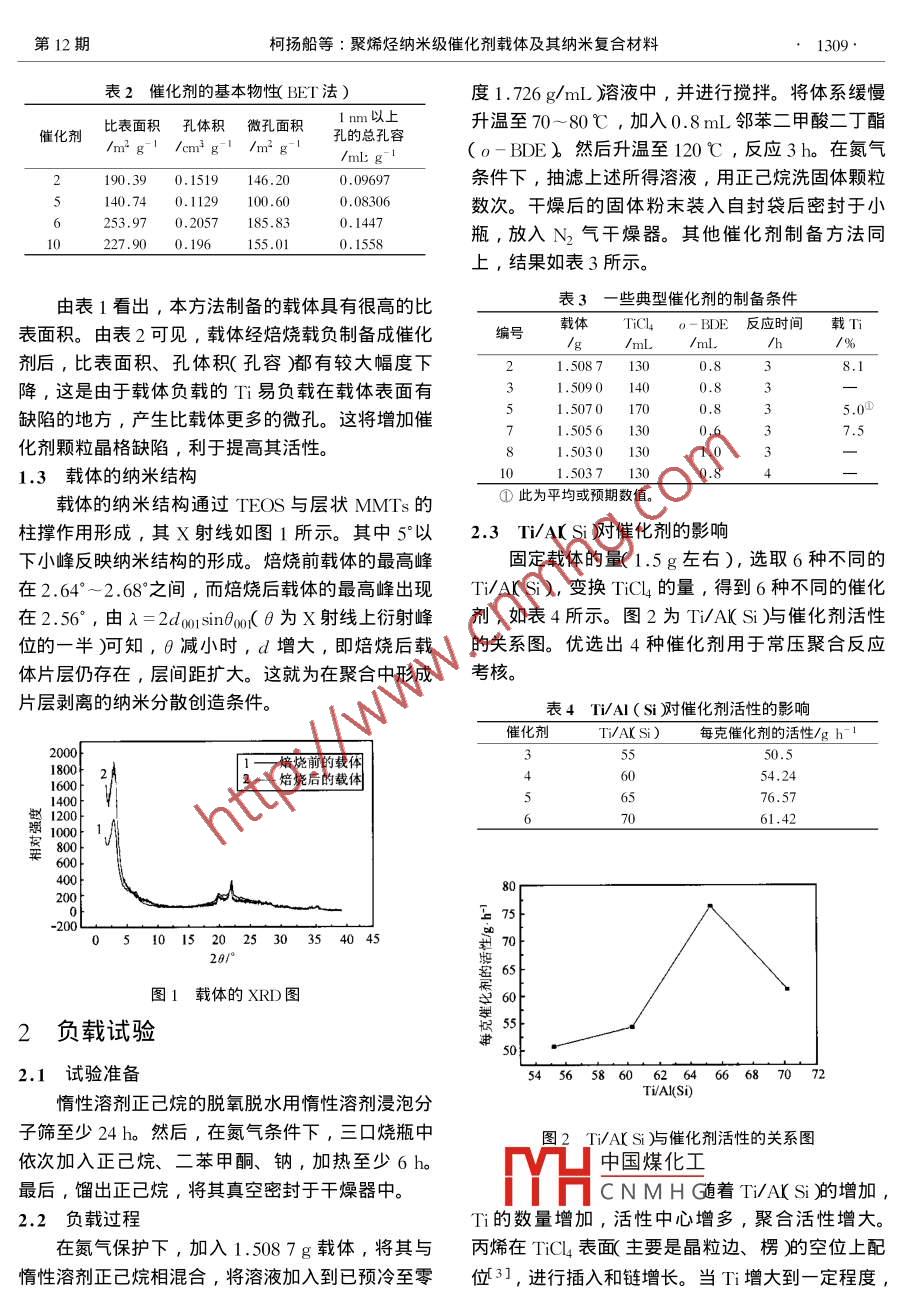 化工進展1308CHEMICAL INDUSTRY AND ENGINEERING PROGRES2003年第22卷第12期研究開發(fā)聚烯烴納米級催化劑載體及其納米復(fù)合材料柯?lián)P船胡建茹王皓徐春明(石油大學(xué),北京102200)摘要采用納米級柱撐插層載體制備烯烴聚合催化劑。載體比表面積為721.23m3/g,孔體積為0.4536cmg,孔徑在4~40m間分布。所得催化劑比表面積為140.47~300m2/g,孔體積為0.1519-0.2057cm3/g及較寬孔徑分布1~40m。對催化劑進行常壓聚合考核及其影響因素研究,每克催化劑的活性為20~100g/h,適于烯烴聚合。Ⅹ射線表征表明其納米顆粒結(jié)構(gòu)的形成關(guān)鍵詞柱撐插層,納米級載體,齊格勒-納塔催化劑,烯烴聚合中圖分類號1Q314.24+2文獻標識碼文章編號1000-66132003)2-1308-04聚烯烴催化劑的發(fā)展集中在兩個方面:一是研基于在MMIs層間嵌入季銨鹽及中性胺為模板劑制性能更優(yōu)越的催化劑活性組分;二是尋找高效的然后導(dǎo)入無杋前驅(qū)體TEOS在層間水解縮合,焙載體和與之相匹配的負載化工藝。載體在催化劑中燒除去有機體而得到柱撐結(jié)構(gòu)的原理。MMIs層非常重要,只有將活性組分與載體良好地結(jié)合并形間距是復(fù)合材料中孔與載負的關(guān)鍵結(jié)構(gòu),層間距的成匹配關(guān)系,才能更大程度地發(fā)揮催化劑的特長。擴大是材料制備的關(guān)鍵。為此,作為模板劑的季銨MgC2及醇一Mg類載體是歷經(jīng)半個世紀應(yīng)用而穩(wěn)鹽和中性胺要插入到 MMTS片層之間并形成一定定的優(yōu)良載體之一。隨著現(xiàn)代聚烯烴工業(yè)的發(fā)展,的分子形態(tài),其種類對層間距有重要影響,需要正MgCl2載體(元素的缺點逐漸暴露,表現(xiàn)出對新確選擇季銨鹽和中性胺的鏈長。的活性中心(如茂金屬、后過渡催化劑等不協(xié)調(diào)的據(jù)文獻報道,浙江大學(xué)3石油科學(xué)研究匹配關(guān)系。院4及美國 Pinnavaia5等合成出了用于聚合的具聚烯烴工業(yè)還向組合工藝方向發(fā)展,將聚合物有一定孔徵1.4~2.2mm)與顆粒度(亞納米)并改性與聚合工藝結(jié)合起來。例如,隨著納米技術(shù)迅有良好熱穩(wěn)定性的蒙脫土多孔異構(gòu)材料。速發(fā)展,原先與聚合物共混得到納米復(fù)合材料的工1.2載體制備過程藝過程經(jīng)組合后,變?yōu)閷⒓{米粉體與烯烴單體聚合將載體制備過程分為以下幾步在不改變?nèi)魏尉酆瞎に嚄l件下直接得到納米復(fù)合材1)MMIs與有機插層劑如十六烷基三甲基料,免除了后添加納米粉體過程,具有集成、環(huán)保、溴化銨反應(yīng)得到插層MMI