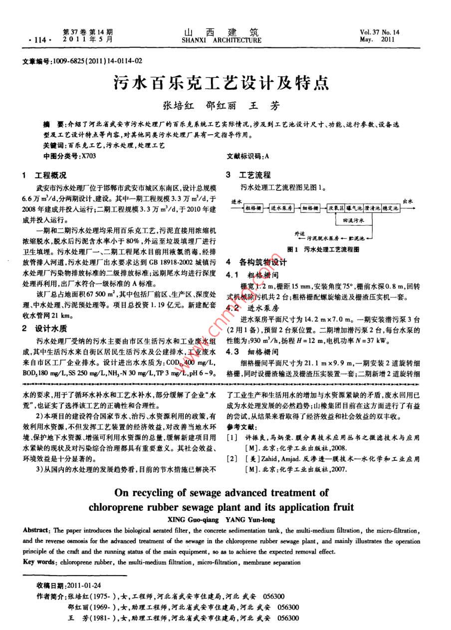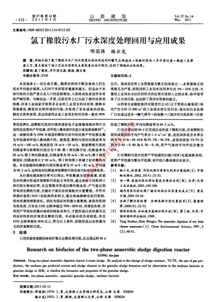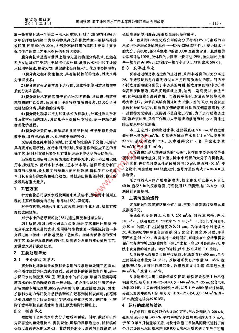 第37卷第14Vol, 37 No. 14112·201HANXI ARCHITECTURE文章編號:1009-6825(2011)14-0112-03氯丁橡膠污水廠污水深度處理回用與應(yīng)用成果邢國強(qiáng)楊云龍摘要:詳細(xì)介紹了氟丁橡膠污水廠污水度處理回用選用的曝氣生物濾池+混凝沉淀池+多介質(zhì)過濾+微濾+反滲透工藝,重點(diǎn)闌述了該工藝運(yùn)行原理及主要裝置的運(yùn)行情況,達(dá)到了預(yù)期的去除效果。關(guān)鍵詞:氯丁橡膠,多介質(zhì)過濾,微濾,膜分高中圖分類號:X703文獻(xiàn)標(biāo)識碼:A水是地球上一切生命之源。隨著經(jīng)濟(jì)的不斷發(fā)展和人們生左右。我國是世界上水資源最為匱乏的國家之一,水資源缺乏的活水平的穩(wěn)步提高,人們對于水的需求量越來越大。但是由于水現(xiàn)象尤為嚴(yán)重而我國的工業(yè)用水回用率僅在5%-10%之間,大體污染的日趨嚴(yán)重以及人口的急劇增加,人類將面臨著前所未有量的工業(yè)用水未經(jīng)任何形式的處理直接排入自然水體,給環(huán)境帶的嚴(yán)峻形勢。為解決這一矛盾,目前世界上已興起了循環(huán)經(jīng)濟(jì)的來了巨大的污染,也加劇了我國水資源的匱乏。熱潮許多工業(yè)國家開始要求企業(yè)的工業(yè)用水的回用率,緩解水山西省合成橡膠集團(tuán)有限責(zé)任公司(以下簡稱山橡集團(tuán))每資源緊張降低對自然環(huán)境的污染,并取得了卓有成效的進(jìn)展。天產(chǎn)生大約1200m3的工業(yè)廢水和生活污水,現(xiàn)有的污水處理據(jù)有關(guān)資料表明發(fā)達(dá)國家的企業(yè)工業(yè)用水的回用率一般在90%廠已經(jīng)通過進(jìn)水→曝氣調(diào)節(jié)→前混凝→三級活性污泥系統(tǒng)→后混常容易辨認(rèn)故顆粒污泥的掃描和透射電子顯微鏡觀察的照片只形成了顆粒污泥,平均沉降速率為695m/h表明其優(yōu)勢的產(chǎn)甲烷菌而甲烷八疊球菌存在甚少或很難觀察到“。2)反應(yīng)器運(yùn)轉(zhuǎn)66d后完成啟動形成了顆粒污泥厭氧顆粒污這一觀察結(jié)果與1996年報(bào)道的顆粒污泥中的優(yōu)勢產(chǎn)甲烷蔭是票泥形成期間的平均產(chǎn)氣率為1.6m3/m3泥,進(jìn)泥和排泥含水率分毛甲烷菌和甲烷八疊球菌不同。據(jù)報(bào)道,顆粒污泥的沉降速率為別為9901%-9.43%和953%~960%,進(jìn)泥和排泥ⅤSTS分18m/h-100m/h,典型值在18mh-50m/h。根據(jù)顆粒污泥的別為0.65-0.80和056-0.58,所產(chǎn)氣體的平均甲烷含量為沉降速率可將顆粒污泥分為3種:第1種沉降不好,沉降速率為65%。20m/h;第2種沉降滿意沉降速率為20m/h~50m/h;第3種沉3)對顆粒污泥中優(yōu)勢產(chǎn)甲烷菌的掃描(SEM)電鏡觀察表明,降很好,沉降速率大于50mh。第2種和第3種屬于好的顆粒污優(yōu)勢產(chǎn)甲烷菌為鬃毛甲烷菌,而甲烷八疊球菌存在甚少。泥。本實(shí)驗(yàn)測得的顆粒污泥沉降速率為57m/h-82m/h,平均值參考文獻(xiàn)為65m/h,這樣高的沉降速率使顆粒污泥有相當(dāng)好的沉降效果。[l]楊小文,杜英豪.污泥處理與賚源化利用方案選擇[門].中國從掃描電鏡觀察結(jié)果可以得出,甲烷鬃菌為優(yōu)勢菌屬,而索給水排水,2002,18(4):31-33氏絲狀菌對形成厭氧顆粒污泥起主導(dǎo)作用,通過觀察不同取樣口[2]甘一萍我國污泥處理處重技術(shù)現(xiàn)狀分析[M].北京:化學(xué)的污泥生物相證明,反應(yīng)器能否形成沉降性能良好、產(chǎn)氣穩(wěn)定的工業(yè)出版社,2003:165168厭氧消化顆粒污泥,關(guān)鍵在于索氏絲狀菌能否大量繁殖。盡管絲[3]國內(nèi)首家污泥處理廠渝水環(huán)保公司在重慶成立[N].重慶狀菌對基質(zhì)(HAC)有較高的親和力,能有效地降解有機(jī)污染物日報(bào),2005-03-24.但絲狀菌倍增期很長。因此為保證絲狀菌大量繁殖,要保持低的[4]全面了解污泥性質(zhì)合理選擇污泥處置技術(shù)[門]桑德視有機(jī)負(fù)荷只有在COD去除率超過70%~80%時,再增加負(fù)荷,并界,2000(9):323利用產(chǎn)甲烷絲狀菌對基質(zhì)的較高親和力才能形成以絲狀菌為主[5]國家環(huán)保局,水和廢水監(jiān)測分析方法[M].第3版.北京:中的良好性狀的厭氧消化顆粒污泥。本試驗(yàn)有機(jī)負(fù)荷較低,并且國環(huán)境科學(xué)出版社,1989COD去除率都在90%以上,符合以上條件故能形成以絲狀菌為[6] Yang xiushan, Zhou Mengjin. The anaerobic digestion of soy bean主的厭氧顆粒污泥。cheese wastewater[ J ]. China Environmental Science, 1991, 23結(jié)語(2):46511)用實(shí)驗(yàn)室規(guī)模的兩相厭氧反應(yīng)器處理污泥,反應(yīng)器運(yùn)轉(zhuǎn)66dResearch on biofacies of the two-phase anaerobic sludge digestion reactorGONG An-junAbstract Using two-phase anaerobic digestion reactor it treats sludge. By analysis to the change of sludge moisture, VS/TS, the rate of gasduction, the methane gas produced content and sludge element in the granular sludge formation and by observation to the methane bactgranular sludge in SEM, it clarifies the formation and properties of the granular sludgeKey words: two-phase anaerobic, anaerobic granular sludge, methane bacteria收稿日期:2011-01-11作者簡介:那國強(qiáng)(19714-),男,太原理工大學(xué)碩士研究生,山西太原030044楊云龍(1953-),男,教授,太原理工大學(xué),山西太原0300431第1邢國強(qiáng)等氯丁橡膠污水廠污水深度處理回用與應(yīng)用成果113凝→微絮凝過濾→生物炭→出水的流程,達(dá)到了GB8978-199污長反滲透的使用壽命降低反滲透的操作成本。水綜合排放標(biāo)準(zhǔn)