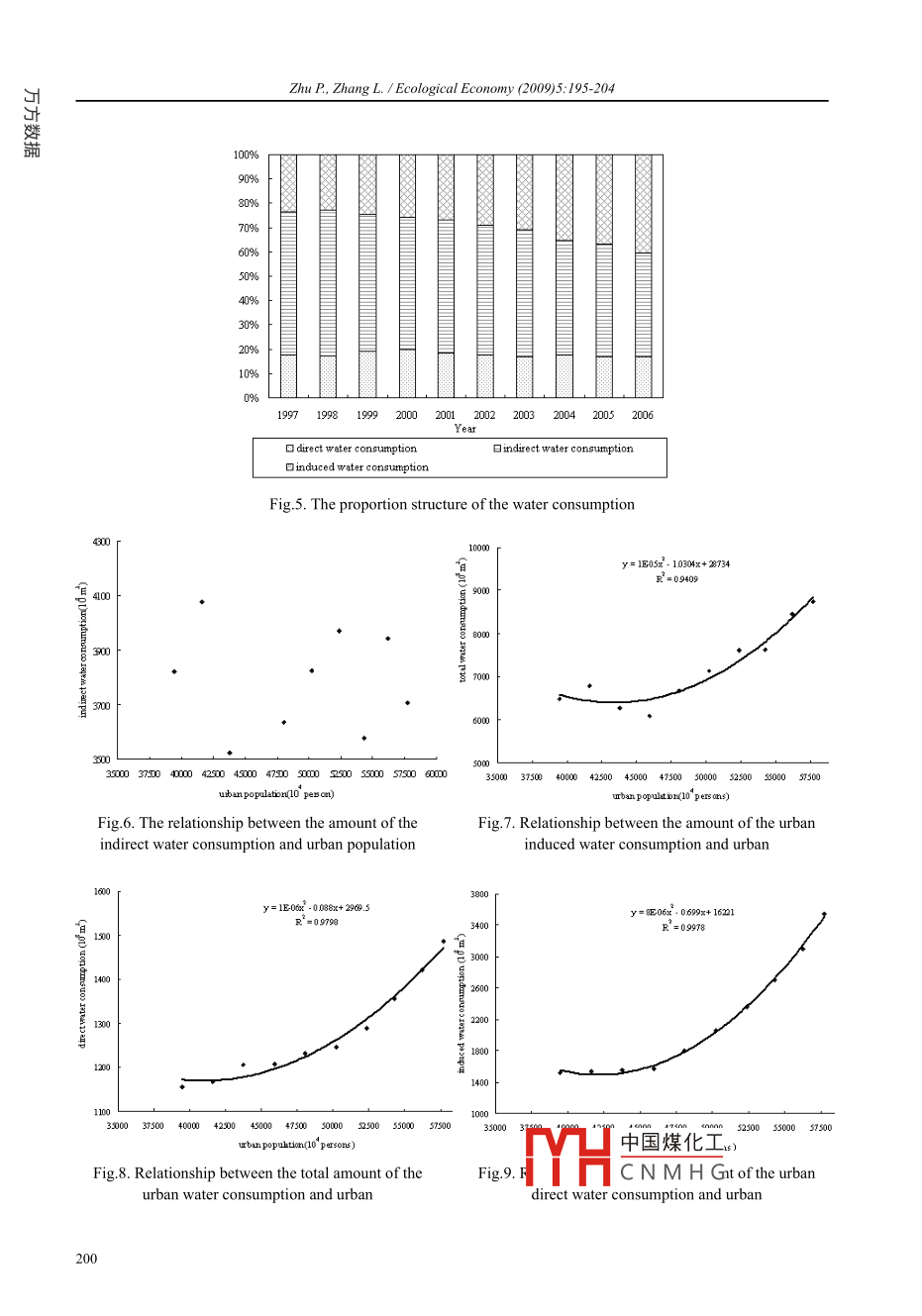 Ecological Economy (2009)5:195-204器) Empirical StudyQuantitative study on the urban fresh water consumption sinceChinese rapid urbanizationZhu Peng 1,2.3, Zhang Lei 1”1. Instiute of Geographic Sciences and Natural Resources Research, Chinese Academy of Sciences, Beijing 100101, P. R. China2. Graduate Universit, Chinese Academy of Sciences, Bejing 10049, P. R. China3. Tianjin Economic Development Institute, Tianjin 300202, P. R. ChinaAbstract: The development of urbanization has a close relationship with fresh water resources, especially in the rapidurbaniation period. By analyzing the course of the urbanization development and the experience of international ur-banizcation development, the paper confirms the starting time of the rapid urbanization. Based on the ecological theo-ry, urban fresh water consumption is composed of three types: the direct, the indirect cand the induced water consump-tion. And the paper constructs calculation model of the indireet and the induced water consumption. Using the relatedstatistics data, the paper makes an empirical research on the changes of the camount and structure of water consump-tion. Then it discusses the correlation between the water consumption and the amount of urban population, and theresult shows that the amount of the water consumption and the urban population have a remarkable correlation withthe exception of the amount of the indirect water consumption, and the curves take on quadratic function form. Last,from the urban fiunction point of view, the paper anatomizes the cause of the urban water consumption changes.Keywords: Rapid urbanization; Fresh water consumption; Direct water consumption; Indirect water consumption;Induced water consumption1. Introductionwith the changes mentioned above. As we allknow, the development of urbanization needs theWith the development of technology, human steady supply of all kinds of national resources,beings have a more reliance on the resources and especially the water resources 45. However, theenvironment than ever before . Fresh water re- contradiction between water supply and needs issources are one of the fundamental natural resourc-increasingly obvious, especially in the northernes and the important economic resources, and they and coastal urban region as well as the severe pol-are the important part of national powerl21. At the luted region. And water resources have becomesame time, fresh water resources are the organicone of the primary factors that restrict the develop-part and the dominating element of the ecological ment of our national urbanization and our socialenvironment. What's more, fresh water resourcesand economic development 0. So it's necessaryare absolutely necessary in daily life and they are to make a quantitative study on the makeup andrelated to the improvement of people's health andstructure of urban water consumption. And thislife. With the process of urbanization, the urban will lay a foundation on disclosing urban waterpopulation is continuously increasing, its area isconsumption in the process of urbanization. Theincreasingly enlarged and its industry structure is work will improve water resources good use andupgraded. At the same time, the total amount of guarantee the healthy development of our nationalwater consumption, the consumption structure andurbanization.the water use efficiency in urban area correspond2. The process of our national urbanizationReceived July 21, 2008; Acepted Nov. 24, 2008中國(guó)煤化工tion in China has* Corresponding author. E-mail addres: zhangl@igsnrr.ac.cnbeen:YHC N M H Gnce the establish-Author: Zhu Peng (1981- ), male, PhD candidate, specialized inurbanization and water resources.ment of new China (Fig.1). After experiencing theZhu P, Zhang L. / Ecological Economy (2009)5:195-204temporary healthy development period, the devel-in 1996. Since 1996, the total amount of wateropment has been basically suspended from 1960consumption in China hasn't changed a lot, butto 1980, and the urban population increased verythe amount of urban water consumption has in-slowly. Most scholars take a view that our countrycreased very quickly. From urban domestic waterbelongs to under-urbanization compared with oth-consumption, we can see clearly that the amounter developing countries 7, and they explained theof water consumption has continuously increasedphenomenon based on the household registration(Fig.2). From 1997 to 2006, the amount of urbansystem and the urban-rural dual system [8,9]. Butdomestic water consumption increased by 15,000the urbanization has obviously stepped up sincemillion cubic meters that was from 24,700 mil-1996, and the urbanization ratio reached 30.48%lion cubic meters to 39,800 million cubic meters.in 1996. Since 1996, the urbanization ratio has in-And the trending curve basically takes on linearitycreased by 1 .3% every year, and it reached 43.9%increase. In conclusion, the urban water consump-in 2006. At the same time, the urban populationtion in China has changed remarkably. Along withreached more than 570 million.the rapid urbanization, the population concentratesBased on the international experience andin cities and towns, which leads to the urban waterour domestic development demonstration on thesupply pressure and urban water shortage there””.process of urbanization (10), we can make sure thatAnd so it's necessary to make a quantitative studythe rapid urbanization phase in our country beganon the urban fresh water consumption.Rspid deweloping stage3. Analysis of the composition of7000050urban fresh water consumption45in the process of urbanization60000085000035Based on the previous view-4000030point, besides ecological water25.3000020use, human water use mainly in-2000015cludes agricultural, industrial and10旨domestic water use, and they al-100000t.1.MM........most take a half proportion of allthe available water resources1952 19571960 1962 1965 1970 1975 1980 1985 1990 1996 2001 2006yearAnd urban water consumpt