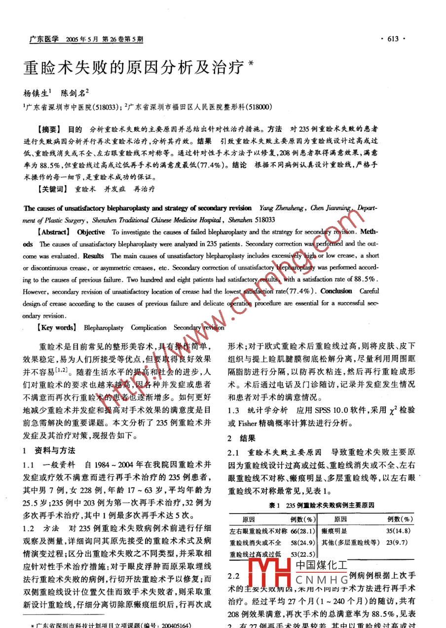 廣東醫(yī)學(xué)200年5月第26卷第5期613重瞼術(shù)失敗的原因分析及治療米楊鎮(zhèn)生1陳劍名2廣東省深圳市中醫(yī)院(518033);2廣東省深圳市福田區(qū)人民醫(yī)院整形科(518000【摘要】目的分析重瞼術(shù)失敗的主要原因并總結(jié)出針對性治療措施。方法對235例重瞼術(shù)失敗的患者進(jìn)行失敗病因分析并行再次重瞼術(shù)治療,分析其療效。結(jié)果引致重瞼術(shù)失敗主要原因?yàn)橹夭€線設(shè)計(jì)過高或過低、重瞼線消失或不全、左右眼重瞼線不對稱等。通過針對性手術(shù)方法予以修復(fù),208例患者取得滿意效果,滿意率為88.5%,但重瞼線過高或過低再手術(shù)的滿意度最低(77.4%)。結(jié)論根據(jù)不同病例認(rèn)真設(shè)計(jì)重瞼線,嚴(yán)格手術(shù)操作的每一細(xì)節(jié),是重瞼術(shù)成功的保證。關(guān)鍵詞】重瞼術(shù)并發(fā)癥再治療The causes of unsatisfactory blepharoplasty and strategy of secondary revisionment of plastic Surgery, Shenzhen Traditional Chinese Medicine Hospital, Shenzhen 51[Abstract] Objective To investigate the causes of failed blepharoplasty and the strategy for secondary revision. Methods The causes of unsatisfactory blepharoplasty were analyzed in 235 patients. Secondary correction was performed and the outcome was evaluated. Results The main causes of unsatisfactory blepharoplasty includes excessively high or low crease, a shortor discontinuous crease, or asymmetric creases, etc. Secondary correction of unsatisfactory blepharoplasty was performed accordfailure. Two hundred and eight patients had satisfactory results, with a satisfaction rate of 88.5%However, secondary revision of unsatisfactory location of crease had the lowest satisfaction rate(77.4%).Conclusion Carefuldesign of crease according to the causes of previous failure and delicate operation procedure are essential for a successful sec-ondary revision重瞼術(shù)是目前常見的整形美容術(shù),具有操作簡單,形術(shù);對于歐式重瞼術(shù)后重瞼線過高,則將皮膚、皮下效果穩(wěn)定,易為人們所接受等優(yōu)點(diǎn),但要取得良好效果組織與提上瞼肌腱膜徹底松解分離,盡量利用周圍眶并不容易2)。隨著生活水平的提高和社會的進(jìn)步,人隔脂肪進(jìn)行分隔,以防再次粘連,然后再行重瞼成形們對重瞼術(shù)的要求也越來越高,因各種并發(fā)癥或患者術(shù)。術(shù)后通過電話及門診隨訪,記錄并發(fā)癥發(fā)生情況不滿意而再次行重瞼術(shù)的患者也逐漸增多。如何更好和患者對手術(shù)的滿意情況。地減少重瞼術(shù)并發(fā)癥和提高對手術(shù)效果的滿意度是目1.3統(tǒng)計(jì)學(xué)分析應(yīng)用sPs10.0軟件,采用x2檢驗(yàn)前急需解決的重要課題。本文分析了235例重瞼術(shù)并或 Fisher精確概率計(jì)算法進(jìn)行分析。發(fā)癥及其治療對策,現(xiàn)報告如下。2結(jié)果1資料與方法2.1重瞼術(shù)失敗主要原因?qū)е轮夭€術(shù)失敗主要原1.1一般資料自1984-2004年在我院因重瞼術(shù)并因?yàn)橹夭€線設(shè)計(jì)過高或過低、重瞼線消失或不全、左右發(fā)癥或療效不滿意而進(jìn)行再手術(shù)治療的235例患者,眼重瞼線不對稱、癜痕明顯、多層重瞼線等,以左右眼其中男7例,女228例,年齡17~63歲,平均年齡為重瞼線不對稱最常見,見表1。255歲;235例中203例為第一次再手術(shù)治療,32例為表1235例重臉術(shù)失敗病例主要原因多次再手術(shù)治療,其中1例最多次再手術(shù)達(dá)5次原因例數(shù)(%例數(shù)(%12方法對235例重瞼術(shù)失敗病例術(shù)前進(jìn)行仔細(xì)左右眼重險線不對稱621|痕明是35(148)觀察及測量詳細(xì)詢問其原先接受的重險術(shù)術(shù)式及病重險線消失或不全58x.9)其他(多層重險線等)2(97)情演變過程;區(qū)分出重瞼術(shù)失敗之不同類型,并采取相重酸線過高或過低s3(25)應(yīng)針對性手術(shù)治療措施:對于眼皮浮腫而原采取埋線中國煤化工法行重瞼術(shù)失敗的病例,行切開法重瞼術(shù)予以修復(fù);而2.2CNMHG例病例根據(jù)上次手雙側(cè)重險線設(shè)計(jì)位置欠佳而致手術(shù)失敗者,則采取重術(shù)的主安失敗病因,米用小同的于術(shù)方法進(jìn)行再手術(shù)新設(shè)計(jì)重瞼線仔細(xì)分離切除原癜痕組織后,行再次成治療。經(jīng)過平均27個月(1~240個月)的隨訪,共有例效果滿意,再次手術(shù)的總滿意率為885%,見表k廣東省深圳市科技計(jì)劃項(xiàng)目立項(xiàng)課題(編號:200405164)有27例再手術(shù)效果較差,其中以重瞼線過高或過·614gong Medical Journal May. 2005. Vol.低組再次手術(shù)滿意率最低,與左右眼重瞼線不對稱、重重瞼線一般設(shè)計(jì)在6~8mm,過高或過低均影響瞼線消失或不全等其他并發(fā)癥組相比差別有顯著性意效果。重瞼線若設(shè)計(jì)過低,則重瞼線平視時不能顯現(xiàn)義(P<0.05和P<0.01)。失去行重瞼術(shù)的意義,此種情況一般只需重新設(shè)計(jì),再表2不同原因再手術(shù)治療效果次手術(shù)常能達(dá)到較好的效果。而重瞼線過高,閉眼時療效療效不滿意超過9mm的,往往給人怒目圓睜的感覺,或是睜不大原因例數(shù)滿意滿意率(%)眼睛。其主要原因是:重瞼線設(shè)計(jì)過高、在皮膚松弛狀左右眼不對稱態(tài)下畫線、盲目追求歐式眼或去除過多眶隔脂肪及縫重瞼線消失或不全562966…合固定在提上瞼肌腱膜上的位置過高6。我們發(fā)現(xiàn)重險線過高或過低重瞼線過高