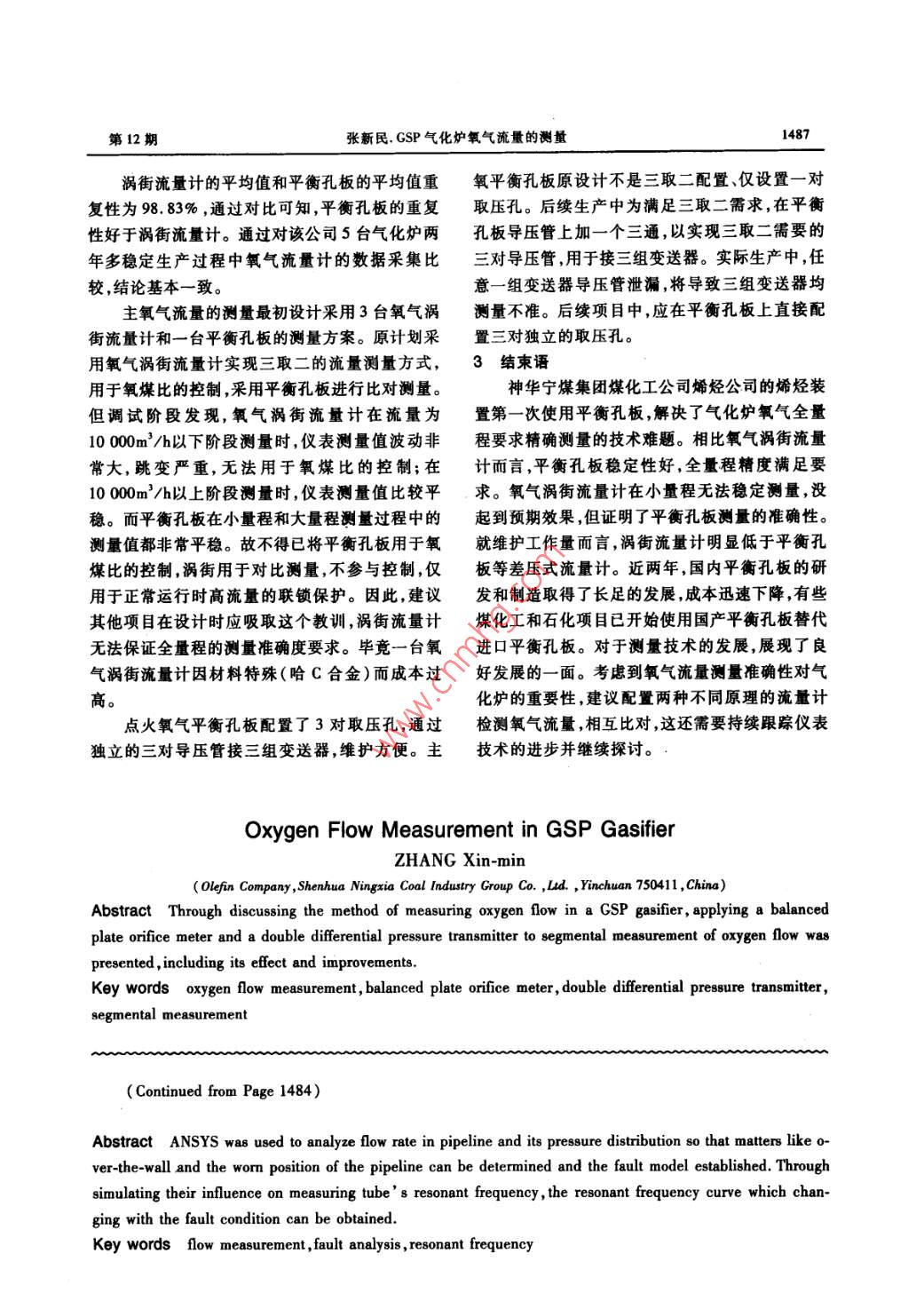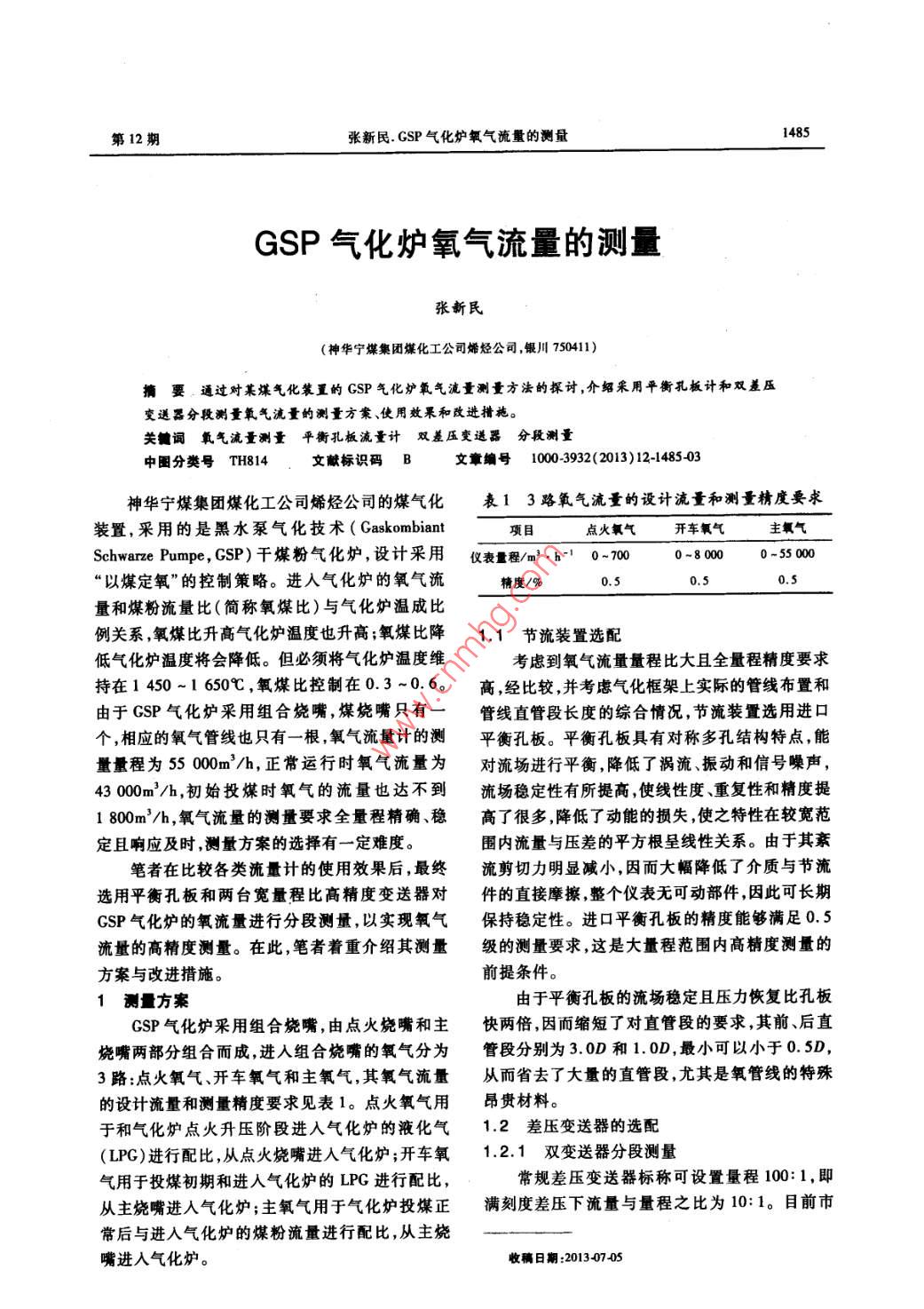 第12期張新民. GSP氣化爐氧氣流量的測量1485GSP氣化爐氧氣流量的測量t張新民(神華寧煤集團煤化工公司烯烴公司,銀川750411)摘要通過對某煤氣化裝置的CSP氣化爐氧氣流量測量方法的探討,介紹采用平衡孔板計和雙差壓變送器分段測量氧氣流量的測量方案、使用效果和改進措施。關(guān)鍵詞氧氣流量測量平衡孔板流量計 雙差壓變送器 分段測量中圈分類號TH814文獻標識碼B文章編號100-3932(2013)12-1485-03神華寧煤集團煤化工公司烯烴公司的煤氣化表13路氧氣流量的 設(shè)計流量和測量精度要求裝置,采用的是黑水泵氣化技術(shù)( Gaskombiant項目點火氧氣開車氧氣主氧氣Schwarze Pumpe, GSP)干煤粉氣化爐,設(shè)計采用儀表量程/m' .h-1 0-7000-8 0000-55 000“以煤定氧”的控制策略。進入氣化爐的氧氣流精度/%0.5.5量和煤粉流量比(簡稱氧煤比)與氣化爐溫成比例關(guān)系,氧煤比升高氣化爐溫度也升高;氧煤比降1.1節(jié) 流裝置選配低氣化爐溫度將會降低。但必須將氣化爐溫度維考慮到氧氣流量量程比大且全量程精度要求持在1 450~1 650C,氧煤比控制在0.3 ~0.6。高,經(jīng)比較,并考慮氣化框架上實際的管線布置和由于GSP氣化爐采用組合燒嘴,煤燒嘴只有一管線直管段長度的綜合 情況,節(jié)流裝置選用進口個,相應(yīng)的氧氣管線也只有一根,氧氣流量計的測平衡孔板。平衡孔板具有對稱多孔結(jié)構(gòu)特點,能量量程為55 000m'/h,正常運行時氧氣流量為對流場進行平衡,降低了渦流、振動和信號噪聲,43000m'/h初始投煤時氧氣的流量也達不到流場穩(wěn)定性有所提高,使線性度、重復(fù)性和精度提1 800m'/h,氧氣流量的測量要求全量程精確、穩(wěn)高了很多,降低了動能的損失,使之特性在較寬范定且響應(yīng)及時,測量方案的選擇有一定難度。圍內(nèi)流量與壓差的平方根呈線性關(guān)系。由于其紊筆者在比較各類流量計的使用效果后,最終流剪切力明顯減小,因而大幅降低了介質(zhì)與節(jié)流選用平衡孔板和兩臺寬量程比高精度變送器對件的直接摩擦,整個儀表無可動部件,因此可長期GSP氣化爐的氧流量進行分段測量,以實現(xiàn)氧氣保持穩(wěn)定性。進口平衡孔板的精度能夠滿足0.5 .流量的高精度測量。在此,筆者著重介紹其測量級的測量要求,這是大量程范圍內(nèi)高精度測量的方案與改進措施。前提條件。1測量方案由于平衡孔板的流場穩(wěn)定且壓力恢復(fù)比孔板GSP氣化爐采用組合燒嘴,由點火燒嘴和主快兩倍,因而縮短了對直管段的要求,其前、后直.燒嘴兩部分組合而成,進人組合燒嘴的氧氣分為管段分別為3. OD和1. 0D,最小可以小于0. 5D,3路:點火氧氣、開車氧氣和主氧氣,其氧氣流量從而省去了大量的直管段,尤其是氧管線的特殊的設(shè)計流量和測量精度要求見表1。點火氧氣用昂貴材料。于和氣化爐點火升壓階段進人氣化爐的液化氣1.2差壓變送器的選配(LPG)進行配比,從點火燒嘴進入氣化爐;開車氧1.2.1雙變送 器分段測量氣用于投煤初期和進人氣化爐的LPG進行配比,常規(guī)差壓變送器標稱可設(shè)置量程100:1,即.從主燒嘴進入氣化爐;主氧氣用于氣化爐投煤正滿刻度差壓下流量與量程之比為10:1。目前市常后與進入氣化爐的煤粉流量進行配比,從主燒嘴進入氣化爐。收稿日期:2013-07051486化工自動化及儀表第40卷場上有400:1的變送器,但在小流量測量時,其精應(yīng)流量(流量為未經(jīng)溫壓補償?shù)墓ぷ鳡顩r時體積度會降低。針對小量程段變送器性能下降所帶來流量)見表2。的精度變差,可將全量程分為大量程段和小量程段,采用兩臺變送器分段測量,滿足全量程變送器的精度要求。將整個量程分為大量程和小量程兩個測量段,用于兩個測量段的變送器都能在有效的、可接受的精度范圍工作。兩臺變送器的測量信號在DCS.上實現(xiàn)無縫切換。如此,就實現(xiàn)了整個測量范圍內(nèi)的高精度測量,即高精度平衡孔板配置了高精度差壓變送器。圖1為平衡孔板配用雙量程.差壓變送器測量的示意圖,點火氧氣和主氧氣均.采用3組變送器,進行三取二測量,以提高測量的可靠性,保障氣化爐的安全運行。開車氧氣僅在投煤時使用約10min, 因而只配備了一組變送器,圖1氧流量測量裝置節(jié)省了投資。其中,變送器的量程選擇及其對表2變送器量程與對應(yīng)流量項目點火氧氣開車氧氣主氧氣量程分程小量程大量程變送器壓差/kPa0-11.00-14.051.00-11.411.00-28.74氧氣流量/m' .h-'0.0-4.84.8-18.00-5959-200!0-374374-2000量程切換點/m’.h-'4.83741.2.2流量的溫壓補償補償計算,換算為標準體積流量,之后用于氧煤比經(jīng)平衡孔板和變送器測得的流量為未經(jīng)溫壓的控制。補償?shù)墓ぷ鳡顩r時的體積流量,需要轉(zhuǎn)換成標準2使用狀況與改進措施狀況下的體積流量,用于氣化爐氧煤比的控制。平衡孔板在神華寧煤集團煤化工烯烴公司的溫度和壓力補償公式為:煤氣化裝置中的應(yīng)用非常成功,其量程比大、精度V。=Vx[(p+0.1) x273.15] +[(T +273.15) x0. 1013]滿足要求而且穩(wěn)定性好。配用的差壓變送器采用分程測量,保證了整個測量范圍內(nèi)的測量精度要式中V。一 經(jīng)過溫壓 補償?shù)臉藴薁顩r下的標求。在氣化爐調(diào)試階段和實際投料運行階段,氧準體積流量;氣流量的測量很準確。三取二的變送器重復(fù)性V、p、T一工作狀況時 的流量、壓力和溫度。好,基本一致。在該項目