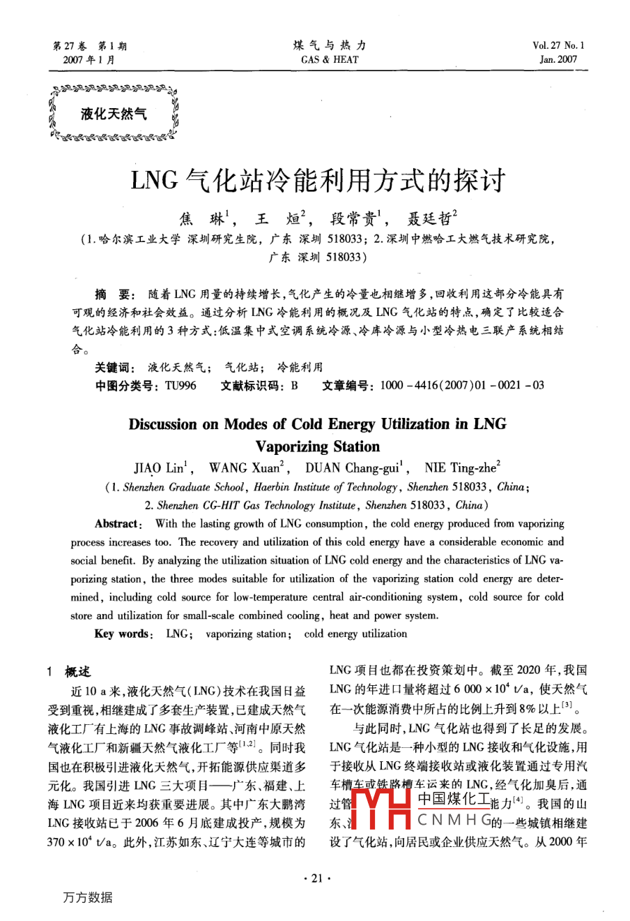 第27卷第1期煤氣與熱力Vol. 27 No. 12007年1月gas heatJan.2007液化天然氣LNG氣化站冷能利用方式的探討焦琳,王炬2,段常貴',聶廷哲(1.哈爾濱工業(yè)大學(xué)深圳研究生院,廣東深圳518033;2.深圳中燃哈工大燃?xì)饧夹g(shù)研究院廣東深圳518033摘要:隨著LNG用量的持續(xù)增長,氣化產(chǎn)生的冷量也相繼增多,回收利用這部分冷能具有可觀的經(jīng)濟和社會效益。通過分析LNG冷能利用的概況及LNG氣化站的特點,確定了比較適合氣化站冷能利用的3種方式:低溫集中式空調(diào)系統(tǒng)冷源、冷庫冷源與小型冷熱電三聯(lián)產(chǎn)系統(tǒng)相結(jié)關(guān)鍵詞:液化天然氣;氣化站;冷能利用中圖分類號:TU996文獻(xiàn)標(biāo)識碼:B文章編號:1000-4416(2007)01-0021-03Discussion on Modes of Cold Energy Utilization in LNGVaporizing StationJIAO Lin, WANG Xuan, DUAN Chang-gui, NIE Ting-zhe(1. Shenzhen Graduate School, Haerbin Institute of Technology, Shenzhen 518033, China;2. Shenzhen CG-HIT Gas Technology Institute, Shenzhen 518033, China)Abstract: With the lasting growth of LNG consumption, the cold energy produced from vaporizingprocess increases too. The recovery and utilization of this cold energy have a considerable economic andsocial benefit. By analyzing the utilization situation of LNG cold energy and the characteristics of ING va-orizing station, the three modes suitable for utilization of the vaporizing station cold energy are deter-mined, including cold source for low-temperature central air-conditioning system, cold source for coldstore and utilization for small-scale combined cooling, heat and power systerKey words: LNvaporizing station: cold energy utilization概述LNG項目也都在投資策劃中。截至2020年,我國近10a來,液化天然氣(ING)技術(shù)在我國日益LNG的年進(jìn)口量將超過6000×104ta,使天然氣受到重視,相繼建成了多套生產(chǎn)裝置,已建成天然氣在一次能源消費中所占的比例上升到8%以上3液化工廠有上海的LNG事故調(diào)峰站、河南中原天然與此同時,LNG氣化站也得到了長足的發(fā)展。氣液化工廠和新疆天然氣液化工廠等12。同時我NG氣化站是一種小型的LNG接收和氣化設(shè)施,用國也在積極引進(jìn)液化天然氣,開拓能源供應(yīng)渠道多于接收從LNG終端接收站或液化裝置通過專用汽元化。我國引進(jìn)LNG三大項目—廣東、福建、上車槽槽車運來的ING,經(jīng)氣化加臭后通海LNG項目近來均獲重要進(jìn)展。其中廣東大鵬灣過管中國煤化工能力。我國的山ING接收站已于2006年6月底建成投產(chǎn),規(guī)模為東CNMHG的一些城鎮(zhèn)相繼建370×104t/a。此外,江蘇如東、遼寧大連等城市的設(shè)了氣化站,向居民或企業(yè)供應(yīng)天然氣。從2000年第27卷第期煤氣與熱力www.watergasheat.com開始淄博、青島、廣東龍川、浙江余姚、江蘇姜堰等3ING氣化站的冷能利用城市的氣化站相繼建成投產(chǎn),至今已建成逾80座3.1用作低溫集中式空調(diào)系統(tǒng)冷源LNG氣化站。低溫集中式空調(diào)系統(tǒng)是指系統(tǒng)運行時送風(fēng)溫度通常生產(chǎn)1tLNG的動力及公用設(shè)施耗電量約≤11℃的空調(diào)系統(tǒng)。低溫送風(fēng)系統(tǒng)與常規(guī)空調(diào)系850kW·h,而在LNG接收站,一般又需將LNG通統(tǒng)相比,在技術(shù)上有了很大進(jìn)步,其造價降低,運行過氣化器氣化后使用,氣化時放出很大的冷量,其值費用降低,電力需求小,空氣品質(zhì)優(yōu)良,人體舒適感約830kJ/kg5。若LNG擁有的冷能以100%的效提高。率轉(zhuǎn)化為電力,那么1tLNC的冷能相當(dāng)于230kW利用ING的潛熱或顯熱直接與空氣進(jìn)行換熱h電?;厥者@部分可用冷能,不僅有效利用了能時,換熱溫差達(dá)到160℃左右,容易造成空氣中水蒸源,而且減少了機械制冷大量的電能消耗,具有可觀氣cO2等氣體的凍結(jié),阻塞換熱器流道,無法正常的經(jīng)濟效益和社會效益。工作,從安全角度以及空調(diào)環(huán)境所要求的溫度和濕LNG氣化過程中,其釋放的冷能可采用直接或度來看都是不可行的。因此必須考慮通過中間冷介間接的方法加以利用6。直接利用方法有冷能發(fā)質(zhì)來降低換熱溫差,即將LNG的冷量先轉(zhuǎn)移至低凝電、空氣液化分離冷凍倉庫、制造液化二氧化碳海固點的中間冷介質(zhì)上,再通過冷介質(zhì)的循環(huán)把冷量水淡化、空調(diào)和低溫養(yǎng)殖栽培等;間接利用方法有用傳遞給需要冷卻的空氣,盡量減小傳熱溫差。由于空分得到的液氮、液氧來進(jìn)行低溫破碎、污水處理、ING氣化站冷量產(chǎn)生的不均勻性在利用氣化冷量低溫醫(yī)療等。其中,LNG冷能用于發(fā)電是目前LNG冷能利用的主要方式,且技術(shù)較為成熟。在我國深作為集中式空調(diào)的冷源時,必須用到蓄冷技術(shù),把冷冰雪大世界”擬利用廣東LNG大型接收站量儲存起來。利用LNG冷能的低溫中央空調(diào)系統(tǒng)冷能。福建LNG莆田接收站計劃利用LNG氣化冷見圖1能,并進(jìn)行了相關(guān)項目的招標(biāo)工作。目前,有關(guān)小型氣態(tài)天然氣冷凍水氣化站冷能利用的報道幾乎是空白。2LNG氣化站的特點①建設(shè)投資規(guī)模小。一個可供6×10戶居槽民用氣的氣化站需投資500×10元左右,可大大減循環(huán)泵少發(fā)展城鎮(zhèn)燃?xì)鈱Y金的需求??諝馓幚碓O(shè)備②建設(shè)期短。一般0.5a左右就可建成投圖1利用LNG冷能的低溫集中式空調(diào)系統(tǒng)③可實現(xiàn)多氣源供氣,從而提高供氣的可