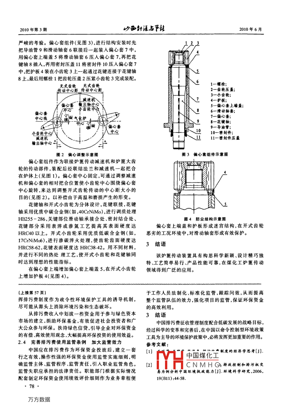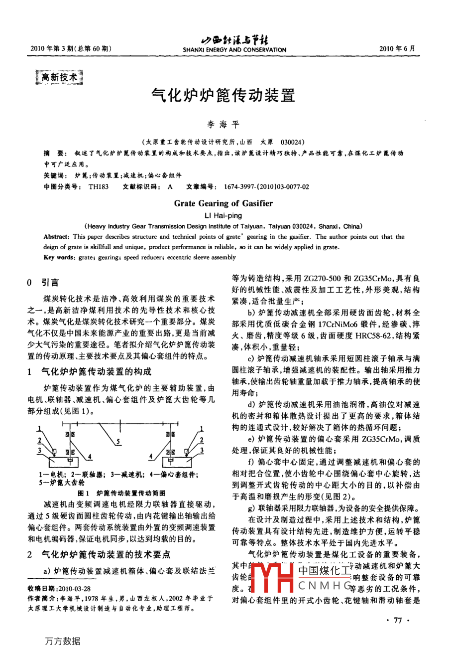 山西能源與節(jié)能2010年第3期(總第60期)SHANXI ENERGY AND CONSERVATION2010年6月.高新技術(shù)氣化爐爐篦傳動裝置李海平(太原重工齒輪傳動設(shè)計研究所,山西太原030024)摘要:敘述了氣化爐爐篦傳動裝置的構(gòu)成和技術(shù)要點,指出,該爐蓖設(shè)計精巧獨特、產(chǎn)品性能可靠,在煤化工爐蓖傳動中可廣泛應(yīng)用。關(guān)鍵詞:爐篦;傳動裝置;減速機;偏心套組件中圖分類號: TH183 文獻標識碼: A文章編號: 1674-3997- (2010)03-0077-02Grate Gearing of GasifierLI Hai-ping(Heavy Industry Gear Transmission Design Institute of Taiyuan, Taiyuan 030024, Shanxi, China)Abstract: This paper describes structure and technical points of grate' gearing in the gasifier. The author points out that thedeign of grate is skillfull and unique, product performance is reliable, so it can be widely applied in grate.Key words: grate; gearing; seed reducer; eccentric sleeve assembly等為鑄造結(jié)構(gòu),采用ZG270-500和ZG35CrMo,具有良0引言好的機械性能、減震性及加工工藝性,外形美觀,結(jié)構(gòu)煤炭轉(zhuǎn)化技術(shù)是潔凈、高效利用煤炭的重要技術(shù)緊湊,適合批量生產(chǎn);之一,是高新潔凈煤利用技術(shù)的先導(dǎo)性技術(shù)和核心技b)爐篦傳動減速機全部采用硬齒面齒輪,材料全術(shù)。煤炭氣化是煤炭轉(zhuǎn)化技術(shù)研究一個重要部分。煤炭部采用優(yōu)質(zhì)低碳合金鋼17CrNiMo6鍛件,經(jīng)滲碳、淬氣化不僅是中國未來能源產(chǎn)業(yè)的重要出路,更是當前減火、磨齒,精度等級6級,齒面硬度HRC58-62 ,結(jié)構(gòu)緊少大氣污染的重要途徑。筆者擬介紹氣化爐爐篦傳動裝湊,體積小,重量輕;置的傳動原理、主要技術(shù)要點及其偏心套組件的特點。c)爐篦傳動減速機軸承采用短圓柱滾子軸承與滿1氣化爐爐篦傳動裝置的構(gòu)成圓柱滾子軸承,增強減速機的裝配性。輸出軸采用推力爐篦傳動裝置作為煤氣化爐的主要輔助裝置,由軸承,使輸出齒輪軸重量加載于推力軸承,提高軸承的使電機、聯(lián)軸器、減速機、偏心套組件及爐篦大齒輪等幾用壽命;d)爐篦傳動減速機采用油池潤滑,高油位對減速部分組成(見圖1)。機的密封和箱體散熱設(shè)計提出了更高的要求,箱體結(jié)構(gòu)的連通式設(shè)計,較好解決了箱體的熱循環(huán)問題;\5e)爐篦傳動裝置的偏心套采用ZG35CrMo,調(diào)質(zhì)r\處理,保證其良好的機械性能;54f)偏心套中心固定,通過調(diào)整減速機和偏心套的1-電機; 2一聯(lián)軸器; 3- 減速機; 4 -偏心套組件;相對把合位置,使小齒輪中心圍繞偏心套中心旋轉(zhuǎn),達5-爐篦大齒輪到調(diào)整開式齒輪傳動的中心距大小的目的,以補償由圖1爐篦傳動裝置傳動簡圉于高溫和磨損產(chǎn)生的形變(見圖2)。減速機由變頻調(diào)速電機經(jīng)限力聯(lián)軸器直接驅(qū)動,g)聯(lián)軸器采用限力聯(lián)軸器,為設(shè)備的安全提供保障。通過5級硬齒面圓柱齒輪傳動,由內(nèi)花鍵輸出軸輸出給在設(shè)計及制造過程中,采用上述技術(shù)和結(jié)構(gòu),爐篦偏心套組件。兩套傳動系統(tǒng)裝置由外置的變頻調(diào)速裝置傳動裝置具有設(shè)計結(jié)構(gòu)先進,制造維護方便,運轉(zhuǎn)平穩(wěn)和電機編碼器,保證電機同步,以達到均載的目的??煽康忍攸c。整體技術(shù)水平處于國內(nèi)先進水平。2氣化爐爐篦傳動裝置的技術(shù)要點氣化爐爐篦傳動裝置是煤化工設(shè)備的重要裝備,a)爐篦傳動裝置減速機箱體、偏心套及聯(lián)結(jié)法蘭其中中國煤化工動減速機和爐篦大收稿日期:2010-03-28齒輪MH:響整套設(shè)備的可靠度。石CN M H G等惡劣的工況條件,作者簡介:李海平,1978年生,男,山西左權(quán)人,2002年畢業(yè)于對偏心套組件里的開式小齒輪、花鍵軸和滑動軸套是太原理工大學(xué)機械設(shè)計制造與自動化專業(yè),助理工程師。,77●2010年第3期山函能源與節(jié)站2010年6月嚴峻的考驗。偏心套組件(見圖3),進行結(jié)構(gòu)安裝時先123把導(dǎo)油管9和滑動軸套6聯(lián)接后一起裝人偏心套7中,用偏心套上端蓋5將滑動軸套6壓人偏心套7,再把花鍵軸8插人,再用密封壓蓋11將密封件10壓人偏心套7中,把護板4裝在小齒輪3上一起通過花鍵連接于花鍵軸8上,最后用螺栓1把齒輪壓蓋2壓緊小齒輪3完成裝配。無式無式齒輪1一螺栓;中心距傳動中心距2一齒輪壓董;3-小齒輪;減速機It4-護板;金出林中心!偏心基輸出軸中心s-偏心套上端蓋;中心個齒輪中心6-滑動軸套;偏心套7一偏心套;中心線名國氣化護五9 8一花鍵軸;109-導(dǎo)油管;小齒輪中心l中心10-密封件;臧速機1111-密封件壓蓋輸出軸中心+圈2偏心調(diào)整示意 圈團3偏心套組件示意圄偏心套組件作為聯(lián)接爐篦傳動減速機和爐篦大齒輪的傳動部件,裝配后經(jīng)聯(lián)結(jié)法蘭和減速機一起把合在爐體上(見圖1)。偏心套中心固定,可通過調(diào)整減速機和偏心套的相對把合位置使小齒輪中心圍繞偏心套中心旋轉(zhuǎn),來達到調(diào)整開式齒輪傳動的中心距大小的目的(見圖2)。以補償由于高溫和磨損產(chǎn)生的形變?;ㄦI軸和開式小齒輪為分體設(shè)計,花鍵聯(lián)接,花鍵軸采用優(yōu)質(zhì)中碳合金鋼(如,40CrNiMo),進行調(diào)質(zhì)處理HB255- 286 ,關(guān)鍵部位滑動軸承接合處.密封結(jié)合處、圉4防塵 結(jié)構(gòu)示意圖花鍵部分采用表淬或滲氮工藝提高其表面硬度達偏心套.上端