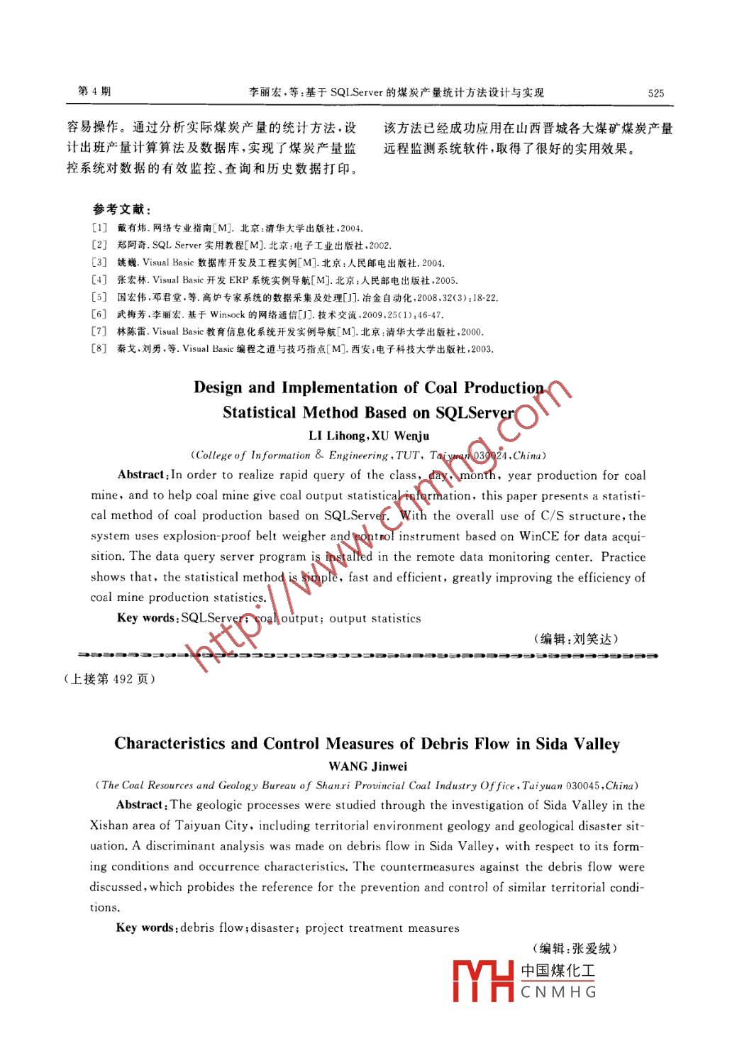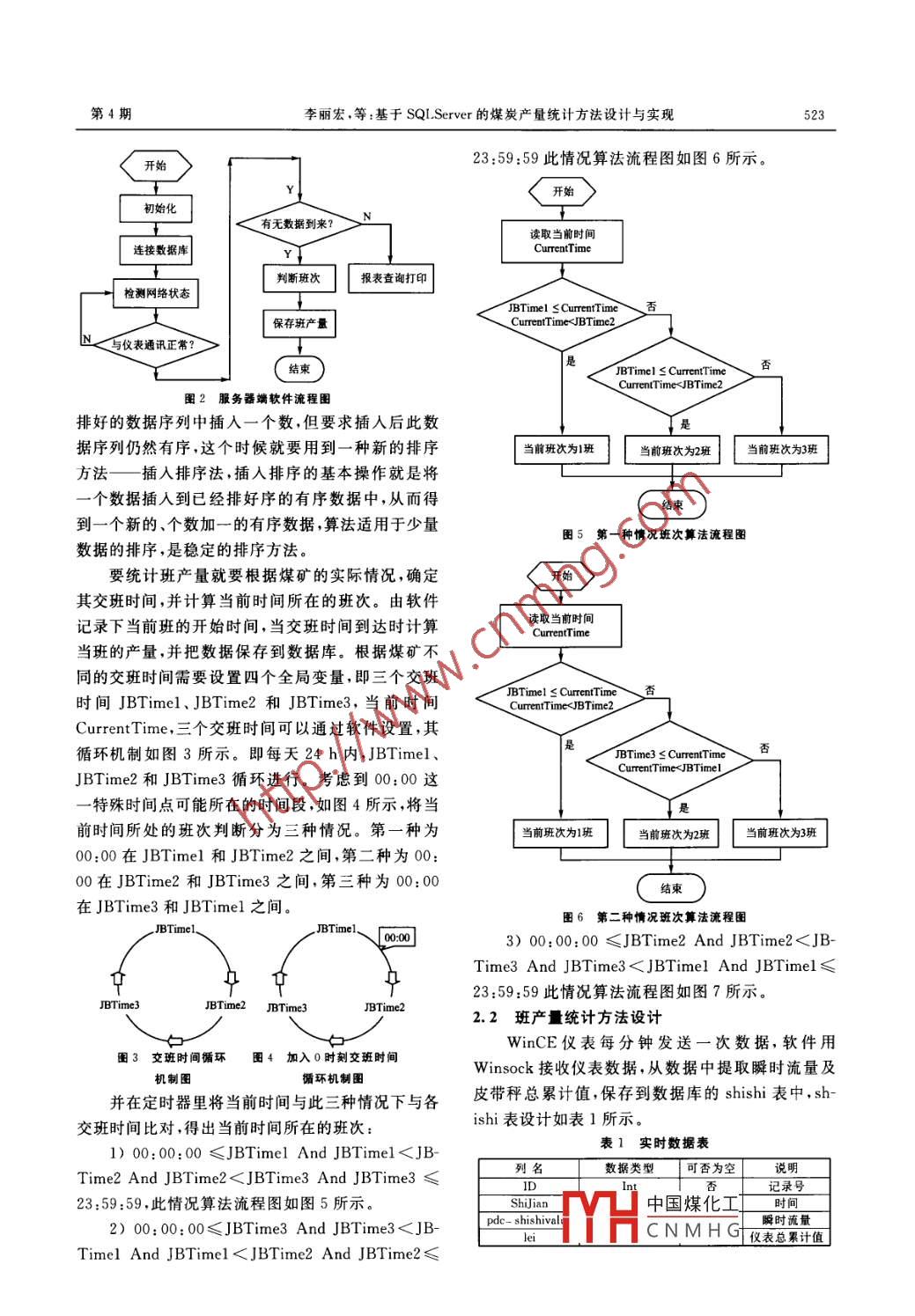 第44卷第4期太原理工大學(xué)學(xué)報Vol. 44 No. 42013年7月JOURNAL (F TAIYUAN UNIVERSITY OF TECHNOL0GYJuly 2013文章編號:1007-9432(2013)04 0522 04基于SQLServer的煤炭產(chǎn)量統(tǒng)計方法設(shè)計與實現(xiàn)李麗宏,徐文舉(太原理工大學(xué)信息工程學(xué)院,太原030024)滴要:為了方便煤礦實現(xiàn)班、日、月、年產(chǎn)量的快捷查詢,更好的幫助煤礦統(tǒng)計產(chǎn)量信息,提出了一種基于sQLServer的煤炭產(chǎn)量統(tǒng)計方法。該系統(tǒng)整體采用C/S架構(gòu),在數(shù)據(jù)采集上使用防爆皮帶秤和基于WinCE的控制儀表,在遠(yuǎn)程數(shù)據(jù)監(jiān)控中心安裝有采用了該數(shù)據(jù)統(tǒng)計方法的服務(wù)器程序。實踐表明,該查詢方法簡單、快捷、高效,大大提高了煤礦的產(chǎn)量統(tǒng)計效率。關(guān)鍵詞:數(shù)據(jù)庫服務(wù)程序;煤炭產(chǎn)量;產(chǎn)量統(tǒng)計中圖分類號:TP302文獻(xiàn)標(biāo)識碼:A隨著國民經(jīng)濟(jì)的迅速發(fā)展,煤炭行業(yè)進(jìn)入了前所與稱重儀表Winsock通信的方式獲取,采用新的產(chǎn)未有的局面。煤炭行業(yè)的發(fā)展壯大帶來了管理模式量統(tǒng)計算法,降低了軟件開發(fā)的難度;主備機(jī)之間采的改革,其采煤工作機(jī)制為每天三班循環(huán)制。一些煤前礦將每班的產(chǎn)量作為該班績效考核標(biāo)準(zhǔn)的一部分,這「白使得煤礦超能力生產(chǎn)問題愈演愈烈。引起超能力生2 M前臺服務(wù)程序數(shù)據(jù)庫WinCE產(chǎn)的原因主要有:各別煤礦追求利潤最大化、煤炭市:機(jī)日產(chǎn)繭數(shù)據(jù)場混亂和惡性競爭、法制不健全、各種稅費對煤礦壓用戶力過大以及治理煤礦超能力生產(chǎn)力度不夠等。煤礦超能力生產(chǎn)現(xiàn)象的危害主要有:擾亂煤炭行業(yè)市場、前臺服務(wù)程序設(shè)備超負(fù)荷運轉(zhuǎn)、降低了稅收征管質(zhì)量和工作效率、熱備機(jī)影響了煤礦的安全生產(chǎn)狀況、擾亂社會經(jīng)濟(jì)發(fā)展。為圍1系統(tǒng)整體架構(gòu)圖了更好的將煤礦的產(chǎn)量加以統(tǒng)計并且上報,設(shè)計了一用Winsock通信,不僅實現(xiàn)了對兩個工控機(jī)產(chǎn)量數(shù)種算法優(yōu)良、簡單高效、實用價值高的基于SQIServ-據(jù)和設(shè)備狀態(tài)信息的統(tǒng)一處理,而且降低了系統(tǒng)的er的煤炭產(chǎn)量數(shù)據(jù)統(tǒng)計方法。復(fù)雜程度,使得煤礦工作人員更容易操作。在Mi-crosoft Visual Basic 6.0開發(fā)環(huán)境中,利用Winsock1系統(tǒng)設(shè)計控件來實現(xiàn)客戶端和服務(wù)器的連接。通過網(wǎng)絡(luò)將1.1 系統(tǒng)整體架構(gòu)WinCE儀表的通訊數(shù)據(jù)進(jìn)行接收,然后根據(jù)其通信系統(tǒng)整體架構(gòu)如圖1所示,WinCE儀表計算出協(xié)議對數(shù)據(jù)進(jìn)行分解和重新組合,以實現(xiàn)系統(tǒng)的功煤炭產(chǎn)量后,將產(chǎn)量數(shù)據(jù)通過煤炭專網(wǎng)上傳到本地的能要求。最后將收到的數(shù)據(jù)按照三班循環(huán)機(jī)制以一電腦。本地所實現(xiàn)的功能只是針對本煤礦的產(chǎn)量數(shù)定的格式保存到SQLServer2005數(shù)據(jù)庫中,進(jìn)而完據(jù),不涉及其他煤礦的產(chǎn)量數(shù)據(jù)。本地的數(shù)據(jù)經(jīng)過計成班、日、月.年產(chǎn)量的查詢。服務(wù)軟件具有用戶管算,以班產(chǎn)量的形式對產(chǎn)量數(shù)據(jù)進(jìn)行本地保存。本地理設(shè)置、歷史數(shù)據(jù)查詢、報表打印等功能。軟件設(shè)計電腦配有一臺熱備電腦,用于數(shù)據(jù)的備份和冗余。流程如圖2所示。1.2服務(wù)軟件整體設(shè)計系統(tǒng)服務(wù)軟件以Microsoft Visual Basic 6. 0為2產(chǎn)量統(tǒng)計算法設(shè)計開發(fā)環(huán)境,以MicrosoftSQLServer2005做后臺數(shù)2.1基于插入排序的班次統(tǒng)計算法據(jù)庫支撐。軟件中對稱重數(shù)據(jù)及設(shè)備狀態(tài)信息通過有一個中國煤化工求在這個已經(jīng).YHCNMHG收稿日期:2013-03-13作者簡介:李麗宏(1963-).男.山西晉城人,副教授,主要從事控制理論與控制工程,檢測技術(shù)與智能儀表研究.(Tel)hong6301@163.com第4期李麗宏,等:基于sQLServer的煤炭產(chǎn)量統(tǒng)計方法設(shè)計與實現(xiàn)52323:59:59此情況算法流程圖如圖6所示。開始初始化有無數(shù)據(jù)到來?N讀取當(dāng)前時間連接數(shù)據(jù)庫CurrentTime判斷班次報表查詢打印檢測網(wǎng)絡(luò)狀態(tài)BTimel s CurrentTim、否保存班產(chǎn)量CurcntTime