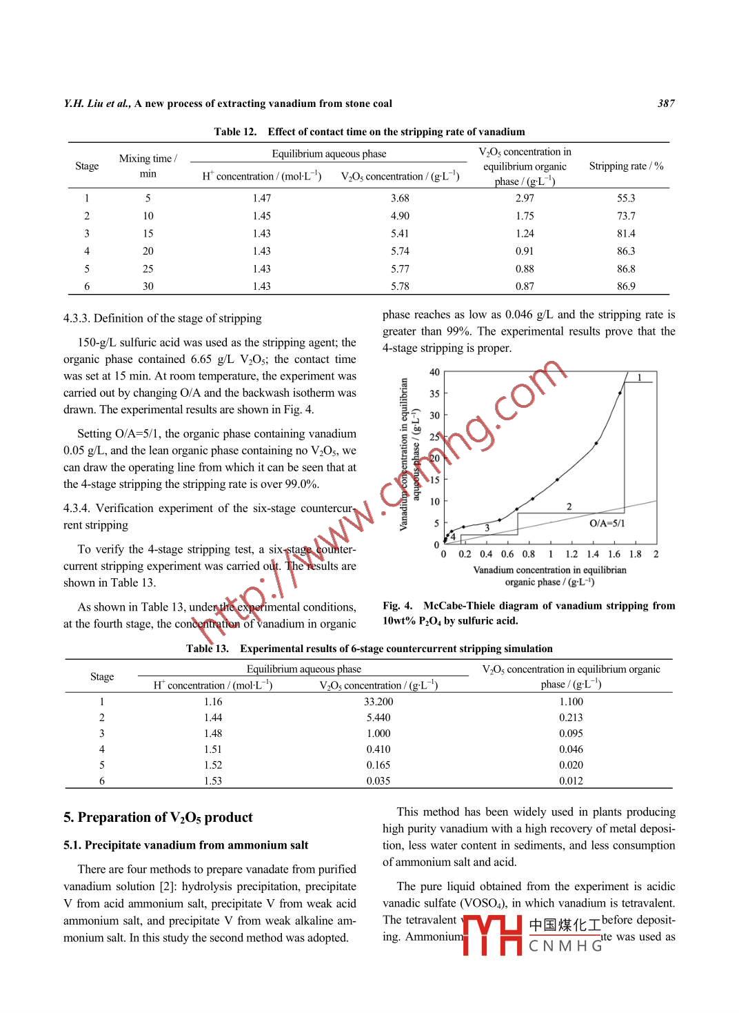 International Journal of Minerals, Metallurgy and MaterialsVolume 17, Number 4, August 2010, Page 381DOI: 10.1007/s12613-010-0330-8A new process of extracting vanadium from stone coalYan-hua Liul?2), Chao Yang", Pei-you Li2), and Shi-qi Li)1) Mallurgical and Ecologial Engineering School, University of Science and Technology Bejing, Bejing 10083, China2) Beiing Nengtai Environmental Protection Group Corp, Beijing 10022, China(Received: 1 July 2009; revised: 22 July 2009; acepted: 10 August 2009)China was introduced. Various leaching experiments were carried out, and the results show that the vanadium ore in Fangshankou is difficultto process due to its high consumption of acid and the high leaching rate of impurities. However, the leaching rate can be up to 80% and thecontent of V2Os in the residue can be between 0.22%-0.25% in the process of ore fine grinding- →oxidation roasting-→mixing and ripen-ing- >aquecous leaching- >P2O4 solvent extraction- >sulfuric acid stripping- >oxidation and precipitation- >decomposition by heat. Also, thequality of flaky V2Os produced by this process can meet the requirements of GB3283- 87. The total leaching rate of vanadium is 70%. Also,three types of wastes are easy to treat. The vanadium extraction process is better in relation to the aspect of environmental protection than thesodium method.Keywords: stone coal; vanadium; extraction; leaching; solvent extraction; V2Os1. Introductionsolvent extraction; for ion exchange, it is diffcult to finda resin with a large loading capacity of V currently. TheStone coal is one of the important mineral resources con-process of oxidation roasting- →acid leaching- →purificationtaining vanadium. In China, the gross reserve of vanadium→precipitation is only developed for stone coal with V+ [7],in the form of V2Os in stone coal is 118 million tons, ac-but the vanadium existing in the stone coal from Dunhuangcounting for more than 87% of the domestic reserve of va-area (Gansu Province, China) is V"t. Therefore, these threenadium [1]. In the 1970s, some companies began to extractprocesses are not suitable for the stone coal from Fang-vanadium from stone coal using the conventional technol-shankou of Dunhuang. However, the reserves of this kind ofogy. The brief flow sheet of the conventional technology in-coal stone in Gansu Province are large enough to explorecludes chloride roasting, leaching, deposition, alkali melting,and utilize. The aim of this paper is to seek an efficientand thermal decomposition [2]. This process is costly andtechnology of extracting vanadium from this kind of stonecomplicated with a low recovery of vanadium [3]. Moreover,coal in Gansu Province.it causes serious environmental pollution with poisonous2. Materials and methodsgases and waste water [4].A large amount of research work has been conducted to2.1. Materialsimprove the conventional process of recovering vanadiumRaw stone coal used in this study was taken from Fang-from stone coal. Some new processes, such as hypohalineshankou of Dunhuang, Gansu Province in China. Afterroasting-→acid leaching- >solvent extraction, roasting with-crushing and grinding, the particle size of the stone coal wasout chloride- →acid leaching- →ion exchange, and oxidationreduced to -100 and -60 mesh, respectively. The main min-roasting-→acid leaching- >purification- →precipitation, havecrals in the ore were quartz, roscoelite, dravite, calcite, andbeen studied [5-8]. The formation of a third phase ancarbon.' The chemical composition of the mineral samples isthe unstable operation limit the industrial application ofshown in Table 1.Corresponding author: Shi-qi Li E-mail: lshiqiustb.du.cn.◎University of Science and Technology Bejing and Springer-Verlag Berlin Heidelberg 2010中國(guó)煤化工包SpringerMYHCNM HG382Int J. Miner. Metall. Mater, Vol.17, No.4, Aug 2010Table 1. Chemical composition of mineral sampleswt%Size 1 meshSiO2Al2O3Fe2O3K2OMgOTiO2CaO-600.7864.38.83.32.80.700.570.230.16-1000.7161.6_8..4.60.630.510.200.15Size / meshNa2OBaOSrOCr2O3ClZnO2MoO3_AsZnO_C0.350.120.040.030.020.0116.50.240.130.100.03 .21.5The following chemical agents were used in the experi-Raw stone coalments: D2EHPA (>93vol%); industrial grade sulfonatedCrushing and grindingkerosene; 98vol% H2SO; chemically pure ammonia, so-dium sulfite, sodium chlorate, hydrochloric acid, and cal-cium oxide.| RoastingRoastingMixing acid2.2. Experimental proceduresand ripening || Mixing and leachingand ripeningThe raw coal was crushed and ground, then, three kindsAqueous leachingof leaching processes were selected in the experiments:grounding, mixing and leaching; mixing acid, ripening, andaqueous leaching; and roasting, mixing acid and ripening.ReducingAfter leaching, vanadium in the leaching liquor was reducedExtractionto V+ by reduction treatment, then, the leaching liquor wasenriched and purified by extraction and stripping, and get[Strippingthe high-purity vanadium solution. Finally vanadium wasPrecipitating V by acidprecipitated from the high-purity vanadium solution by acidammonium saltammonium salt, and flaky V2Os was obtained by pyrolysis.PyrolysisFig. 1 is the flow sheet of vanadium extraction from stonecoal.Flaky V2O,Fig. 1. Flow sheet of vanadium extraction from stone coal.3. Leaching vanadium from ores3.1. Grinding, mixing, and leachingmore efficient technologies to improve the leaching processfor the vanadium-bearing stone coal ore.The ore was ground to -100 and -60 mesh respectively,and then the raw ore and roasted ore were mixed and3.2. Mixing with acid, ripening, and aqueous leachingleached separately using the conventional technology. ThAccording to Ref. [9], higher temperature, higher acidity,experimental results are shown in Table 2.and longer reaction time are needed in the process of leach-As shown in Table 2, under conventional leaching condi-ing V from stone coal. Therefore, the tests of ripening andtions, the leaching rate of the raw ore and the roasted oreleac