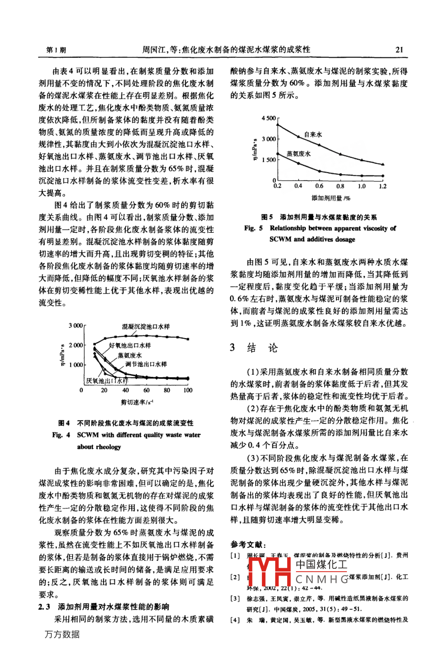 第20卷第1期黑龍江科技學(xué)院學(xué)報Vol 20 No. 12010年1月Journal of Heilongjiang Institute of Science& TechnologyJan.2010文章編號:1671-0118(2010)01-0018-05焦化廢水制備的煤泥水煤漿的成漿性周國江,王彥彪(黑龍江科技學(xué)院資源與環(huán)境工程學(xué)院,哈爾濱150027)摘要:針對焦化廢水中污染物濃度高、難以處理的現(xiàn)狀,利用蒸氨廢水和煤泥制備水煤漿,并與自來水、不同處理階段的焦化廢水制備的煤泥漿進行對比,分析煤泥水煤漿的成漿性。結(jié)果表明:蒸氨廢水與煤泥制備的水煤漿的穩(wěn)定性、流變性、發(fā)熱量均優(yōu)于自來水,且前者添加劑用量比后者減少0.4個百分點;焦化廢水中酚類物質(zhì)和氬氮對煤泥的成漿性有一定的分散穩(wěn)定作用;添加劑用量定時,厭氧池出口水樣與煤泥制備的漿體的流變性最優(yōu)。該研究為焦化廢水的回收利用提供了參考。關(guān)鍵詞:水煤漿;焦化廢水;煤泥;成漿性中圖分類號:X784;TQ534.4文獻標識碼:ASlurryability of coalslime water slurry with coking waste waterZHOU Guojiang, WANG YanbicCollege of Resources and Environment Engineering, Heilongjiang Institute of Science and TechnologyHarbin 150027, China)Abstract Aimed at a better treatment of challenging pollutant of high concentration in coking wasteter, this paper introduces SCWM prepared by using ammonia wastewater and sludge and offers an analysis ofhe slurryability of SCWM and comparison with tap water and coking waste water at different stage. The resultshows that ammonia wastewater and SCWM have much better stability, rheology and calorific value than tapwater and use 0. 4 percentage points less additive than tap water. The research also indicates that benzene se-ries and ammonia nitrogen in coking waste water have a definite dispersion and stability impact on slurryabilityof SCW, and the application of a certain amount of additive yields a best rheology in the export water of an-aerobic tank. This study offers reference for recovery and utilization of coking waste water.Key words: coal water slurry; coking waste water; sludge; slurryability成本的問題,還可解決煤泥對環(huán)境的污染問題,給焦0引言化生產(chǎn)帶來良好的社會效益和經(jīng)濟效益。因此利用焦化廢水與煤泥進行成漿研究具有現(xiàn)實意義焦化廢水中含有大量的酚類物質(zhì)和氨氮。這些近年來,眾多學(xué)者對水煤漿技術(shù)進行研究,但物質(zhì)濃度高、難處理、污染環(huán)境進而增加生產(chǎn)成本,是,基于工業(yè)廢水方面研究的并不多,且這些研究降低了焦化廠的生產(chǎn)效益。水煤漿與其他燃料一主要樣燃燒時會產(chǎn)生污染物,但與直接燃煤相比,其污備中國煤化工利用焦化廢水制且研究尚處于初染物排放少,還可有效控制。利用焦化廢水與煤步CNMHG廢水和煤泥進行泥制備水煤漿不僅可解決焦化廢水高污染和高處理水煤漿成漿實驗研究焦化廢水對水煤漿成漿性收稿日期:200912-21作者簡介:周國江(1963-),男黑龍江省哈爾濱人,教授博土研究方向煤化工工藝和潔凈煤技術(shù),E-mail:-193@tom,com第1期周國江,等:焦化廢水制備的煤泥水煤漿的成漿性能的影響。1.1.2煤泥實驗用煤泥選自寶泰隆公司洗煤廠浮選尾煤,1實驗其工業(yè)分析及元素分析見表2。1.1原料表2煤泥的工業(yè)分析及元素分析1.1.1焦化廢水Table 2 Sludge sample proximate and elemental實驗所用焦化廢水為寶泰隆公司的蒸氨廢水a(chǎn)nalysis of slime其處理工藝為A2/0方式流程如圖1所示M./%AM/% V/% Fca/% Q-aNkJ kg-Cy Hy Ov Sy238130229.74563763462148012蒸氨廢過提器一極酚}L兩袍一因氧袍該煤泥的粒度分析曲線如圖2所示。由圖2可外排一沉淀池上匚沉也}[好氧池[峽氧也見,粒度分析曲線上出現(xiàn)兩個比較明顯的波峰,分別集中在10-11um、30~60μm;煤泥最小粒徑小于圖1焦化廢水處理工藝流程0.1μm,最大粒徑小于200μm;當粒徑達到1.77rg1 Flow of coking waste water treatment technique um時篩下率達到10%;粒徑達到18.90μm時,篩下率達到50%;粒徑達到87.64μm時,篩下率達蒸氨廢水是混合剩余氨水蒸餾后所排出的廢到90%。水。廢水中含有高濃度的酚類和氨氮物質(zhì)。根據(jù)焦化廢水處理T藝,廢水首先在焦炭過濾器中過濾焦油后,進入萃取脫酚塔,與輕油逆流接觸,其中的酚被輕油所萃取,然后進入調(diào)節(jié)池進行預(yù)處理,經(jīng)預(yù)處理后的廢水進人生化處理階段。廢水首先進入?yún)捬醭?通過厭氧菌將其中難以生物降解的有機物酸化、水解,在此處理階段,水中酚類0.11.010010005000得到進一步的降解;此后廢水進入缺氧處理階段微生物通過反硝化反應(yīng)將污水中的NO2和NO還原為N2氣并從廢水中逸出,達到脫氮目的;然圖2煤泥的粒度分布后廢水進入好氧池,通過微生物的降解作用,酚、Fig. 2 Size distributing curve of sludge氰及其他有害物質(zhì)得到了去除,并通過硝化反應(yīng)將NH氧化為NO2和NO3-,氨氮和有機物得到根據(jù)研究,制備水煤漿的固體煤粒需具有雙峰很好的降解?;炷恋沓赝ㄟ^物理化學(xué)方法對二分布特征,粒度上限大于300μm、小于200μm的含次沉淀池出水進行處理,目地是進一步降低二次量不低于75%。由圖2可知,該煤泥滿足制備水煤沉淀池出水中的懸浮物和COD漿的粒度要求。取不同處理階段焦化廢水,分析其中主要污染1.1.3添加劑物氨氮、酚類、COD的質(zhì)量濃度,結(jié)果如表1所示實驗選取的添加劑為木質(zhì)素磺酸鈉,其用量按干基煤計算為0.6%。表1焦化廢水水質(zhì)1.2實驗方法Table 1 Water quality of c