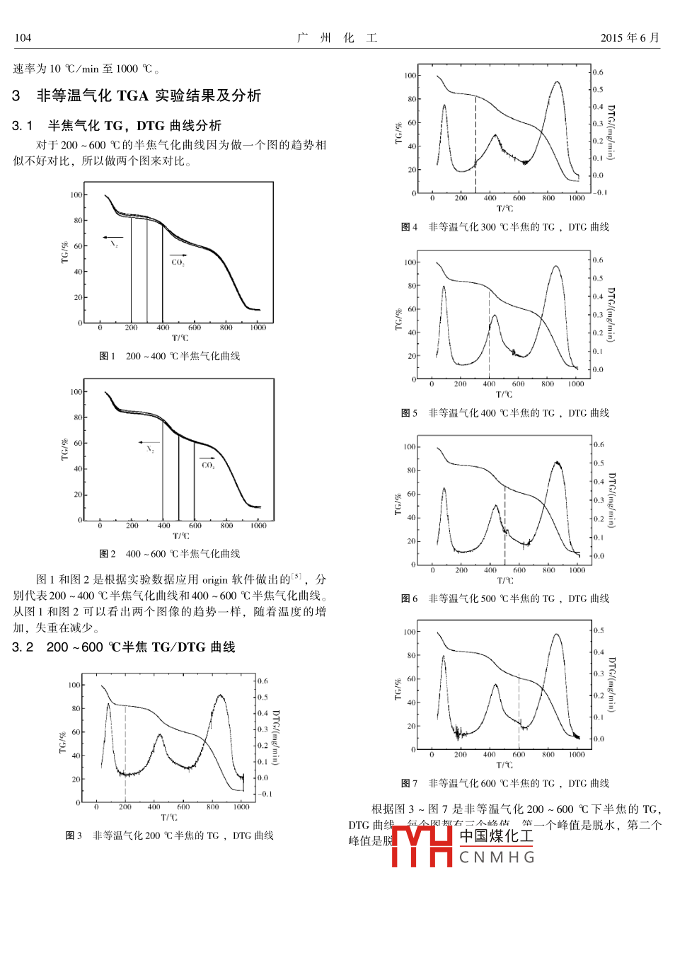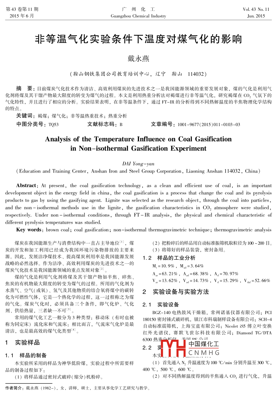 第43卷第11期廣州化工Vol.43 No. 112015年6月Guangzhou Chemical IndustryJun. 2015非等溫氣化實(shí)驗(yàn)條件下溫度對(duì)煤氣化的影響戴永燕(鞍山鋼鐵集團(tuán)公司教育培訓(xùn)中心,遼寧鞍山114032)商要:目前煤炭氣化技術(shù)作為清潔、高效利用煤炭的先進(jìn)技術(shù)之--是我國能源領(lǐng)域的重要發(fā)展對(duì)象,煤的氣化是利用氣化劑將煤及其干餾產(chǎn)物最大限度的轉(zhuǎn)變?yōu)槊簹獾倪^程。本文是利用熱重分析法對(duì)褐煤進(jìn)行非等溫氣化,研究褐煤在CO2氣氛下的氣化特性,并且進(jìn)行了相應(yīng)的分析。實(shí)驗(yàn)結(jié)果表明,在非等溫條件下,通過PFT-IR的分析得到不同熱解溫度的半焦物理化學(xué)結(jié)構(gòu)的特點(diǎn)。關(guān)鍵詞:褐煤;煤氣化;非等溫?zé)嶂丶夹g(shù);熱重分析中圖分類號(hào): TQ53文獻(xiàn)標(biāo)志碼: B文章編號(hào): 1001-9677(2015)011-0103-03Analysis of the Temperature Influence on Coal Gasificationin Non- isothermal Gasification ExperimentDAI Yong-yan( Education and Training Center, Anshan Iron and Steel Group Corporation, Liaoning Anshan 114032, China)Abstract: At present, the coal gasification technology, as a clean and efficient use of coal, is an importantdevelopment object in the energy field in china, the coal gasification is a process that change the coal and its pyrolysisproducts to gas by using the gasifying agent. Lignite was selected as the research object, through the coal into particles ,and the non - isothermal methods use in the lignite, the gasification characteristics in CO2 atmosphere were studied,respectively. Under non - isothermal conditions, through FT- IR analysis, the physical and chemical characteristic ofdifferent pyrolysis temperatures was studied.Key words: brown coal; coal gasification ; non - isothermal thermogravimetric technique ; thermogravimetric analysis煤炭在我國能源生產(chǎn)與消費(fèi)結(jié)構(gòu)中- -直占主導(dǎo)地位甲,煤(2)把粉碎后的樣品用自動(dòng)標(biāo)準(zhǔn)振篩機(jī)取粒徑為100 ~ 200目。炭的開發(fā)和加工利用已經(jīng)成為我國環(huán)境污染物排放的主要來(3)將篩好的樣品裝袋,密封備用。源。因此,發(fā)展?jié)崈裘杭夹g(shù)、提高煤炭利用率是我國能源發(fā)展1.2 樣品的工業(yè)分析戰(zhàn)略的必然選擇。作為潔凈、高效利用煤炭的先進(jìn)技術(shù)之-一的M,=10. 9%,M.u=3. 64% .煤炭氣化技術(shù)是我國能源領(lǐng)域的重點(diǎn)發(fā)展對(duì)象[2]。A..=63.21%, A=68.38%,A。=70.97%煤的氣化是利用氣化劑將煤及其干餾產(chǎn)物如半焦、碎焦、V。=13.62%,Vu=14. 73%,V。=15. 29%,Vur=52. 66%焦炭的有機(jī)物最大限度的轉(zhuǎn)變?yōu)槊簹獾倪^程。所用的氣化劑為水蒸氣、空氣(或氧)、氫氣及其他物質(zhì)的結(jié)合氧將煤中的碳轉(zhuǎn)2實(shí)驗(yàn)設(shè)備與實(shí)驗(yàn)方法化為可燃性氣體,它是-一個(gè)熱化學(xué)的過程,這一過程稱之為煤的氣化。煤炭氣化時(shí),必須具備三個(gè)條件,即氣化爐、氣化2. 1實(shí) 驗(yàn)設(shè)備劑、供給熱量,三者缺-不可以。BGZ- 140電熱鼓風(fēng)干燥箱,常州諾基儀器有限公司; PCI常用的煤氣化工藝一般分為3 種類型:移動(dòng)床(有時(shí)也被180150密封錘式破碎機(jī),鎮(zhèn)江市科瑞制樣設(shè)備有限公司; SCH-4稱為同定床)流化床和氣流床:相比而言,氣流床氣化爐是最自動(dòng)標(biāo)準(zhǔn)震篩機(jī),上海寶 藍(lán)有限公司; Nicolet is5 傅立葉變換清潔,也是最高效的煤氣化類型4。紅外光譜儀,賽默~飛世爾科技有限公司; Diamond TG/DTA1實(shí)驗(yàn)樣品中國煤化工1.1樣品的制備本實(shí)THCNMHG本實(shí)驗(yàn)所采用的樣品為神華低階煤,實(shí)驗(yàn)過程中所需要樣(1)首先通人 N,升溫速度為100 C/min分別升溫至300 C,品的制備過程如下:400C,500C,600C。(1)將樣品通過密封式破碎(縮分)機(jī)粉碎。(2)對(duì)不同熱解溫度得到的半焦通入CO2進(jìn)行氣化,升溫作者簡(jiǎn)介:戴永燕(1982-), 女,講師,碩士,主要從事化學(xué)工藝研究與教學(xué)。104廣州化工2015年6月速率為10C/min至1000C。0).60.53非等 溫氣化TGA實(shí)驗(yàn)結(jié)果及分析4號(hào)3.1半焦氣化TG,DTG曲線分析60對(duì)于200~600C的半焦氣化曲線因?yàn)樽鲆粋€(gè)圖的趨勢(shì)相似不好對(duì)比,所以做兩個(gè)圖來對(duì)比。40.1巨40.0106J 0.0一 200 400 600 800 1000T/C圖4非等溫氣化300 C半焦的TG,DTG 曲線號(hào)0下co.-0.60r401.5s0f20T/9圖1200~400C半焦氣化曲線0.1.00 200 400 600 800 1000圖5非等溫氣化400 C半焦的TG,DTG 曲線+0.6CO20.40.3+0.2言0 200 400 60000 100020-圖2400~600C半焦氣化曲線0.00200 400 600 800 1000圖1和圖2是根據(jù)實(shí)驗(yàn)數(shù)據(jù)應(yīng)用origin軟件做出的[5],分T/T:別代表200~400C半焦氣化曲線和400~600C半焦氣化曲線。圖6非等溫氣化 500 C半焦的TG,DTG曲線從圖1和圖2可以看出兩個(gè)圖像的趨勢(shì)--樣,隨著溫度的增加,失重在減少。003.2200 ~600 C半焦TG/DTG曲線).480f”冒80-+0.4弓0.1~: 60f1o.0.1是圖7非等溫氣化600C半焦的TG,DrG曲線500 800 1000根據(jù)圖3~圖7是非等溫氣化200~600 C下半焦的TG,DTG曲線,每個(gè)圖都古三個(gè)峰估 笛- 一個(gè)峰值是脫水,第二個(gè)圖3非等溫氣化200 C半焦的TG,DTG 曲線峰值是服中國煤化工YHCNMHG第43卷第11期戴永燕:非等溫氣化實(shí)驗(yàn)條件下溫度對(duì)煤氣化的影響1053.3非等溫氣化原煤、300C、500C半焦TG/DTG焦炭在此處峰值卻減弱了說明這種官能團(tuán)已經(jīng)隨氣體釋