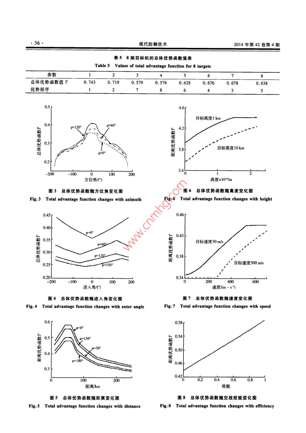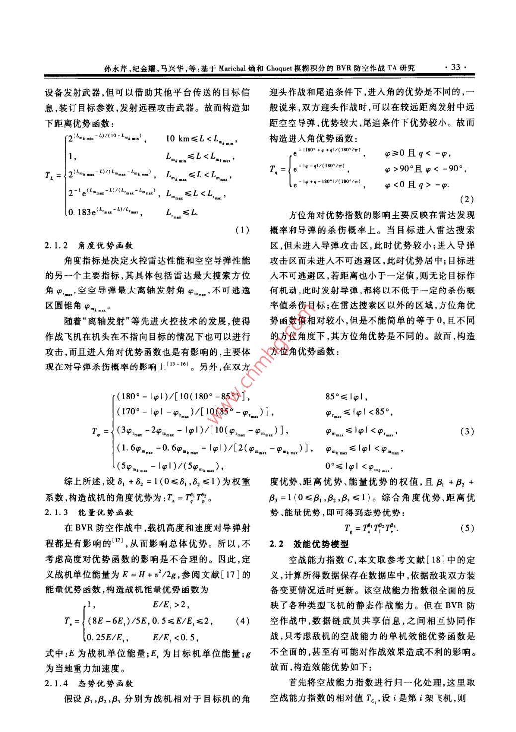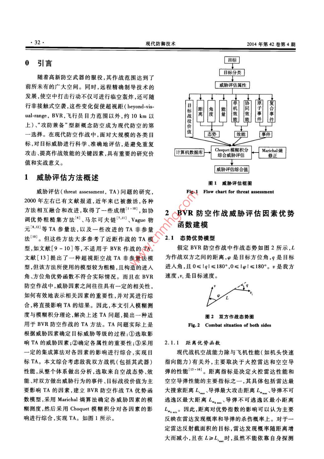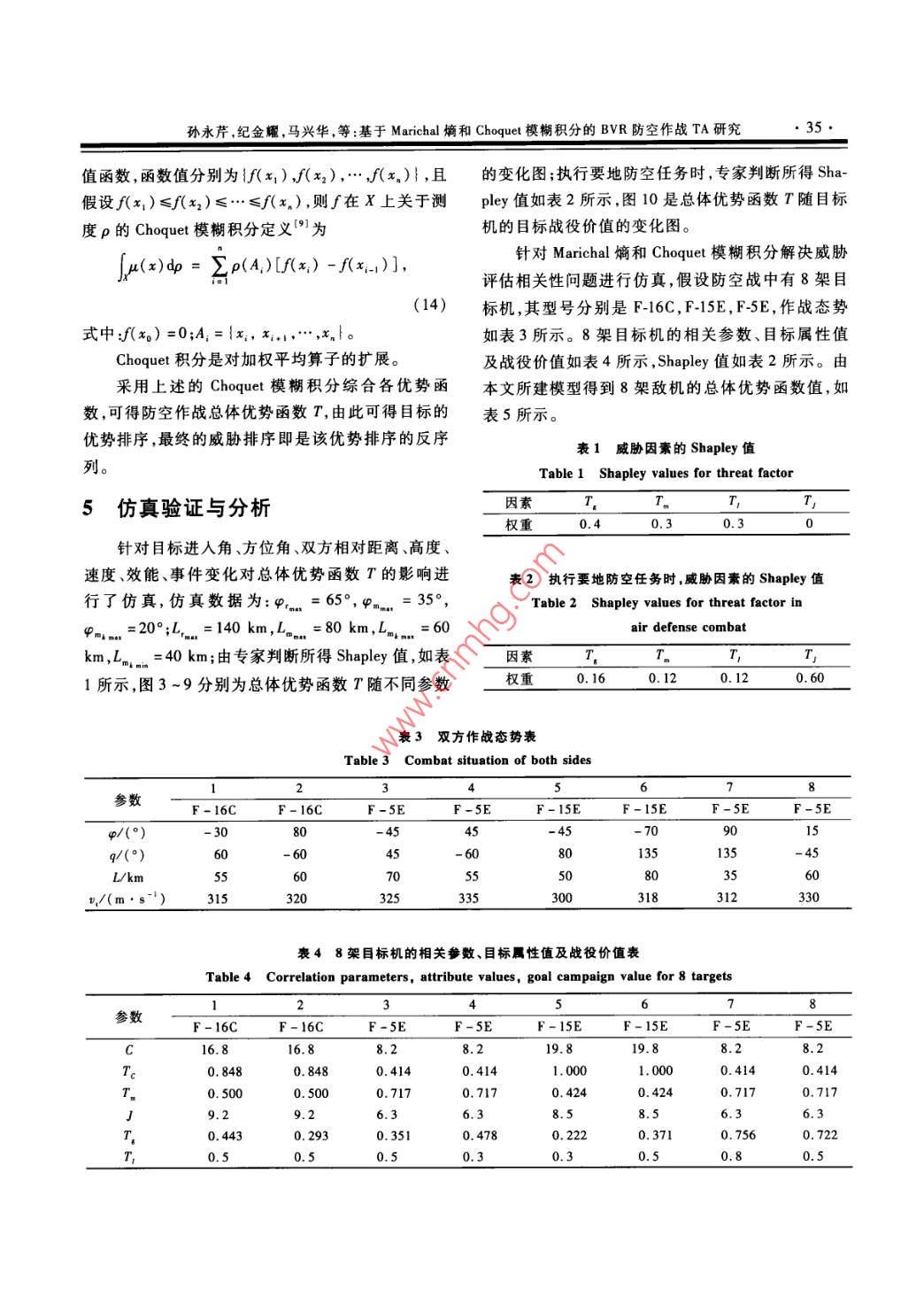 2014年8月現(xiàn)代防御技術(shù)Aug.2014第42卷第4期MODERN DEFENCE TECHNOLOGYVol 42 No 4口變天防御體系與武器基于 Marichal熵和 Choquet模糊積分的BⅤR防空作戰(zhàn)TA研究孫永芹12,紀(jì)金耀2,馬興華,姚成柱(1.中國人民解放軍91206部隊(duì),山東青島266108;2海軍潛艇學(xué)院,山東青島266071)摘要:針對BⅤR防空作戰(zhàn)的特點(diǎn),提出基于 Marichal嫡和 Choquet模糊積分的BVR防空作戰(zhàn)威脅評估方法。首先,建立威脅評估優(yōu)勢函數(shù)模型,優(yōu)化了方位角、進(jìn)入角、距離、能量、效能優(yōu)勢函數(shù),并增加了目標(biāo)戰(zhàn)役價值為威脅評估的因素;然后,針對各威脅因素之間的相關(guān)性,依據(jù) Shapley值,利用 Marichal螨算法求解g模糊測度,確定各優(yōu)勢函數(shù)的重要程度,并通過 Choquet模糊積分對各優(yōu)勢函數(shù)進(jìn)行綜合,實(shí)現(xiàn)威脅評估。經(jīng)仿真計(jì)算驗(yàn)證,該方法合理、有效。關(guān)鍵詞:超視距(BVR);威脅評估(TA);優(yōu)勢函數(shù);g模糊測度; Shapley值; Marichal熵;Chquet模糊積分doi:10.3969/jisn.1009086x.2014.04.006中圖分類號:TJ761.13;0159文獻(xiàn)標(biāo)志碼:A文章編號:1009086X(2014)4040031408Threat Assessment in BVR Air Defense Combat Based onMarichal Entropy and Choquet Fuzzy IntegralSUN Yong-qin,, JI Jin-yao, MA Xing-hua, YAO Cheng-zhu(1. PLA, No. 91206 Troop, Shandong Qingdao 266108, China; 2. Navy Submarine Academy, Shandong Qingdao 266071, China;Abstract: Aiming at characteristics of Beyond Visual Range air defense combat, a new threat assess-ment method is proposed based on Marichal entropy and Choquet fuzzy integral. Firstly, superiority func-tions of threat assessment are constructed. Superiority functions such as azimuth, enter angle, distanceenergy, efficiency are optimized, and, goal campaign values are added. Secondly, aiming at interde-pendence among threat factors, Marichal entropy calculates g, fuzzy measures with Shapley values andweight of each superiority function are achieved. Then, Choquet fuzzy integral synthesizes each superiori-ty function, sequentially, threat assessment is achieved. Finally, simulation results have verified the rationality and effectivenessKey words: beyond-visual-range( BVR); threat assessment(TA); superiority functions; g. fuzzymeasures; Shapley value; Marichal entropy; Choquet fuzzy integral收稿日期:2013-01-19;修回日期:2013-07-26基金項(xiàng)目:光電控制技術(shù)重點(diǎn)實(shí)驗(yàn)室和航空科學(xué)基金聯(lián)合資助項(xiàng)目(20115185003)作者簡介:孫永芹(1979-),女,山東沂水人。講師博士,研究方向?yàn)槲淦飨到y(tǒng)一體化技術(shù)、反潛作戰(zhàn)等。通信地址:266108山東省青島市城陽區(qū)迎賓路8號 E-mail:sqy20042004@126.c0m32·現(xiàn)代防御技術(shù)2014年第42卷第4期0引言目標(biāo)目標(biāo)分類隨著高新防空武器的服役,其作戰(zhàn)范圍達(dá)到了前所未有的廣大空間。同時,遠(yuǎn)程精確制導(dǎo)技術(shù)的威脅評估屬性發(fā)展使空中打擊行動不僅可進(jìn)行臨空轟炸還可隨行非接觸式空襲,這些變化促使超視距( beyond-vis-ual-range,BR,飛行員目力范圍以外,約10km以戰(zhàn)離度能」能」件」[件上)、“攻防兼?zhèn)洹毙托赂拍罘揽粘蔀楝F(xiàn)代防空的第一選擇。在現(xiàn)代防空作戰(zhàn)中,面對大規(guī)模的各類目值[態(tài)勢效能]事件標(biāo),對目標(biāo)威脅進(jìn)行科學(xué)、準(zhǔn)確地評估,是避免重復(fù)攻擊、提高作戰(zhàn)效能的關(guān)鍵因素,具有重要的研究價計(jì)算機(jī)數(shù)據(jù)庫模糊積分Mmha熵值和實(shí)戰(zhàn)意義。威脅評估綜合值1威脅評估方法概述圖1威脅評估框圖威脅評估( threat assessment,TA)問題的研究,Fig 1 Flow chart for threat assessment2000年左右已有文獻(xiàn)報道,近年來已被激活,各種方法相互融合和改進(jìn),取得了一些成績,如協(xié)2BⅤR防空作戰(zhàn)威脅評估因素優(yōu)勢調(diào)優(yōu)勢粗糙集方法6、馬爾可夫鏈11、 Vague物元等TA參量法,以及一些改進(jìn)的TA非參量函數(shù)建模法。但這些方法大多參考了近距作戰(zhàn)的TA模2.1態(tài)勢優(yōu)勢模型型,如文獻(xiàn)[9-10]等,不適用于BⅤR作戰(zhàn)的TA假定BVR防空作戰(zhàn)中作戰(zhàn)態(tài)勢如圖2所示,L文獻(xiàn)[13]提出了一種超視距空戰(zhàn)TA非參量法模為作戰(zhàn)雙方之間的距離,是目標(biāo)方位角,q是目標(biāo)型,但該方法所使用的模型較為粗糙,且構(gòu)造的進(jìn)入進(jìn)入角,且0≤lql≤180°,0≤lφ≤180°。是我方角、方位角優(yōu)勢函數(shù)不符合實(shí)際情況。而且在BVR速度,v是目標(biāo)速度。防空作戰(zhàn)中,威脅因素之間往往具有一定的相關(guān)性如何有效地表示相關(guān)因素的重要性,并對其進(jìn)行綜合,將直接影響TA的結(jié)果。因此,本文引入模糊測度與模糊積分理論,解決上述TA問題,提出一種適圖2雙方作戰(zhàn)態(tài)勢圖用于BⅤR防空作戰(zhàn)的TA方法。TA問題實(shí)際上是Fig 2 Combat situation of both sides根據(jù)威脅因素確定目標(biāo)威脅等級的過程:①選取影響TA的威脅因素;②確定各屬性的重要性;③采用2.1.1距離優(yōu)勢函數(shù)定的集成算法對各因素的影響進(jìn)行綜合,實(shí)現(xiàn)目現(xiàn)代戰(zhàn)機(jī)空戰(zhàn)能力除與飛機(jī)性能(如機(jī)頭快速標(biāo)TA。本文綜合考慮敵我雙方戰(zhàn)機(jī)(包括其武器)指向能力)有關(guān)外,主要取決于火控雷達(dá)和空空導(dǎo)性能,從整個體系做出分