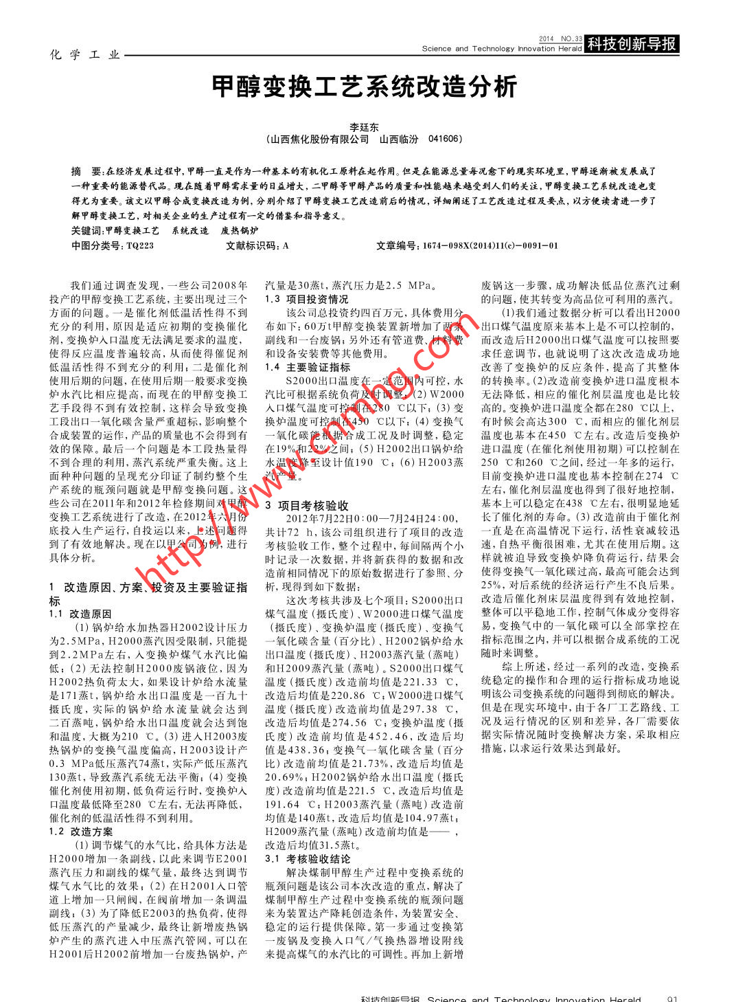 2014 NO.33|科技創(chuàng)新導(dǎo)報|Science and Technology Inovation Herald化學(xué)工業(yè)甲醇變換工藝系統(tǒng)改造分析李廷東(山西焦化股份有限公司山西臨汾 041606)摘要:在經(jīng)濟發(fā)展過程中, 甲醇~一直是作為一種基本的有機化工原料在起作用。但是在能源總量每況愈下的現(xiàn)實環(huán)境里,甲醇逐漸被發(fā)展成了一種重要的能源替代品?,F(xiàn)在隨著甲醇需求量的日益增大,二甲醇等甲醇產(chǎn)品的質(zhì)量和性能越來越受到人們的關(guān)注,甲醇變換工藝系統(tǒng)改造也變得尤為重要。該文以甲醇合成變換改造為例,分別介紹了甲醇變換工藝改造前后的情況,詳細(xì)闡述了工藝改造過程及要點,以方便讀者進一步了解甲醇變換工藝,對相關(guān)企業(yè)的生產(chǎn)過程有一定的借鑒和指導(dǎo)意義。關(guān)鍵詞:甲醇變換工藝系統(tǒng)改造 廢熱鍋爐中圖分類號: TQ223文獻標(biāo)識碼: A文章編號: 1674-098X(2014)11(e)-0091-01我們通過調(diào)查發(fā)現(xiàn),一些公司2008年汽量是30蒸t,蒸汽壓力是2.5 MPa。廢鍋這一步驟,成功解決低品位蒸汽過剩投產(chǎn)的甲醇變換工藝系統(tǒng),主要出現(xiàn)過三個1.3 項目投資情況的問題,使其轉(zhuǎn)變?yōu)楦咂肺豢衫玫恼羝7矫娴膯栴}。一是催化劑低溫活性得不到該公司總投資約四百萬元,具體費用分(1)我們通過數(shù)據(jù)分析可以看出H2000充分的利用,原因是適應(yīng)初期的變換催化布 如下: 60萬t甲醇變換裝置新增加了兩條出口煤氣溫 度原來基本上是不可以控制的,劑,變換爐入口溫度無法滿足要求的溫度,副線和一臺廢鍋;另外還有管道費、材料費而 改造后H2000出口煤氣溫度可以按照要使得反應(yīng)溫度普遍較高,從而使得催促劑和設(shè)備安裝費等其他費用。求任意調(diào)節(jié),也就說明了這次改造成功地低溫活性得不到充分的利用;二是催化劑1.4主要驗證指標(biāo)改善了變換爐的反應(yīng)條件,提高了其整體使用后期的問題,在使用后期--般要求變換S2000出口溫度在一定范圍內(nèi)可控,水的轉(zhuǎn)換率。(2)改造前變換爐進口溫度根本.爐水汽比相應(yīng)提高,而現(xiàn)在的甲醇變換工汽比可根 據(jù)系統(tǒng)負(fù)荷及時調(diào)整; (2) W2000無法降低, 相應(yīng)的催化劑層溫度也是比較藝手段得不到有效控制,這樣會導(dǎo)致變換人口煤 氣溫度可控制在280 C以下: (3)變高的。 變換爐進口溫度全都在280 C以上,工段出口一氧化碳含量嚴(yán)重超標(biāo),影響整個換爐溫度可控制在450C以下:(4)變換氣有時候會高達300C,而相應(yīng)的催化劑層合成裝置的運作,產(chǎn)品的質(zhì)量也不會得到有一氧化碳能根據(jù)合成工況及時調(diào)整,穩(wěn)定 溫度也基本在450 C左右。改造后變換爐.效的保障。最后一個問題是本工段熱量得在19%和22%之間: (5) H2002出口鍋爐給進 口溫度(在催化劑使用初期)可以控制在不到合理的利用,蒸汽系統(tǒng)嚴(yán)重失衡。這上水溫度降至設(shè)計值190 C; (6) H2003蒸250 C和260 C之間,經(jīng)過一-年多的運行,面種種問題的呈現(xiàn)充分印證了制約整個生汽產(chǎn)量。目前變換爐進口溫度也基本控制在274C產(chǎn)系統(tǒng)的瓶頸問題就是甲醇變換問題。這左右,催化劑層溫度也得到了很好地控制,些公司在2011年和2012年檢修期間對甲醇3項目考核驗收基本上可以穩(wěn)定在438C左右,很明顯地延變換工藝系統(tǒng)進行了改造,在2012年六月份2012年7月22日0: 00-7月24日24: 00,長了催化劑的壽命。(3)改造前由于催化劑底投入生產(chǎn)運行,自投運以來,上述問題得共計72 h, 該公司組織進行了項目的改造一直是在高溫情況下運行,活性衰減較迅到了有效地解決?,F(xiàn)在以甲公司為例,進行考核驗收工作,整個過程中,每間隔兩個小速,自熱平衡很困難,尤其在使用后期。這.具體分析。時記錄一次數(shù)據(jù),并將新獲得的數(shù)據(jù)和改樣就被迫導(dǎo)致變換爐降負(fù)荷運行,結(jié)果會造前相同情況下的原始數(shù)據(jù)進行了參照、分使得變換氣--氧化碳過高,最高可能會達到1改造原因、方案.投資及主要驗證指析,現(xiàn)得到如下數(shù)據(jù):25%,對后系統(tǒng)的經(jīng)濟運行產(chǎn)生不良后果。這次考核共涉及七個項目:S2000出口改造后催化劑床層溫度得到有效地控制,1.1 改造原因煤氣溫度(攝氏度) . W2000進口煤氣溫度整體可以平穩(wěn)地 工作,控制氣體成分變得容(1)鍋爐給水加熱器H2002設(shè)計壓力(攝氏度)、變換爐溫度(攝氏度)、變換氣易,變換氣中的- -氧化碳可以全部掌控在.為2.5MPa, H2000蒸汽因受限制,只能提一氧化碳含量(百分比)、H2002鍋爐給水指 標(biāo)范圍之內(nèi),并可以根據(jù)合成系統(tǒng)的工況到2.2MPa左右,人變換爐煤氣水汽比偏出口溫 度(攝氏度)、H2003蒸汽量(蒸噸)隨時 來調(diào)整低; (2)無法控制H2000廢鍋液位,因為和H2009蒸汽量(蒸噸)。S2000出口煤氣綜上所述,經(jīng)過- -系列的改造,變換系H2002熱負(fù)荷太大,如果設(shè)計爐給水流量溫度(攝氏度)改造前均值是221.33 C,統(tǒng)穩(wěn)定的操作和合理的運行指標(biāo)成功地說是171蒸t,鍋爐給水出口溫度是一百九十改造后均值是220.86 C, W2000進口煤氣明該公 司變換系統(tǒng)的問題得到徹底的解決。攝氏度,實際的鍋爐給水流量就會達到溫度(攝氏度)改造前均值是297.38 C,但是在現(xiàn)實環(huán)境中,由于各
