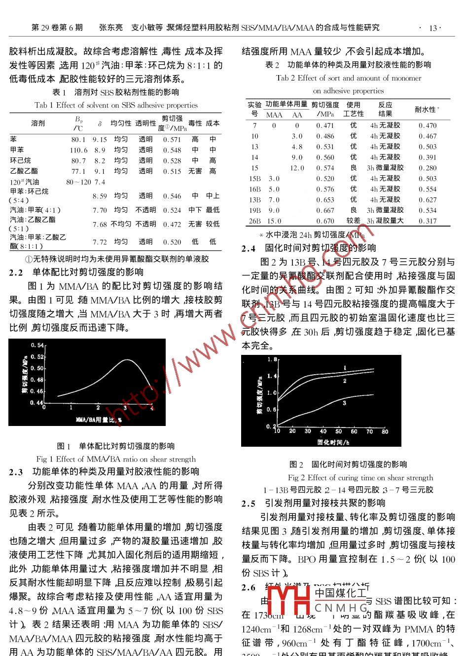 第29卷第6期塑料工業(yè)Vol 29 No 62001年11月CHINA PLASTICS INDUSTRYNoy 2001聚烯烴塑料用膠粘劑SBS/MMA/BA/MAA的合成與性能研究張東亮*支小敏呂云江(江蘇石油化工學(xué)院化工系常州市213016)以甲基丙烯酸MAA為功能單體與SS和甲基丙烯酸甲酯MMA丙烯酸丁醌BA琎進(jìn)行四元接枝共聚合成了聚烯烴塑料用膠粘劑探討了不同溶劑、 MMA/BA配比、MAA和BPO用量以及固化時間對粘接性能的影響并對該四元接枝膠的性能與三元膠和 SBS/MMA/BA/AA四元接枝膠進(jìn)行了比較。結(jié)果發(fā)現(xiàn)四元接枝膠性能優(yōu)于三元膠特別是與異氰酸酯配合時剪切強度、固化速度明顯提高四元膠的優(yōu)化配方是120#汽油:甲苯:乙酸乙酯為8:1:1MMABA配比3:1MAA加入量7份BPO用量1.5-2份以100份SBs計關(guān)鍵詞聚烯烴用膠粘劑SBS/ MMA/BA/MAA膠粘劑近年來許多研究人員對SBS進(jìn)行二元、三元接物用丙酮浸泡48h,將PMMA充分萃取,恒重,測枝共聚以改善對聚烯烴表面浸潤性及粘接性1-4],MMA的接枝量然后再用甲醇-正丁醇混合溶劑抽提我們曾以丙烯酸為功能性單體進(jìn)行了SBs/MMA48h以完全萃取 PBA PMAA均聚物恒重測BA及BAAA四元接枝共聚研究羧基的引入改善了膠粘劑MAA的接枝量的再反應(yīng)熱固性及與外交聯(lián)劑反應(yīng)的室溫固化性能,轉(zhuǎn)化率(%)=聚合單體的重量/單體總重量并提高了對聚烯烴的粘接強度及耐熱性能縮短了涂100%刷涼干時間56。本文在此研究的基礎(chǔ)上選用甲基接枝量(%)=接枝單體的重量/單體總重量丙烯酸為功能單體,研究 SBS/ MMA/BA/MAA四元100%接枝共聚這方面的研究目前尚未見報道。以功能單1.4分析與測試體MAA代替AA,試圖研制出不經(jīng)表面化學(xué)處理,使(1切強度的測定采用干燥的聚丙烯試片均用方便粘接強度耐熱及耐水性能優(yōu)于SBsS/wMA勻涂膠二次,試片規(guī)格為60mm×20mm×2mm涂膠BA/AA的聚烯烴用新型膠粘劑。面積為15mm×20mn(長×寬)晾置片刻后對合涂實驗?zāi)z的粘接面,施加一定手壓,室溫下固化24h后在1.1主要原料XL50A型拉力機上測試。SBS,YH-791,YH-792工業(yè)級岳陽石化總廠(2灴紅外光譜及DSC掃描分析抽提完全除去均合成橡膠廠灬 MMA BA混合溶劑增粘樹脂均為工業(yè)聚物后的純接枝物試樣分別在島津IR-460型紅外級 MAA AA BPO HQ抗氧劑1010等均為化學(xué)純。光譜儀及 Perkin-Elmer DSC4型示差掃描量熱計上進(jìn)1.2膠粘劑的制備行分析測試在帶有滴液漏斗回流冷凝器攪拌器和溫度計的2結(jié)果與討論四口燒瓶中加入一定量SBS和混合溶劑升溫并攪2.1溶劑的選擇拌使SBS完全溶解用氮氣保護(hù)在75~80℃下滴加溶解度參數(shù)δ湘近的溶劑對Sδ=8.6)肭溶溶有BPO○引發(fā)劑的MMA和BA等混合單體,于規(guī)定解性能較好。實驗所用有關(guān)溶劑的物性常數(shù)及配成膠時間內(nèi)滴完再保溫數(shù)小時。然后降溫至50℃,加入粘劑的綜合性能列于表1。終止劑HQ及適量混合增粘樹脂和抗氧劑1010,分散由表1可見瀋苯環(huán)己烷體系具有溶解性好膠均勻即可出料。液透明圍中國煤化工點為中等毒性;120汽1.3產(chǎn)物分離與聚合轉(zhuǎn)化率、接枝量的計算油:乙CNMHG按料的溶解性尚可但稱取未加增粘劑的接枝膠液總重量,從中稱取一對增粘樹脂松的浴胖性個好配出的膠液有沉淀物定量的膠液ω0℃下烘干至恒重測轉(zhuǎn)化率。將恒重產(chǎn)且乙酸乙酯的沸點較低用膠過程中易揮發(fā)而使SBS作者裔褓亮1965-)男頑士講師主要從事高分子材料合成工藝及化學(xué)改性等教學(xué)和科研已發(fā)表多篇論文。第29卷第6期張東亮支小敏等聚烯烴塑料用膠粘劑 SBS/MMA/BA/MAA的合成與性能研究13膠料析岀成凝膠。故綜合考慮溶解性毒性成本及揮結(jié)強度所用MAA量較少不會引起成本增加。發(fā)性等因素選用120*汽油:甲苯:環(huán)己烷為8:1:1的表2功能單體的種類及用量對膠液性能的影響低毒低成本配膠性能較好的三元溶劑體系。Tab 2 Effect of sort and amount of monomer表1溶劑對SBs膠粘劑性能的影響on adhesive propertiesTab 1 Effect of solvent on SBS adhesive properties實驗功能單體用量剪切強度使用反應(yīng)號 MAA AA/MPa工藝性結(jié)果耐水性溶劑Bδ均勻性透明性剪切強毒性成本00.471優(yōu)4h無凝膠0.470本80.19.15均勻透明0.571高中3.00.486優(yōu)4h無凝膠0.467110.68.9均勻透明0.548中中4.80.531優(yōu)4h無凝膠0.503環(huán)己烷80.78.2均勻透明0.528中高9.00.560優(yōu)4h無凝膠0.39乙酸乙酯77.19.1均勻透明0.515無害高12.00.574良3h微量凝膠0.280120#汽油80-1207.4l5B3.00.520優(yōu)4h無凝膠甲苯:環(huán)己烷16B5.00.576優(yōu)4h無凝膠0.5548.59均勻透明0.546中中上3B7.00.653優(yōu)4h無凝膠0.627汽油:甲苯(4:1)7.70均勻不透明0.524中下最低19B9.00.667良3h微量凝膠0.5汽油:乙酸乙酯7.68不均勻不透明0,472無害較低26B15.00.670較差3h凝膠量大0.317汽油:甲苯:乙酸乙頭水中浸泡24h剪切強度/P7.72均勻透明0.520低低釀(8:1:1)2.4固化時間對剪切強度的影響①無特殊說明時均為未使用異氰酸酯交聯(lián)劑的單液膠圖2為13B號、14號四元膠及7號三元膠分別與2.2單體配比對剪切強度的影響一定量的異氰酸酯交聯(lián)劑配合使用時粘接強度與固圖1為 MMA/BA的配比對剪切強度的影響結(jié)化時間的關(guān)系曲線。由圖2可知外加異氰酸酯作交果。由圖1可見縋 MMA/BA比例的增大按枝膠剪聯(lián)劑3B號與14號四元膠粘接強度的提高幅度大于切強度隨之增大當(dāng) MMA/BA大于3時再增大兩者7