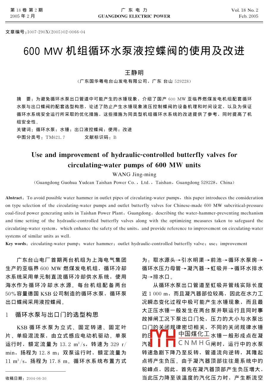 第18卷第2期廣東電力Vol. 18 No.2.2005年2月GUANGDONG ELECTRIC POWERFeb. 2005文章編號:1007-290X(2005)02 -0066-04600MW機組循環(huán)水泵液控蝶閥的使用及改進王靜明(廣東國華粵電臺山發(fā)電有限公司,廣東臺山529228)摘要:為避免循環(huán)水泵出口管道中可能產(chǎn)生的水錘現(xiàn)象,介紹了國產(chǎn)600MW亞臨界燃煤發(fā)電機組配套循環(huán)水泵與出口蝶閥的配套選型構思,論述了防止產(chǎn)生水錘現(xiàn)象液壓控制蝶閥的設備機理和時間設定,以及為保證循環(huán)水系統(tǒng)安全運行所采取的優(yōu)化措施,這些措施為同類型機組循環(huán)水系統(tǒng)的改進提供了參考,同時提高了機組安全性。關鍵詞:循環(huán)水泵;水錘;出口液控蝶閥;使用;改進中圖分類號: TM621. 7文獻標識碼: BUse and improvement of hydraulic-controlled butterfly valves forcirculating-water pumps of 600 MW unitsWANG Jing-ming(Guangdong Guohua Yudean Taishan Power Co.,Ltd., Taishan, Guangdong 529228,China)Abstract: To avoid possible water hammer in outlet pipes of circulating- water pumps,this paper introduces the considerationon type selection of the circulating- water pumps and outlet butterfly valves for Chinese-made 600 MW subcritical-pressurecoal-fired power generating units in Taishan Power Plant, Guangdong,describing the water- hammer- preventing mechanismand time setting of the hydraulic-controlled butterfly valves along with the optimizing measures taken to safeguard thecirculating- water system,which enhance the safety of the units, and provide reference to improvement on circulating- watersystems of similar units as well.Key words: circulating-water pump; water hammer; outlet hydraulic-controlled butterfly valve; use; improvement.廣東臺山電廠首期兩臺機組為上海電氣集團為:取水源頭-→引水明渠→前池-→循環(huán)水泵房→生產(chǎn)的亞臨界600 MW燃煤發(fā)電機組,循環(huán)冷卻循環(huán)水壓力母管-→凝汽器→虹吸井→循環(huán)水排水水系統(tǒng)采用單元制直流循環(huán)冷卻供水系統(tǒng),使用溝- >排水口。海水作為循環(huán)冷卻水水源。每臺機組配備兩臺從循環(huán)水泵出口管道至虹吸井管線實際長度50%容量德國KSB公司制造的循環(huán)水泵,循環(huán)泵近1 000m,而且凝汽器部位較高,因此在水力工出口蝶閥采用液控蝶閥。況瞬態(tài)變化過程中極可能產(chǎn)生水錘現(xiàn)象,而且最大正壓水錘一般發(fā)生在兩臺泵并聯(lián)運行且同時事1循環(huán)水泵與 出口門的選型構思故掉閘工況下泵出口門處,壓力的大小與水泵出KSB循環(huán)水泵為立式、固定轉速、固定葉口門的關閉規(guī)律密切相關,不同的關閉規(guī)律水錘片、單級混流泵,由立式感應電動機驅動。單泵的中國煤化工水錘-般形成點在凝運行時,額定流量為13.2 m3/s,轉速為329 r/YHCNMHG閘時,運行中的水泵min,揚程為12.8 m;雙泵運行時,額定流量為轉速急劇下降乃至反轉,管道流向逆轉,其隆起11 m'/s, 揚程為17.8 m。循環(huán)水系統(tǒng)布置方式點將產(chǎn)生負壓。由于凝汽器頂部往往是系統(tǒng)中的駝峰點,因此,首先在凝汽器頂部產(chǎn)生負壓增大,收稿日期: 2004-06-30當此壓力降至該溫度的汽化壓力時,產(chǎn)生斷流空第2期王靜明:600MW機組循環(huán)水泵液控蝶閥的使用及改進67腔,造成水柱分離。為防止凝汽器頂部產(chǎn)生水柱MPa和一0.058MPa。管道特征點的最大水錘壓分離的彌合水錘升壓導致凝汽器破壞事故,以及力不超過0.392MPa,壓力波動不超過0.16彌合水錘波傳到水泵出口,必須在閥門選型方面MPa,停泵16s后系統(tǒng)趨于穩(wěn)定。予以充分考慮。按照這樣的設計思路,我們認為2.4泵出口30s快關75°,50 s慢關15°的情況選用液控蝶閥作為循環(huán)水泵配套的出口門可以較與20s快關相比,開始倒流與倒流時間無太好地避免可能產(chǎn)生的水錘效應。大變化,最大倒流流量和最大倒轉轉速都有所增2兩臺泵并聯(lián)運行,同時掉泵水錘分析加,分別為額定值的14. 1%和15. 2%。按照KSB公司提供的產(chǎn)品資料和液控蝶閥特3出口液控蝶閥的特點性,對臺山電廠循環(huán)水系統(tǒng)進行了水錘分析計算。循環(huán)水泵出口門為多功能液控蝶閥,正常情當兩臺水泵并聯(lián)運行,同時事故停泵時,每臺泵況下,閥角度0°~90'對應時間30~120 s可調(diào),的最大倒流量為額定流量的60. 1%,泵開始倒轉開啟時為均勻開啟;關閉時為快關一慢關,快關的時間為停泵后36 s,停泵后系統(tǒng)最大水錘壓力角度90°~20° +8對應時間3~30s可調(diào),慢關角為0.4548MPa,凝汽器前后的最大水錘壓力分度20*士8°~0°對應時間6~60 s可調(diào)。蝶閥液壓別為0.1076MPa和0.0752MPa,泵出口400m系統(tǒng)設有電動泵、手動泵兩套供油系統(tǒng)以便操作處和凝汽器后40m處最大水錘壓力分別為閥門的開啟和關閉,通常情況下開閥時由油泵電0.1161MPa和0.1936MPa。機提供動力,只有在緊急情況下采用手動液壓泵.兩臺泵并聯(lián)運行,同時掉泵出口閥兩階段關開啟閥門在現(xiàn)場操作;關閥時由升起的重錘提供閉情況分析如下:能量,驅動閥門關閉,關閥時不需驅動電源。在2. 1泵出口5s快關75°, 20 s慢關15°的情況開啟蝶閥控制面板上的三個元件可以調(diào)整蝶閥開由于快關時間較快,水泵沒有倒流和倒轉現(xiàn)啟速度,而無法使蝶閥在某一位置停留。閥門關象,閥門關閉后凝汽器處流量反復波動,管道中閉時具備快關-慢關功能,可以充分減弱可能產(chǎn)出現(xiàn)長時間的壓力波動,波動