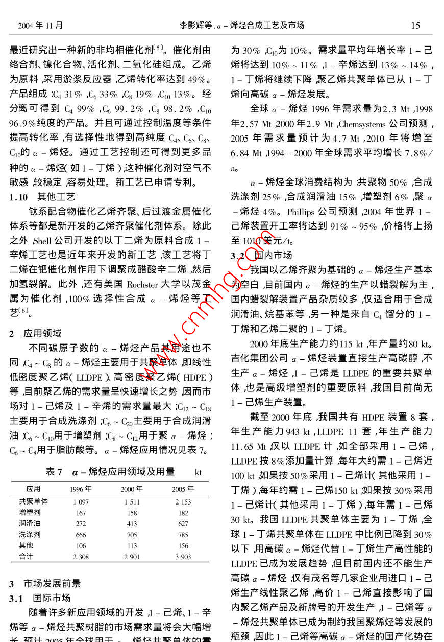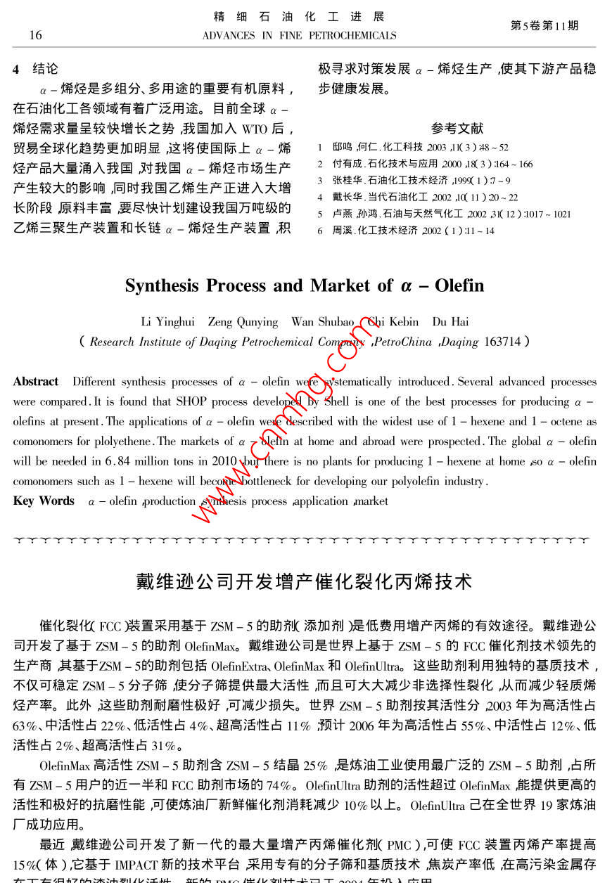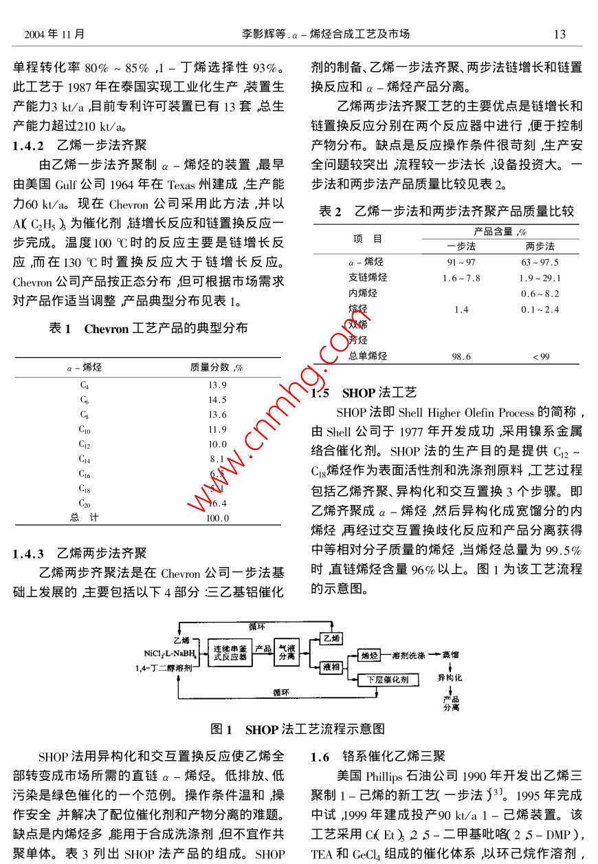 精細(xì)石油化工進(jìn)展第5卷第11期2ADVANCES IN FINE PETROCHEMICALSa-烯烴合成工藝及市場(chǎng)李影輝曾群英萬(wàn)書(shū)寶遲克彬杜海( 1.大慶石化公司研究院大慶163714)摘要系統(tǒng)介紹了a-烯烴的各種合成工藝并對(duì)幾種較先進(jìn)的合成工藝作比較,認(rèn)為美國(guó)Shell公司開(kāi)發(fā)的SHOP法是目前生產(chǎn)a-烯烴較先進(jìn)技術(shù)之一。介紹了a-烯烴的應(yīng)用領(lǐng)域尤其是用于聚乙烯共聚體的1-己烯和1-辛烯用量最大。對(duì)a-烯烴的市場(chǎng)發(fā)展前景,從世界、國(guó)內(nèi)分別作分析和展望到2010年a-烯烴全球需求量將達(dá)6840kt;國(guó)內(nèi)目前尚無(wú)1-己烯生產(chǎn)裝置,認(rèn)為1-己烯等a-烯烴共聚體已經(jīng)成為我國(guó)聚烯烴發(fā)展的瓶頸。關(guān)鍵詞a-烯烴 生產(chǎn)合成工藝應(yīng)用市場(chǎng)線性a-烯烴(LAOS)是近30年來(lái)迅速發(fā)展已經(jīng)停止運(yùn)行。的一種重要有機(jī)化工原料。自20世紀(jì)90年代乙1.2 煤化工抽提工藝烯齊聚a-烯烴工業(yè)化以來(lái),應(yīng)用領(lǐng)域不斷地?cái)U(kuò)1994年5月南非Sasol公司在煤為原料生產(chǎn)大發(fā)展,世界a-烯烴系列產(chǎn)品量增長(zhǎng)迅速,全球合成燃料工藝中,從富含a-烯烴物流中分離1-每年市場(chǎng)需求量約為4.0 Mt ,并且呈現(xiàn)較快增長(zhǎng)戊烯、1-己烯裝置投產(chǎn)成功。該裝置可以調(diào)整1勢(shì)頭,作為共聚單體的a -烯烴如1-丁烯、1-己-戊烯、1-己烯的比例,使1-己烯產(chǎn)量超過(guò)烯及1 -辛烯的需求量劇增成為a -烯烴的第一100 kt/ao該工藝最大優(yōu)點(diǎn)是以煤為原料把1-大消費(fèi)領(lǐng)域(1。戊烯、1-己烯作為副產(chǎn)物回收工業(yè)化生產(chǎn)成本全球a -烯烴生產(chǎn)商主要是美國(guó)Shell、低。Chevron. Amoeco 3家公司。這3家大公司a-烯烴1.3 混合C4分離法生產(chǎn)能力占全球a-烯烴(包括C4分離法)能力混合C4來(lái)自蒸汽裂解裝置及流化催化裂化的75%以上其中1-己烯占世界總量的58%。裝置主要由丁烷類(lèi)、丁烯類(lèi)、炔烴類(lèi)組成。工業(yè)美國(guó)是1-己烯凈出口國(guó)達(dá)10 kt/a ,西歐也是凈上采用蒸汽裂解餾分作原料生產(chǎn)高純1 -丁烯。出口地區(qū),達(dá)15~ 20 kt/a ,南非(主要是Sasol 公.首先用萃取法脫除丁二烯得到抽余液用化學(xué)法司)-直是1-己烯凈出口國(guó)從1999年起還出口脫除異丁烯最后用精密精餾或催化萃取法制得1-辛烯和1-庚烯。多數(shù)生產(chǎn)商同時(shí)生產(chǎn)多種a高純1-丁烯;也可用物理方法直接從含異丁烯-烯烴。的混合餾分中吸附分離出純的1 -丁烯。由于a-烯烴具有很大的市場(chǎng)發(fā)展?jié)摿?國(guó)催化裂化C4餾分作原料先經(jīng)甲基叔丁基醚外一些主要的a-烯烴生產(chǎn)商正在不斷擴(kuò)大生產(chǎn)( MTBE )裝置脫除丁二烯再脫硫、脫水、加氫脫除能力探索新的乙烯齊聚催化體系和更為經(jīng)濟(jì)有二烯烴和炔烴再經(jīng)二聚脫除殘余的異丁烯最后效的新工藝增強(qiáng)產(chǎn)品的市場(chǎng)競(jìng)爭(zhēng)力。精餾得高純1-丁烯。1 a- 烯烴生產(chǎn)技術(shù)1.4乙烯齊聚1.1蠟裂解或脫氫1.4.1 乙烯二聚法使用齊聚路線生產(chǎn)直鏈a-烯烴之前,直鏈乙烯二聚生產(chǎn)高純度的1-丁烯典型技術(shù)a -烯烴都由原油中的含蠟烴熱裂解生產(chǎn)。生成是法國(guó)石油研究院( IFP )開(kāi)發(fā)的a-烯烴技術(shù)(2) ,的直鏈a-烯烴含有Cs~ C2的烯烴。隨著科技乙烯為原料,使用液相循環(huán)反應(yīng)器。反應(yīng)溫度進(jìn)步,石蠟裂解法在經(jīng)濟(jì)和產(chǎn)品質(zhì)量方面都缺乏50~55 C壓力2.1~ 2.2 MPa反應(yīng)時(shí)間5~6 ho競(jìng)爭(zhēng)力。發(fā)達(dá)國(guó)家已逐漸淘汰了這種生產(chǎn)方法,Chevron公司1984年關(guān)閉了石蠟裂解工廠,美國(guó)收稿日期2004-06-18。作者簡(jiǎn)介李影輝,工程師,從事天然氣化工及下游產(chǎn)品Shell公司在歐洲的3個(gè)石蠟裂解工廠至少兩個(gè)開(kāi)發(fā)。2004年11月李影輝等. a-烯烴合成工藝及市場(chǎng)13單程轉(zhuǎn)化率80%~85%,1-丁烯選擇性93%。劑的制備、乙烯-步法齊聚、兩步法鏈增長(zhǎng)和鏈置此工藝于1987年在泰國(guó)實(shí)現(xiàn)工業(yè)化生產(chǎn)裝置生換反應(yīng)和a-烯烴產(chǎn)品分離。產(chǎn)能力3 kt/a ,目前專(zhuān)利許可裝置已有13套總生乙烯兩步法齊聚工藝的主要優(yōu)點(diǎn)是鏈增長(zhǎng)和產(chǎn)能力超過(guò)210 kt/ao鏈置換反應(yīng)分別在兩個(gè)反應(yīng)器中進(jìn)行,便于控制1.4.2 乙烯-步法齊聚產(chǎn)物分布。缺點(diǎn)是反應(yīng)操作條件很苛刻生產(chǎn)安由乙烯-步法齊聚制a-烯烴的裝置,最早全問(wèn)題較突出流程較一步法長(zhǎng) ,設(shè)備投資大。-由美國(guó)Gulf公司1964年在Texas州建成,生產(chǎn)能步法和兩步法產(chǎn)品質(zhì)量比較見(jiàn)表2。力60kt/ao現(xiàn)在Chevron公司采用此方法,并以表2乙烯一 步法和兩步法齊聚產(chǎn)品質(zhì)量比較A( C2Hs》為催化劑鏈增長(zhǎng)反應(yīng)和鏈置換反應(yīng)-產(chǎn)品含量,%步完成。溫度100 C時(shí)的反應(yīng)主要是鏈增長(zhǎng)反項(xiàng)目?jī)刹椒☉?yīng),而在130 C時(shí)置換反應(yīng)大于鏈增長(zhǎng)反應(yīng)。a-烯烴91~9763-97.5Chevron公司產(chǎn)品按正態(tài)分布但可根據(jù)市場(chǎng)需求支鏈烯烴1.6~7.8.1.9~29.1