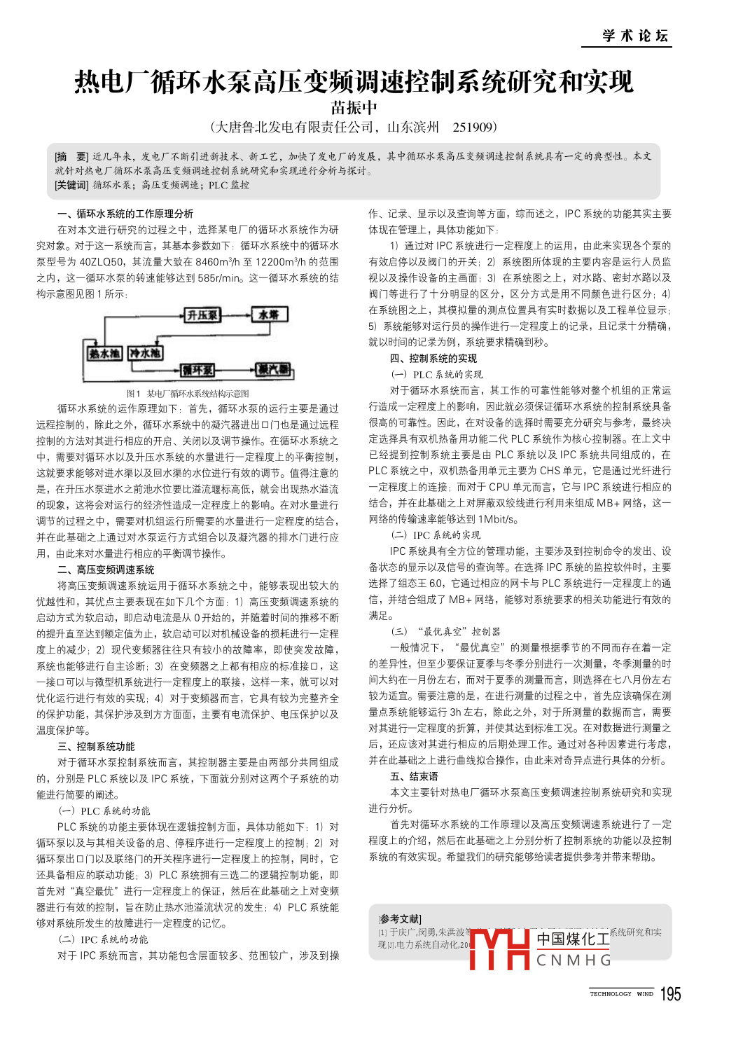 學(xué)術(shù)論壇熱電廠循環(huán)水泵高壓變頻調(diào)速控制系統(tǒng)研究和實現(xiàn)苗振中(大唐魯北發(fā)電有限責(zé)任公司,山東濱州251909)[摘要]近幾年來,發(fā)電廠不斷引進(jìn)新技術(shù)、新工藝,加快了發(fā)電廠的發(fā)展,其中循環(huán)水泵高壓變頻調(diào)速控制系統(tǒng)具有一定的典型性。本文就針對熱電廠循環(huán)水泵高壓變頻調(diào)速控制系統(tǒng)研究和實現(xiàn)進(jìn)行分析與探討。[關(guān)鍵詞]循環(huán)水泵;高壓變頻調(diào)速; PLC監(jiān)控一、循環(huán)水系統(tǒng)的工作原理分析作、記錄、顯示以及查詢等方面,綜而述之,IPC系統(tǒng)的功能其實主要在對本文進(jìn)行研究的過程之中,選擇某電廠的循環(huán)水系統(tǒng)作為研體現(xiàn)在管理上,具體功能如下:究對象。對于這一系統(tǒng)而言, 其基本參數(shù)如下:循環(huán)水系統(tǒng)中的循環(huán)水1) 通過對IPC 系統(tǒng)進(jìn)行-定程度上的運用,由此來實現(xiàn)各個泵的泵型號為40ZLQ50,其流量大致在8460m2/h至12200m/h的范圍有效啟停以及閥門的開關(guān); 2) 系統(tǒng)圖所體現(xiàn)的主要內(nèi)容是運行人員監(jiān)之內(nèi),這一循環(huán)水泵的轉(zhuǎn)速能夠達(dá)到585r/min。這一循環(huán)水系統(tǒng)的結(jié)視以及操作設(shè)備的主畫面; 3)在系統(tǒng)圖之上,對水路、密封水路以及構(gòu)示意圖見圖1所示:閥門等進(jìn)行了+分明顯的區(qū)分,區(qū)分方式是用不同顏色進(jìn)行區(qū)分; 4)開樂案一[水塔]在系統(tǒng)圖之上,其模擬量的測點位置具有實時數(shù)據(jù)以及工程單位顯示;5)系統(tǒng)能夠?qū)\行員的操作進(jìn)行一定程度上的記錄,且記錄+分精確,就以時間的記錄為例,系統(tǒng)要求精確到秒。四、控制系統(tǒng)的實現(xiàn)(一)PLC系統(tǒng)的實現(xiàn)圖1某電廠循環(huán)水系統(tǒng)結(jié)構(gòu)示意圖對于循環(huán)水系統(tǒng)而言,其工作的可靠性能夠?qū)φ麄€機(jī)組的正常運循環(huán)水系統(tǒng)的運作原理如下:首先,循環(huán)水泵的運行主要是通過行造成一定程度上的影響,因此就必須保證循環(huán)水系統(tǒng)的控制系統(tǒng)具備遠(yuǎn)程控制的,除此之外,循環(huán)水系統(tǒng)中的凝汽器進(jìn)出門也是通過遠(yuǎn)程很高的可靠性。因此,在對設(shè)備的選擇時需要充分研究與參考,最終決控制的方法對其進(jìn)行相應(yīng)的開啟、關(guān)閉以及調(diào)節(jié)操作。在循環(huán)水系統(tǒng)之定選擇具有雙機(jī)熱備用功能二代PLC系統(tǒng)作為核心控制器。在上文中中,需要對循環(huán)水以及升壓水系統(tǒng)的水量進(jìn)行一定程度 上的平衡控制,已經(jīng)提到控制系統(tǒng)主要是由PLC系統(tǒng)以及IPC系統(tǒng)共同組成的,在這就要求能夠?qū)M(jìn)水渠以及回水渠的水位進(jìn)行有效的調(diào)節(jié)。值得注意的PLC系統(tǒng)之中,雙機(jī)熱備用單元主要為CHS單元,它是通過光纖進(jìn)行是,在升壓水泵進(jìn)水之前池水位要比溢流堰標(biāo)高低,就會出現(xiàn)熱水溢流一定程度上的連接;而對于CPU單元而言,它與IPC系統(tǒng)進(jìn)行相應(yīng)的的現(xiàn)象,這將會對運行的經(jīng)濟(jì)性造成一定程度上的影響。在對水量進(jìn)行結(jié)合,并在此基礎(chǔ)之上對屏蔽雙絞線進(jìn)行利用來組成MB+網(wǎng)絡(luò),這一調(diào)節(jié)的過程之中,需要對機(jī)組運行所需要的水量進(jìn)行一定程度的結(jié)合,網(wǎng)絡(luò)的傳輸速率能夠達(dá)到1Mbit/s。并在此基礎(chǔ)之上通過對水泵運行方式組合以及凝汽器的排水門進(jìn)行應(yīng)(二) IPC系統(tǒng)的實現(xiàn)用,由此來對水量進(jìn)行相應(yīng)的平衡調(diào)節(jié)操作。IPC系統(tǒng)具有全方位的管理功能,主要涉及到控制命令的發(fā)出、設(shè)二、高壓變頻調(diào)速系統(tǒng)備狀態(tài)的顯示以及信號的查詢等。在選擇IPC系統(tǒng)的監(jiān)控軟件時,主要將高壓變頻調(diào)速系統(tǒng)運用于循環(huán)水系統(tǒng)之中,能夠表現(xiàn)出較大的選擇'了組態(tài)王6.0,它通過相應(yīng)的網(wǎng)卡與PLC系統(tǒng)進(jìn)行一定程度 上的通優(yōu)越性和,其優(yōu)點主要表現(xiàn)在如下幾個方面: 1)高壓變頻調(diào)速系統(tǒng)的言,并結(jié)合組成了MB+網(wǎng)絡(luò),能夠?qū)ο到y(tǒng)要求的相關(guān)功能進(jìn)行有效的啟動方式為軟啟動,即啟動電流是從0開始的,并隨著時間的推移不斷的提升直至達(dá)到額定值為止,軟啟動可以對機(jī)械設(shè)備的損耗進(jìn)行一定程三) “最優(yōu)真空”控制器度上的減少; 2)現(xiàn)代變頻器往往只有較小的故障率,即使突發(fā)故障,一般情況下, “最優(yōu)真空” 的測量根據(jù)季節(jié)的不同而存在著- -定系統(tǒng)也能夠進(jìn)行自主診斷; 3)在變頻器之上都有相應(yīng)的標(biāo)準(zhǔn)接口,這的差異性,但至少要保證夏季與冬季分別進(jìn)行-次測量, 冬季測量的時一接口可以與微型機(jī)系統(tǒng)進(jìn)行一定程度上的聯(lián)接,這樣-來,就可以對間大約在- - 月份左右,而對于夏季的測量而言,則選擇在七八月份左右優(yōu)化運行進(jìn)行有效的實現(xiàn); 4) 對于變頻器而言,它具有較為完整齊全較為適宜。需要注意的是,在進(jìn)行測量的過程之中,首先應(yīng)該確保在測的保護(h