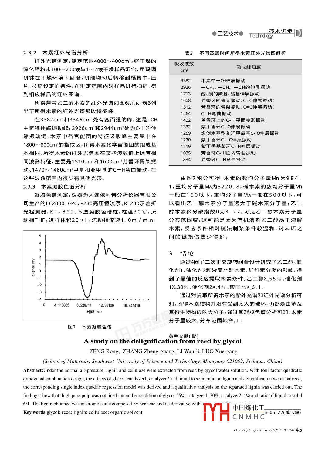 D技術(shù)進(jìn)樓de·工藝技術(shù)●蘆葦乙二醇法分離木素制漿研究曾榮張正光李萬利羅學(xué)剛(西南科技大學(xué)四川綿陽621010)在常壓下,采用4因子二次正交旋轉(zhuǎn)組合設(shè)計研究了乙二醇、催化劑1、催化劑2和液固比對木素、纖維素分離的影響,得到了較好的分離條件,降低了制漿成本,為乙二醇法制漿投入生產(chǎn)奠定了一定的理論基礎(chǔ)。1實驗蘆葦處理成1~2cm長的片狀,稱取一定量原料裝入圓底燒瓶中,向燒瓶中準(zhǔn)確加入一定量已知比例的有機(jī)溶劑、催化劑1、催化劑2和水作為蒸煮劑,緩慢加熱至沸騰,煮沸2.0h加熱結(jié)束后,將燒瓶中的溶劑取岀,過濾,分離粗漿和廢液,擠壓出粗纖維間夾帶的廢液,一并加入曾榮,講師,碩士,主要從事植物資源開發(fā)利用研究。蒸餾燒瓶中蒸餾回收有機(jī)溶劑,同時得到高純木素,利用紫外光譜、紅外光譜和凝膠色譜定性研究木素;粗漿經(jīng)過摘要:以蘆葦為原料,在常壓條件下利用乙洗滌、烘干、稱重,測量有關(guān)物化指標(biāo)醇的水溶液提取分離木素、纖維素主要藥品:乙二醇,分析純,成都科龍化工試劑廠;催采用4因子二次正交旋轉(zhuǎn)組合設(shè)計研化劑1、催化劑2和木素沉降劑,本實驗小組自制究了乙二醇、催化劑1、催化劑2和液催化劑1為無氣味的有機(jī)試劑,有很強(qiáng)的極性和吸濕固比對木素、纖維素分離的影響,得到性,溶于水、乙醇、丙酮、乙醚、苯和氯仿,不溶于除乙炔以外的脂肪烴,能夠增強(qiáng)有機(jī)溶劑溶解木素,提高木素與纖了相應(yīng)單指標(biāo)二次回歸模型;并對分離出來的木素做了定性分析。研究結(jié)維分離的程度果表明:乙二醇(55%)催化劑130催化劑2是一種強(qiáng)酸溶液,有機(jī)溶劑在酸性條件下,%)、催化劑2(4%)、液固比(6:1),得可以增強(qiáng)木素脫離效果,增加木素在有機(jī)溶劑中的溶解。漿純度較高,所得木素仍是由苯及其本試驗選用乙二醇、催化劑1催化劑2和液固比作為衍生物構(gòu)成的大分子,分布范圍較窄實驗因子,采用4因子(表1)二次正交旋轉(zhuǎn)組合設(shè)關(guān)鍵詞:乙二醇;蘆葦;木素;纖維素;有機(jī)溶劑表1試驗因素水平編碼中圖分類號:TS773.9;TS721·.2乙二醇X,%5506570文獻(xiàn)標(biāo)識碼:A催化劑1X2%2025文章編號:1007-9211(2006)10-0042-04催化劑2X3%3液固比Ⅹ6:110:112:1基金項目:國家高新技術(shù)研究發(fā)展計劃(863計劃)資助項目(2002A322050)編者注:對于以蘆葦為原料,在常壓滎件下利用有機(jī)溶劑法制漿,提取分離木素、纖維素的研究,本刊已在2005年第7期、第8期、第11期、第12期和2006年第1期報道過利用乙醇的研究結(jié)果,本期的研究成果是在利用乙二醇為溶劑,在兩種催化劑的測試方法、流程、參考文獻(xiàn)等與前文相同之處,編輯時作了刪減。聯(lián)系人:羅學(xué)剛,教授,博士生導(dǎo)H中國煤化工的、選用原料儀器CNMHG42第27蒼第10期200年10月●工藝技術(shù)●ec技木進(jìn)D計,研究乙二醇、催化劑1、催化劑2和液固比對纖Ym7.67335-0.62019X+0.12386X0.15637X維素、木素分離的影響,反應(yīng)時間2.0h。83261X2-0.17574×2-0.38875X2-0.23646X42-073141XX+0.38469×X+0.52205××+0.70219XX4結(jié)果與分析21各參試因子與木素含量Ym的關(guān)系由式(2)可知,催化劑1X和液固比×單因子對木素含由表2中Ym列木素含量數(shù)據(jù)可模擬出粗漿中木素含量起負(fù)效應(yīng),催化劑2X3單因子對木素含量起正效應(yīng);由量與各參試因子之間的二次回歸模型:圖1可知,隨著XX和X單因子水平的增加,粗漿中木素Ym7.67350.45113-0.62019+0.12386X-0.15637X含量都呈低一高一低的變化趨勢,而隨著×2單因子水平0.83261X2-0.17574×2-0.38875X320.23646X2-0.09640XX-的增加,木素含量呈下降趨勢,這是由于在剔除不顯著頂0.73141XX0.06600X+0.38469X+0.5205XX+0.70219×后,除了單因子影響因素外,還有平方項和交互項影響因(1)素。式(1)中失擬性檢驗F,=199270036343.957>F,選擇對粗漿木素含量呈負(fù)效應(yīng)的ⅩX為雙因子效應(yīng)(10,11)=2.85,說明模型有失擬因素存在;顯著性檢驗分析對象。由圖2可知,乙二醇X在較低水平時,隨著催化F2=48.122>F。(14,21)=3.07,說明線性相關(guān)關(guān)系顯劑2X用量的增加,木素含量呈上升趨勢,而當(dāng)乙二醇X著,此模型可信度較好。F檢驗結(jié)果表明:X2X和Ⅹ均在處在較高水平時,隨著催化劑2X用量的增加,木素含量0.05水平上差異顯著,對粗漿中木素含量影響較明顯呈下降趨勢;對催化劑2X3在低水平時,隨著乙二醇X用X1X2X3和X四個因素的平方項差異都顯著;在交互項量的增加,木素含量呈上升趨勢,而在高水平時,木素呈中,影響較為顯著的為ⅩⅩ3、X2Ⅹ3、XX4和XX4剔除不下降趨勢。顯著項后,可得簡化后的回歸方程(2):表2各參試因子試驗結(jié)構(gòu)矩陣及結(jié)果試驗號參試因子木素含量Yma·纖維素含量Yx8.93032-3110.1615015.790375.2917.4257圖1以木素含量為指標(biāo)的單因子效應(yīng)8.21786-3111111111376270.337.05914.763772.3436.138673.5210-37.425775.252-35.895667.123-318.207414-316.50368.949X16-317.14067.0817-305.4455圖2以木素含量為指標(biāo)的乙二醇X,和催化劑2X,雙因子效應(yīng)18-319206.958776.752.2各參試因子與a-纖維素量Yx的關(guān)系20.30008.9303由表2中Yx列a-纖維素含量(GB/T744-1989法測07.472430020671257051試)數(shù)據(jù)可模擬出粗漿中a纖維素含量與各參試因子之27.880474.07間的二次回歸模型:24-327.522871.34TYHEA.2:417X-1.0416725308.7624中國煤化工