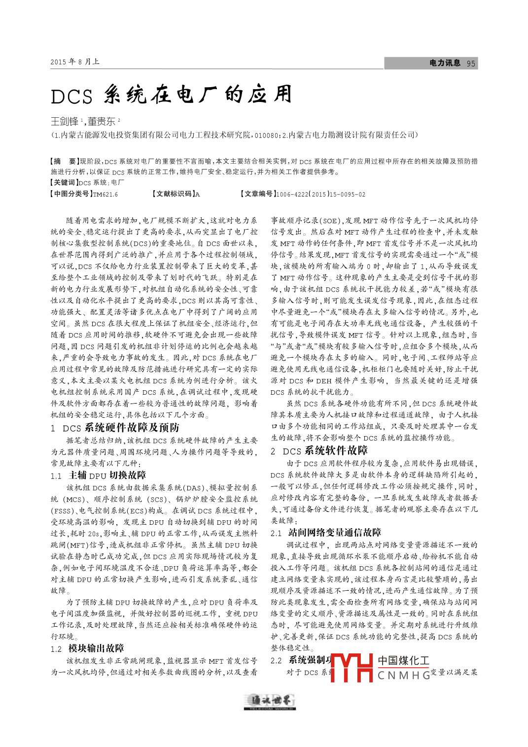2015年8月上電力訊息DCS糸統(tǒng)在電廠的應(yīng)用王劍鋒-,董貴東(1.內(nèi)蒙古能源發(fā)電投資集團(tuán)有限公司電力工程技術(shù)研究院,010080;2.內(nèi)蒙古電力勘測(cè)設(shè)計(jì)院有限責(zé)任公司)要】現(xiàn)階段,DCS系統(tǒng)對(duì)電廠的重要性不言而喻,本文主要結(jié)合相關(guān)實(shí)例,對(duì)Dcs系統(tǒng)在電廠的應(yīng)用過(guò)程中所存在的相關(guān)故障及預(yù)防措行分析,以保證DCs系統(tǒng)的正常工作,維持電廠安全、穩(wěn)定運(yùn)行,并為相關(guān)工作者提供參考?!娟P(guān)鍵詞】Dcs系統(tǒng);電廠【中圖分類(lèi)號(hào)】M621.6【文獻(xiàn)標(biāo)識(shí)碼】A【文章編號(hào)】006-4222015)15-0095-02隨著用電需求的増加,電廠規(guī)模不斷擴(kuò)大,這就對(duì)電力系事故順序記錄(S○E),發(fā)現(xiàn)№T動(dòng)作信號(hào)先于一次風(fēng)機(jī)均停統(tǒng)的安全、穩(wěn)定運(yùn)行提出了更高的要求,從而突顯出了電廠控信號(hào)發(fā)出。然后在對(duì)MFT動(dòng)作產(chǎn)生過(guò)程的檢查中,并未發(fā)觸制核心集散型控制系統(tǒng)(DcS)的重要地位。自DcS面世以來(lái),發(fā)MFT動(dòng)作的任何條件,即MFT首發(fā)信號(hào)并不是一次風(fēng)杌均在世界范圍內(nèi)得到廣泛的推廣,并應(yīng)用于各個(gè)過(guò)程控制領(lǐng)域,停信號(hào)。結(jié)果發(fā)現(xiàn),MFT首發(fā)信號(hào)的實(shí)現(xiàn)需要通過(guò)一個(gè)“或”模可以說(shuō),DCs不僅給電力行業(yè)裝置控制帶來(lái)了巨大的變革,甚塊,該模塊的所有輸入端為0時(shí),卻輸出了1,從而導(dǎo)致誤發(fā)至給整個(gè)工業(yè)領(lǐng)域的控制及帶來(lái)了劃時(shí)代的飛躍。特別是在了MFT動(dòng)作信號(hào)。這種現(xiàn)象的產(chǎn)生主要是受到信號(hào)干擾的影新的電力行業(yè)發(fā)展形勢(shì)下,對(duì)機(jī)組自動(dòng)化系統(tǒng)的安全性、可靠響,由于該機(jī)組DCS系統(tǒng)抗干擾能力較差,若“或”模塊有很性以及自動(dòng)化水平提出了更高的要求,DCS則以其高可靠性、多輸入信號(hào)時(shí),則可能發(fā)生誤發(fā)信號(hào)現(xiàn)象,因此,在組態(tài)過(guò)程功能強(qiáng)大、配置靈活等諸多優(yōu)點(diǎn)在電廠中得到了廣闊的應(yīng)用中盡量避免一個(gè)“或”模塊奪在太多輸入信號(hào)的情況。另外,也空間。雖然DCS在很大程度上保證了機(jī)組安全、經(jīng)濟(jì)運(yùn)行,但有可能是電子間存在大功率無(wú)線電通信設(shè)備,產(chǎn)生較強(qiáng)的干隨著υCS應(yīng)用時(shí)間的推移,軟硬件不可避免會(huì)岀現(xiàn)一些故障擾信號(hào),導(dǎo)致模件誤發(fā)Mη信號(hào)。針對(duì)以上現(xiàn)象,組態(tài)時(shí),當(dāng)問(wèn)題,因DCS問(wèn)題引發(fā)的機(jī)組非計(jì)劃停運(yùn)的比例也會(huì)越來(lái)越“與”或者“或”模塊有較多輸入信號(hào)時(shí),應(yīng)組合多個(gè)模塊,從而來(lái),嚴(yán)重的會(huì)導(dǎo)致電力事故的發(fā)生。因此,對(duì)DCs系統(tǒng)在電廠避免一個(gè)模塊存在太多的輸入。同時(shí),電子間、工程師站等應(yīng)應(yīng)用過(guò)程中常見(jiàn)的故障及防范措施進(jìn)行研究具有一定的實(shí)際避免使用無(wú)線電通信設(shè)備,機(jī)柜粔門(mén)也要隨時(shí)關(guān)好,防止干擾意義,本文主要以某火電機(jī)組DS系統(tǒng)為例進(jìn)行分析。該火源對(duì)DcS和DEH模件產(chǎn)生影響,當(dāng)然最關(guān)鍵的還是増強(qiáng)電杌組控制系統(tǒng)采用國(guó)產(chǎn)DCS系統(tǒng),在調(diào)試過(guò)程中,發(fā)現(xiàn)硬DcS系統(tǒng)的抗干擾能力。件及軟件方面都存在著一些較為普通性的故障問(wèn)題,影響著雖然DCS系統(tǒng)各硬件功能有所不同,但DcS系統(tǒng)硬件故機(jī)組的安全穩(wěn)定運(yùn)行,具體包括以下幾個(gè)方面。障其本質(zhì)主要為人機(jī)接口故障和過(guò)程通道故障,由于人機(jī)接1DcS系統(tǒng)硬件故障及預(yù)防口由多個(gè)功能相同的工作站組成,只要及時(shí)處理其中一臺(tái)發(fā)據(jù)筆者總結(jié)歸納,該機(jī)組DCs系統(tǒng)硬件故障的產(chǎn)生主要生的故障,將不會(huì)影響整個(gè)DCs系統(tǒng)的監(jiān)控操作功能。為元器件質(zhì)量問(wèn)題、周?chē)h(huán)境問(wèn)為操作問(wèn)題等導(dǎo)致的,2DCS系統(tǒng)軟件故障常見(jiàn)故障主要有以下幾種由于DcS應(yīng)用軟件程序較為復(fù)雜,應(yīng)用軟件易出現(xiàn)錯(cuò)誤1.1主輔DPU切換故障DCS系統(tǒng)軟件故障大多是由軟件本身的邏輯缺陷所引起的該機(jī)組υCS系統(tǒng)由敏據(jù)采集系統(tǒng)(υΔs)、模擬量控制系。般可以修正,但任何邏韡修改工作必須按規(guī)定操作,同時(shí),統(tǒng)(MCS)、順序控制系統(tǒng)(S℃sS)、鍋爐爐膛安全監(jiān)控系統(tǒng)應(yīng)對(duì)修改內(nèi)容冇完整的備份,一旦系統(tǒng)發(fā)生故障或者數(shù)據(jù)丟(FSsS、電氣控制系統(tǒng)(ECS)構(gòu)成。在調(diào)試DCS系統(tǒng)過(guò)程中,失,可通過(guò)備份文件進(jìn)行恢復(fù)。據(jù)筆者的觀察主要存在以下幾受環(huán)境高溫的影響,發(fā)現(xiàn)主DU自動(dòng)切換到輔DpU的時(shí)間類(lèi)故障:過(guò)長(zhǎng),耗時(shí)20s,影響主、輔DU的正常工作,從而誤發(fā)主燃料2.1站間網(wǎng)絡(luò)變量