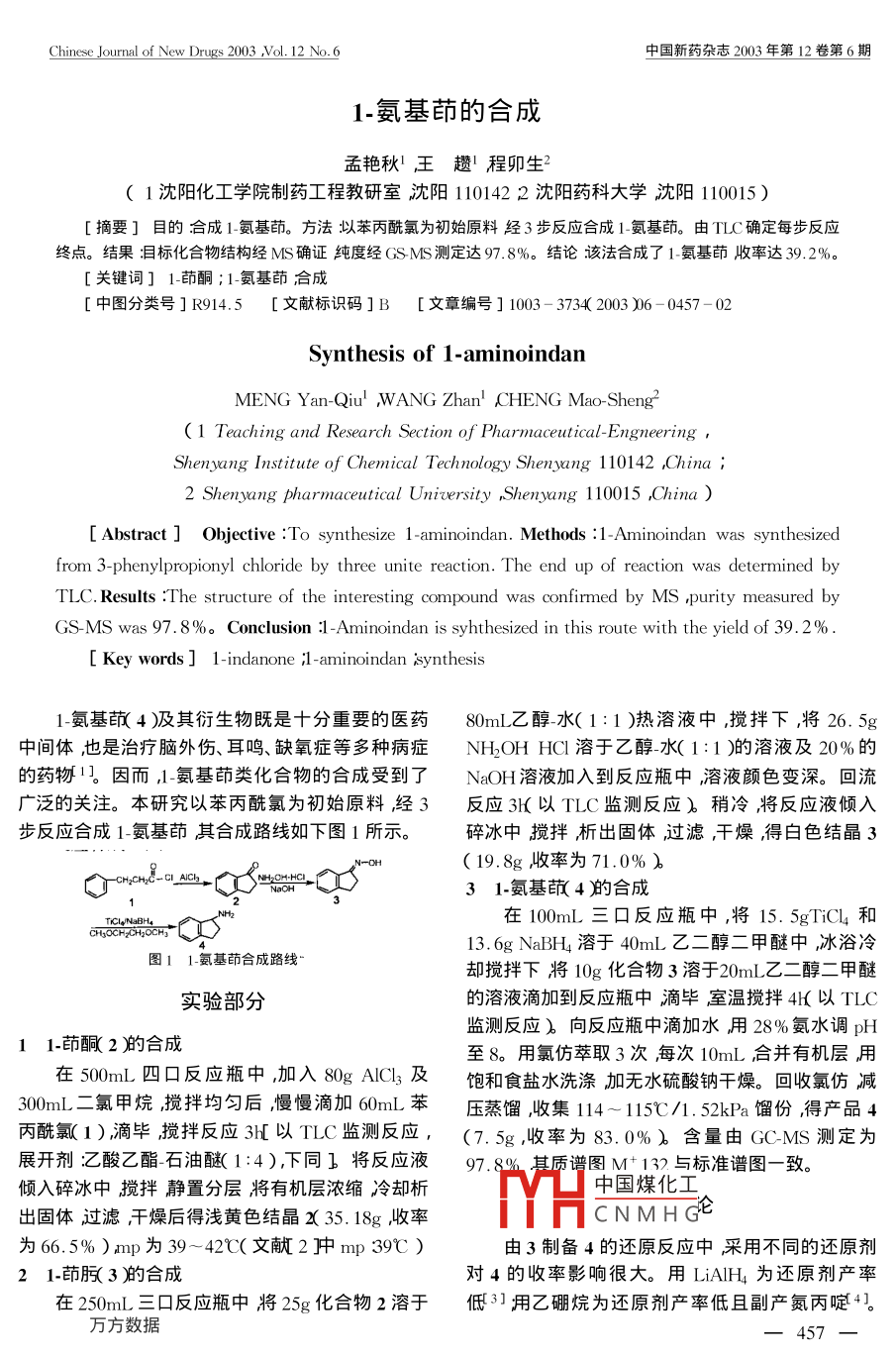 Chinese Journal of New Drugs 2003 ,Vol. 12 No. 6中國(guó)新藥雜志2003年第12卷第6期1-氨基茚的合成孟艷秋l王趲! 程卯生2( 1沈陽化工學(xué)院制藥工程教研室沈陽110142 2沈陽藥科大學(xué)沈陽110015 )[摘要]目的:合成1-氨基茚。方法以苯丙酰氯為初始原料經(jīng)3步反應(yīng)合成1氨基茚。由TLC確定每步反應(yīng).終點(diǎn)。結(jié)果:目標(biāo)化合物結(jié)構(gòu)經(jīng)MS確證純度經(jīng)GS.MS測(cè)定達(dá)97.8%。結(jié)論該法合成了1氨基茚收率達(dá)39. 2%。. [關(guān)鍵詞] 1-茚酮;1-氨基茚合成[中圖分類號(hào)] R914.5 [ 文獻(xiàn)標(biāo)識(shí)碼]B [ 文章編號(hào)] 1003 - 3734( 2003 )06 - 0457- 02Synthesis of 1-aminoindanMENG Yan-Qiu' ,WANG Zhan' CHENG Mao- Sheng2( 1 Teaching and Research Section of Pharmaceutical Engneering ,Shenyang Institute of Chemical Technology Shenyang 110142 ,China ;2 Shenyang pharmaceutical University ,Shenyang 110015 ,China )[ Abstract ] Objective :To synthesize 1-aminoindan. Methods :1-Aminoindan was synthesizedfrom 3-phenylpropionyl chloride by three unite reaction. The end up of reaction was determined byTLC. Results :The structure of the interesting compound was confirmed by MS .purity measured byGS-MS was 97. 8%。Conclusion :1 -Aminoindan is syhthesized in this route with the yield of 39. 2%.[ Key words ] 1-indanone i1-aminoindan isynthesis1-氨基茚(4)及其衍生物既是十分重要的醫(yī)藥80mL乙醇_水( 1 :1 )熱溶液中,攪拌下,將26. 5g中間體,也是治療腦外傷、耳鳴、缺氧癥等多種病癥NH2OH HCl 溶于乙醇-水( 1:1 )的溶液及20%的的藥物。因而,1-氨基茚類化合物的合成受到了NaOH溶液加入到反應(yīng)瓶中溶液顏色變深?;亓鲝V泛的關(guān)注。本研究以苯丙酰氯為初始原料經(jīng)3反應(yīng)3H(以TLC監(jiān)測(cè)反應(yīng))稍冷將反應(yīng)液傾入步反應(yīng)合成1-氨基茚其合成路線如下圖1所示。碎冰中攪拌,析出固體,過濾,干燥,得白色結(jié)晶3N-OH( 19. 8g收率為71.0% )r CH.CH&-CI AICh .NHyOH-HCLNaCH31-氨基茚4的合成TICIyNgBH4在100mL三口反應(yīng)瓶中,將15.5gTiCl4和CHIJOCH2CH.OCH13.6g NaBH4溶于40mL乙二醇二甲醚中,冰浴冷圖11-氨基茚合 成路線“卻攪拌下將10g化合物3溶于20mL乙二醇二甲醚實(shí)驗(yàn)部分的溶液滴加到反應(yīng)瓶中滴畢室溫?cái)嚢?H(以TLC監(jiān)測(cè)反應(yīng))向反應(yīng)瓶中滴加水用28%氨水調(diào)pH11-茚酮( 2 )的合成至8。用氯仿萃取3次每次10mL合并有機(jī)層用在500mL四口反應(yīng)瓶中,加入80g AlCl;及飽和食鹽水洗滌加無水硫酸鈉干燥。回收氯仿減300mL二氯甲烷攪拌均勻后慢慢滴加60mL苯壓蒸餾,收集114~115C/1. 52kPa餾份,得產(chǎn)品4丙酰氯(1 ),滴畢攪拌反應(yīng)3H[以TLC監(jiān)測(cè)反應(yīng)(7.5g,收率為83.0%)含量由GC_MS測(cè)定為展開劑:乙酸乙酯_石油醚( 1:4),下同]將反應(yīng)液97. 8%其質(zhì)譜圖M+ 132與標(biāo)準(zhǔn)譜圖-致。傾入碎冰中攪拌靜置分層將有機(jī)層濃縮冷卻析中國(guó)煤化工出固體過濾干燥后得淺黃色結(jié)晶2( 35. 18g收率MHCNMH為66.5%)mp為39~42C(文獻(xiàn)2中mp39C)由3制備4的還原反應(yīng)中采用不同的還原劑2 1-茚肟( 3 )的合成對(duì)4的收率影響很大。用LiAIH4為還原劑產(chǎn)率在250mL三口反應(yīng)瓶中將25g化合物2溶于低3]用乙硼烷為還原劑產(chǎn)率低且副產(chǎn)氮丙啶4。一457-Chinese Joumal of New Drugs 2003 ,Vol. 12 No.6中國(guó)新藥雜志2003年第12卷第6期本研究選用TiCl4/NaBH4 為還原劑5]經(jīng)工藝條件York Chapman and Hall ,1982. 3303.實(shí)驗(yàn)后產(chǎn)率為83%,3步反應(yīng)總收率達(dá)39.2%。[3] Kotera K ,Miyazaki S ,Takahashi H ret al . Azirdine formation bylithium aluminum hydride reduction of oximes[J ] Tetrahedron ,該法操作簡(jiǎn)單、安全、條件溫和、成本低且產(chǎn)率較高。1968 24 9 )3681 - 3696.[作者簡(jiǎn)介] 孟艷秋( 1963- ),女副教授。主要從事藥物.4] Feuerb H ,Vincent B F Bartlett B s. The reduction of oximes with中間體及新藥研究工作。聯(lián)系電話:( 024 )89383622。diborane ia new synthesis of N-monosubtuted hydroxylamines[J]J Org Chem ,1965 30( 9):2877 - 2880.[參考文獻(xiàn)][5] Shinzo K ,Yasuyuki T Eichi S et al . Reduction of some function-[1 ] Benjamin S Sasson C ,Tipora s et al . Preparation and pharmaco-al groups with titanium( IV )chloride/ sodium borohydride[ J ]logical use of N-acy)-1H-aminoindenes[ P ] wO : 0038673 ,Communication ,1980 (9 ):695 - 697. .2000-07-06.[2] Buckingham J. Dictionary of organic compounds 5th ed M ] New(收稿日期2003-01- 10)消旋甲磺酸帕珠沙星的合成劉宗英魏永剛郭惠元李卓榮(中國(guó)醫(yī)學(xué)科學(xué)院中國(guó)協(xié)和醫(yī)科大學(xué)醫(yī)藥生物技術(shù)研究所北京100050 )[摘要]目的合成消旋甲磺酸帕珠沙星。方法:以市售合成氧氟沙星的中間體9 ,10-二氟-3-甲基-7-氧-2 3-二氫-7H吡啶123-deI1A苯并懲嗪6羧酸乙酯為起始原料經(jīng)過縮合反應(yīng)、水解脫羧、相轉(zhuǎn)移縮環(huán)合、腈基水解和Hofmann降解得目標(biāo)化合物。結(jié)果和結(jié)論經(jīng)H-NMR,MS和旋光活性測(cè)定,證明所得到的產(chǎn)物為消旋甲磺酸帕珠沙星。[關(guān)鍵詞]消旋甲磺酸帕珠沙星合成抗菌藥[中圖分類號(hào)] R914. 5[文獻(xiàn)標(biāo)識(shí)碼]B [文章編號(hào) ] 1003 - 3734( 2003 )06 - 0458 - 03Synthesis of racemic pazufloxacin mesylateLIU Zong-ying ,WEI Yong gang GUO Hui-yuan LI Zhuo-rong( Institute of Medicinal Biotechnology ,Chinese Academy of Medical Sciences ,Peking Union Medical College ,Beijing 100050 ,China )[ Abstract ] Objective :To synthesize racemic pazuf