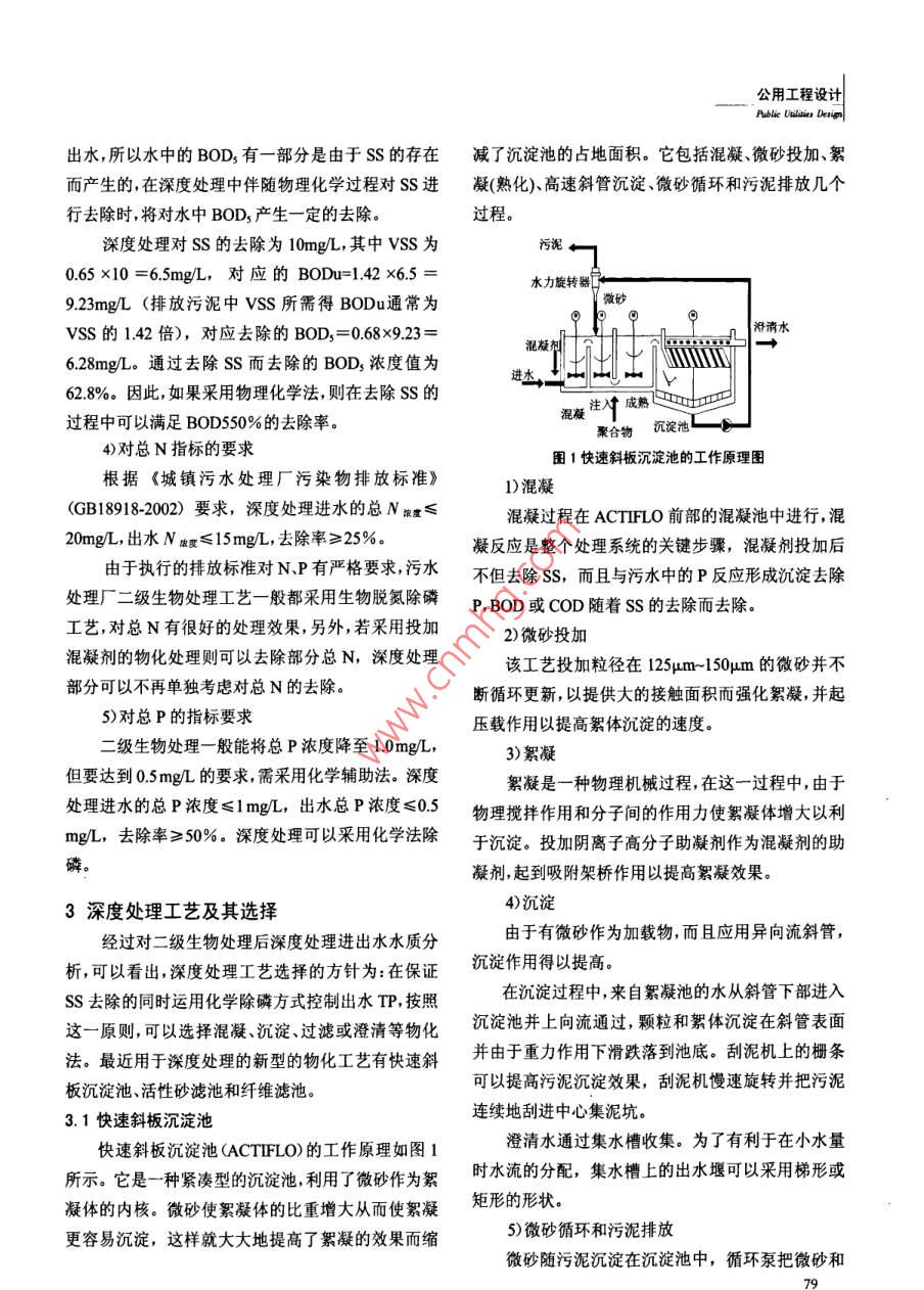 公用工程設(shè)計(jì)【文章編號】1007-9467(2010)08007804城市污水的深度處理工藝■彭勃(廣州市市政工程設(shè)計(jì)研究院,廣州510060)【摘要】分析了城市污水二級生化處理后深度處理的進(jìn)出水污水中的懸浮物,經(jīng)過二級處理后,出水中殘留水質(zhì)特點(diǎn),得到懸澤因體和深度處理的主要去處除對象。的懸浮物以顆粒從1m到1Qm的生物絮凝體和未根據(jù)深度處理去除的對象,探討了適合于城市污水深度處理被凝聚的膠體顆粒為主,這些顆粒大部分都是有機(jī)的三種工藝。通過分析得到,新型的活性砂濾池和纖維濾池是城市污水二級生化處理后深度處理工藝較佳的選擇性的,二級處理出水的BOD5中50%~80%都是來【關(guān)鍵詞】城市污水;深度處理;濾池源于這些顆粒。去除水中的懸浮物,采用的處理技術(shù)【中圖分類號】TU993.1【文獻(xiàn)標(biāo)志碼】B要根據(jù)懸浮物的狀態(tài)和粒徑而定,顆粒粒徑在ψm以上的可以采用混凝、沉淀、過濾工藝予以去除,粒前言徑從幾百A到幾十m的顆粒,采用微濾加以去除城市污水處理廠的二級處理出水由于應(yīng)受納水而粒徑從100A到幾m的顆粒,則應(yīng)采用反滲透體水域功能的要求而執(zhí)行《城鎮(zhèn)污水處理廠污染物等方法進(jìn)行去除。因此,污水處理廠二級處理出水的排放標(biāo)準(zhǔn)》一級A標(biāo)時(shí),必須要對二級處理出水進(jìn)行ss適合采用混凝沉淀過濾工藝去除深度處理。深度處理的方法有很多,但要選擇一種既2)對COD指標(biāo)的要求滿足出水水質(zhì)要求運(yùn)行管理又方便的工藝是工程設(shè)根據(jù)《城鎮(zhèn)污水處理廠污染物排放標(biāo)準(zhǔn)》一級計(jì)面臨的問題。B標(biāo)準(zhǔn),確定深度處理的進(jìn)水COD濃度≤60mgL,2深度處理的進(jìn)出水水質(zhì)及處理方法出水COD濃度≤40mgL,COD去除率≥33.3%進(jìn)出水水質(zhì)是影響處理工藝選擇的重要因素水中的COD由非溶解性COD和溶解性COD因此,必須對進(jìn)出水水質(zhì)進(jìn)行分析,以確定經(jīng)濟(jì)、合兩部分組成,通常非溶解性COD占COD組成總量理、有效的處理工藝。深度處理的進(jìn)水也就是污水廠的大部分,當(dāng)Ss被去除時(shí),絕大部分非溶解性CoD二級生物處理的出水,后者一般要滿足城鎮(zhèn)污水處同時(shí)被去除。而溶解性COD的去除需要采用活性炭理廠污染物排放標(biāo)準(zhǔn)》一級B標(biāo),所以深度處理的進(jìn)吸附、反滲透、(高級)化學(xué)氧化等工藝進(jìn)行去除。水水質(zhì)一般為一級B標(biāo),而出水水質(zhì)要滿足一級A從深度處理的進(jìn)出水的COD濃度指標(biāo)看,深度標(biāo)?,F(xiàn)將各水質(zhì)指標(biāo)進(jìn)行分析處理對COD的去除效率要求不高,通過混凝、沉淀、1)對SS指標(biāo)的要求過濾等常規(guī)工藝,可以達(dá)到25%~35%的處理效率二級處理出水的濃度S要求≤20mgL,所以即可滿足處理要求度處理的進(jìn)水SS濃度為20mg/L,而《城鎮(zhèn)污水處3)對BOD3指標(biāo)的要求理廠污染物排放標(biāo)準(zhǔn)》一級A標(biāo)的SS濃度要求≤10深度處理的進(jìn)水BOD3濃度≤20mgL,出水mgL,因此深度處理的出水Ss濃度≤10mgL,在深BOD,的濃度≤10mgL去除率≥50%度處理中SS去除率需達(dá)到≥50%由于深度處理進(jìn)水為污水處理廠二級生物處理公用工程設(shè)計(jì)Public Utilities Deion出水,所以水中的BOD3有一部分是由于SS的存在減了沉淀池的占地面積。它包括混凝、微砂投加絮而產(chǎn)生的,在深度處理中伴隨物理化學(xué)過程對SS進(jìn)凝(熟化)、高速斜管沉淀、微砂循環(huán)和污泥排放幾個(gè)行去除時(shí),將對水中BOD3產(chǎn)生一定的去除過程。深度處理對SS的去除為10mg,其中Ss為065×10=6.5mgL,對應(yīng)的BODu=142×6.5=水力旋轉(zhuǎn)923mgL(排放污泥中ⅤSS所需得BODu通常為vSS的142倍),對應(yīng)去除的BOD3=068×9,23=滑清水628mgL。通過去除Ss而去除的BOD濃度值為62.8%。因此,如果采用物理化學(xué)法,則在去除SS的注冷成熟過程中可以滿足BOD550%的去除率。聚合物沉淀4)對總N指標(biāo)的要求圖1快速斜板沉淀池的工作原理圖根據(jù)《城鎮(zhèn)污水處理廠污染物排放標(biāo)準(zhǔn)》1)混凝(GB18918-2002)要求,深度處理進(jìn)水的總N液度≤凝過程在 ACTIFLO前部的混凝池中進(jìn)行,混20mgL,出水N度≤15mgL,去除率≥25%凝反應(yīng)是整個(gè)處理系統(tǒng)的關(guān)鍵步驟,混凝劑投加后由于執(zhí)行的排放標(biāo)準(zhǔn)對N、P有嚴(yán)格要求,污水不但去除S,而且與污水中的P反應(yīng)形成沉淀去除處理廠二級生物處理工藝一般都采用生物脫氮除磷P,BOD或COD隨著Ss的去除而去除。工藝,對總N有很好的處理效果,另外,若采用投加2)微砂投加混凝劑的物化處理則可以去除部分總N,深度處理該工藝投加粒徑在125μm-150um的微砂并不部分可以不再單獨(dú)考慮對總N的去除。斷循環(huán)更新,以提供大的接觸面積而強(qiáng)化絮凝,并起5)對總P的指標(biāo)要求壓載作用以提高絮體沉淀的速度。二級生物處理一般能將總P濃度降至1.0mgL3)絮凝但要達(dá)到0.5mgL的要求,需采用化學(xué)輔助法。深度絮凝是一種物理機(jī)械過程在這一過程中,由于處理進(jìn)水的總P濃度≤1mgL,出水總P濃度≤0.5物理攪拌作用和分子間的作用力使絮凝體增大以利mgL,去除率≥50%,深度處理可以采用化學(xué)法除于沉淀。投加陰離子高分子助