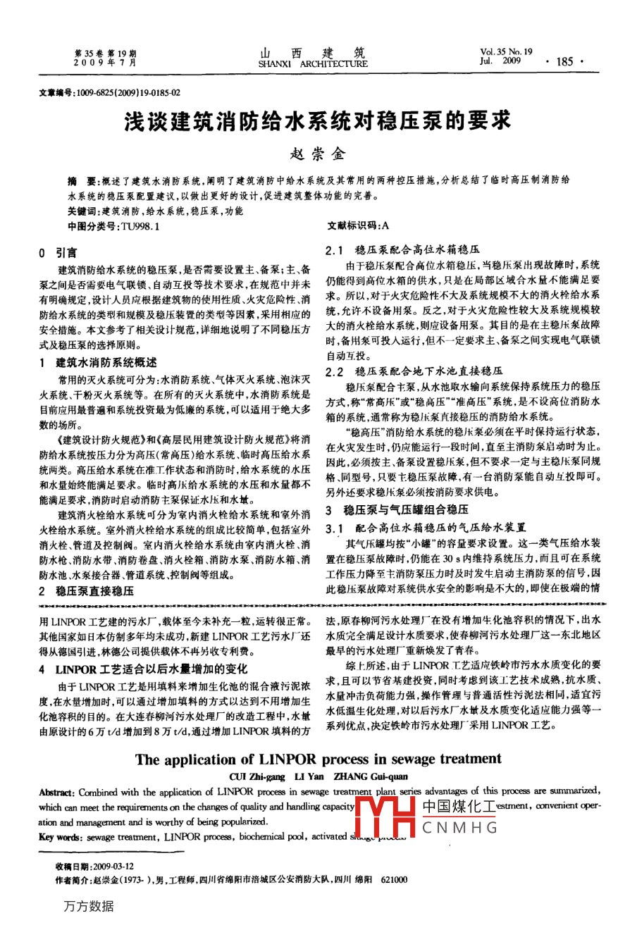 第35卷第19智山西建筑Voal.35 No. 19.●184●SHANXI ARCHITECTUREJul.2009文章編號:1009-68252009)19-0184-02LINPOR工藝在污水處理中的應(yīng)用崔志剛李艷張貴權(quán)摘要:通過 LINPOR工藝在污水處理廠中的應(yīng)用,總結(jié)出該工藝能適應(yīng)污水水質(zhì)變化的要求、可節(jié)省基建投資、操作管理簡便、對以后污水廠水量變化適應(yīng)能力強(qiáng)等一系列優(yōu)點(diǎn),從面進(jìn)一步推廣應(yīng)用。.關(guān)鍵詞:污水處理,LINPOR工藝,生化池,活性污泥法中圖分類號:X703文獻(xiàn)標(biāo)識碼:ALINPOR工藝是德國LINDER公司在污水處理工藝上探索作用的同時存在 反硝化,所以在去除污水中BOD的同時可去除出的.條新路,它的核心是在生化池中加入LINPOR填料,使生部分氪,比較適宜鐵嶺污水處理的要求,該工藝方案取消了普通化池的混合液污泥濃度得到提高,以達(dá)到減小生化池總?cè)莘e的月二級污水廠 的初沉池,不但節(jié)約了基建投資,而且有利于污水處的。這樣不但可以減少工程投資,而且二沉池的污泥更易于沉理,當(dāng)污水廠近期進(jìn)水水質(zhì)濃度低時,由于生化池前未設(shè)初沉池,降,使總出水的水質(zhì)更加有保障。生化池內(nèi)微生物相對可以得到較多的碳源,懸浮物多對形成活性LINPOR工藝在鐵嶺市污水處理廠工程及大連春柳河污水污泥有利,對生化池正常進(jìn)行也是有利的,將來污水廠進(jìn)水水質(zhì)處理廠改造T.程中已經(jīng)應(yīng)用。根據(jù)LINPOR工藝在鐵嶺污水處達(dá)到預(yù)測的濃度,雖未設(shè)初沉池,但由于林泡爾生化池為雙生物理廠中的應(yīng)用,從總體上看,LINPOR工藝具有以下優(yōu)點(diǎn)。群,不但混合液中污泥濃度高,而且載體上附著大量微生物,LIN-1適 應(yīng)污水水質(zhì)變化的要求POR生化池平均生物濃度MLSS=4 700 mg/L,是普通活性污泥法1)原水水質(zhì)。目前由于鐵嶺工業(yè)處在結(jié)構(gòu)調(diào)整階段,城市污生化池污泥濃度MLSS的兩倍,生化池效率要大大超過普通活性水水質(zhì)濃度低,其中:COD= 200 mg/L, BOD3 = 100 mg/L, ss=污泥法生化池,出水水質(zhì)好。將來要求污水廠出水脫氮時,本工藝200 mg/L。工業(yè)結(jié)構(gòu)調(diào)整后,城市污水水質(zhì)濃度將上升,根據(jù)對不需增加生化池容積,只要增加部分林泡爾載體即可以滿足要求。污水水質(zhì)的預(yù)測,確定污水廠設(shè)計水質(zhì):OD= 420 mg/,HO)}= 2節(jié)省基建投資200 mg/L,SS= 230 mg/L。該水質(zhì)屬城市污水廠-中等污染濃度水采用LINPOR活性污泥法,雖然要從德國購進(jìn)LINPOR載體F。(微孔泡沫塑料立方體),但該工藝省去了兩座直徑40 m的輻流2)污水廠出水水質(zhì)。遼寧省環(huán)境保護(hù)局2000年9月5日以式初沉池,LINPOR生化池容積只是普通生化池(A/O法,普通活遼河發(fā)[000]107號文,對遼寧省轄區(qū)內(nèi)城市二級污水處理廠執(zhí)性污泥法 )容積的1/2, 從而節(jié)約了基建投資和征地費(fèi)。該部分投行排放標(biāo)準(zhǔn)做了具體要求:其中00D< 100 mg/.,B0D<30 mg/L,資比較見表1。.Ss<30 mg/L,氨氮小于15 mg/L。這是目前的要求,將來遼河水表1不同處理方法的投資比較域和渤海灣水體富營養(yǎng)化加重,根據(jù)國內(nèi)外經(jīng)驗,一定要求城市LINPOR活性污泥法厭氧一好氧活性污跑法污水在脫出污水中COD,BoD,SS的同時,還要脫出污水中的N,兩座直徑40m的482.00P。針對鐵嶺市污水處理)目前進(jìn)水水質(zhì)污染濃度低,出水只要求達(dá)到普通二級污水) -出水水質(zhì)標(biāo)準(zhǔn)。不久的將米污水廠進(jìn)行LINPOR生化地土建902.00AVO法生化地土建1 70.66622 5s0 m44 265 m水質(zhì)達(dá)到預(yù)測值,并月針對出水水質(zhì)不但要求脫出污水中的林德公司生產(chǎn)的724.00COD,BOD,sS,有機(jī)污染物,還要求脫出污水中N,P的具體情況,載體1810m比方案- -增加占地16畝L 112.00在設(shè)計招標(biāo)中經(jīng)過認(rèn)真方案比選,專家評估確定污水處理工藝選2 364. 66用適合水質(zhì)變化的“LINPOR工藝"。林泡爾工藝(LINPOR)是投料活性污泥法的一種,但它必須由表1可知,采用LINPOR工藝雖然要從德國林德公司引進(jìn)在曝氣池中投加15% ~ 30%德國林德公司生產(chǎn)的微孔泡沫塑料1 810 m'林德載體用去724萬元,但該T藝可以省去初沉池,減立方體,作為活性生物體的載體材料,載體材料是該工藝的關(guān)鍵少生化池池容,減少占地,比AO法節(jié)省投資738.60萬元。部分,且必須符合諸如孔院度.均勻度、顆粒尺寸、吸濕度以及有關(guān)3 LINPOR工藝是技術(shù)成熟的新工藝機(jī)械、化學(xué)和生物穩(wěn)定性的嚴(yán)格要求,才能保證最佳工藝性能,使LINPOR工藝是德國林德公司開發(fā)的新工藝,該法是城市污裝置無故障運(yùn)行,有較長的使用壽命(德國慕尼黑污水廠1984 年水的有 效生物處理工藝,用于城市污水處理已有15年歷史,國外建成,至今運(yùn)行正常,未補(bǔ)充- -粒載體)。該種載體是林德公司專投產(chǎn)40座用于城市污水處理,其中日本3座,韓國5座,我國大利產(chǎn)品。連春柳河污水處理廠改擴(kuò)建工程采用林泡爾工藝,現(xiàn)已投產(chǎn)。前LINPOR工藝,生化池內(nèi)微生物為雙生物群落,部分生物附已敘及 ,該工藝的核心是林泡爾載體(微孔泡沫塑料立方體),對著于載體材料,而其余存在于曝氣池游離的活性污泥中,由于載載體中國煤化工-化學(xué)和生物穩(wěn)定性有很嚴(yán)體上