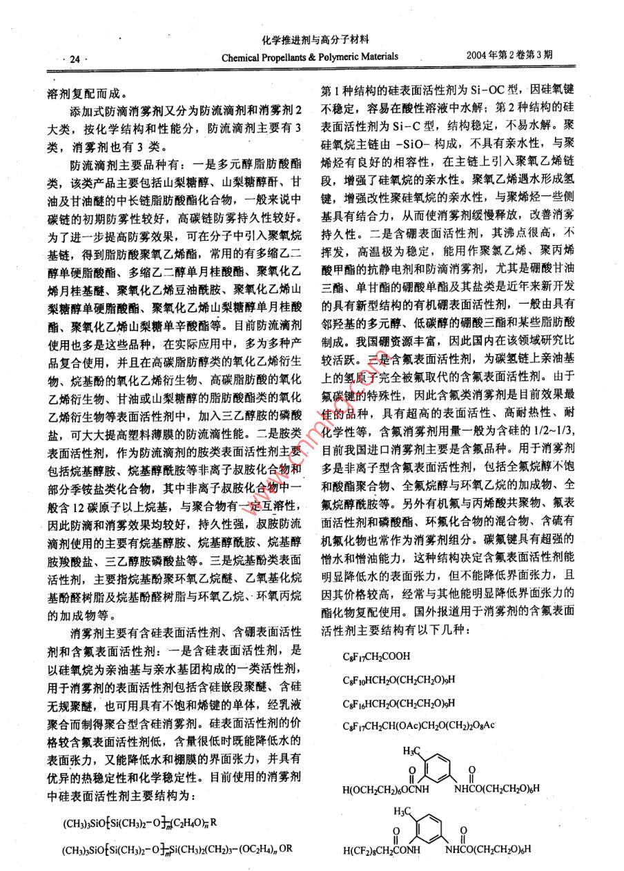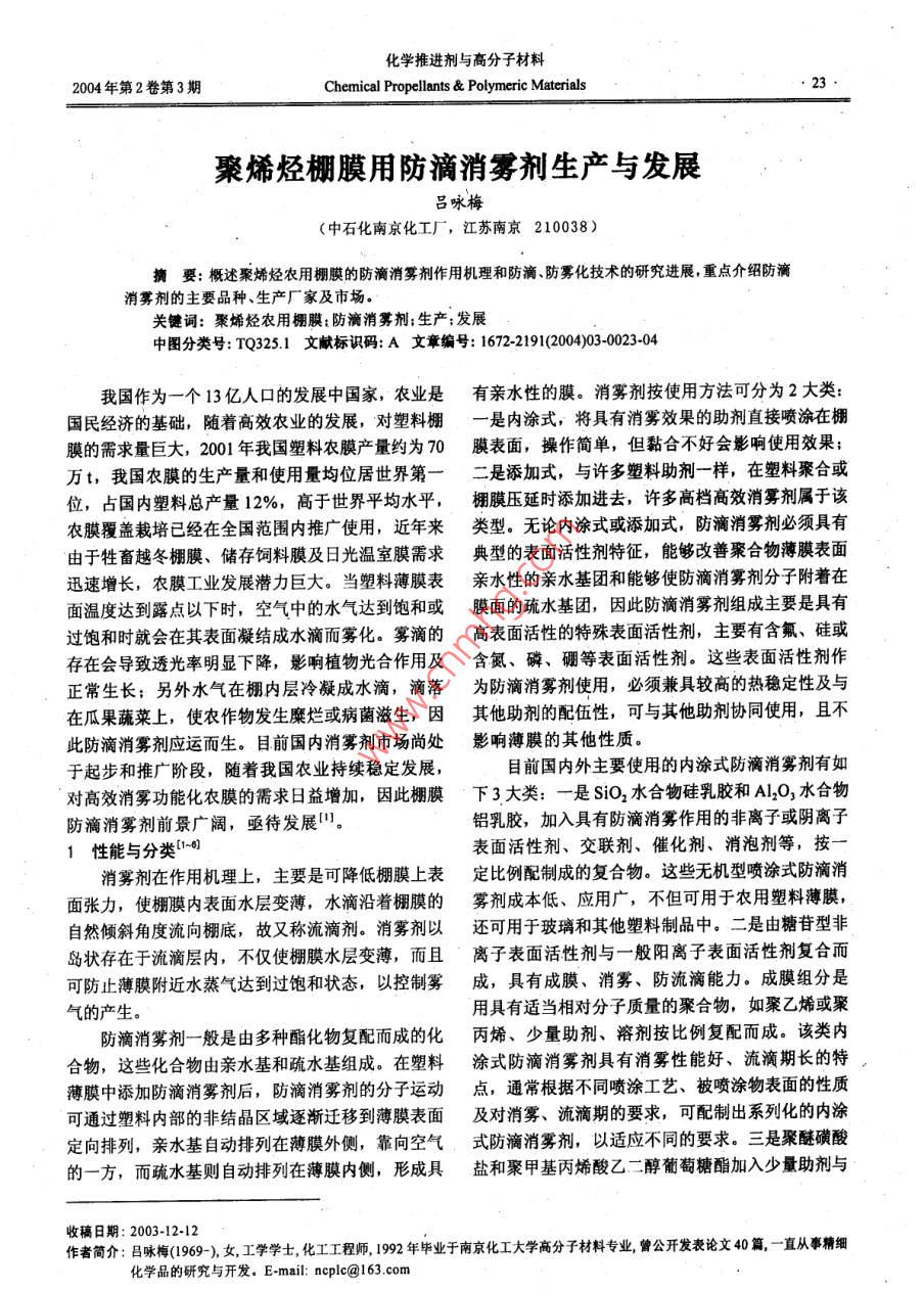 化學(xué)推進(jìn)劑與高分子材料2004年第2卷第3期Chemical Propellants & Polymeric Materials23.聚烯烴棚膜用防滴消霧劑生產(chǎn)與發(fā)展呂詠梅(中石化南京化工廠,江蘇南京210038)摘要: 概述聚烯烴農(nóng)用棚膜的防滴消霧劑作用機(jī)理和防滴、防霧化技術(shù)的研究進(jìn)展,重點(diǎn)介紹防滴消霧劑的主要品種、生產(chǎn)廠家及市場。關(guān)鍵詞:聚烯烴農(nóng)用棚膜:防滴消霧劑;生產(chǎn);發(fā)展中圖分類號(hào): TQ325.1文獻(xiàn)標(biāo)識(shí)碼:A 文章編號(hào): 12-29191004030023.0404我國作為一個(gè)13億人口的發(fā)展中國家,農(nóng)業(yè)是有親水性的膜。消霧劑按使用方法可分為2大類:國民經(jīng)濟(jì)的基礎(chǔ),隨著高效農(nóng)業(yè)的發(fā)展,對塑料棚一是內(nèi)涂式,將具有消霧效果的助劑直接噴涂在棚膜的需求量巨大,2001 年我國塑料農(nóng)膜產(chǎn)量約為70膜表面, 操作簡單,但黏合不好會(huì)影響使用效果:萬t,我國農(nóng)膜的生產(chǎn)量和使用量均位居世界第一二是添加式, 與許多塑料助劑-一樣, 在塑料聚合或位,占國內(nèi)塑料總產(chǎn)量12%,高于世界平均水平,棚膜壓延時(shí)添加進(jìn)去, 許多高檔高效消霧劑屬于該農(nóng)膜覆蓋裁培已經(jīng)在全國范圍內(nèi)推廣使用,近年來類型。無論內(nèi)涂式或添加式,防滴消霧劑必須具有由于牲畜越冬棚膜、儲(chǔ)存飼料膜及日光溫室膜需求典型的表面活性劑特征,能夠改善聚合物薄膜表面迅速增長,農(nóng)膜工業(yè)發(fā)展?jié)摿薮?。?dāng)塑料薄膜表親水性的親水基團(tuán)和能夠使防滴消霧劑分子附著在面溫度達(dá)到露點(diǎn)以下時(shí),空氣中的水氣達(dá)到飽和或膜面的疏水基團(tuán),因此防滴消霧劑組成主要是具有過飽和時(shí)就會(huì)在其表面凝結(jié)成水滴而霧化。霧滴的高表面活性的特殊表面活性劑,主要有含氟、硅或存在會(huì)導(dǎo)致透光率明顯下降,影響植物光合作用及含氨、磷、硼等表面活性劑。這些表面活性劑作正常生長:另外水氣在棚內(nèi)層冷凝成水滴,滴落為防滴消霧劑使用,必須兼具較高的熱穩(wěn)定性及與在瓜果蔬菜上,使農(nóng)作物發(fā)生糜爛或病菌滋生,因其他助劑的配伍性,可與其他助劑協(xié)同使用,且不此防滴消霧劑應(yīng)運(yùn)而生。目前國內(nèi)消霧劑市場尚處影響薄膜的其他性質(zhì)。于起步和推廣階段,隨著我國農(nóng)業(yè)持續(xù)穩(wěn)定發(fā)展,目前國內(nèi)外主要使用的內(nèi)涂式防滴消霧劑有如對高效消霧功能化農(nóng)膜的需求日益增加,因此棚膜下3大類:一是siO2水合物硅乳膠和Al2O3水合物防滴消霧劑前景廣闊,亟待發(fā)展"。鋁乳膠,加入具有防滴消霧作用的非離子或陰離子1性能與分類[I-.)表面活性劑、交聯(lián)劑、催化劑、消泡劑等,按一消霧劑在作用機(jī)理上,主要是可降低棚膜上表定比例配制成的復(fù)合物。這些無機(jī)型噴涂式防滴消面張力,使棚膜內(nèi)表面水層變薄,水滴沿著棚膜的霧劑成本低、應(yīng)用廣,不但可用于農(nóng)用塑料薄膜, .自然傾斜角度流向棚底,故又稱流滴劑。 消霧劑以還可用于玻璃和其他 塑料制品中。二是由糖苷型非島狀存在于流滴層內(nèi),不僅使棚膜水層變薄,而且離子表面活性劑與一般陽離子表面活性劑復(fù)合而可防止薄膜附近水蒸氣達(dá)到過飽和狀態(tài),以控制霧成,具有成膜、消霧、防流滴能力。成膜組分是氣的產(chǎn)生。用具有適當(dāng)相對分子質(zhì)量的聚合物,如聚乙烯或聚防滴消霧劑一般是由多種酯化物復(fù)配而成的化丙烯、少量助劑、溶劑按比例復(fù)配而成。該類內(nèi)合物,這些化合物由親水基和疏水基組成。在塑料涂式防 滴消霧劑具有消霧性能好、流滴期長的特薄膜中添加防滴消霧劑后,防滴消霧劑的分子運(yùn)動(dòng)點(diǎn),通常根據(jù)不同噴涂工藝、被噴涂物表面的性質(zhì)可通過塑料內(nèi)部的非結(jié)晶區(qū)域逐漸遷移到薄膜表面及對消霧、流滴期的要求,可配制出系列化的內(nèi)涂定向排列,親水基自動(dòng)排列在薄膜外側(cè),靠向空氣式防滴消霧劑,以適應(yīng)不同的要求。三是聚醚磺酸的一方,而疏水基則自動(dòng)排列在薄膜內(nèi)側(cè),形成具鹽和聚甲 基丙烯酸乙二醇葡萄糖酯加入少量助劑與收稿日期: 2003-12-12作者簡介:呂詠梅(1969-),女,工學(xué)學(xué)士,化工I程師,1992年畢業(yè)于南京化工大學(xué)高分子材料專業(yè),曾公開發(fā)表論文40篇, -直從事精細(xì)化學(xué)品的研究與開發(fā)。E-mail: ncplc@163 com化學(xué)推進(jìn)劑與高分子材料●24Chemical Propellants & Polymeric Materials2004年第2卷第3期溶劑復(fù)配而成。第1種結(jié)構(gòu)的硅表面活性劑為Si-OC型,因硅氧鍵添加式防滴消霧劑又分為防流滴劑和消霧劑2不穩(wěn)定,容易在酸性溶液中水解;第2種結(jié)構(gòu)的硅大類,按化學(xué)結(jié)構(gòu)和性能分,防流滴劑主要有3表面活性劑為 Si-C型,結(jié)構(gòu)穩(wěn)定,不易水解。聚類,消霧劑也有3類。硅氧烷主鏈由-Si0-構(gòu)成,不具有親水性,與聚防流滴劑主要品種有:一是多元醇脂肪酸酯烯烴有 良好的相容性,在主鏈上引入聚氧乙烯鏈類,該類產(chǎn)品主要包括山梨糖醇、山梨糖醇酐、甘段,增強(qiáng)了硅氧烷的親水性。聚氧乙烯遇水形成氫油及甘油醚的中長鏈脂肪酸酯化合物,一