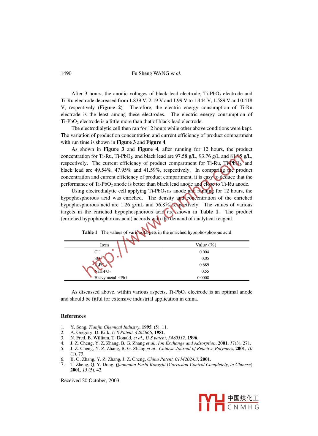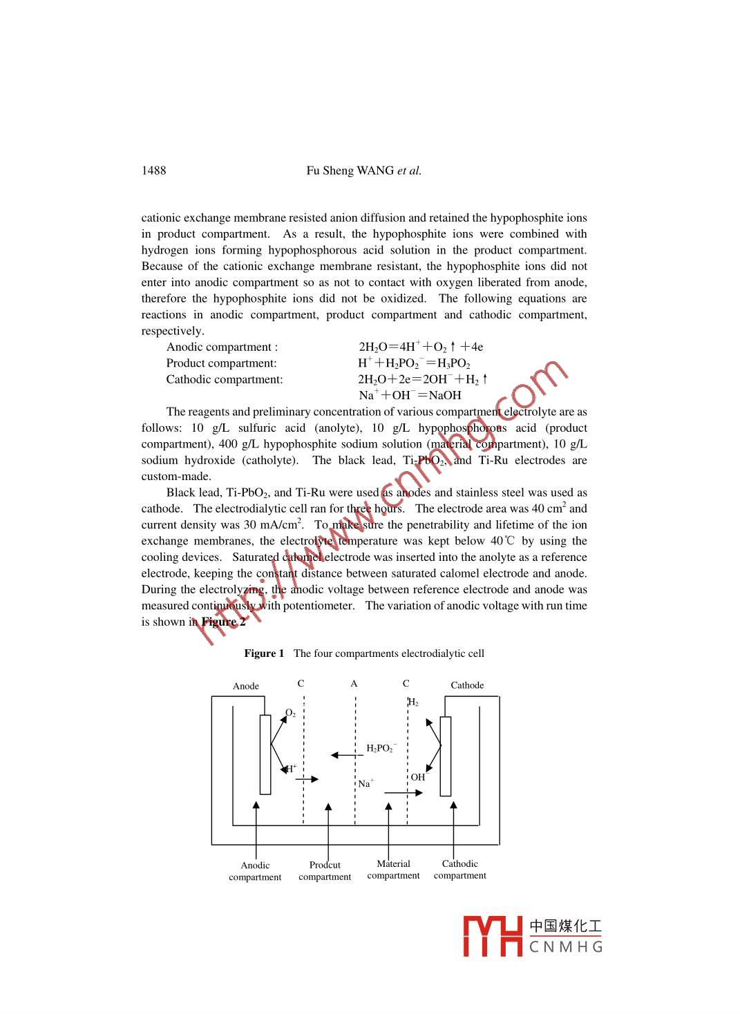 Chinese Chemical Letters Vol. 15, No.12, pp 1487- 1490, 20041487http://www.imm.ac.cn/journal/ccl.htmlSelection of Anodic Material Used in Electrolytic Process forProducing Hypophosphorous AcidFu Sheng W ANG*, Bing Kui SONG, Xiao Li HAN, Bao Gui ZHANGCollege of Environmental Science & Engineering, Nankai University, Tianjin 300071Abstract: Black lead, Ti-Ru and Ti- PbO2 were used as anode and stainless steel was used as cathode.The electrolytic process of producing hypophosphorous acid with four-compartment electrodialyticcell was studied. The comparison of some factors, such as anodic voltage, product concentrationand current efficiency, of black lead, Ti-Ru, and Ti-PbO2 electrodes was conducted. As a result, theTi-PbO2 elctrode is the optimal anode material used, it can be in electrolytic process for producinghypophosphorous acid.Keywords: Hypophosphorous acid, electrolysis, anodic material.There are some references in abroad and in China. Sodium hypophosphite was used asraw material to produce hypophosphorous acid by electrolysis 15. According to thepatents and literatures reported, Ti-Ru electrode and black lead electrode have been usedas anode in electrolytic process for producing hypophosphorous acid. Ti-Ru electrodecannot be applied widely in industry due to high cost and scarce resource of ruthenium inChina. Although black lead anode is much cheaper, the application of black lead anode islimited because of following shortcomings: short lifetime, severely environmentalpollution, and affecting the permeated capability of membrane. Therefore, it is veryimportant to search new anodic material used for electrolytic process of producinghypophosphorous acid. Based upon correlative information', Ti- PbO2 electrode, cheaperthan Ti-Ru electrode, was selected as the anode. In this paper, the performances of blacklead electrode, Ti PbO2 electrode and Ti-Ru electrode were compared and discussed.The experimental apparatus is a four-compartment electrodialytic cell shown inFigure 1.When a direct current flowed through the electrodialytic cell, the water wasdecomposed, and generated hydrogen ions in anodic compartment. The hydrogen ionsmembrane (C) nder the action of electric field force. The anionic exchange membrane (A)isted cation diffusion and retained the hydrogen ions in product compartment. Thematerial compartment started with a concentrated solution of sodium hypophosphite.The hypophosphite ions transferred through anionic exchange membrane from materialcompartment to product compartment under the action of electric field force. The"E-mail: fswang3418@ sohu.com中國(guó)煤化工MHCNMH G.1488Fu Sheng WANG et al.cationic exchange membrane resisted anion diffusion and retained the hypophosphite ionsin product compartment. As a result, the hypophosphite ions were combined withhydrogen ions forming hypophosphorous acid solution in the product compartment.Because of the cationic exchange membrane resistant, the hypophosphite ions did notenter into anodic compartment so as not to contact with oxygen liberated from anode,therefore the hypophosphite ions did not be oxidized. The following equations arereactions in anodic compartment, product compartment and cathodic compartment,respectively.Anodic compartment :2H2O=4H++O2↑+4eProduct compartment:H++ H2PO2- =H3PO2Cathodic compartment:2H2O+ 2e=2OH +H21Na*+OH = NaOHThe reagents and preliminary concentration of various compartment electrolyte are asfollows: 10 g/L sulfuric acid (anolyte), 10 g/L hypophosphorous acid (productcompartment), 400 g/L hypophosphite sodium solution (material compartment), 10 g/Lsodium hydroxide (catholyte). The black lead, Ti-PbO2, and Ti-Ru electrodes arecustom-made.Black lead, Ti-PbO2, and Ti-Ru were used as anodes and stainless steel was used ascathode. The electrodialytic cell ran for three hours. The electrode area was 40 cm2 andcurrent density was 30 mA/cm'. To make sure the penetrability and lifetime of the ionexchange membranes, the electrolyte temperature was kept below 40°C by using thecooling devices. Saturated calomel electrode was inserted into the anolyte as a referenceelectrode, keeping the constant distance between saturated calomel electrode and anode.During the electrolyzing, the anodic voltage between reference electrode and anode wasmeasured continuously with potentiometer. The variation of anodic voltage with run timeis shown in Figure 2Figure 1 The four compartments electrodialytic cellAnodeCCathode| OHAnodicProdcutMaterialCathodiccompartment compartment compartment compartment中國(guó)煤化工MHCNMH G.Selection of Anodic Material Used in Electrolytic Process1489Figure 2 Variation of anodic voltage with run time◆black lead anode+Ti PbO2 anode-▲Ti-Ru anodeI 0.5run time (hFigure 3 Variation of product (hypophosphorous acid) concentration with run time1208310086(- 1 Ti PbO2 anode4士-Ti-Ru anodeFigure 4 Variation of current efficiency of product compartment with run time80%E 60%” 509◆+ FTi PbO2 anode5 20%; 10%)%621C12run time (H中國(guó)煤化工MHCNMH G.1490Fu Sheng WANG et al.After 3 hours, the anodic voltages of black lead electrode, Ti-PbO2 electrode andTi-Ru electrode decreased from 1.839V, 2.19V and 1.99 V to 1.444 V, 1.589 V and 0.418V, respectively (Figure 2). Therefore, the electric energy consumption of Ti-Ruelectrode is the least among these electrodes. The electric energy consumption ofTi-PbO2 electrode is a lttle more than that of black lead electrode.The electrodialytic cell then ran for 12 hours while other above conditions were kept.The variation of production concentration and current efficiency of product compartmentwith run time is shown in Figure 3 and Figure 4.As shown in Figure 3 and Figure 4, after running for 12 hours, the productconcentration for Ti-Ru, Ti-PbO2, and black lead are 97.58 g/L, 93.76 g/L and 81.95 g/L,respectively. The current efficiency of product compartment for Ti-Ru, Ti-PbO2, andblack lead are 49.54%, 47.95% and 41 59%, respectively. In compari