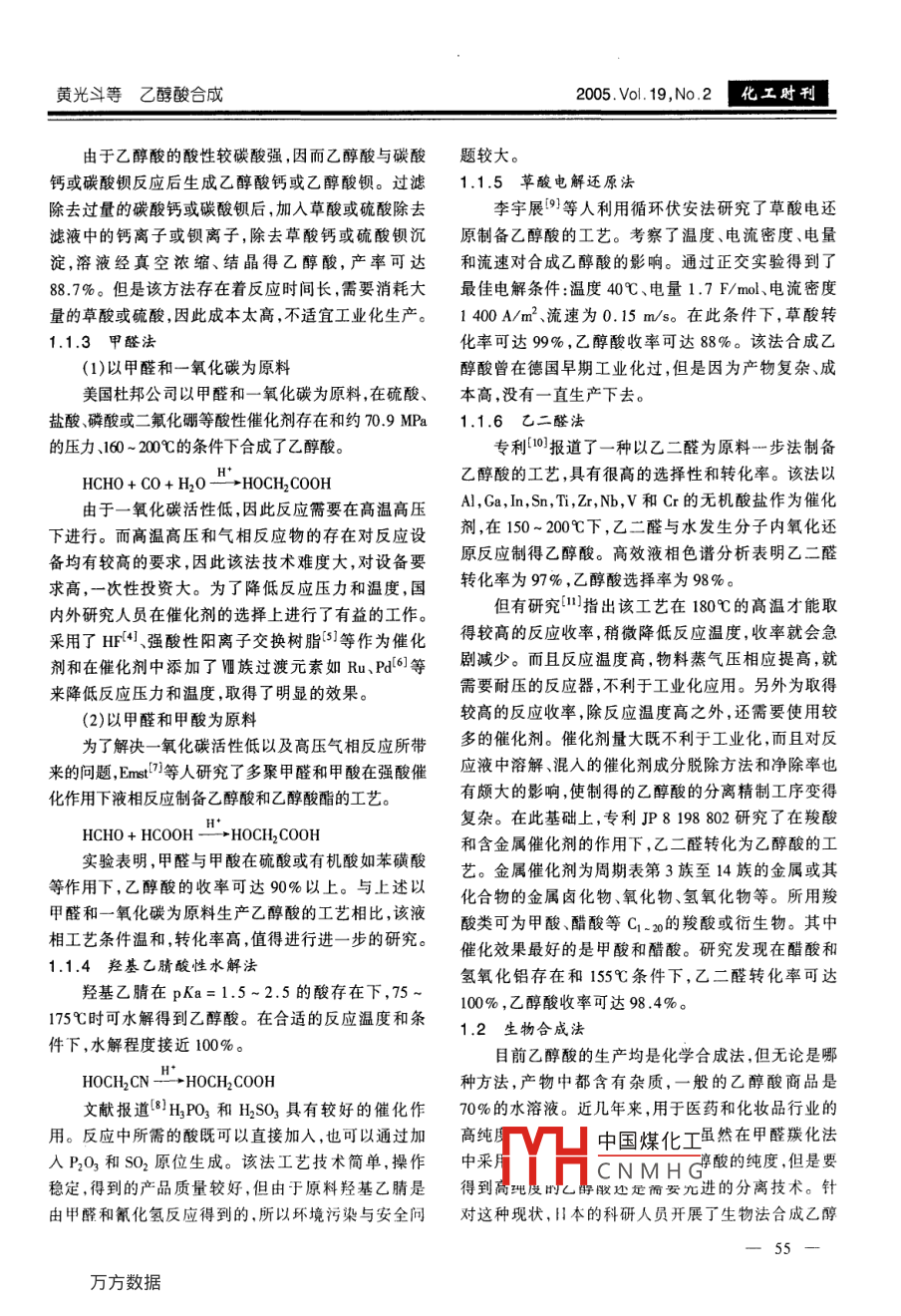 第19卷第2期化工時(shí)刊Vol. 19, No.22005年2月Chemical Industry TimesFeb.2. 2005論文綜述Overview of Thesises乙醇酸合成黃光斗張智胡兵龍化云(湖北工業(yè)大學(xué)化學(xué)與環(huán)境工程學(xué)院,湖北武漢430068)摘要乙醇酸是一種重要的精細(xì)化工中間體,日益廣泛地應(yīng)用于醫(yī)藥、日化和紡織等行業(yè)。本文綜述了乙醇酸合成現(xiàn)狀及研究進(jìn)展,闡述了各合成工藝的優(yōu)缺點(diǎn),并對(duì)其開發(fā)前景進(jìn)行了展望。關(guān)鍵詞乙醇酸合成研究進(jìn)展Preparation of Glycolic AcidHuang GuangdouZhang ZhiHu Bing Long Huayun(College of Chemical and Environmental Engineering, Hubei University of Technology , Hubei Wuhan 430068)Abstract As an important fine chemical intermediate ,glycolic acid can be widely used in medicine , daily chemicaland textile industry . Present status of synthesis and research propess of glycolic acid are reviewed . The advantages and disad-vantages of these synthesis methods are discussed . And its developing prospect is also predicted.Key words glycolic acid preparation research propgress離出乙醇酸的丙酮溶液,進(jìn)行精餾,先常壓精餾出丙酮,1合成方法后減壓精餾得高純度的乙醇酸[。反應(yīng)如下:1.1 化學(xué)合成法CICH2COOH + 2NaOH -- HOCH2COONa+ NaCl +1.1.1 甘氨酸的亞硝酸氧化法H20HOCH2COONa + HCI一→ HOCH2COOH + NaClH2NCH2C0OH HOCH2COOH1848年研究人員通過用亞硝酸處理甘氨酸,首研究[3]發(fā)現(xiàn),溫度對(duì)該法合成乙醇酸有較大影次得到了乙醇酸,并于1851年確定了其結(jié)構(gòu)。但是.響。溫度低于70C,水解反應(yīng)緩慢、產(chǎn)物含量低;溫由于甘氨酸要通過其他途徑合成,反應(yīng)中還要消耗大度高于90C ,則生成的乙醇酸易轉(zhuǎn)化成交酯、酸酐及.量的亞硝酸并且氧化產(chǎn)物復(fù)雜,因此該法并不是合成醚類物質(zhì)。在最佳工藝條件下實(shí)驗(yàn),乙醇酸收率可達(dá)95%以上,產(chǎn)品質(zhì)量分?jǐn)?shù)達(dá)到98%以上[2]。乙醇酸的最佳方法川。(2)氯乙酸在碳酸鈣或碳酸鋇下水解法1.1.2 氯乙酸法使用酸性催化劑,在一定的壓力下,用水或水蒸(1)氯乙酸堿性條件下水解法在堿性條件下,氣乙酸中的氯原子很容易受到氫氧氣水解也能從一氯乙酸制得乙醇酸。酸催化過程中根離子的進(jìn)攻而被取代生成乙醇酸。反應(yīng)結(jié)束加入鹽生成的氯化氫通過蒸餾除去。酸酸化,蒸去水分,過濾除去氣化鈉晶體,加入丙酮后分CI中國煤化工ocH,cooH+ HalYHCNMHG收稿日期:2004-10- 26作者簡介:黃光斗(1945- ).男.教授.主要從事精細(xì)化工方面的教學(xué)與j科研.- 54-黃光斗等乙醇酸合成2005. Vol.19,No.2化 工時(shí)刊由于乙醇酸的酸性較碳酸強(qiáng),因而乙醇酸與碳酸題較大。鈣或碳酸鋇反應(yīng)后生成乙醇酸鈣或乙醇酸鋇。過濾1.1.5 草酸電解還原法.除去過量的碳酸鈣或碳酸鋇后,加入草酸或硫酸除去李宇展9}等人利用循環(huán)伏安法研究了草酸電還濾液中的鈣離子或鋇離子,除去草酸鈣或硫酸鋇沉原制備乙醇酸的工藝??疾炝藴囟取㈦娏髅芏?、電量.淀,溶液經(jīng)真空濃縮、結(jié)晶得乙醇酸,產(chǎn)率可達(dá)和流速對(duì)合 成乙醇酸的影響。通過正交實(shí)驗(yàn)得到了88.7%。但是該方法存在著反應(yīng)時(shí)間長,需要消耗大.最佳電解條件:溫度40C、電量1.7 F/mol、 電流密度量的草酸或硫酸,因此成本太高,不適宜工業(yè)化生產(chǎn)。1 400 A/m2、流速為0.15 m/s。在此條件下,草酸轉(zhuǎn)1.1.3 甲醛法化率可達(dá)99%,乙醇酸收率可達(dá)88%。該法合成乙(1)以甲醛和一氧化碳為原料醇酸曾在德國早期工業(yè)化過,但是因?yàn)楫a(chǎn)物復(fù)雜、成美國杜邦公司以甲醛和一氧化碳為原料,在硫酸、本高,沒有一直生產(chǎn)下去。鹽酸磷酸或二氟化硼等酸性催化劑存在和約70.9 MPa 1.1.6 乙二醛法 :的壓力、160 ~ 200C的條件下合成了乙醇酸。專利10]報(bào)道了一-種以乙二醛為原料-步法制備HCHO+ co+ H2O旦HOCHCOOH乙醇酸的工藝,具有很高的選擇性和轉(zhuǎn)化率。該法以由于一氧化碳活性低,因此反應(yīng)需要在高溫高壓Al,Ga,In,Sn,Ti,Zr,Nb,V和Cr的無機(jī)酸鹽作為催化下進(jìn)行。而高溫高壓和氣相反應(yīng)物的存在對(duì)反應(yīng)設(shè)劑,在150~ 200心下,乙二醛與水發(fā)生分子內(nèi)氧化還備均有較高的要求,因此該法技術(shù)難度大,對(duì)設(shè)備要原反應(yīng)制得乙醇酸。高效液相色譜分析表明乙二醛.求高,一次性投資大。為了降低反應(yīng)壓力和溫度,國轉(zhuǎn)化率為97% ,乙醇酸選擇率為98%。內(nèi)外研究人員在催化劑的選擇上進(jìn)行了有益的工作。但有研究[川指出該工藝在180C的高溫才能取采用了HF[4] 強(qiáng)酸性陽離子交換樹脂[5]等作為催化得較高的反應(yīng)收率,稍微降低反應(yīng)溫度,收率就會(huì)急劑和在催化劑中添加了VW 族過渡元素如Ru、Pd[6]等劇減少。而且反應(yīng)溫度高,物料蒸氣壓相應(yīng)提高,就.來降低反應(yīng)壓力和溫度,取得了明顯的效果。需要耐壓的反應(yīng)器,不利于工業(yè)化應(yīng)用。另外為取得較高的反應(yīng)收率,除反應(yīng)溫度高之外,還需要使用較(2)以甲醛和甲酸為原料為了解決一氧化碳活性低以及高壓氣相反應(yīng)所帶多的催化劑。催化劑量大既不利于工業(yè)化,而且對(duì)反來的問題,Emst]等人研究了多聚甲醛和甲酸在強(qiáng)酸催應(yīng)液中溶解、混人的催化劑成分脫除方
