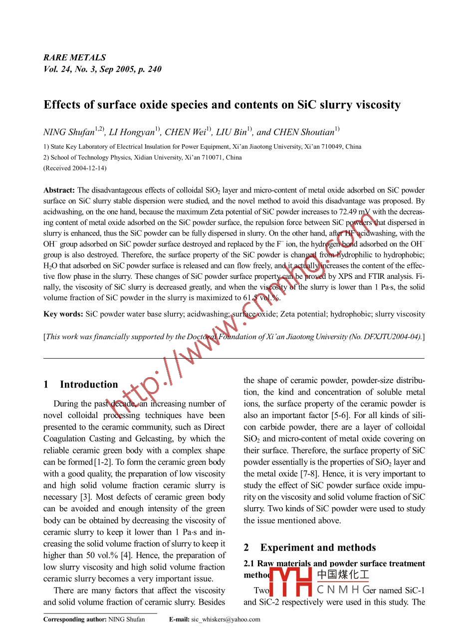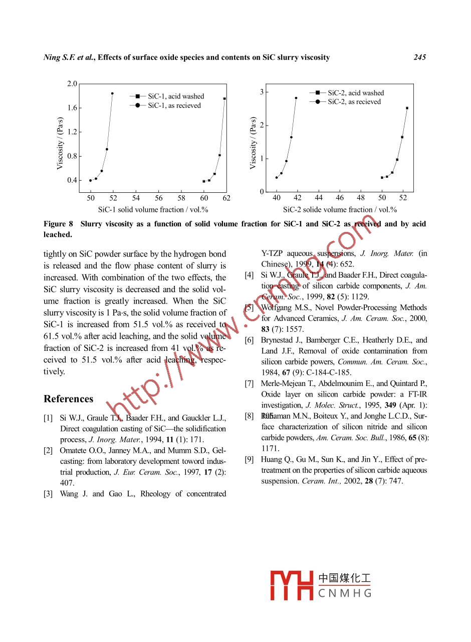 RARE METALSVol. 24, No.3, Sep 2005, p.240Effects of surface oxide species and contents on SiC slurry viscosityNING Shufan'2), LI Hongyan", CHEN Wei"), LIU Bin), and CHEN Shoutian)1) State Key Laboratory of Electrical Insulation for Power Equipment, Xi an Jiaotong University, Xi'an 710049, China2) School of Technology Physics, Xidian University, Xi1 an 710071, China(Received 2004-12-14)Abstract: The disadvantageous effects of colloidal SiO2 layer and micro-content of metal oxide adsorbed on SiC powdersurface on SiC slurry stable dispersion were studied, and the novel method to avoid this disadvantage was proposed. Byacidwashing, on the one hand, because the maximum Zeta potential of SiC powder increases to 72.49 mV with the decreas-ing content of metal oxide adsorbed on the SiC powder surface, the repulsion force between SiC powders that dispersed inslurry is enhanced, thus the SiC powder can be fully dispersed in slurry. On the other hand, after HF acidwashing, with theOH group adsorbed on SiC powder surface destroyed and replaced by the F ion, the hydrogen bond adsorbed on the OHgroup is also destroyed. Therefore, the surface property of the SiC powder is changed from hydrophilic to hydrophobic; .H2O that adsorbed on SiC powder surface is released and can flow freely, and it actually increases the content of the effec-tive flow phase in the slurry. These changes of SiC powder surface property can be proved by XPS and FTIR analysis. Fi-nally, the viscosity of SiC slurry is decreased greatly, and when the viscosity of the slurry is lower than 1 Pas, the solidvolume fraction of SiC powder in the slurry is maximized to 61.5 vol.%.Key words: SiC powder water base slurry; acidwashing; surface oxide; Zeta potential; hydrophobic; slury viscosity[This work was financially supported by the Doctoral Foundation ofXi 'an Jiaotong University (No. DFXJTU2004-04).]1 Introductionthe shape of ceramic powder, powder-size distribu-tion, the kind and concentration of soluble metalDuring the past decade, an increasing number ofions, the surface property of the ceramic powder isnovel colloidal processing techniques have beenalso an important factor [5-6]. For all kinds of sili-presented to the ceramic community, such as Directcon carbide powder, there are a layer of colloidalCoagulation Casting and Gelcasting, by which theSiO2 and micro-content of metal oxide covering onreliable ceramic green body with a complex shapetheir surface. Therefore, the surface property of SiCcan be formed[1-2]. To form the ceramic green bodypowder essentially is the properties of SiO2 layer andwith a good quality, the preparation of low viscositythe metal oxide [7-8]. Hence, it is very important toand high solid volume fraction ceramic slurry isstudy the effect of SiC powder surface oxide impu-necessary [3]. Most defects of ceramic green bodyrity on the viscosity and solid volume fraction of SiCcan be avoided and enough intensity of the greenslurry. Two kinds of SiC powder were used to studybody can be obtained by decreasing the viscosity ofthe issue mentioned above.ceramic slurry to keep it lower than 1 Pars and in-creasing the solid volume fraction of slurry to keep itExperiment and methodshigher than 50 vol.% [4]. Hence, the preparation oflow slurry viscosity and high solid volume fraction2.1 Raw materials and powder surface treatmentmethod中國煤化工ceramic slurry becomes a very important issue.There are many factors that affect the viscosityTwo|YH.CNMHGernamedSiC-1and solid volume fraction of ceramic slurry. Besidesand SiC-2 respectively were used in this study. TheCorresponding author: NING ShufanE-mail: sic_ whiskers@yahoo.comNing S.E et al, Efects of surface oxide species and contents on SiC slurry viscosity241average diameter of either kind of the powder wastable 1. There were only 0.2735 wt.% of SiO2 on the0.8 um.surface of SiC-1 powder and 0.1594 wt.% on SiC-2The SiO2 layer and the metal oxide adsorbed onafter acid leaching. Compared with the samples be-SiC powder surface were removed by acid leachingfore acid leaching, the surface colloidal SiO2 con-according to the following chemical equation:tents of SiC-1 and SiC-2 decreased 85.9% andSiO2 + 4HF←→SiF4+ 2H2O(1)96.2%, respectively. The Zeta potentials of SiC-1The process detail is as follows: 120 g SiC pow-and SiC-2 before and after acid leaching are shownder and 300 mL 10% HF solution were placed into ain figures 1 and 2. Before acid leaching, the IEP500 mL plastic beaker, strred for 24 h, and then(isoelectric point) of the SiC powder was within theleached with ditilledl water until the pH value of thebound ofpH= 2-4. After acid leaching, the IEP ofleaching water reached 7-8.Table 1 Contents of SiO2 on SiC powder surface be-fore and after acid leaching2.2 Experimental methodsSiO2 contents / wt.%The Zeta potential of SiC powder was measuredSampleBefore acid leachingAfter acid leachingwith a Zeta potential instrument (ModelSiC-11.94040.2735ZETA-SIZER4, MALVEN, England). All infraredSiC-24. 18050.1594spectra of hydroxyl (-OH) group, hydrogen bondgroup, and Si- OH group absorbed on SiC powder■SiC-1, before acid leachingsurface were measured with an F TIR spectropho-40-SiC-1, after acid leachingtometer (Model IRPrestige-21 FTIR-8400S, SHI-MADZU Corporation, KYOTO Japan). The XPSspectra ofSi- F and Si- O bonds of SiC powder sur-face were measured with a XPS instrument (Model-20ESCALABMK-II, VG SCIENTIFIC LTD. England).-40-The contents of SiC powder surface metals were-60measured by a plane grating spectrograph made inBeijing (model: WPG 100), accorded with atomic-80emission spectrometry. The slury viscosity was261012measured through the following steps: (1) 100 g SiCpHpowder was mixed with distilled water until theFigure 1 Zeta potential as a function of pH for SiC-1slurry viscosity was lower than 500 mPas, and thebefore and after acid leaching.pH value of the mixture was adjusted to 10. Then thequantity of distilled water that had been used was ,■siC-2, before a