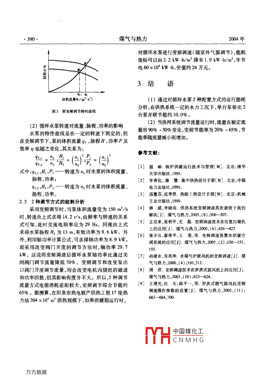 第24卷第7期煤氣與熱力Vol. 24 No. 72004年7月Gas heatJu.2004文章編號:1000-4416(2004)07-0388-03循環(huán)水泵的配置及變頻調(diào)速的能耗分析武文杰,黃普(陽泉市熱力公司,山西陽泉045000)摘要:對城市供熱系統(tǒng)中循環(huán)水泵的配置及變頻調(diào)速進行了介紹,分析了其節(jié)能效果。關(guān)鍵詞:供熱系統(tǒng);循環(huán)水泵;變頻調(diào)節(jié);節(jié)能中圖分類號:TU995文獻標識碼:BAnalysis on Energy Saving for Configuration and Variable FrequencyAdjusting Speed of Water Circulation PumpWU Wen-jie, HUANG PuYangquan Heating Company, Yangquan 045000, China)Abstract: The configuration and variable frequency adjusting speed of water circulation pump in cityheat-supply system are introduced, and the effects of energy savingKey words: heat-supply system; water circulation pump; variable frequency adjusting speed; energysaving0引言熱力站二級管網(wǎng)系統(tǒng)循環(huán)水泵傳統(tǒng)的配置形式如下:陽泉市熱電聯(lián)產(chǎn)工程于2002年5月開工建設(shè),(1)當(dāng)熱力站供熱負荷較小(6.0MW以下)當(dāng)年建成熱力站17座,供熱能力達到211MW,設(shè)時,配置2臺同型號規(guī)格循環(huán)水泵,1開1備。計供熱面積345×104m2,2002年供暖期實際供熱(2)當(dāng)熱力站供熱負荷在60MW以上時,配面積204×10m2。據(jù)2002年熱力站電能消耗的分置3臺同型號規(guī)格循環(huán)水泵,單臺水泵流量按計算析,熱力站平均電耗為22kW·h/m2,最小電耗為流量70%選取,揚程取管道計算總阻力按2開11.8kW·h/m2,最大電耗為3.6kW·h/m2。造成備運行。電耗相差懸殊的原因,一是循環(huán)水泵選型不合理配1.2不同配置的能耗分析置不當(dāng);二是循環(huán)水泵未采用變頻調(diào)節(jié)。下面對供當(dāng)熱力站供熱負荷在6.0MW以上時,也可配熱系統(tǒng)循環(huán)水泵的選型及變頻調(diào)節(jié)的節(jié)能效果進行置2臺同型號規(guī)格的循環(huán)水泵,1開1備。在熱力分析。站供熱負荷達到設(shè)計規(guī)模的情況下,循環(huán)水泵不同配置的節(jié)能效果分析如下。1循環(huán)水泵的配置及能耗分析中國煤化工析CNMHG積為12×10m2,31.1選型與配置臺循≯水的參為:體積量q=240m3/h,揚15;修回日期:2004-06文杰(1968—),男,山西孟縣人,工程師學(xué)士,從事城市供熱技術(shù)管理、工程設(shè)計工作。第7期武文杰等:循環(huán)水泵的配置及變頻調(diào)速的能耗分析389程H=38m。2臺水泵并聯(lián)T作特性見圖12為60.0kW,而單臺泵運行軸功率為54.5kW,節(jié)能圖1中2臺循環(huán)水泵并聯(lián)運行,總性能曲線為近10.0%。在同一揚程下2臺泵流量選加而成。BG為1臺泵的性能曲線,BA為2臺泵的總性能曲線。如管路2變頻調(diào)節(jié)的能耗分析的特性曲線為CA,則交點A為2臺泵并聯(lián)工作的工作點,A點流量為gw1,單臺泵流量為:。2臺在熱力站供熱負荷未達到設(shè)計規(guī)模的情況下,泵并聯(lián)流量并不是2臺泵單獨運行流量之和。運行循環(huán)水泵變頻調(diào)節(jié)與閥門調(diào)節(jié)的節(jié)能比較如下。中對12×10·m2規(guī)模熱力站循環(huán)水泵流量測試,22.1改變閥門開度的調(diào)節(jié)臺45kW泵并聯(lián)總流量為440m3h,為2臺泵單獨改變循環(huán)水泵出口管線上的閥門開度,實質(zhì)是運行流量的1.8倍,水泵前后壓差為03MPao下面改變管路特性曲線。當(dāng)閥門關(guān)小時,管路的局部阻對單臺水泵的軸功率進行分析。力加大,管路特性曲線變陡(見圖2),工作點M移到M1,體積流量qv減小到qvu,因而循環(huán)水泵的功率減小,效率下降。體積流量q/(m3.h)圖12臺泵并聯(lián)工作特性體積流量q/(m3h)循環(huán)水泵軸功率Pn:圖2泵的閥門調(diào)節(jié)工作特性P. rHp以45 kW KQL型水泵為例來說明能耗情況。KQL型循環(huán)水泵參數(shù):qv=260m23/h,揚程38m,電式中:Pn—軸功率kW;P—水泵的有效功率kW;機功率45kW。當(dāng)循環(huán)水泵輸出流量qv調(diào)至150m3/h,則泵揚程H為40m,軸功率為297kW,電機T—水泵的效率,取60%~75%;的效率為98%以上,故電機功率為31kW。q,—水泵的體積流量,m3/s;22變頻調(diào)節(jié)1H—水泵的揚程,m;(1)變頻調(diào)節(jié)原理p—水的密度,kg/m3變頻調(diào)速技術(shù)在燃氣及供熱系統(tǒng)水泵及風(fēng)機的單臺泵流量為220m/h,揚程為30m水泵效調(diào)速中應(yīng)用較多←。采用變頻器改變循環(huán)水泵的率取6%,計算得軸功率為30kW。2臺泵軸功率轉(zhuǎn)速實質(zhì)上是改變泵的特性曲線。如圖3所示,水共計60kW。泵原轉(zhuǎn)速為n,工作點為M,若把水泵的轉(zhuǎn)速降至(2)1開1備配置的能耗分析n1,特性曲線下移,移至M1,流量減小至qv在熱力站規(guī)模完全相同,管路特性曲線不變情泵的轉(zhuǎn)速(即電機軸的轉(zhuǎn)速)可由下式計算況下,根據(jù)計算流量,可選流量為480m3/h,揚程為39m,電機功率為75kW循環(huán)水泵。運行期測試流中國煤化工量q=400m3/h,泵揚程H=30m。用上述方法計式中CNMHG算得Px=54.5kW。擰愛予,(3)2種配置方式能耗對比∫——交流電頻率,Hz;在滿足一定負荷的情況下,2臺泵并聯(lián)軸功率P—電機極對數(shù)。390·煤氣與熱力2004年對循環(huán)水泵進行變頻調(diào)速(隨室外氣溫調(diào)節(jié)),能耗指標可以由22kWh/m2降至1.9kWh/m2,年節(jié)電60×104kW,價值約24萬元。結(jié)語體積流景/(3.h(1)通過對循環(huán)水泵2種配置方式的運行能耗分析,在供熱系統(tǒng)一定的水力工況下,單臺泵要比2圖3泵變頻調(diào)節(j