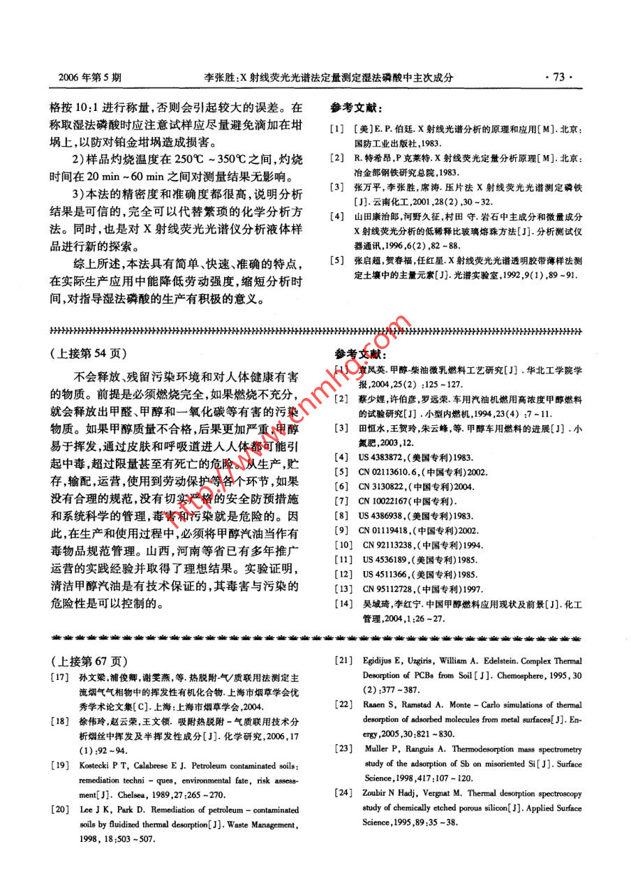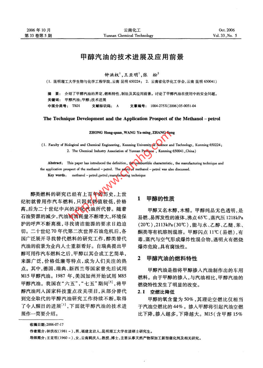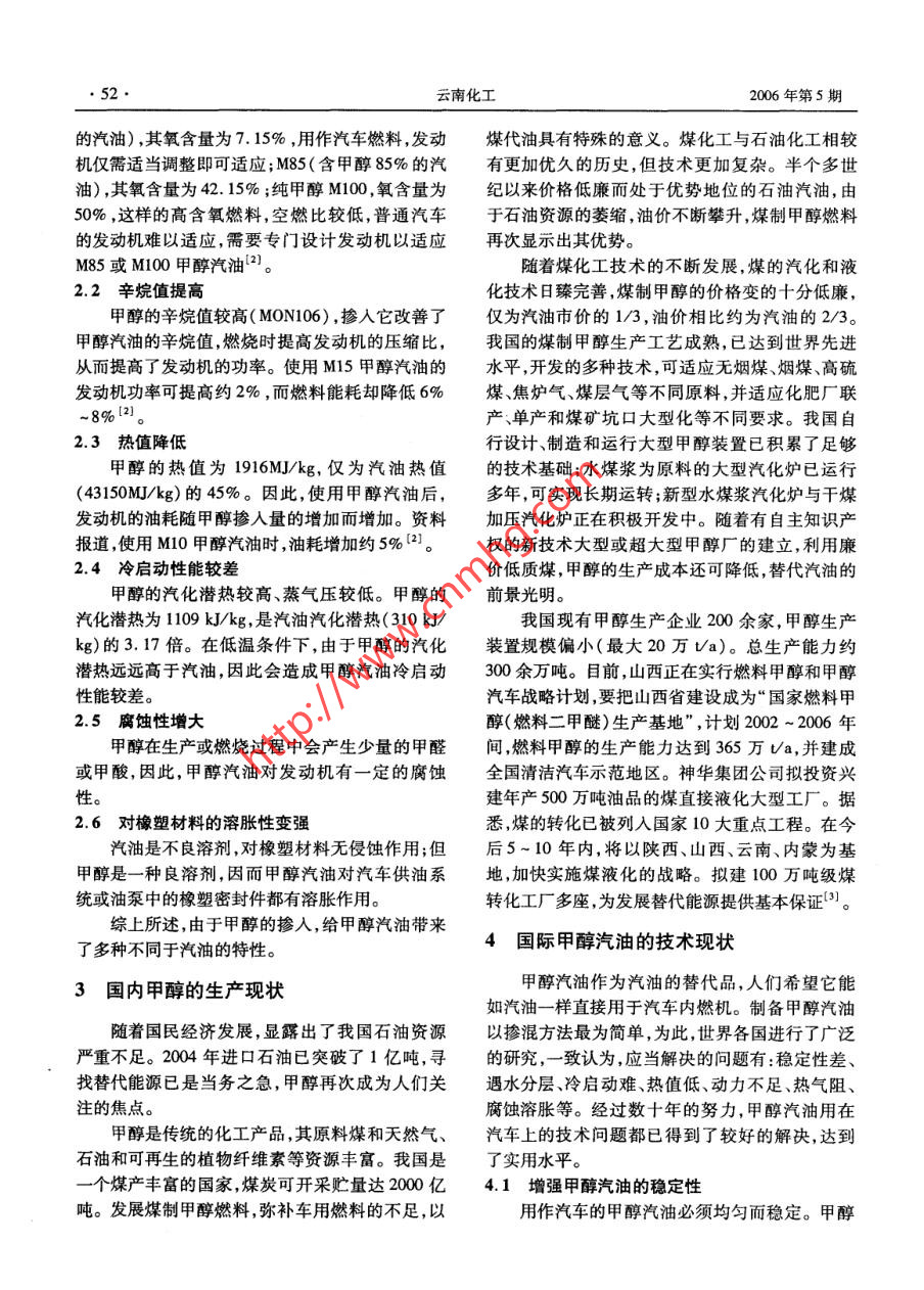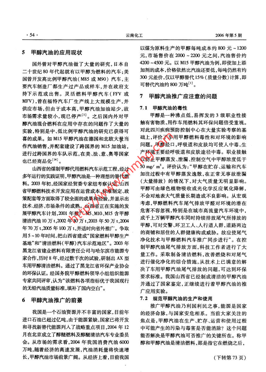 2006年10月云南化工Oet. 2006第33 卷第5期Yunnan Chemical TechnologyVol.33,No. 5甲醇汽油的技術(shù)進(jìn)展及應(yīng)用前景鐘洪權(quán)',王亞明',張松2(1.昆明理工大學(xué)生物與化學(xué)工程學(xué)院,云南昆明650224; 2. 云南省化學(xué)化工學(xué)會,云南昆明650041)摘要:介紹了甲醇汽油的界定,燃料特性,制法及其應(yīng)用前景。討論了甲醇汽油在使用中的安全問題。關(guān)鍵詞:甲醇汽油 ;甲醇;技術(shù)進(jìn)展中圖分類號: TKO1文獻(xiàn)標(biāo)識碼: !文章編號: 1004 275X(2006)05 0051-04The Technique Development and the Application Prospect of the Methanol - petrolZHONG Hong-quan, WANG Ya-ming, ZHANG Song(1. Faculty of Biological and Chemical Engineering, Kunming Univensity of Science and Technology, Kunming 650224;2. The Chemical Industry Asociation of Yunnan Province , Kunming 650041 ,China)Abstract: This paper has introduced the definition, the combustible characteristic , the manufacturing technique andthe application prospect of the methanol - petrol. The safety of methanol - petrol was also discused.Key words: methanol - petrol ;petrol ;manufacturing technique醇類燃料的研究已經(jīng)有.上百年的歷史,上世1甲醇的性質(zhì)紀(jì)初就曾用作汽車燃料,只因其熱值較低,價(jià)格高,后為二十世紀(jì)中興的石化汽油所代替。隨著甲醇又名木醇,木精。甲醇純品無色透明,是石油資源的減少,汽油的消耗量不斷增大,環(huán)境保易燃、易揮發(fā)性的液體,沸點(diǎn)65C ,蒸汽壓1218kPa護(hù)的呼聲不斷高漲,尋找清潔能源的要求日趨迫(20C) ,2113kPa(30C),能與水、乙醇、乙醚、苯、切。二十世紀(jì)70年代第二次世界石油危機(jī)后,各酮類等有機(jī)溶劑混溶。甲醇閃點(diǎn)11C(易燃),有國廣泛展開尋找替代燃料的研究工作,醉類替代毒,蒸汽與空氣形成爆炸性混合物,遇明火有燃燒汽油的前景為業(yè)內(nèi)人士重新看好。自瑞典提出甲爆炸危險(xiǎn),具有腐蝕性。醇可用作汽車燃料之后,甲醇以其合成工藝簡單,2甲醇汽油的燃料特性來源廣泛,價(jià)格低廉等特點(diǎn),成為人們關(guān)注的熱.點(diǎn)。其中,德國、瑞典、新西蘭等國家曾先后試用甲醇汽油是指將甲醇摻人汽油制作出的車用M15甲醇汽油。1987 年,美國加州開始試用M85燃料。由于甲醇的摻人,與汽油相比,甲醇汽油的甲醇汽油。我國在“六五”,“七五”期間[5],將甲燃燒特性發(fā)生了明顯的改變。醇汽油列入國家科技重點(diǎn)攻關(guān)項(xiàng)目,從部分替代2.1空燃比降低到完全取代的甲醇汽油研究工作持續(xù)不斷,取得甲醇的氧含量為50%,其理論空燃比僅相當(dāng)了令人醒目的進(jìn)展",下面就甲醇汽油的技術(shù)進(jìn)于汽油空燃比的44%。摻入甲醇將引起汽油空燃展作一簡要介紹。比下降,摻人越多,下降越大。M15(含甲醇15%收稿日期:2006-07-17作者簡介:鐘洪權(quán)(1981 -),男,福建龍巖人,昆明理工大學(xué)在讀碩士研究生。導(dǎo)師簡介:王亞明(1960-),女,云南鶴慶人,教授,搏士,主要從事天然產(chǎn)物深加工新型催化劑及相關(guān)研究?!?2.云南化工.2006年第5期的汽油) ,其氧含量為7.15% ,用作汽車燃料,發(fā)動煤代油具有特殊的意義。煤化工與石油化工相較機(jī)僅需適當(dāng)調(diào)整即可適應(yīng);M85(含甲醇85%的汽有更加優(yōu)久的歷史,但技術(shù)更加復(fù)雜。半個多世油) ,其氧含量為42.15% ;純甲醇M100,氧含量為紀(jì)以來價(jià)格低廉而處于優(yōu)勢地位的石油汽油,由50% ,這樣的高含氧燃料,空燃比較低,普通汽車于石油資源的萎縮,油價(jià)不斷攀升,煤制甲醇燃料的發(fā)動機(jī)難以適應(yīng),需要專門設(shè)計(jì)發(fā)動機(jī)以適應(yīng)再次顯示出其優(yōu)勢。M85或M100甲醇汽油2。隨著煤化工技術(shù)的不斷發(fā)展,煤的汽化和液2.2辛烷值提高化技術(shù)日臻完善,煤制甲醇的價(jià)格變的十分低廉,甲醇的辛烷值較高( MON106),摻人它改善了僅為汽油市價(jià)的1/3,油價(jià)相比約為汽油的2/3。甲醇汽油的辛烷值,燃燒時(shí)提高發(fā)動機(jī)的壓縮比,我國的煤制甲醇生產(chǎn)工藝成熟,已達(dá)到世界先進(jìn)從而提高了發(fā)動機(jī)的功率。使用M15甲醇汽油的水平,開發(fā)的多種技術(shù),可適應(yīng)無煙煤、煙煤、高硫發(fā)動機(jī)功率可提高約2%,而燃料能耗卻降低6%煤焦?fàn)t氣、煤層氣等不同原料,并適應(yīng)化肥廠聯(lián)~8%[2]。產(chǎn):單產(chǎn)和煤礦坑口大型化等不同要求。我國自2.3熱值降低行設(shè)計(jì)、制造和運(yùn)行大型甲醇裝置已積累了足夠甲醇的熱值為1916MJ/kg,僅為汽油熱值的技術(shù)基礎(chǔ);水煤漿為原料的大型汽化爐已運(yùn)行(43150MJ/kg)的45%。因此,使用甲醇汽油后,多年,可實(shí)現(xiàn)長期運(yùn)轉(zhuǎn);新型水煤漿汽化爐與干煤發(fā)動機(jī)的油耗隨甲醇摻人量的增加而增加。資料加壓汽化爐正在積極開發(fā)中。隨著有自主知識產(chǎn)報(bào)道,使用M10甲醇汽油時(shí),油耗增加約5%(2]。權(quán)的新技術(shù)大型或超大型甲醇廠的建立,利用廉2.4冷 啟動性能較差價(jià)低質(zhì)煤,甲醇的生產(chǎn)成本還可降低,替代汽油的甲醇的汽化潛熱較高、蒸氣壓較低。甲醇的前景光明。汽化潛熱為1109 kJ/kg,是汽油汽化潛熱(310 kJ/我國現(xiàn)有甲醇生產(chǎn)企業(yè)200余家,甲醇生產(chǎn)kg)的3.17倍。在低溫條件下,由于甲醇的汽化裝置規(guī)模偏小(最大20萬Va)??偵a(chǎn)能力