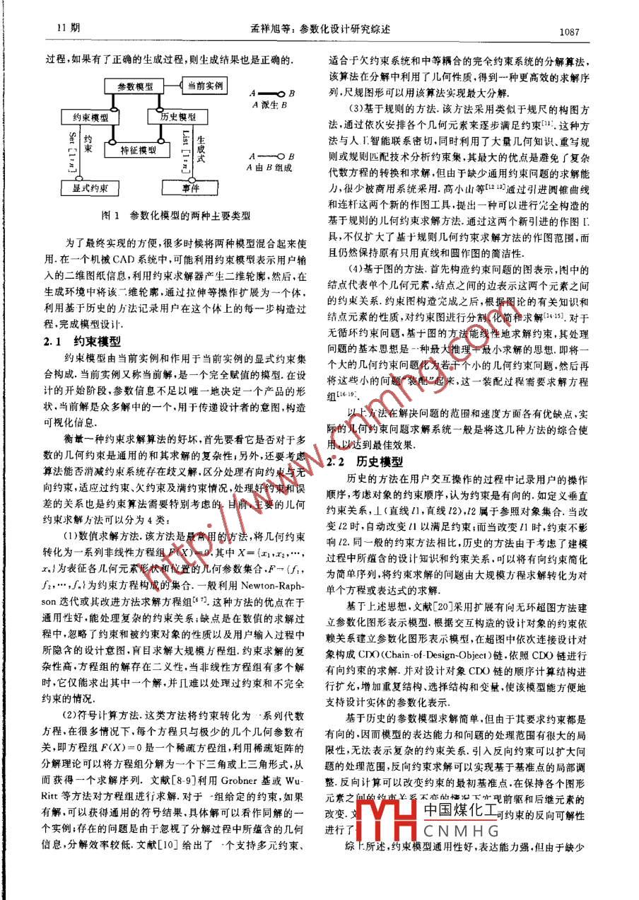 .第14卷第11期計(jì)算機(jī)輔助設(shè)計(jì)與圖形學(xué)學(xué)報Vol, 14,No. 112002年11月JOURNAL OF COMPUTER AIDED DESIGN & COMPUTER GRAPHICSNov., 2002參數(shù)化設(shè)計(jì)研究孟祥旭徐延寧(山東大學(xué)計(jì)算機(jī)科學(xué)與技術(shù)學(xué)院濟(jì)南250100)摘要參數(shù)化設(shè)計(jì)是提高企北產(chǎn)品設(shè)計(jì)創(chuàng)新能力的關(guān)鍵.從參數(shù)化模型的不同表示方式,相應(yīng)的求解方法,建立模型的交互手段等方面綜述產(chǎn)品參數(shù)化設(shè)計(jì)的研究現(xiàn)狀及未來發(fā)展中箭要解決的問題.重點(diǎn)討論傳統(tǒng)CAD領(lǐng)域所涉及的二維圖紙及三維零件造型等幾何問題的參數(shù)化設(shè)計(jì),并在此基礎(chǔ)上對傳統(tǒng)的參數(shù)化的概念進(jìn)行擴(kuò)展,討論產(chǎn)品全生命周期的參數(shù)化設(shè)計(jì)問題及產(chǎn)品參數(shù)化設(shè)計(jì)的相關(guān)國際標(biāo)準(zhǔn)關(guān)鍵詞參數(shù)化,約束, 歷史,模型,特征中圖法分類號TP391. 72A Survey of the Research Works on Parametric DesignMeng Xiangxu Xu Yanning(School of Computer Science and Technology. Shandong University, Jinan 250100)AbstractParameric design is a key point to enhance enterprises' ability to innovative design of product. Thispaper gives a survey of the current works and problems needed 1o be solved in this field from various aspects, suchas different types of parametric model structure, resolving methods,and interactive ways 10 build models. Tradi-tionally ,only geometric elements in 2D drawing and 3D part modeling are mainly focused on in the parametric designprocess. This paper extends its traditional area . and discusses the parametric design problem for the whole life cycleof product and some related standards.Key words parametric , constraint, history,model , feature數(shù)化修改設(shè)計(jì).1引言目前,參數(shù)化設(shè)計(jì)的研究范圍已由最初的二維圖紙參數(shù)化設(shè)計(jì)發(fā)展到了獲蓋產(chǎn)品的整個生命周期參數(shù)化設(shè)計(jì),研究最初的CAD系統(tǒng)所構(gòu)造的產(chǎn)品模型都是幾何圖素(點(diǎn)、的對象除了傳統(tǒng)的二維圖紙、=維零件實(shí)體等以外,還包括線、圓等)的簡單堆疊,僅僅描述了設(shè)計(jì)產(chǎn)品的可視形狀,不零部件間的裝配關(guān)系[68],產(chǎn)品特征(],產(chǎn)品變型設(shè)計(jì))等產(chǎn)包含設(shè)計(jì)者的設(shè)計(jì)思想.因而難以對模型進(jìn)行改動,生成新品層次的參數(shù)化表示模型.這使得參數(shù)化自身的含義得到了的產(chǎn)品實(shí)例.參數(shù)化的設(shè)計(jì)方法止是解決這一問題的有效進(jìn)一步的拓寬.這些研究無疑將會進(jìn)--步提高產(chǎn)品的設(shè)計(jì)和途徑.生產(chǎn)效率,同時也是將來-段時間的熱點(diǎn)問題.通常,參數(shù)化設(shè)計(jì)是指零件或部件的形狀比較定型,用-組參數(shù)約束該幾何圖形的一組結(jié)構(gòu)尺寸字列,參數(shù)與設(shè)計(jì)2參數(shù)化模型表示對象的控制尺寸有顯式對應(yīng),當(dāng)賦子不同的參數(shù)序列值時,就可驅(qū)動達(dá)到新的目標(biāo)幾何圖形,其設(shè)計(jì)結(jié)果是包含設(shè)計(jì)信參數(shù)化模型有兩種基本形式:基于約束的模型和基于歷息的模型1”.參數(shù)化為產(chǎn)品模型的可變性、可重用性、并行設(shè)史的模型,如圖1所示.基于約束的模型通過在當(dāng)前實(shí)例上計(jì)等提供了手段,使用戶可以利用以前的棋型方便地重建模附加約束的方式描述最終的幾何體的特征,該方法側(cè)重生成型,并可以在遵循原設(shè)計(jì)意圖的情況下方便地改動模型,生的結(jié)果,只要結(jié)果中包含了所需要的幾何特征,則獲得結(jié)果成系列產(chǎn)品,大大提高了生產(chǎn)效率.參數(shù)化概念的引入代表的歷史是無關(guān)緊要的;基于厲史的模型通過按順序描述--個了設(shè)計(jì)思想上的一次變革,即從避免改動設(shè)計(jì)到鼓勵使用參幾何體的構(gòu)造方法的歷史來構(gòu)造幾何體,該方法側(cè)重生成的原稿收到日期:2002-04-30;修改稿收到日期:2002-06-10.本課題得到國家白中國煤化工秀青年教師教學(xué)科研獎勵計(jì)劃資助.孟祥旭.男,1962年生,博士,教授.博七生導(dǎo)師,主要研究方向?yàn)镃AI!YHC N M H G975年生,博士研究生,上要研兗方向?yàn)镃AD & CG.PDM.11期孟祥旭等:參數(shù)化設(shè)計(jì)研究綜述1087過程,如果有了正確的生成過程,則生成結(jié)果也是正確的.適合f欠約束系統(tǒng)和中等耦合的完全約東系統(tǒng)的分解算法,該算法在分解中利用了兒何性質(zhì),得到一種更高效的求解序C參數(shù)模型]」(當(dāng)前實(shí)例JA-。B列,尺規(guī)圖形可以用該算法實(shí)現(xiàn)最大分解.A源生B(3)基于規(guī)則的方法.該方法采用類似于規(guī)尺的構(gòu)圖方[約束模型歷史模型法,通過依次安排各個幾何元素來逐步滿足約柬”.這種方漿s特征模型法與人I.智能聯(lián)系密切,同時利用了大量幾何知識、重寫規(guī)A---。B則或規(guī)則匹配技術(shù)分析約束集,其最大的憂點(diǎn)是避免[復(fù)雜A由B組成代數(shù)方程的轉(zhuǎn)換和求解,但由于缺少通用約束問題的求解能顯式約束力,很少敏商用系統(tǒng)采用高小山等11通過引進(jìn)圓錐曲線和連桿這兩個新的作圖工具,提出-種可以進(jìn)行完全構(gòu)造的圖1參數(shù)化模型的兩種土要類型基