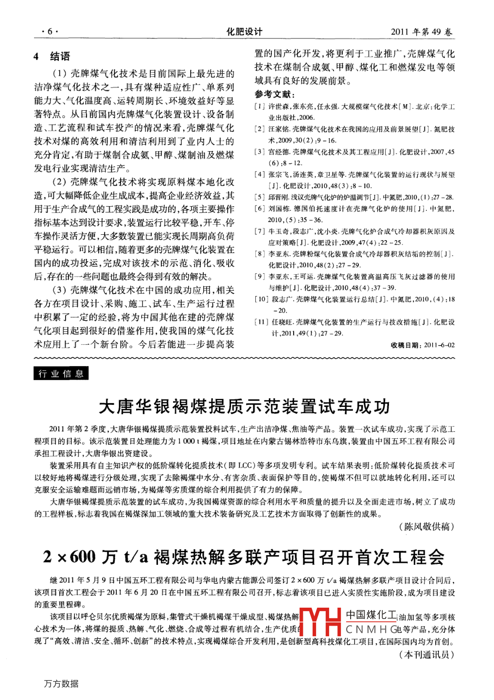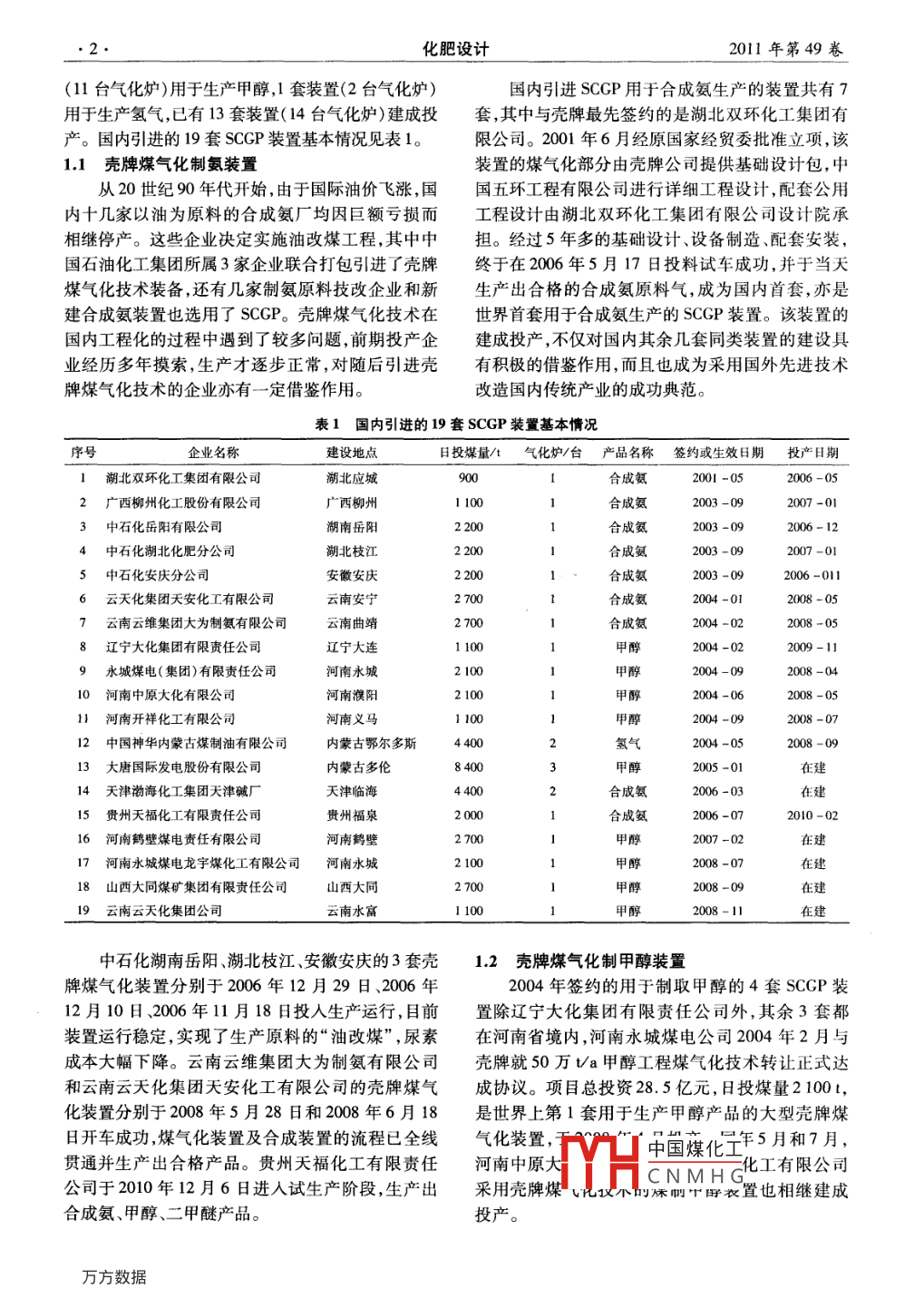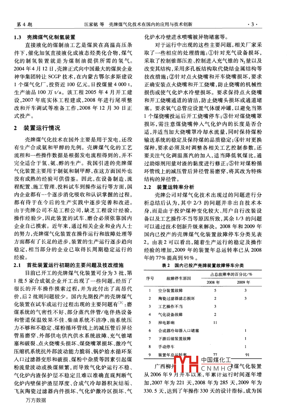 第49卷第4期化肥設計Aug. 20112011年8月Chemical Fertilizer Design●1●專題綜論殼牌煤氣化技術在國內的應用與技術創(chuàng)新汪家銘,莫洪彪(1.川化集團有限責任公司,四川成都610301; 2.河池化工股份有限公司,廣西河池547007)摘要: 殼牌煤氣化技術進入中國已近10年,隨著其工藝技術的完善、運轉經(jīng)驗的積累和操作水平的提高,目前大多數(shù)裝置巳能實現(xiàn)長周期穩(wěn)定運行。簡述了國內殼牌煤氣化裝置的建設概況及總體使用情況;分析了裝置運行中普遍存在的問題及其原因;總結了控制氣化爐爐溫、測量粉煤輸送速度等操作經(jīng)驗;介紹了合成氣冷卻器積灰結垢等故障處理辦法;概述了殼牌煤氣化裝置的技術創(chuàng)新及進展。關鍵詞:殼牌煤氣化技術;項目建設;運行經(jīng)驗;故障處理;技術創(chuàng)新中圖分類號: TQ545文獻標識碼:A 文章編號 :1004 - 8901(2011)04 -0001 -06Both Application Situation and TechnologyInnovation of Shell Coal Gasification Technology in ChinaWANG Jia- ming,MO Hong -biao(1. Sichun Chemical Group Company ld. , Chengdu Sichun 610301 China;2. Hei Chemical Engineering Stock Company Lud. , Heci Guangxi 547007 China)Abstract:There were nearly 10 years since the Shell coal gasifcation technology was imported into China, along with the improvement of its processtechnology , accumulation of operating experience and elevation of the operating level, at present most of plants can already realize long-term stable opera-tion. Author has briely described the construction and general application situations; has analyzed the commonly existing problems in operation of plantsand their causes ; has summarized the operating experience to control the temperature of gasifier and to measure the conveying veloeity of pulverized coal;has introduced the treatment method for fault caused by ash deposition and fouling of the synthetic gas cooler; has briefly described the technology innova-tion and its progresB.Key words : Shell coal gasification technology ; construction of project; operating situation; technology innovation殼牌的石化燃料氣化技術可以追溯到20世紀1裝置建設概況50年代,當時開發(fā)了以渣油為原料的殼牌氣化工藝(SGP),隨后于20世紀70年代初期,在渣油氣化的近10多年來,殼牌公司極力開拓中國市場,推.基礎上,又開發(fā)了殼牌粉煤氣化技術(SCGP)。該動SCGP用于化工生產(chǎn)。殼牌公司自從2001年6技術從1972年開始進行中試,到2001年在荷蘭正月在中國簽訂第1個技術轉讓協(xié)議以來,至今已陸式投人商業(yè)化運行為止,前后共經(jīng)歷了30多年的續(xù)與國內17家企業(yè)簽訂了19份技術轉讓協(xié)議。殼牌在全世界已經(jīng)簽訂的26份煤氣化技術許可合同技術開發(fā)歷程。殼牌煤氣化技術是目前世界上較為先進的,屬中,中國就超過了三分之二。國內從2006年至今已于氣流床氣化的第2代煤氣化技術[" ,代表著煤氣建成多套合成氨、甲醇、氫氣生產(chǎn)裝置,主要用在大化技術發(fā)展趨勢,為投煤量2 000 ~3 000 Vd的商業(yè)型化肥企業(yè)進行氮肥原料及動力結構調整的技術規(guī)模奠定了技術基礎。該技術對煤種(特別是高硫改造,以及煤制甲醇和煤制油項目,其中云天化和煤)、粒度具有較大兼容性,具有煤種適應性廣、單永城煤電2家企業(yè)是在引進殼牌煤氣化裝置順利投產(chǎn)的情況下,再次簽訂技術轉讓協(xié)議,顯示出了該系列能力大氣化溫度高、氣化用氧耗量低、運轉周技術在國內的良好的發(fā)展勢頭(2]。國內目前已簽期長、環(huán)境效益好等技術優(yōu)勢,與我國的能源資源約引進19套SCGP裝置,共23臺氣化爐,其中9的基本國情相適應。SCGP生產(chǎn)的合成氣有多種作套裝置(10中國煤化工氨,9套裝置用,可用來制造純氫,生產(chǎn)合成氨、甲醇、含氧化合CNMHG,物,也可以用于制取運輸燃油、城市煤氣、合成天然作者簡介:汪家銘(播電視大學機械專業(yè),工程師,從事大型引進化肥裝備技術管理以氣及發(fā)電。及化工情報信息等工作?!?.化肥設計2011年第49卷(11臺氣化爐)用于生產(chǎn)甲醇,1套裝置(2臺氣化爐)國內引進SCGP用于合成氨生產(chǎn)的裝置共有7用于生產(chǎn)氫氣,已有13套裝置( 14臺氣化爐)建成投套,其中與殼牌最先簽約的是湖北雙環(huán)化工集團有產(chǎn)。國內引進的19套SCGP裝置基本情況見表1。限公司。2001年6月經(jīng)原國家經(jīng)貿委批準立項,該1.1 殼牌煤氣化制氨裝置裝置的煤氣化部分由殼牌公司提供基礎設計包,中從20世紀90年代開始,由于國際油價飛漲,國國五環(huán)工程有限公司進行詳細工程設計,配套公用內十幾家以油為原料的合成氨廠均因巨額虧損而工程設計由湖北雙環(huán)化工集團有限公司設計院承相繼停產(chǎn)。這些企業(yè)決定實施油改煤工程,其中中擔。經(jīng)過5年多的基礎設計、設備制造、配套安裝,國石油化工集團所屬3家企業(yè)聯(lián)合打包引進了殼牌終于在2006年5月17日投料試車成功,并于當天煤氣化技術裝備,還有幾家制氨原料技改企業(yè)和新生產(chǎn)出合格的合成氨原料氣,成為國內首套,亦是建合成氨裝置也選用了SCGP。殼牌煤氣化技術在世界首套用于合成氨生產(chǎn)的SCGP裝置。該裝置的國內工程化的過程中遇到了較多問題,前期投產(chǎn)企建成投產(chǎn) ,不僅對國內其余幾套同類裝置的建設具業(yè)經(jīng)歷多年摸索,生產(chǎn)才逐步正常,對隨后引進殼有積極的借鑒作用,而且也成為采用國外先進技術牌煤氣化技術的企業(y