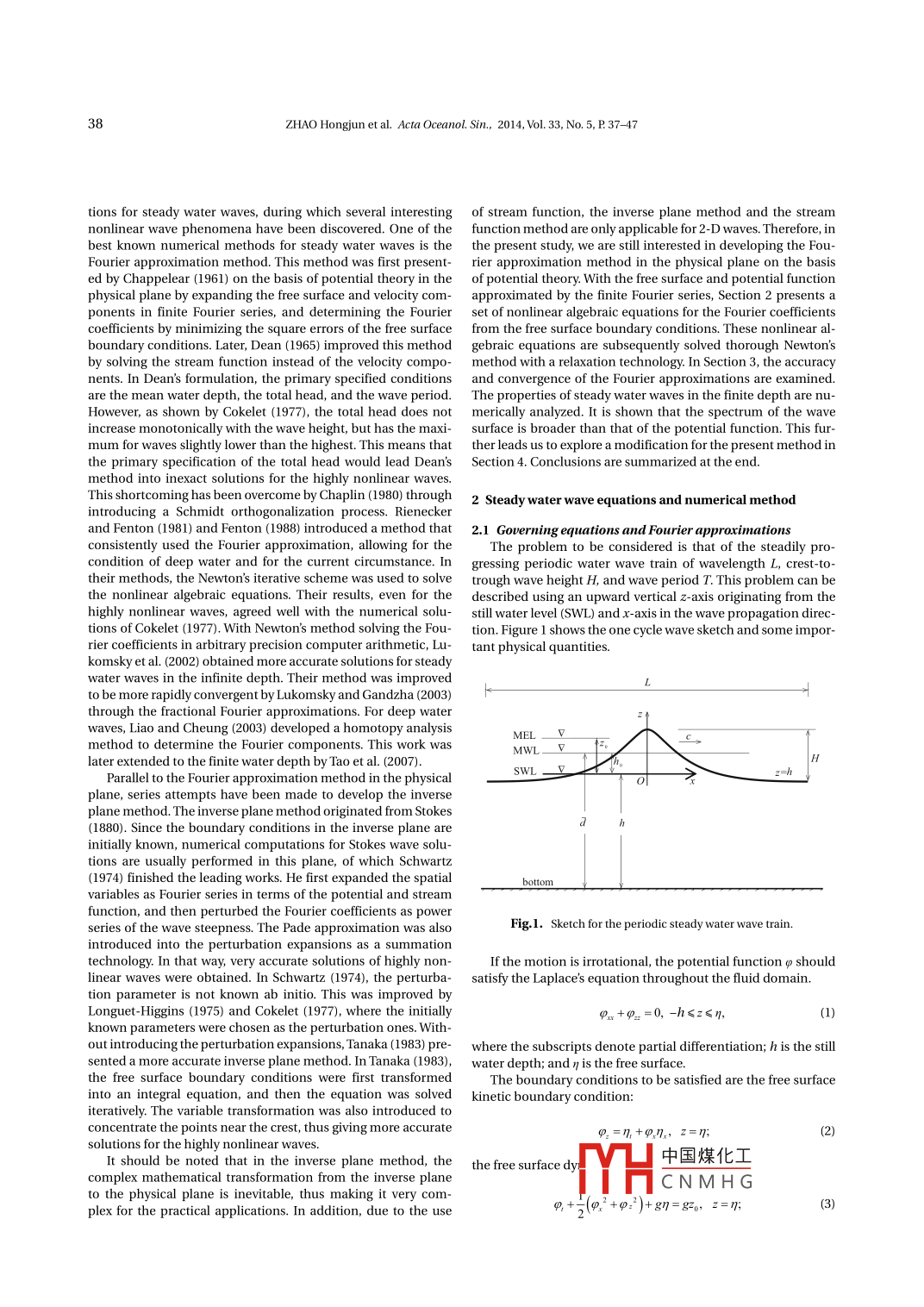 38ZHAO Hongjun et al. Acta OCceanol. Sin, 2014, Vol.33, No. 5, P 37-47tions for steady water waves, during which several interesting of stream function, the inverse plane method and the streamnonlinear wave phenomena have been discovered. One of the function method are only applicable for 2-D waves. Therefore, inbest known numerical methods for steady water waves is the the present study, we are still interested in developing the Fou-Fourier approximation method. This method was first present- rier approximation method in the physical plane on the basised by Chappelear (1961) on the basis of potential theory in the of potential theory. With the free surface and potential functionphysical plane by expanding the free surface and velocity com-approximated by the finite Fourier series, Section 2 presents aponents in finite Fourier series, and determining the Fourier set of nonlinear algebraic equations for the Fourier cofficientcofficients by minimizing the square errors of the free surface from the free surface boundary conditions. These nonlinear al-boundary conditions. Later, Dean (1965) improved this method gebraic equations are subsequently solved thorough Newton'sby solving the stream function instead of the velocity compo- method with a relaxation technology. In Section 3, the accuracynents. In Dean's formulation, the primary specified conditions and convergence of the Fourier approximations are examined.are the mean water depth, the total head, and the wave period. The properties of steady water waves in the finite depth are nu-However, as shown by Cokelet (1977), the total head does not merically analyzed. It is shown that the spectrum of the waveincrease monotonically with the wave height, but has the maxi- surface is broader than that of the potential function. This fur-mum for waves slightly lower than the highest. This means that ther leads us to explore a modification for the present method inthe primary specification of the total head would lead Dean's Section 4. Conclusions are summarized at the end.method into inexact solutions for the highly nonlinear waves.Thisshortcoming has been overcome by Chaplin (1980) through 2 Steady water wave equations and numnerical methodintroducing a Schmidt orthogonalization process. Rieneckerand Fenton (1981) and Fenton (1988) introduced a method that 2.1 Governing equations and Fourier approximationsconsistently used the Fourier approximation, allowing for theThe problem to be considered is that of the steadily pro-condition of deep water and for the current circumstance. In gressing periodic water wave train of wavelength L, crest-to-their methods, the Newton's iterative scheme was used to solvetrough wave height H, and wave period T. This problem can bethe nonlinear algebraic equations. Their results, even for the described using an upward vertical z-axis originating from thehighly nonlinear waves, agreed well with the numerical solu- still water level (SWL) and x-axis in the wave propagation direc-tions of Cokelet (1977). With Newton's method solving the Fou-tion. Figure 1 shows the one cycle wave sketch and some impor-rier cofficients in arbitrary precision computer arithmetic, Lu- tant physical quantities.komsky et al. (2002) obtained more accurate solutions for steadywater waves in the infinite depth. Their method was improvedto be more rapidly convergent by Lukomsky and Gandzha (2003)through the fractional Fourier approximations. For deep waterz. 1waves, Liao and Cheung (2003) developed a homotopy analysisMEL一Vmethod to determine the Fourier components.MwL二立二平later extended to the finite water depth by Tao et al. (2007).HParallel to the Fourier approximation method in the physicalSWLo≥plane, series attempts have been made to develop the inverseplane method. The inverse plane method originated from Stokes(1880). Since the boundary conditions in the inverse plane areinitially known, numerical computations for Stokes wave solu-tions are usually performed in this plane, of which Schwartz(1974) finished the leading works. He first expanded the spatial_bottomvariables as Fourier series in terms of the potential and streamfunction, and then perturbed the Fourier coefficients as powerseries of the wave steepness. The Pade approximation was alsoFig.1. Sketch for the periodic steady water wave train.introduced into the perturbation expansions as a summationtechnology. In that way, very accurate solutions of highly non-If the motion is irrotational, the potential function ρ shouldlinear waves were obtained. In Schwartz (1974), the perturba- satisfy the Laplace's equation throughout the fluid domain.tion parameter is not known ab initio. This was improved byLonguet-Higgins (1975) and Cokelet (1977), where the itallyPx +9_ =0, -h≤z≤η,(1)known parameters were chosen as the perturbation ones. With-out introducing the perturbation expansions, Tanaka (1983) pre-where the subscripts denote partial differentiation; h is the stllsented a more acurate inverse plane method. In Tanaka (1983),water depth; and n is the free surface.the free surface boundary conditions were first transformedThe boundary conditions to be satisfied are the free surfaceinto an integral equation, and then the equation was solved kinetic boundary condition:iteratively. The variable transformation was also introduced toconcentrate the points near the crest, thus giving more accurate9.=η,+9,nx,z=n;(2)solutions for the highly nonlinear waves.It should be noted that in the inverse plane method, the the free surface dy中國煤化工complex mathematical transformation from the inverse planefYHCNMHGto the physical plane is inevitable, thus making it very com-plex for the practical applications. In addition, due to the use9.+;(o? +φ?2)+gn=87o,z=7;(3)ZHAO Hongjun et al. Acta Oceanol. Sin, 2014, Vol. 33, No. 5, P37-4739and the bottom boundary condition:The free surface function can also be approximated by thefollowing Fourier series as:φ:=0, z=-h.4)η=ηo+ En。cos(n),(