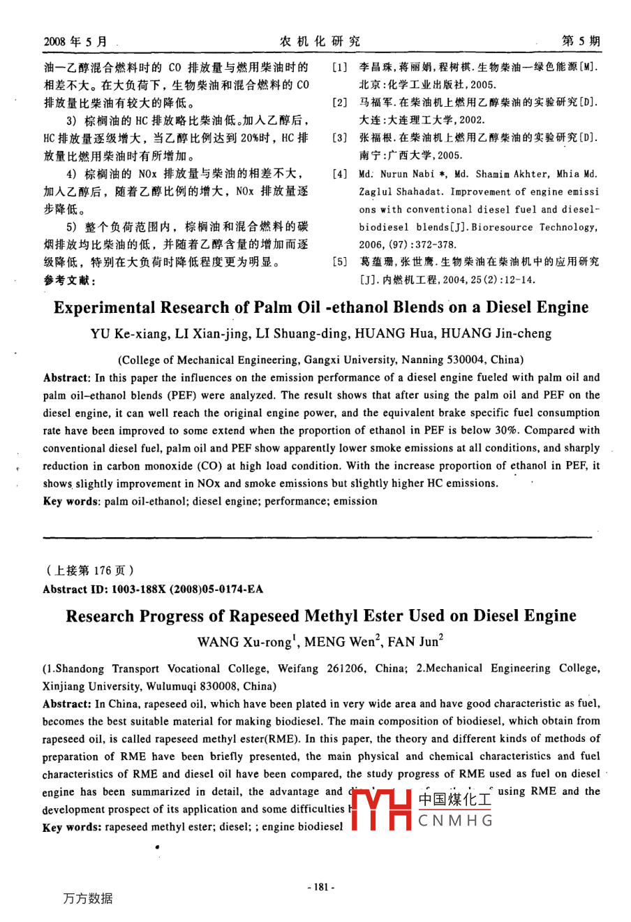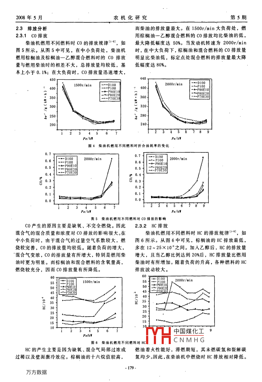 2008年5月農(nóng)機(jī)化研究第5期棕櫚油一乙醇混合燃料發(fā)動機(jī)的試驗研究余克橡,李獻(xiàn)菁,李雙定,黃華,黃錦成(廣西大學(xué)機(jī)械工程學(xué)院,南寧530004)摘要:通過在S195柴油機(jī)上進(jìn)行對比試驗,分析了棕櫚油及棕櫚油一乙醇混合燃料的不同比例對柴油機(jī)性能的影響。研究結(jié)果表明,柴油機(jī)燃用混合燃料后,乙醇的摻燒率為30%以下時,其動力性能良好,折合油耗率均有不同程度的改善。柴油機(jī)燃用棕櫚油和混合燃料時,與燃用柴油相比,碳煙在整個運(yùn)轉(zhuǎn)工況范圍內(nèi)有大幅度的降低;在大負(fù)荷下的C0排放量有明顯的降低,NOx排放量有所改善;隨著乙醇比例的增大、N0x和碳煙排放量逐級降低,HC排放量比燃用柴油時有所增加。關(guān)鍵詞:棕櫚油一乙醇;柴油機(jī);性能;排放中圖分類號:TK4389文獻(xiàn)標(biāo)識碼:A文章編號:1003-188×(2008)05-0177-050引言試驗裝置與燃料生物柴油是由植物油(如棕櫚油)、動物脂肪1.1試驗裝置等原料制成,具有可再生、清潔和安全等優(yōu)勢。試驗用柴油機(jī)為S95柴油機(jī)。主要測試設(shè)備其十六烷值和閃點較高,抗暴性能優(yōu)于常規(guī)柴油,為D110水力測功機(jī),FC2210Z智能油耗儀,FTY-100含硫量低,不含對環(huán)境造成污染的芳香族烷烴,便不透光煙度計和AVL5組份汽車排氣分析儀。于運(yùn)輸和儲藏。乙醇作為可再生代用燃料,在柴油1.2試驗燃料機(jī)上應(yīng)用,可以有效地降低發(fā)動機(jī)排氣中顆粒物、1.2.1試驗用燃料一氧化碳、氮氧化物等有害物質(zhì)的含量,環(huán)境效益本試驗研究5種燃料的排放特性。這5種燃料顯著。但乙醇的十六烷值較低,難以直接在普通柴分別為:0#柴油(D100),棕櫚油(P100),體積分?jǐn)?shù)油機(jī)上使用,可以考慮摻混的方式加以應(yīng)用為90%的棕櫚油+10%乙醇(P90E10),體積分?jǐn)?shù)為80%本文主要以棕櫚油及棕櫚油一乙醇混合燃料的棕櫚油+20%乙醇(P80E20),體積分?jǐn)?shù)為70%的棕為燃料,在柴油機(jī)上進(jìn)行了動力性、經(jīng)濟(jì)性和排放櫚油+30%乙醇(P70E30)。其理化性質(zhì)如表1所示。特性的試驗研究,并與柴油燃料進(jìn)行了比較表1燃料理化性質(zhì)燃料類型密度/g"cm3運(yùn)動粘度/m2·s'閃點(閉口)/℃冷凝點/℃氧含量/wt十六烷指數(shù)熱值/kJ·kg棕櫚油0.8694.3(40℃)101339.5常規(guī)柴油0.82-0.862.0~4.065-8843.5乙醇13-14117.3122棕櫚油+乙醇混合溶液配制乙醇體積分?jǐn)?shù)分別為10%,20%和30%。先往量筒里倒入棕櫚油(如圖1a),再加入乙醇。觀察發(fā)現(xiàn),初加乙醇時,在攪拌之前混合溶液分兩層,乙醇在上面一層,其原因是乙醇密度小于棕櫚油密度的緣故;振蕩攪拌,待靜止穩(wěn)定后,溶液呈透明狀,且混合溶液長期放置均穩(wěn)定,也不會出現(xiàn)分層現(xiàn)象(如圖1b~d所示)。M凵中國煤化工Ea0(60970收稿日期:2007-07-23CNMHG況作者簡介:余克橡(1950-),男,廣西岑溪人,實驗師,(E-ai1)1.3瓜力桑hu ache126.c0m。本試驗在不改變原機(jī)結(jié)構(gòu)參數(shù)的情況下進(jìn)行2008年5月農(nóng)機(jī)化研究第5期分別在額定轉(zhuǎn)速200r/min及最大扭矩轉(zhuǎn)速相同3。因此發(fā)動機(jī)燃用或摻燒乙醇燃料時,將供1500r/min下對柴油機(jī)燃用上述5種燃料時的性能油量進(jìn)行調(diào)整后,并不會影響發(fā)動機(jī)的功率。實驗和排放情況進(jìn)行對比試驗。用柴油機(jī)燒棕櫚油一乙醇混合燃料的輸出功率與燒2試驗結(jié)果與分析純柴油的輸出功率無明顯差別,均可達(dá)到額定負(fù)荷。22燃料經(jīng)濟(jì)性2.1混合燃料動力性分析圖2和圖3分別給出了柴油機(jī)燃用不同棕櫚由乙醇的理化性質(zhì)可以知道,乙醇的低熱值較—乙醇混合燃料時燃油消耗量和燃油消耗率的變低,但由于乙醇的理論空燃比相對石油燃料低,理曲線。論混合氣的熱值與石油燃料理論混合氣的熱值基本2.02.82000r/min26--1001.61-P70E32.2--80E2·x1.8110001.61.21.00.8Pe/kWPe/kw圖2柴油機(jī)燃用不同混合燃料時燃油消耗量的變化1500r/oin二P902000r/minv--P80E20◆=P70Ep一P70E30320240圖3柴油機(jī)燃用不同混合燃料時燃泊消耗率的變化由圖2和圖3中可以看出柴油機(jī)燃用棕櫚油及上由于試驗中各種燃料的熱值不一,通常采用折合棕櫚油一乙醇混合燃料時,其燃油消耗量(率)比油耗率(或稱能量消耗率)來比較分析其經(jīng)濟(jì)性。柴油高,且隨著棕櫚油中乙醇比例的增大而增大。本研究用b來表示"。在1500r/min時,燃用P100的燃油消耗率比燃用柴各種燃料折合油耗率的變化規(guī)律,如圖4所示。油的燃油消耗率髙16.2%,乙醇比例毎增加10%,燃顯然使用棕櫚油及棕櫚油一乙醇混合燃料時,在不油消耗率增加不到2%;在2000r/min標(biāo)定點處,P100同工況下折合油耗率均有不同程度的改善。這主要的燃油消耗率比柴油的高14.5%,乙醇比例每增加是燃料的粘度、含氧量和著火能力共同作用的結(jié)果。10%,燃油消耗率平均增加亦不到2%。這是因為棕棕櫚油粘度大,影響了燃料與空氣混合的質(zhì)量,燃櫚油及乙醇的熱值均比柴油低的緣故(如表1所燒效率有一定的降低,但棕櫚油十六烷值高,含氧示)。隨著混合燃料中乙醇摻混比增大,混合燃料總量而的田者熱效率提高;加入乙醇熱值降低,在相同輸出功率情況下,燃用代用燃料以中國煤化工料的粘度降低,有利的燃油消耗量(率)較柴油高,且乙醇含量越高,于CNMH〔高的含氧量,
