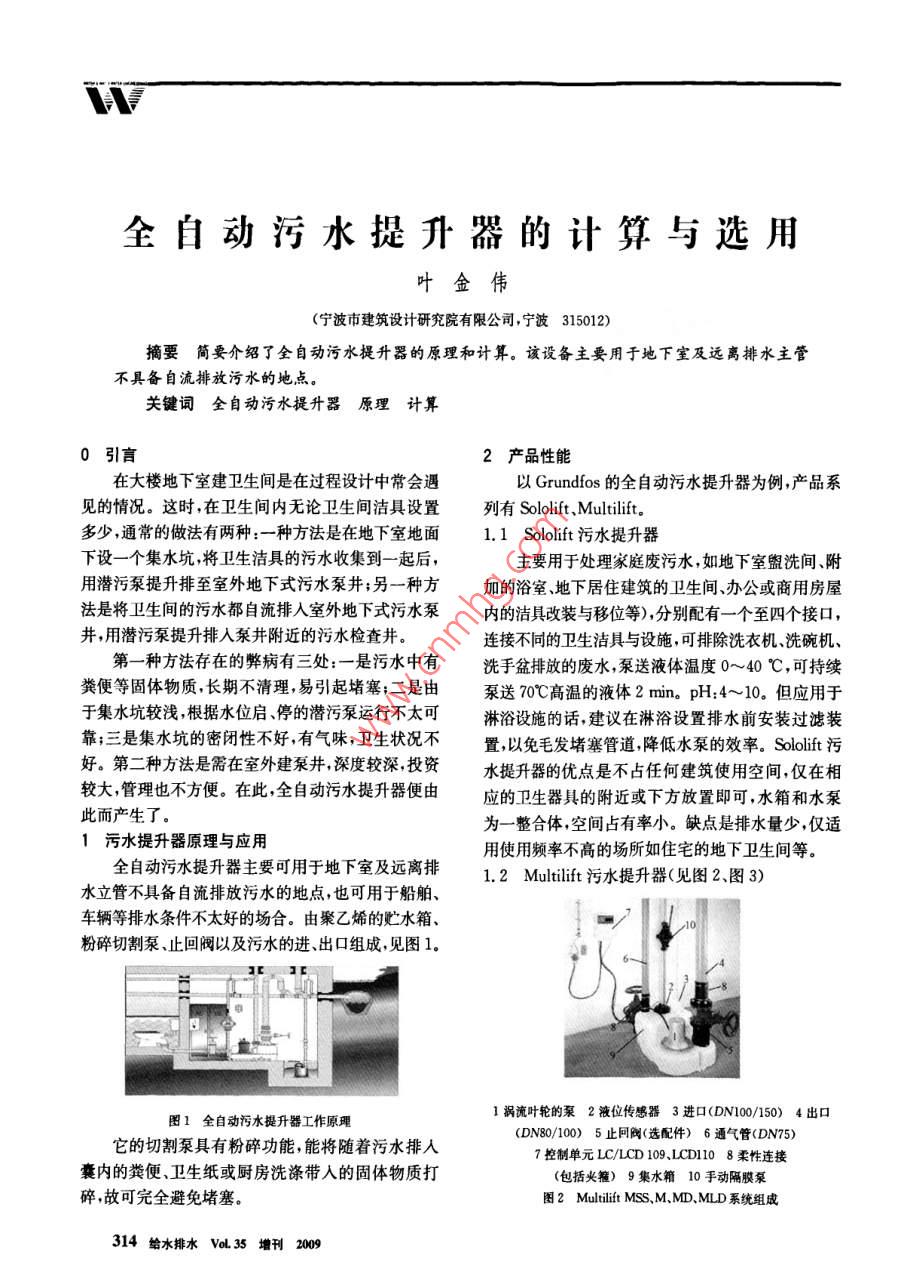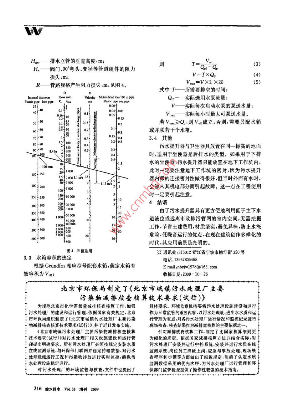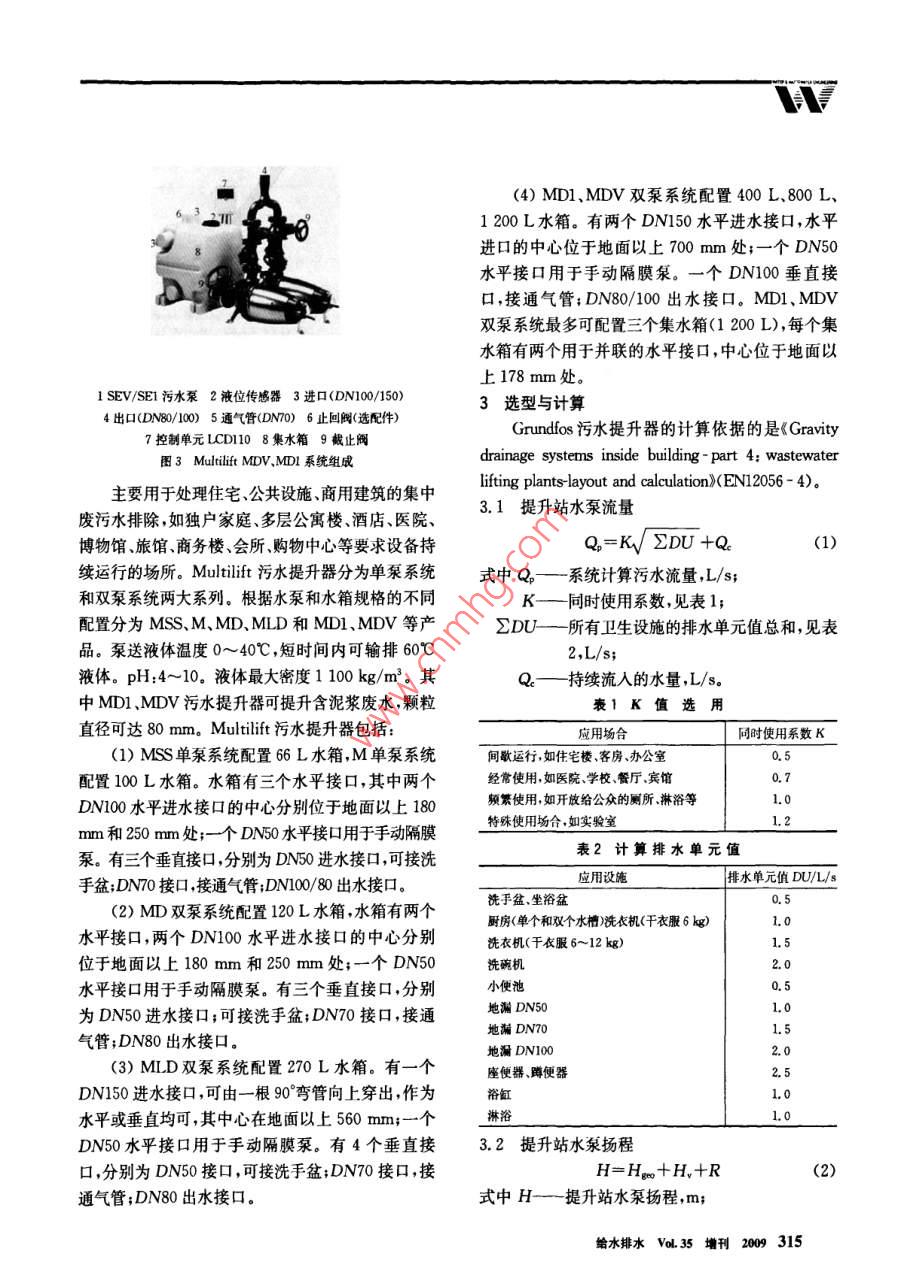 W全自動污水提升器的計算與選用葉金偉(寧波市建筑設(shè)計研究院有限公司,寧波315012)摘要簡要介紹了全自動污水提升器的原理和計算。 該設(shè)備主要用于地下室及遠離排水主管不具備自流排放污水的地點。關(guān)鍵詞全自動污水提升器 原理計算0引言2產(chǎn)品性能在大樓地下室建衛(wèi)生間是在過程設(shè)計中常會遇以Grundfos的全自動污水提升器為例,產(chǎn)品系見的情況。這時,在衛(wèi)生間內(nèi)無論衛(wèi)生間潔具設(shè)置列有Sololift,Multilift.多少,通常的做法有兩種:一種方法是在地下室地面1.1 Sololift 污水提升器下設(shè)一個集水坑,將衛(wèi)生潔具的污水收集到一起后,主要用于處理家庭廢污水,如地下室盥洗間、附用潛污泵提升排至室外地下式污水泵井;另一種方加的浴室、地下居住建筑的衛(wèi)生間、辦公或商用房屋;法是將衛(wèi)生間的污水都自流排人室外地下式污水泵內(nèi)的潔具改裝與移位等) ,分別配有-個至四個接口,井,用潛污泵提升排入泵井附近的污水檢查井。連接不同的衛(wèi)生潔具與設(shè)施,可排除洗衣機、洗碗機、第一種方法存在的弊病有三處:一是污水中有洗手盆排放的廢水,泵送液體溫度0~40 C,可持續(xù)糞便等固體物質(zhì),長期不清理,易引起堵塞;二是由泵送70C高溫的液體2 min。pH:4~10。 但應(yīng)用于于集水坑較淺,根據(jù)水位啟、停的潛污泵運行不太可淋浴設(shè)施的話,建議在淋浴設(shè)置排水前安裝過濾裝靠;三是集水坑的密閉性不好,有氣味,衛(wèi)生狀況不置,以免毛發(fā)堵塞管道,降低水泵的效率。Sololift 污好。第二種方法是需在室外建泵井,深度較深,投資水提升器的優(yōu)點是不占任何建筑使用空間,僅在相較大,管理也不方便。在此,全自動污水提升器便由應(yīng)的衛(wèi)生器具的附近或下方放置即可,水箱和水泵此而產(chǎn)生了。為一整合體,空間占有率小。觖點是排水量少,僅適1污水提升器原理與應(yīng)用全自動污水提升器主要可用于地下室及遠離排用使用頻率不高的場所如住宅的地下衛(wèi)生間等。1.2 Multilift 污水提升器(見圖2.圖3)水立管不具備自流排放污水的地點,也可用于船舶、車輛等排水條件不太好的場合。由聚乙烯的貯水箱、粉碎切割泵、止回閥以及污水的進、出口組成,見圖1.1鍋流葉輪的泵2液位傳感器3 進口(DN100/150) 4出口圖1全自動污水提升器工作原理(DN80/100) 5 止回閥(選配件) 6 通氣管(DN75)它的切割泵具有粉碎功能,能將隨著污水排人7控制單元LC/LCD 109.1CD110 8 柔性連接囊內(nèi)的糞便、衛(wèi)生紙或廚房洗滌帶人的固體物質(zhì)打(包括夾箍) 9集水箱10 手動隔膜泵碎,故可完全避免堵塞。圖2 Mutilift MSS.M.MD.MLD系統(tǒng)組成314給水排水VoL.35 增刊2009(4) MD1、MDV雙泵系統(tǒng)配置400 L.800 L、1 200 L水箱。有兩個DN150水平進水接口,水平進口的中心位于地面以上700 mm處;一個DN50水平接口用于手動隔膜泵。一個DN100垂直接口,接通氣管; DN80/100出水接口。MD1、MDV雙泵系統(tǒng)最多可配置三個集水箱(1200 L),每個集水箱有兩個用于并聯(lián)的水平接口,中心位于地面以上178mm處。1 SEV/SE1污水泵2液位傳感器3進口(DN100/150)3選型與計算4出口(DN80/100) 5 通氣管(DN70) 6 止回閥(選配件)Grundfos 污水提升器的計算依據(jù)的是《Gravity7控制單元LCD1108集水箱9截止閥drainage systens inside building - part 4: wastewater圖3 Mutilift MDV.MDI系統(tǒng)組成lifting plants-layout and calculation)(EN12056 - 4)。主要用于處理住宅、公共設(shè)施、商用建筑的集中3.1提升站水泵流量廢污水排除,如獨戶家庭、多層公寓樓、酒店、醫(yī)院、博物館、旅館、商務(wù)樓、會所.購物中心等要求設(shè)備持Q,=K√EDU +Qe(1)續(xù)運行的場所。Multilift 污水提升器分為單泵系統(tǒng)式中Q-系統(tǒng)計算污水流量,L/s;和雙泵系統(tǒng)兩大系列。根據(jù)水泵和水箱規(guī)格的不同K一同時使用系數(shù),見表1;配置分為MSS、M、MD、MLD和MD1、MDV等產(chǎn)EDU--所有衛(wèi)生 設(shè)施的排水單元值總和,見表品。泵送液體溫度0~40C,短時間內(nèi)可輸排60C2,L/s;液體。pH:4~10。 液體最大密度1100 kg/m3.其Q.-持續(xù)流人的水量,L/s.中MD1、MDV污水提升器可提升含泥漿廢水,顆粒表1K值選用直徑可達80 mm。Mutilift 污水提升器包括:應(yīng)用場合同時使用系數(shù)K(1) MSS單泵系統(tǒng)配置66 L水箱,M單泵系統(tǒng)間歇運行,如住宅樓、客房、辦公室0.5配置100 L水箱。水箱有三個水平接口,其中兩個經(jīng)常使用,如醫(yī)院學(xué)校、餐廳.賓館DN100水平進水接口的中心分別位于地面以上180頻繁使用,如開放給公眾的廁所.琳浴等1.0特殊使用場合.如實驗室1.2mm和250 mm處;一個DN50水平接口用于手動隔膜表2計算排水單元值泵。有三個垂直接口,分別為DN50進水接口,可接洗應(yīng)用設(shè)施排水單元值DU/L/s手盆;DN70接口,接通氣管;DN10/80出水接口。(2) MD雙泵系統(tǒng)配置120 L水箱,水箱有兩個洗手盆、坐浴盆廚房<單個和雙個水槽)洗衣機(干衣服6 kg)水平接口,兩個DN100水平進水接口的中心分別洗衣機(千衣服6~12 kg)1.5位于地面以上180mm和250mm處;一個DN50洗碗機2.0水平接口用于手動隔膜泵。有三個垂直接口,分別小便池為DN50進水接口;可接洗手盆;DN70接口,接通地漏DN50地漏DN70氣管; DN80出水接口。地漏DN100(3) MLD雙泵系統(tǒng)配置270 L水箱。有一個座便器、蹲便器2.5DN150進水接口,可由一