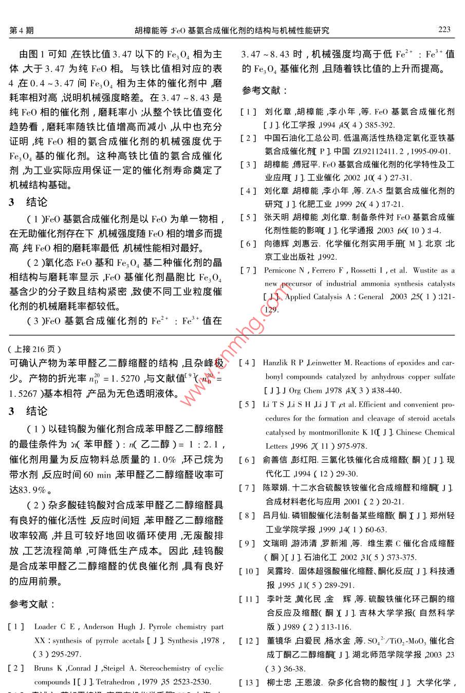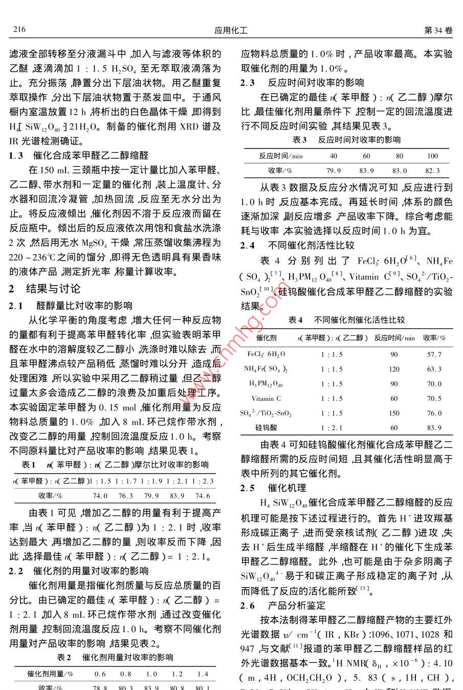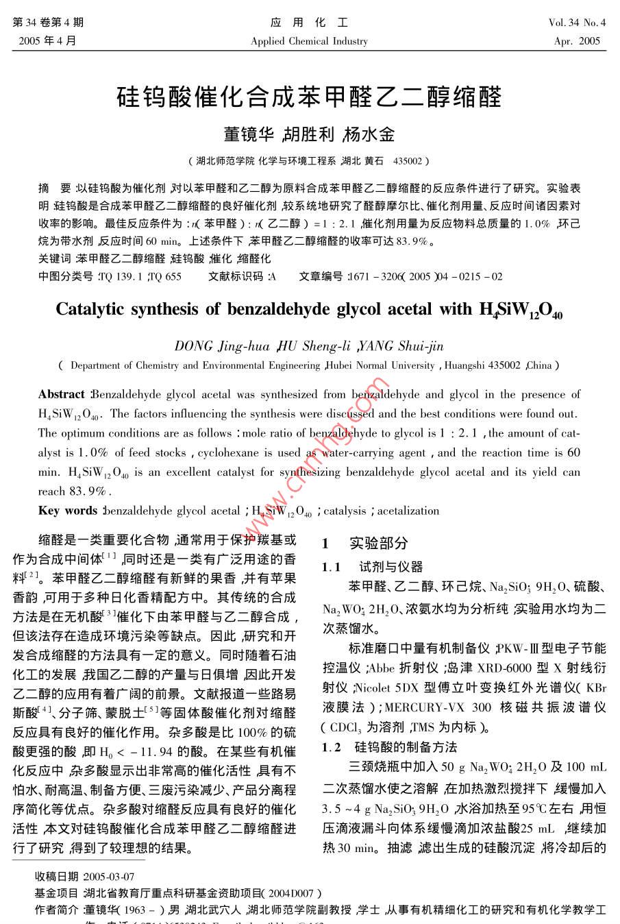 第34卷第4期應(yīng)用化工Vol 34 No 405年4月Applied Chemical Industry硅鎢酸催化合成苯甲醛乙二醇縮醛董鏡華胡勝利楊水金湖北師范學(xué)院化學(xué)與環(huán)境工程系湖北黃石435002)摘要以硅鎢酸為催化劑對以苯甲醛和乙二醇為原料合成苯甲醛乙二醇縮醛的反應(yīng)條件進行了研究。實驗表明硅鎢酸是合成苯甲醛乙二醇縮醛的良好催化劑較系統(tǒng)地研究了醛醇摩爾比、催化劑用量、反應(yīng)時間諸因素對收率的影響。最佳反應(yīng)條件為:(苯甲醛):κ乙二醇)=1:2.1催化劑用量為反應(yīng)物料總質(zhì)量的1.0%環(huán)己烷為帶水劑反應(yīng)時間60min。上述條件下苯甲醛乙二醇縮醛的收率可達83.9%。關(guān)鍵詞苯甲醛乙二醇縮醛鎢酸摧化縮醛化中圖分類號TQ139.1rQ655文獻標識碼A文章編號671-3206(2005)4-0215-02Catalytic synthesis of benzaldehyde glycol acetal with HSiW1o4oDONG Jing-hua HU Sheng-li, YANG Shui-jinDepartment of Chemistry and Environmental Engineering Hubei Normal University Huangshi 435002 f hinaAbstract Benzaldehyde glycol acetal was synthesized from benzaldehyde and glycol in the presence ofH4 SiW12 Oao. The factors influencing the synthesis were discussed and the best conditions were found outThe optimum conditions are as follows: mole ratio of benzaldehyde to glycol is 1: 2. 1, the amount of catalyst is 1. 0% of feed stocks cyclohexane is used as water-carrying agent and the reaction time is 60min. H4Si? Ouo is an excellent catalyst for synthesizing benzaldehyde glycol acetal and its yield canreach 83. 9%0Key words benzaldehyde glycol acetal H SiW12 Oao catalysis acetalization縮醛是一類重要化合物通常用于保護羰基或1實驗部分作為合成中間體同時還是一類有廣泛用途的香1.1試劑與儀器料2]。苯甲醛乙二醇縮醛有新鮮的果香并有蘋果香韻可用于多種日化香精配方中。其傳統(tǒng)的合成苯甲醛、乙二醇、環(huán)己烷、Na2SiO;9HO、硫酸、方法是在無機酸3催化下由苯甲醛與乙二醇合成Na2WO:2H2O濃氨水均為分析純實驗用水均為二但該法存在造成環(huán)境污染等缺點。因此研究和開次蒸餾水。發(fā)合成縮醛的方法具有一定的意義。同時隨著石油標準磨口中量有機制備儀PKW-Ⅲ型電子節(jié)能化工的發(fā)展我國乙二醇的產(chǎn)量與日俱增因此開發(fā)控溫儀;Abbe折射儀;島津XRD600型x射線衍乙二醇的應(yīng)用有著廣闊的前景。文獻報道一些路易射儀 Nicolet5DX型傅立葉變換紅外光譜儀(KBr斯酸、分子篩蒙脫士s等固體酸催化劑對縮醛液膜法); MERCURY-VX30核磁共振波譜儀反應(yīng)具有良好的催化作用。雜多酸是比100%的硫(CDCl3為溶劑mMS為內(nèi)標酸更強的酸即H<-1194的酸。在某些有機催1.2硅鎢酸的制備方法化反應(yīng)中雜多酸顯示出非常高的催化活性具有不三頸燒瓶中加入50gNa2WO;2H2O及100mL怕水、耐高溫、制備方便、三廢污染減少、產(chǎn)品分離程二次蒸餾水使之溶解在加熱激烈攪拌下緩慢加入序簡化等優(yōu)點。雜多酸對縮醛反應(yīng)具有良好的催化3.5~4gNa2SiO39H2O水浴加熱至95℃左右用恒活性本文對硅鎢酸催化合成苯甲醛乙二醇縮醛進壓滴液漏斗向體系緩慢滴加濃鹽酸25mL繼續(xù)加行了研究得到了較理想的結(jié)果。熱30min。抽濾濾岀生成的硅酸沉淀將冷卻后的收稿日期2005-0307基金項目湖北省教育廳重點科研基金資助項目(2004D007)作者簡介蓮鏡華19%63-)男湖北武穴人湖北師范學(xué)院副教授學(xué)士從事有機精細化工的研究和有杋化學(xué)教學(xué)工216應(yīng)用化工第34卷濾液全部轉(zhuǎn)移至分液漏斗中加入與濾液等體積的應(yīng)物料總質(zhì)量的1.0%時,產(chǎn)品收率最高。本實驗乙醚逐滴滴加1:1.5H2SO4至無萃取液滴落為取催化劑的用量為1.0%。止。充分振蕩靜置分出下層油狀物。用乙醚重復(fù)2.3反應(yīng)時間對收率的影響萃取操作分出下層油狀物置于蒸發(fā)皿中。于通風(fēng)在已確定的最佳κ苯甲醛):κ(乙二醇)摩爾櫥內(nèi)室溫放置12h將析出的白色晶體干燥即得到比最佳催化劑用量條件下控制一定的回流溫度進HSiW12On]21H2O。制備的催化劑用XRD譜及行不同反應(yīng)時間實驗其結(jié)果見表3。IR光譜檢測確證。表3反應(yīng)時間對收率的影響1.3催化合成苯甲醛乙二醇縮醛反應(yīng)時間/min在150mL三頸瓶中按一定計量比加入苯甲醛、收率/%79.983.983.082.3乙二醇、帶水劑和一定量的催化劑裝上溫度計、分從表3數(shù)據(jù)及反應(yīng)分水情況可知反應(yīng)進行到水器和回流冷凝管加熱回流反應(yīng)至無水分出為1.0h時反應(yīng)基本完成。再延長時間體系的顏色止。將反應(yīng)液傾出催化劑因不溶于反應(yīng)液而留在逐漸加深副反應(yīng)增多產(chǎn)品收率下降。綜合考慮能反應(yīng)瓶中。傾出后的反應(yīng)液依次用飽和食鹽水洗滌耗與收率本實驗選擇以反應(yīng)時間1.0h為宜。2次然后用無水MgsO4干燥常壓蒸餾收集沸程為2.4不同催化劑活性比較220~236℃之間的餾分,即得無色透明具有果香味表4分別列出了FeCl;6H的液體產(chǎn)品測定折光率稱量計算收率(SO4)7H3PM12O8、 Vitamin C”、SO42/TiO2結(jié)果與討論SnO20、硅鎢酸催化合成苯甲醛乙二醇縮醛的實驗2.1醛醇量比對收率的影響結(jié)果。從化學(xué)平衡的角度考慮增大任何一種反應(yīng)物表4不同催化劑催化活性比較的量都有利于提高苯甲醛轉(zhuǎn)化率但實驗表明苯甲催化劑苯甲醛):乙二醇)反應(yīng)時間/mn收率/%醛在水中的溶解度較乙二醇小